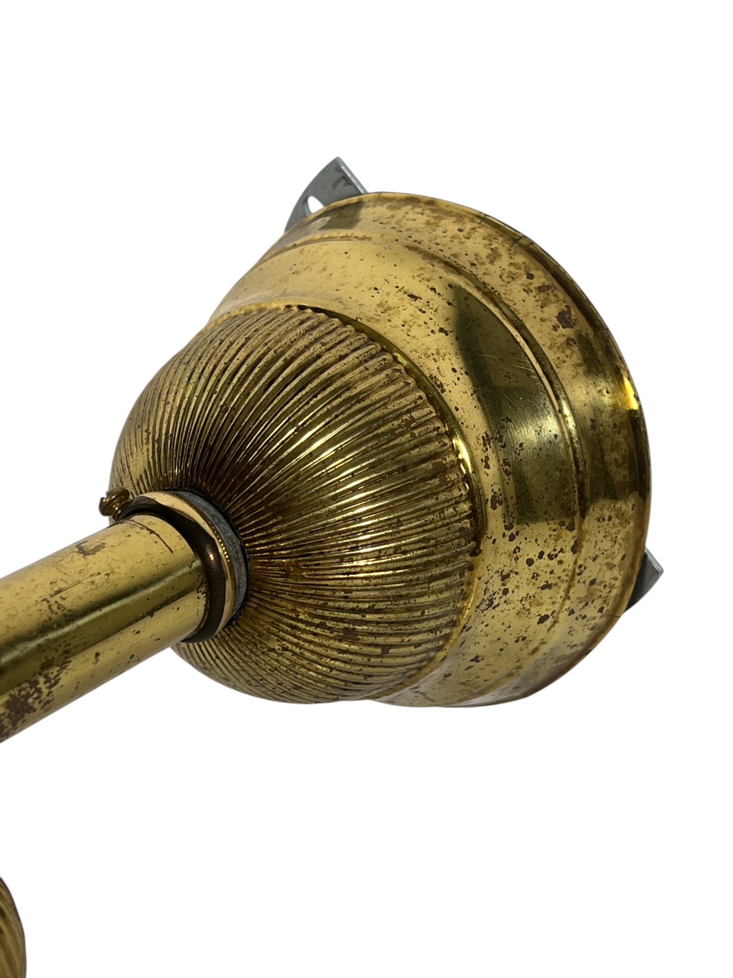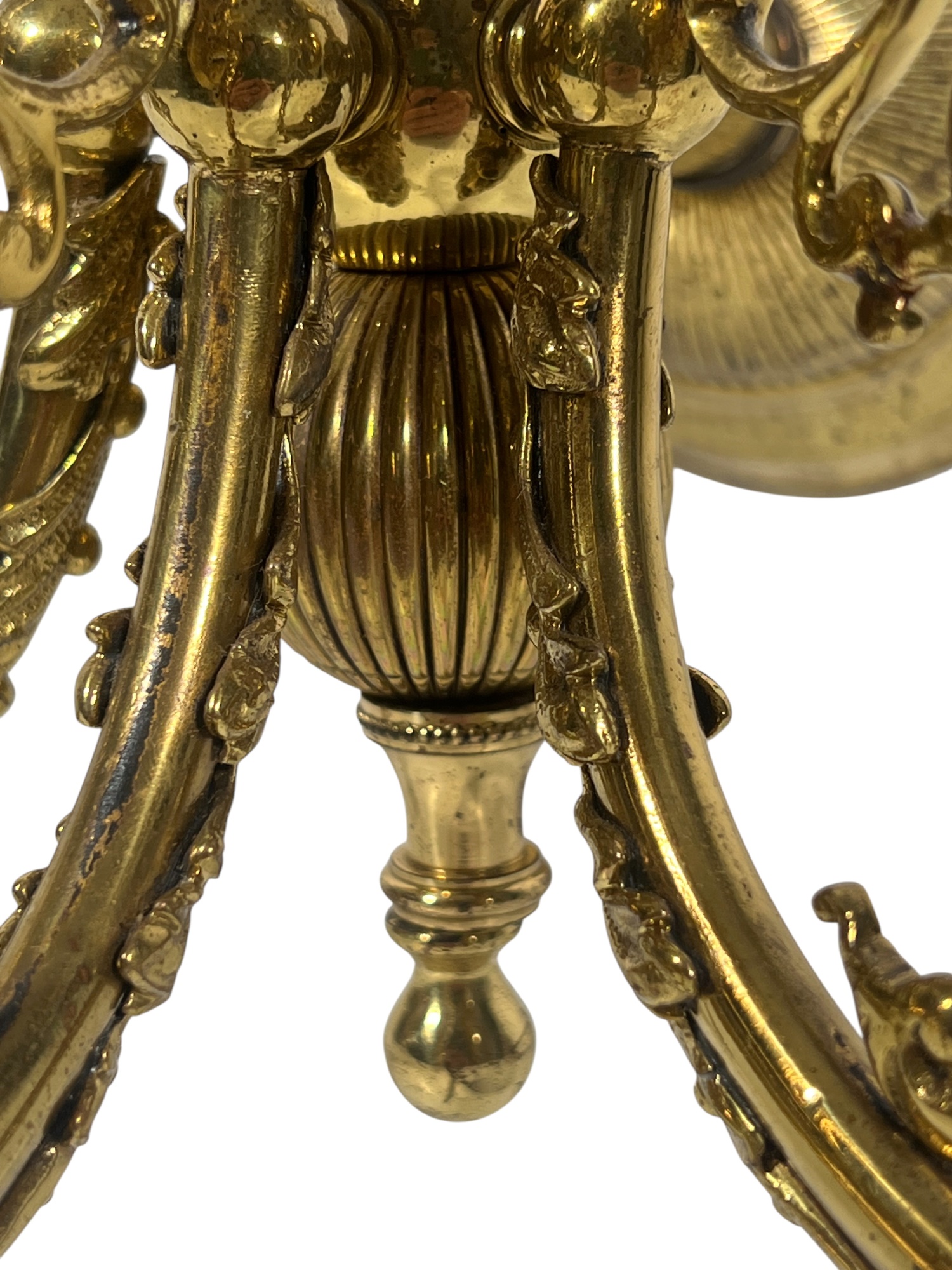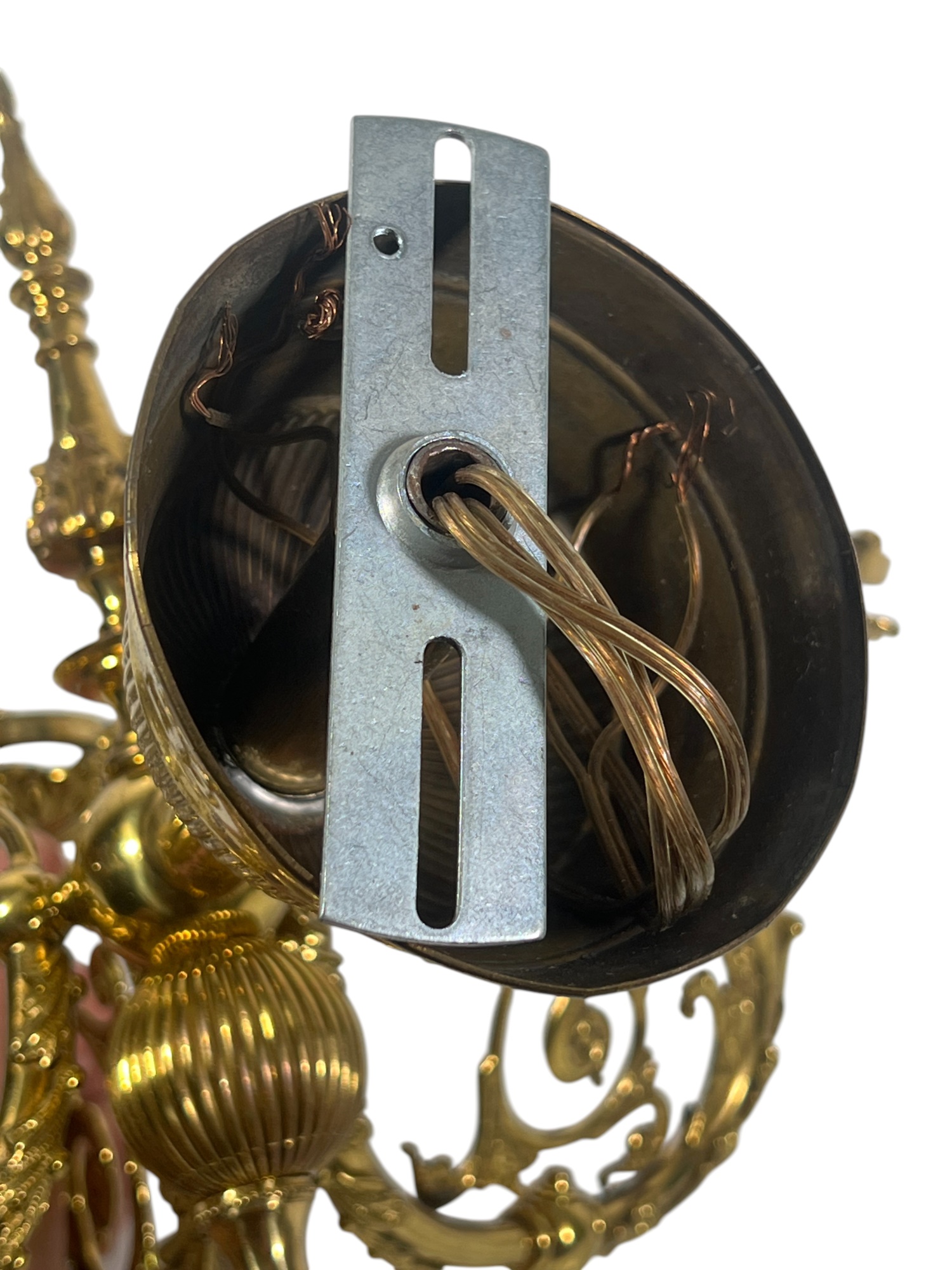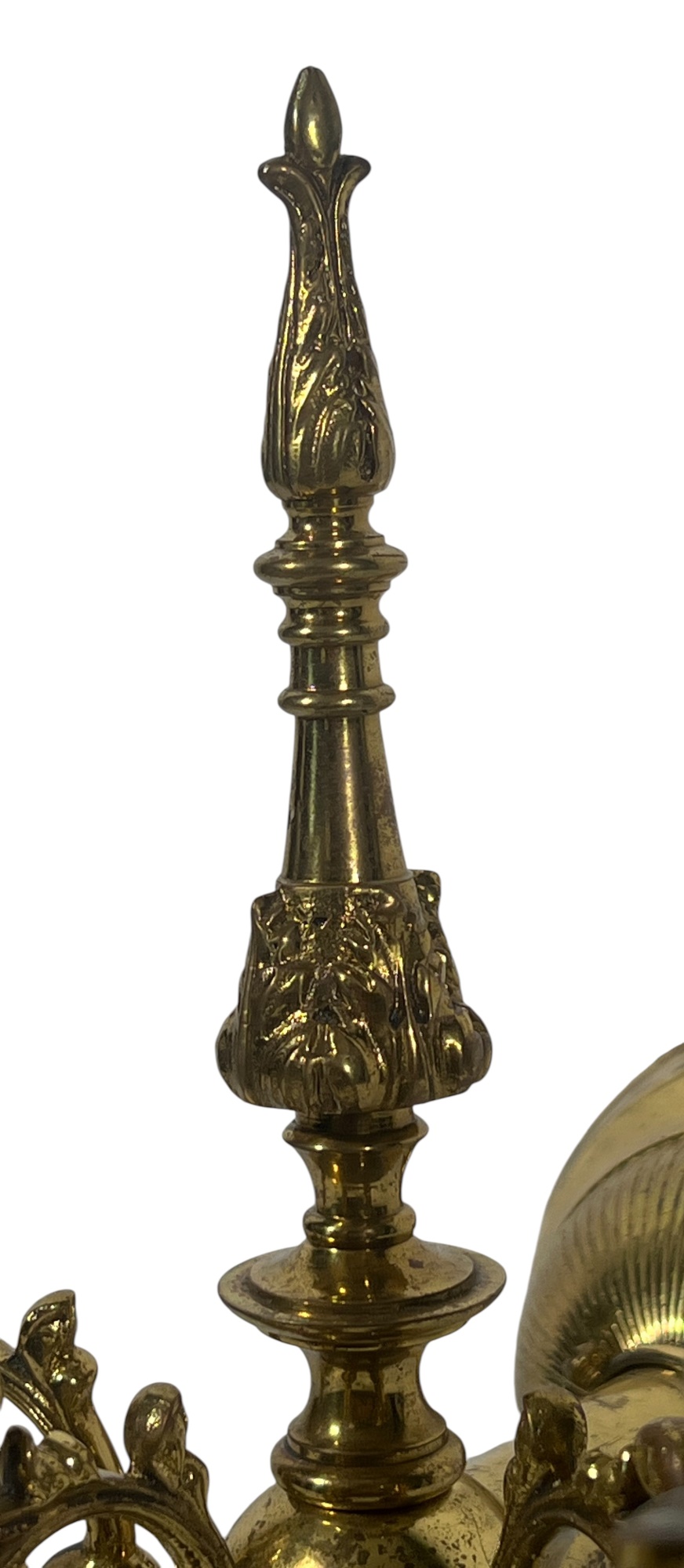 Beautiful Rococo revival (3) light brass wall sconce with scrolled motif and flame finial. 12 x 12 x 13 inches. Condition: (1) small break. Untested. Temp No 8739