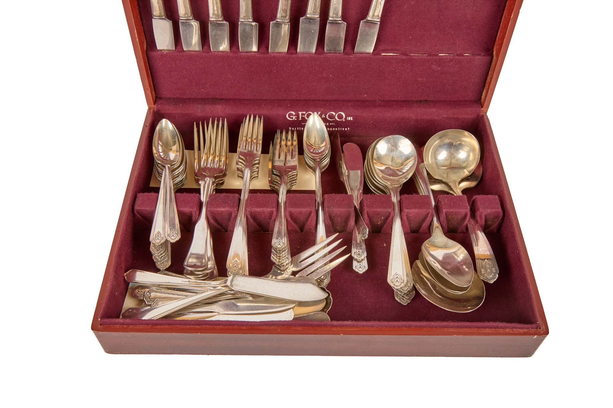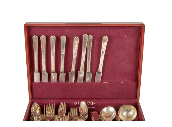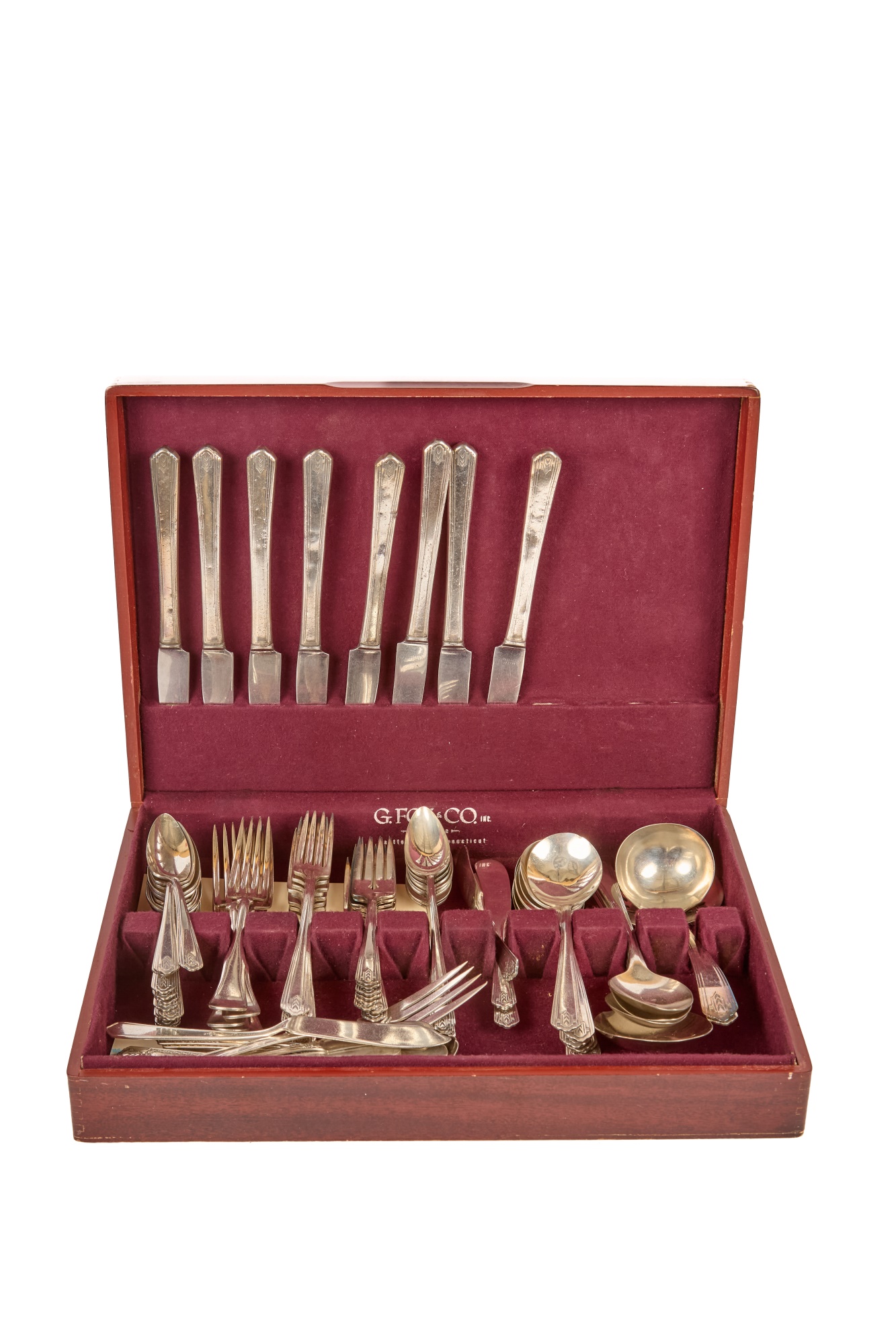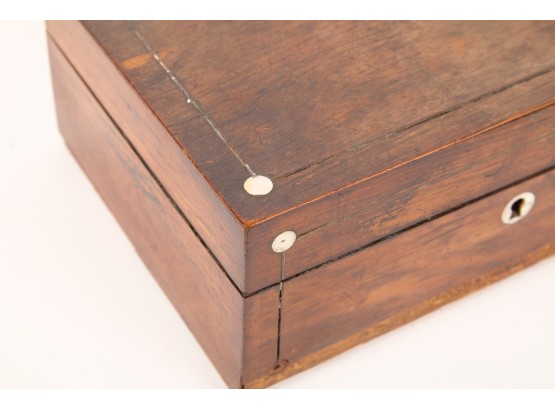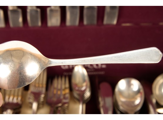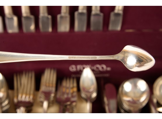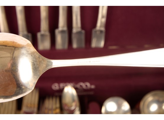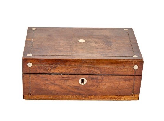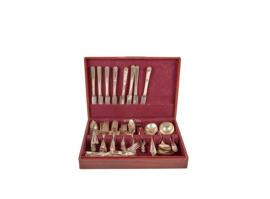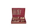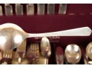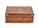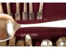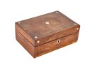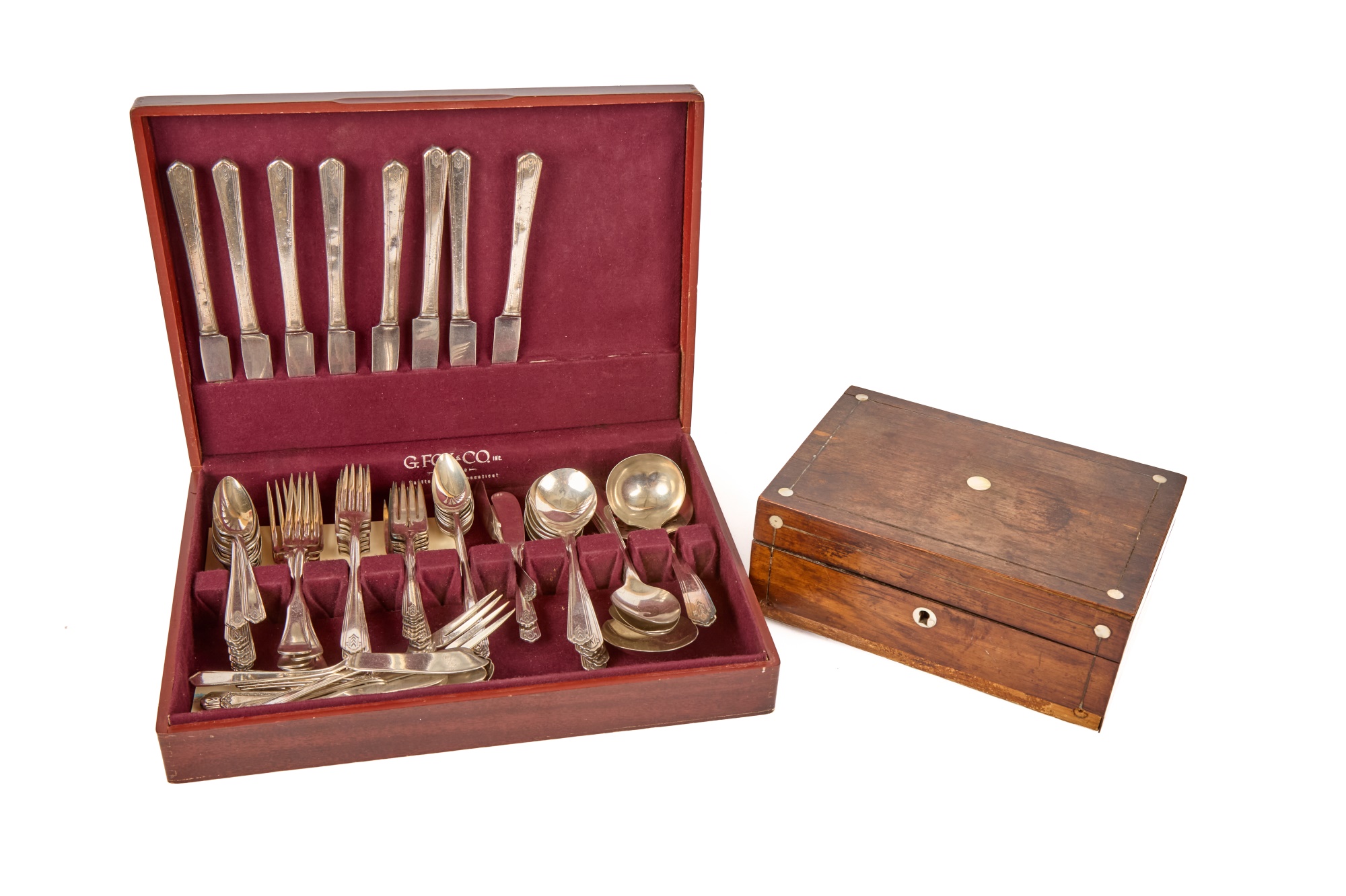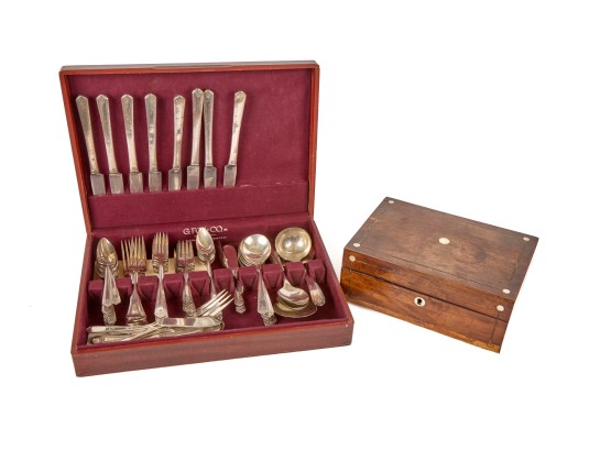 Appears to be a service for (8) with (6) dinner forks and (7) bullion spoons plus a good number of additional pieces. Presented in a felt-lined box. Together with a small walnut box inlaid with mother of pearl.