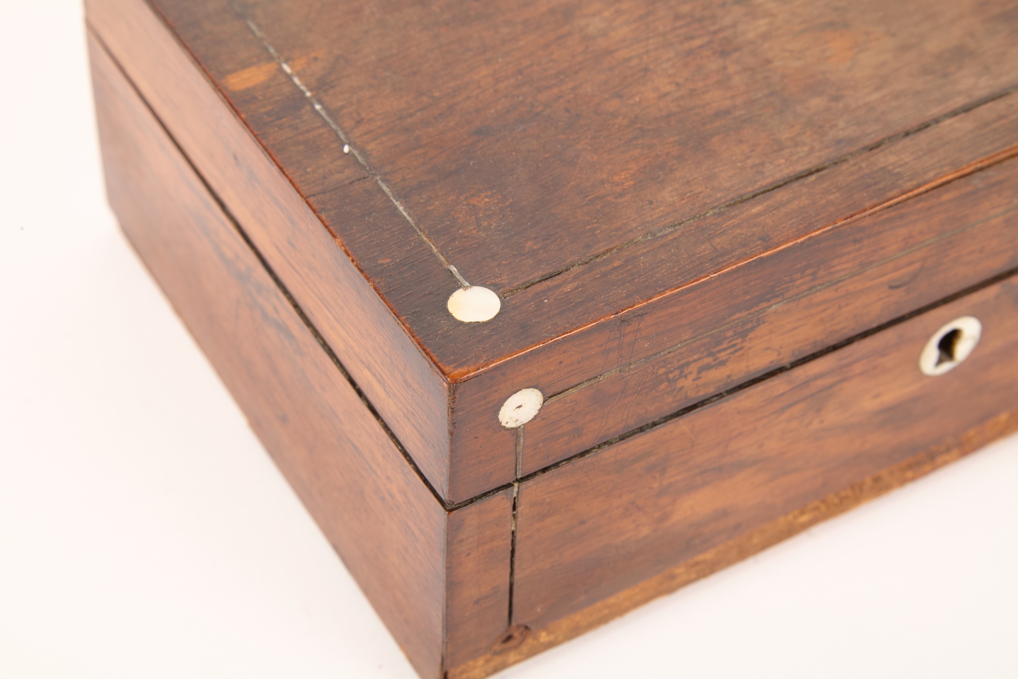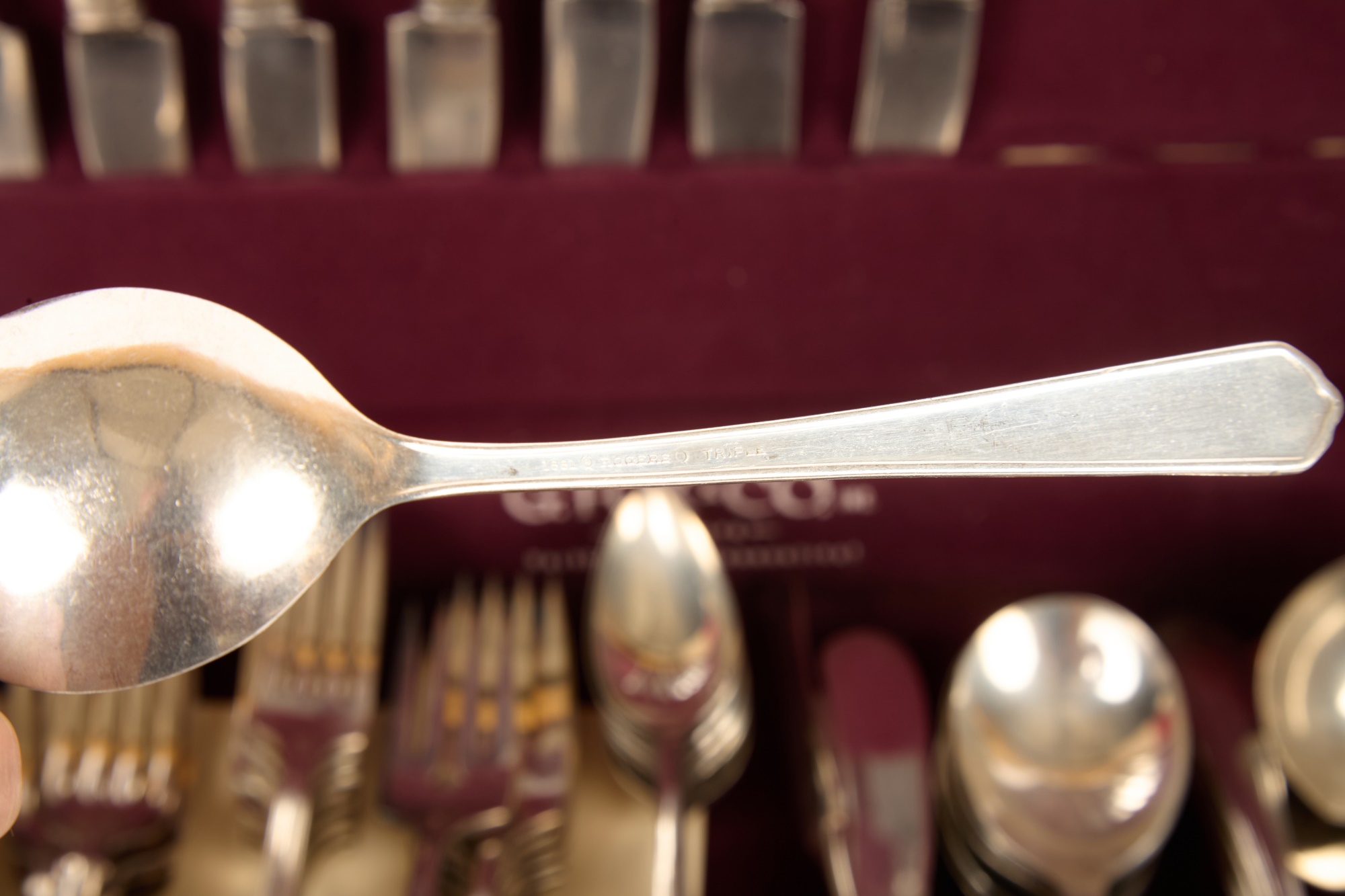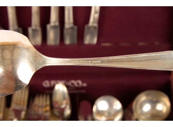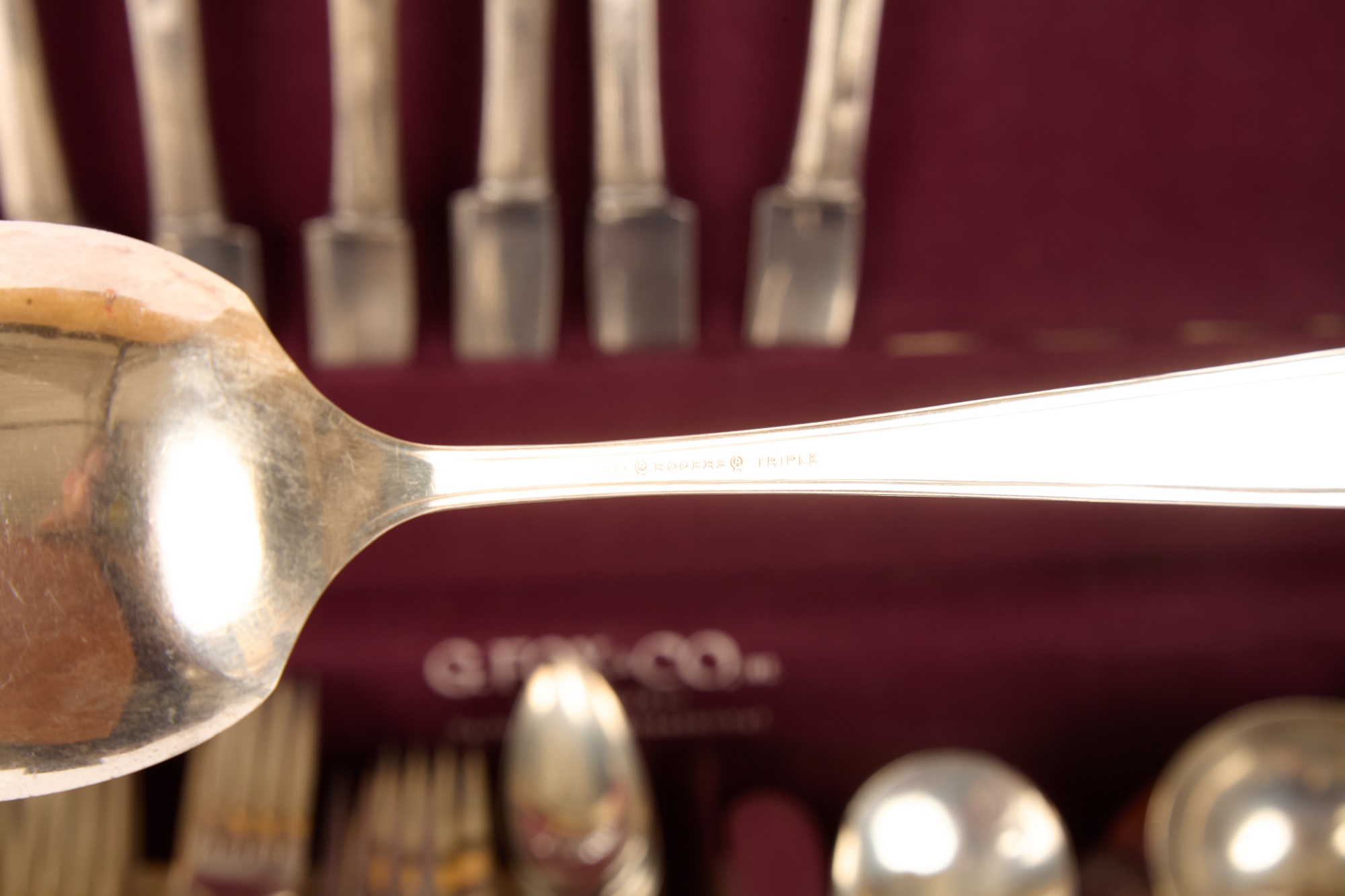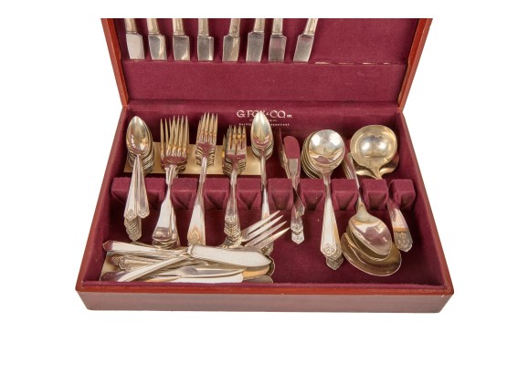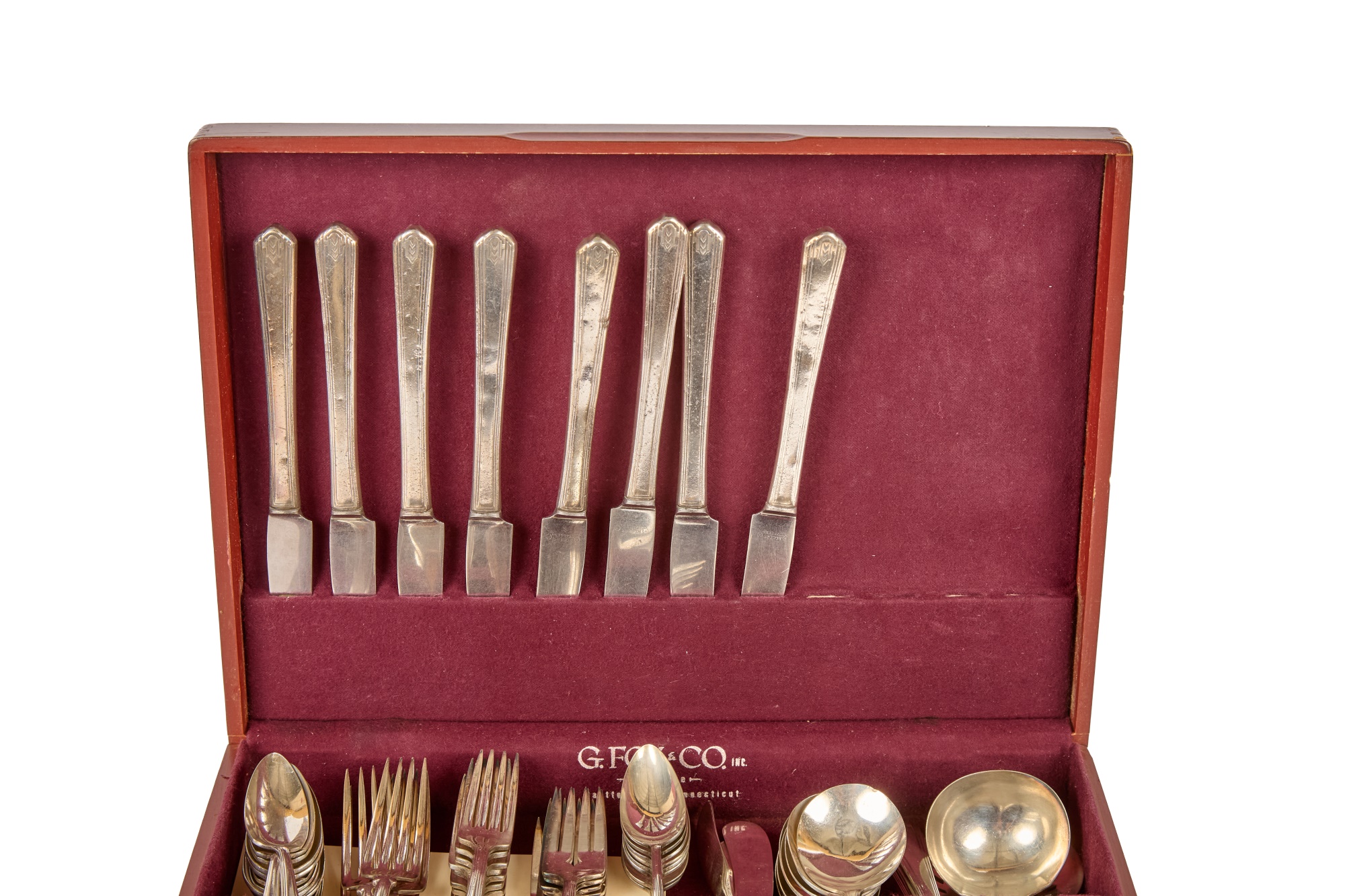 Appears to be a service for (8) with (6) dinner forks and (7) bullion spoons plus a good number of additional pieces. Presented in a felt-lined box. Together with a small walnut box inlaid with mother of pearl.