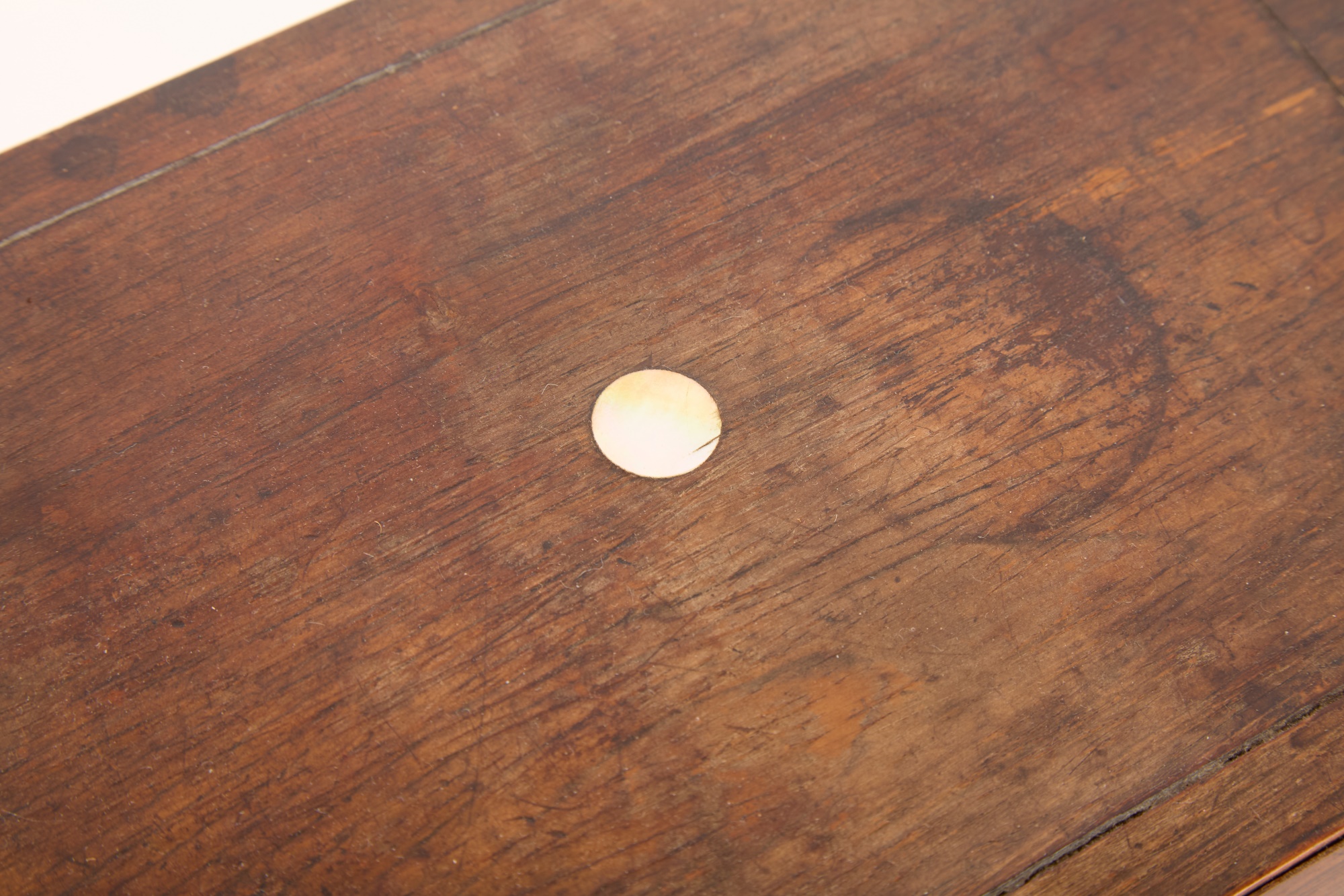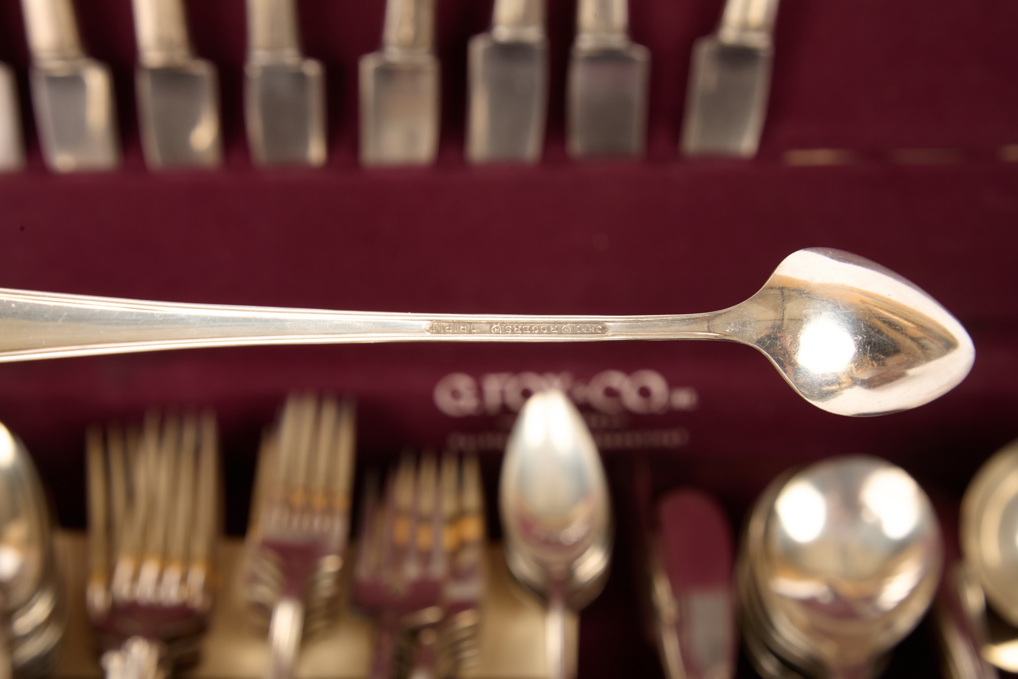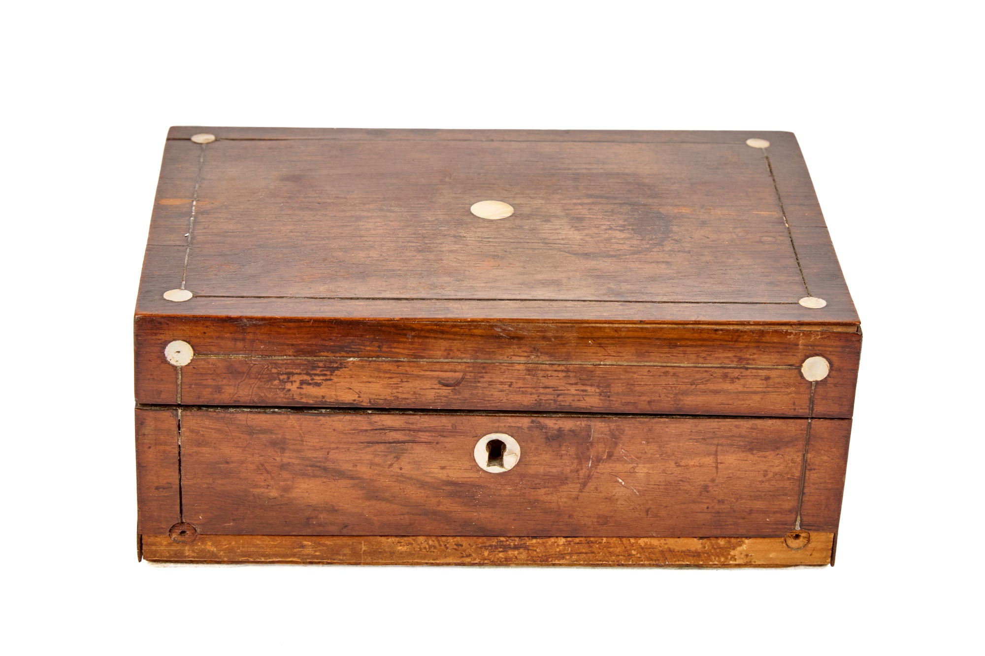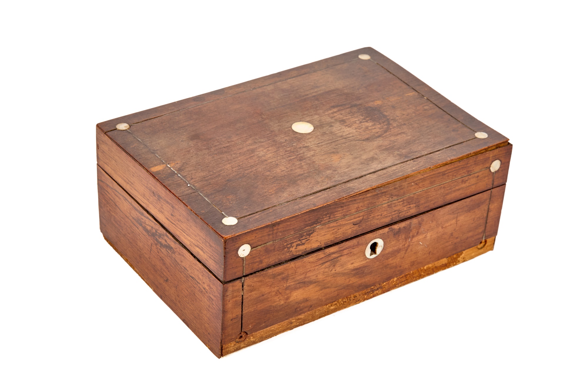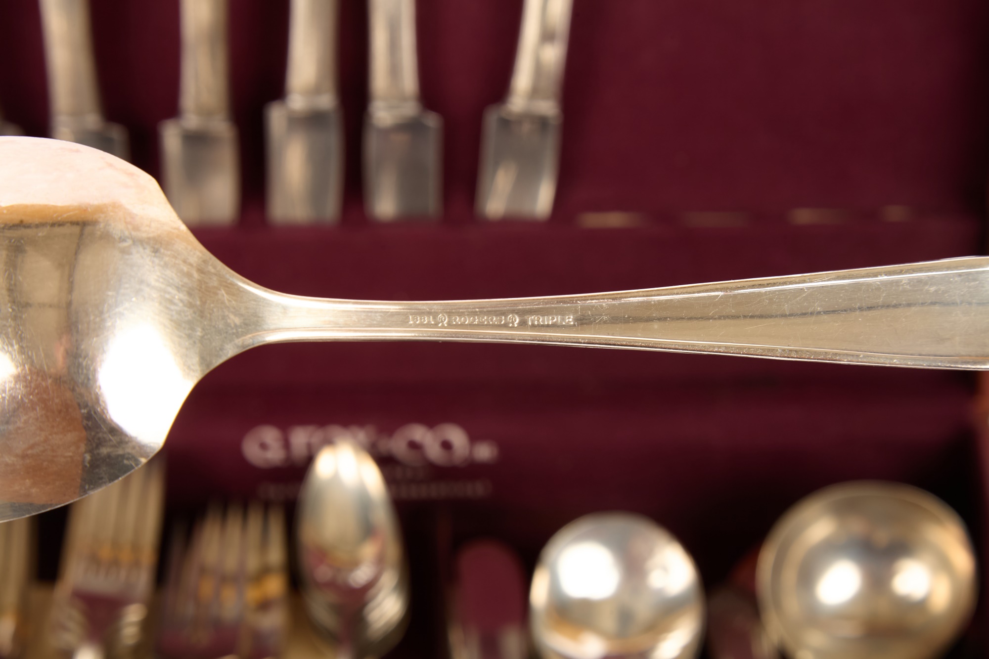 Appears to be a service for (8) with (6) dinner forks and (7) bullion spoons plus a good number of additional pieces. Presented in a felt-lined box. Together with a small walnut box inlaid with mother of pearl.