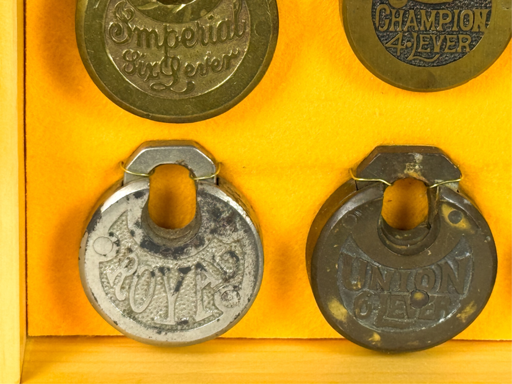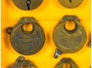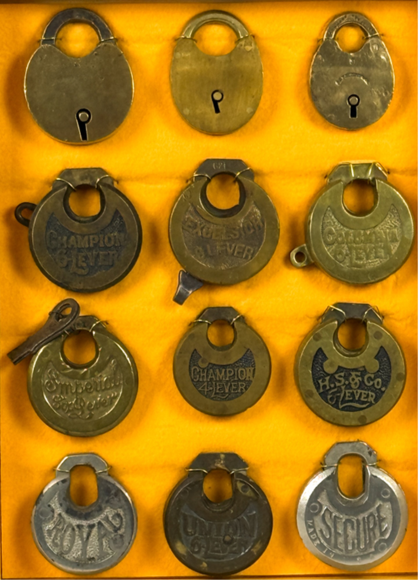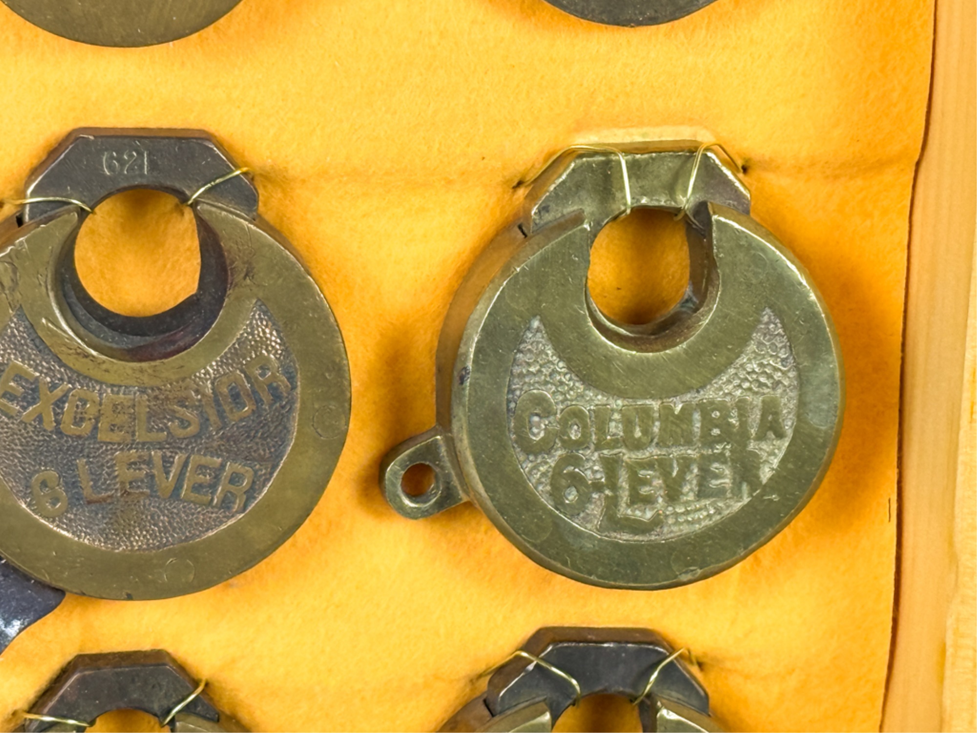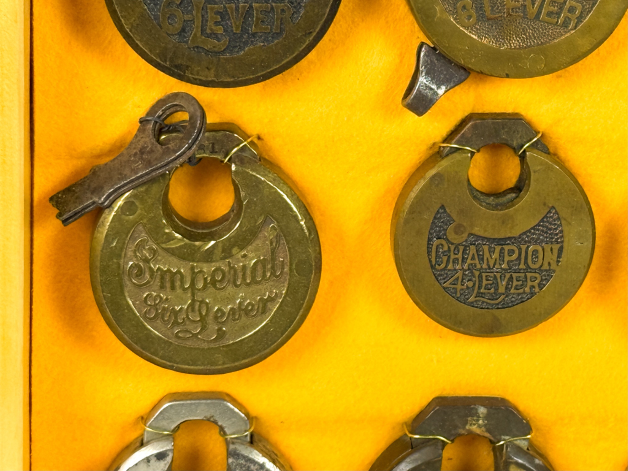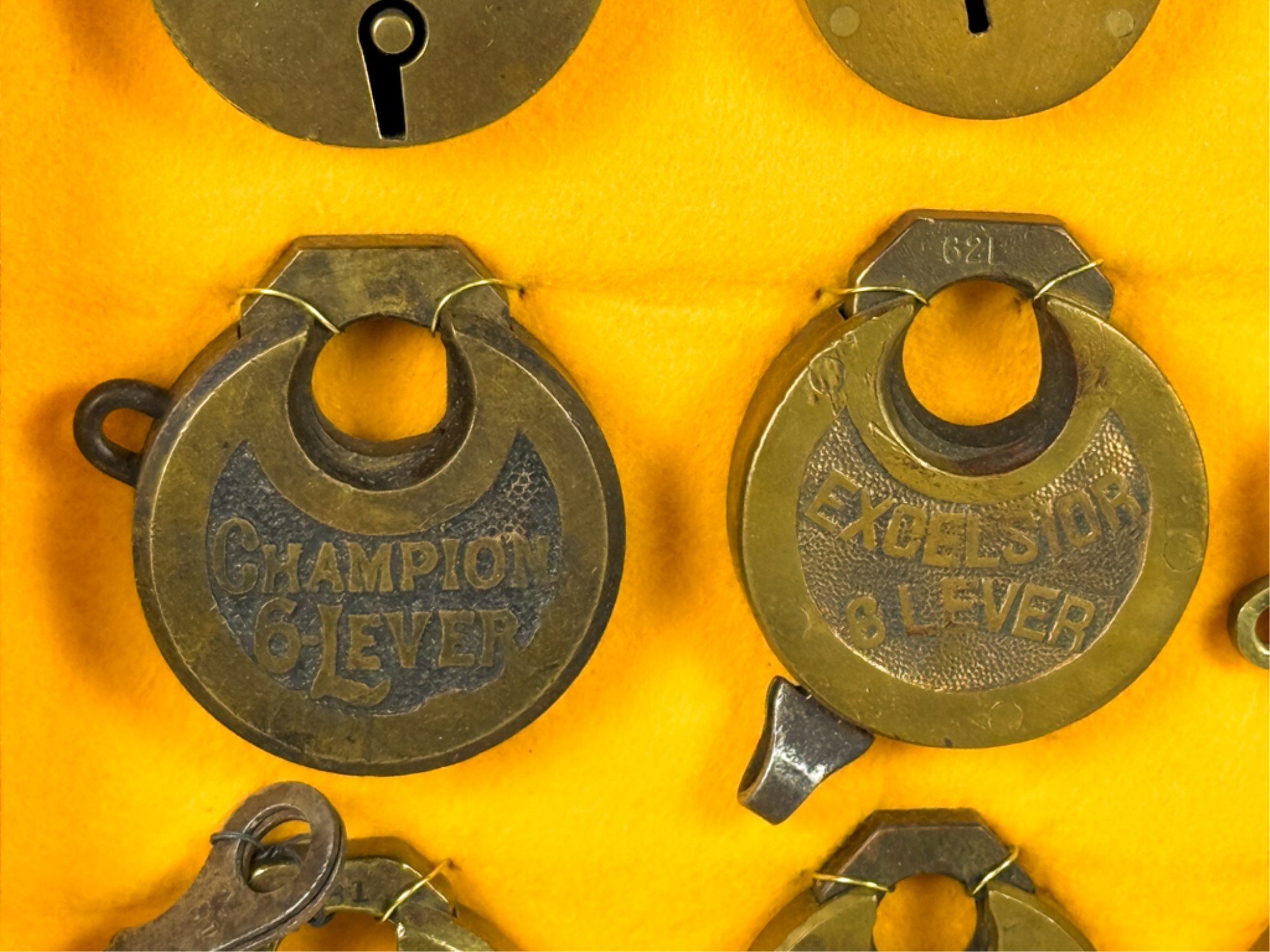 Brass, Champion 6-Lever, Columbia, Excelsior, Union, Royal, Imperial, etc. (1) with key. Largest measures 2 3/4 inches. Condition: Good. Only examples with keys tested. See photos. Temp No 4273