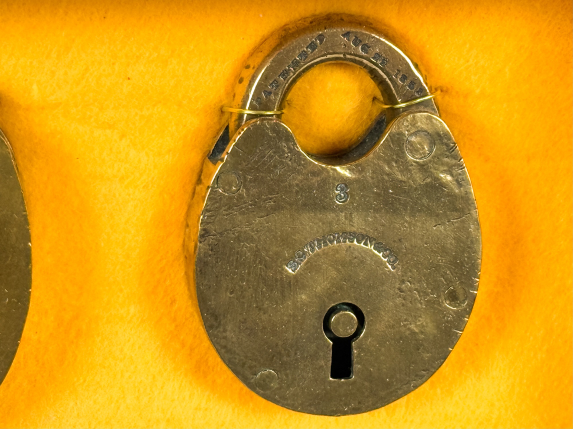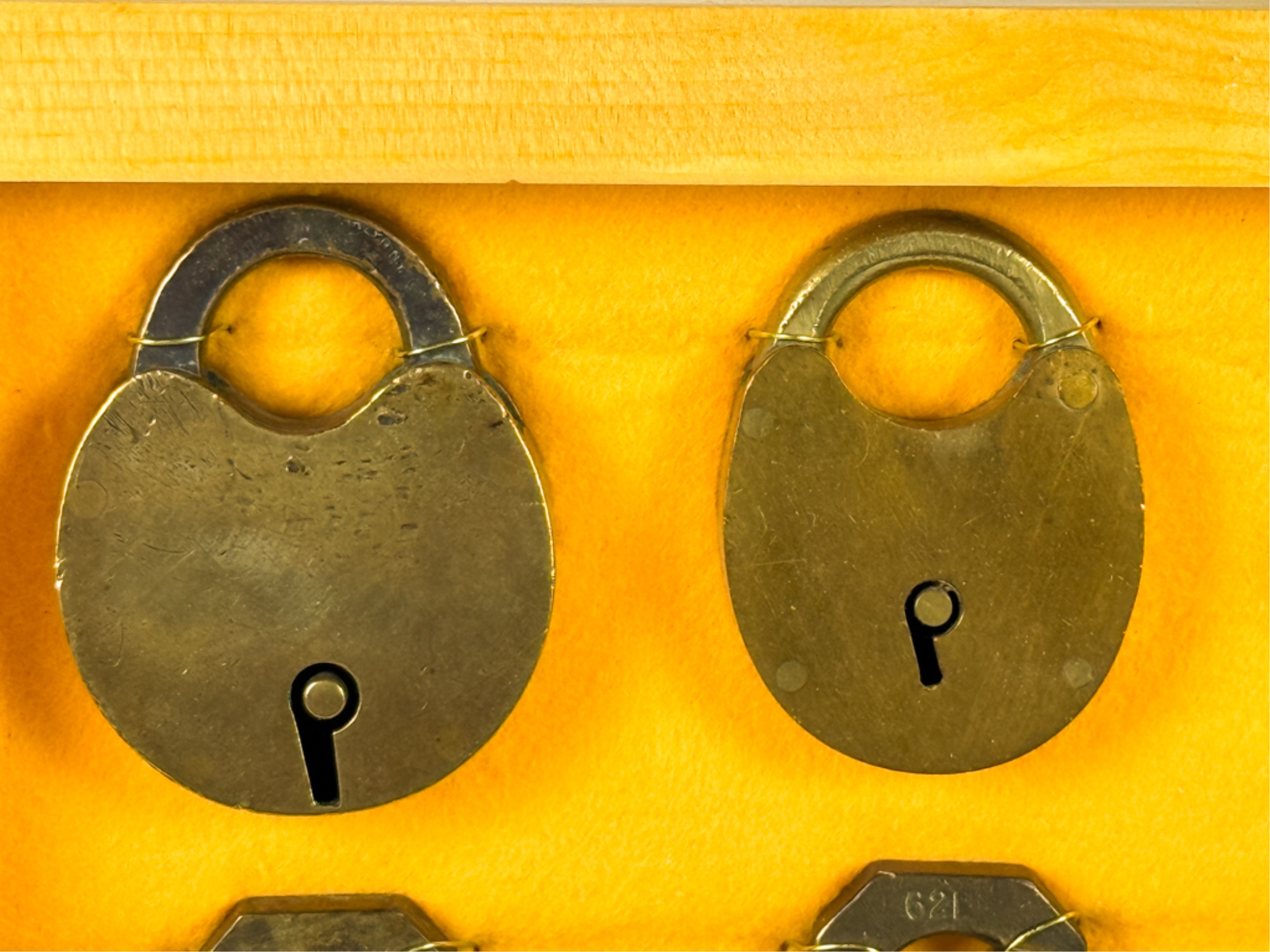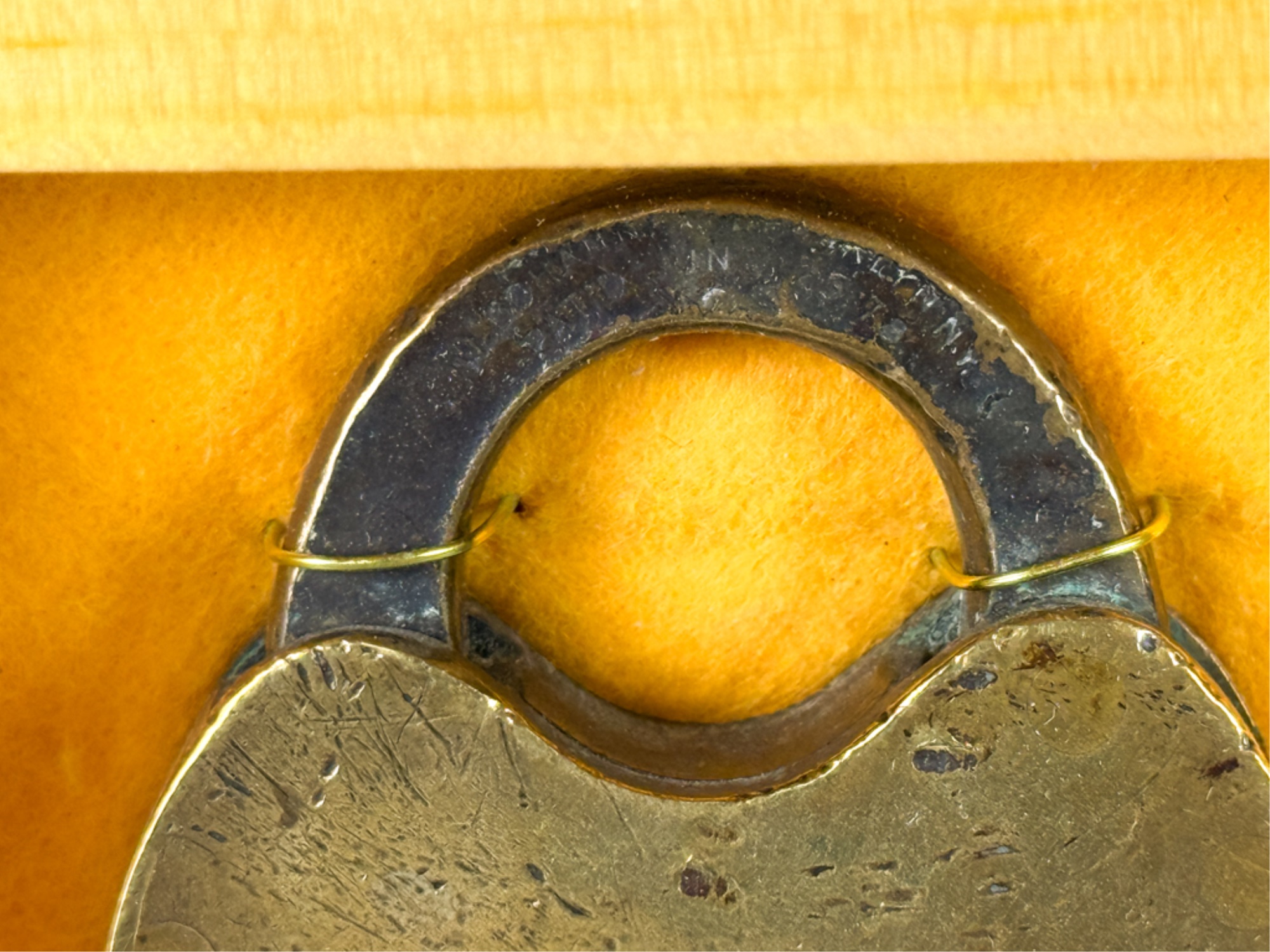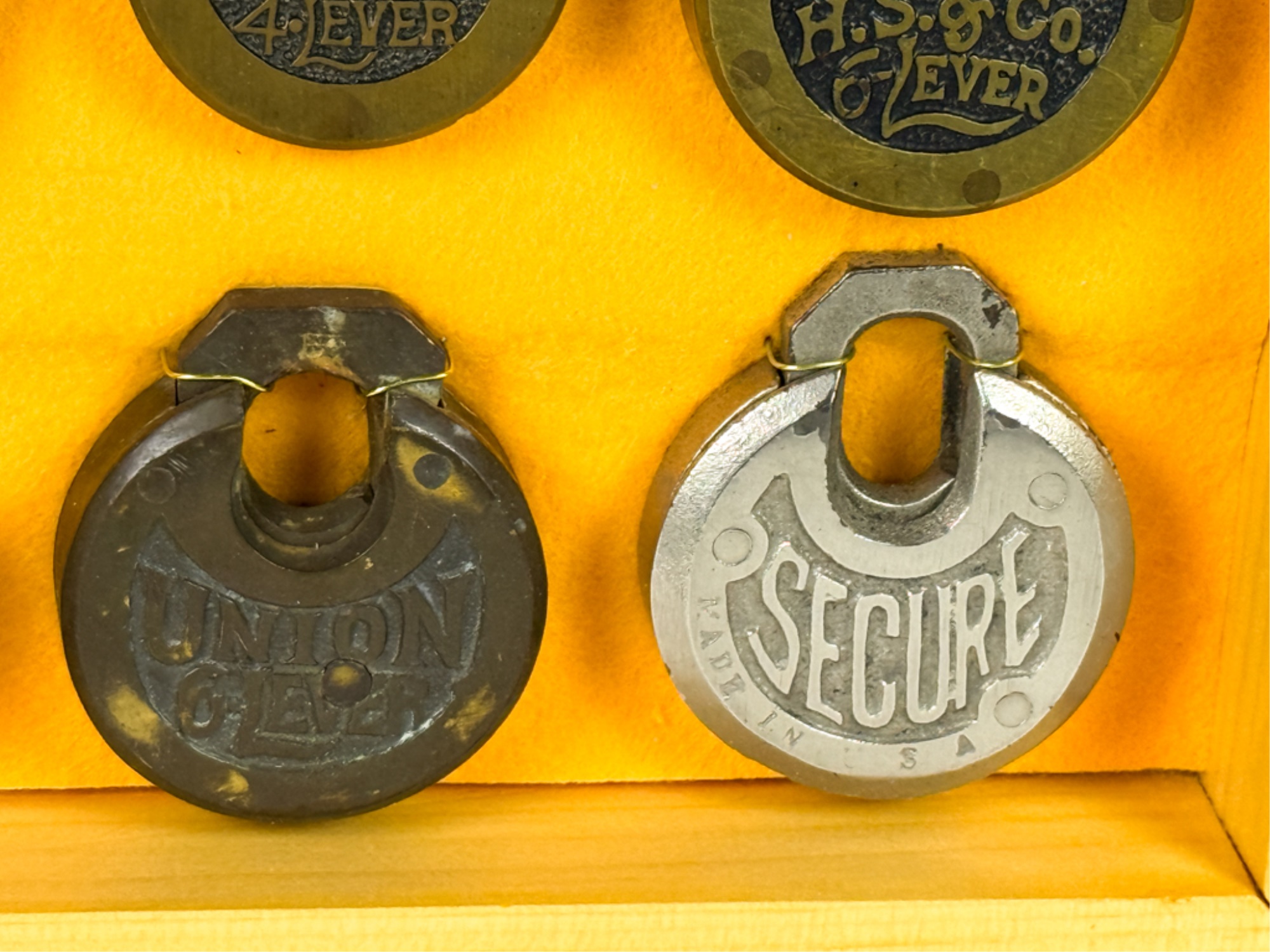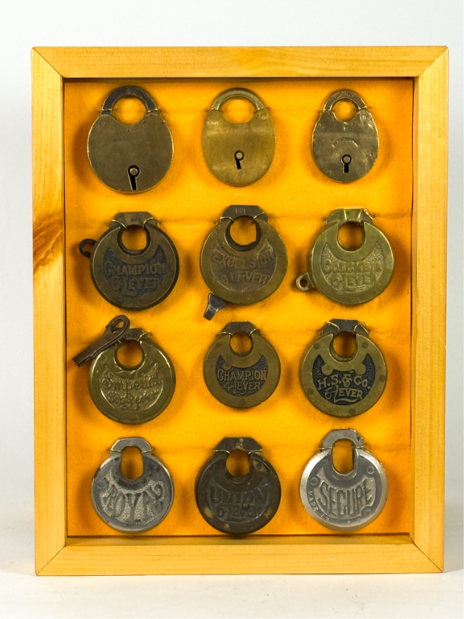 Brass, Champion 6-Lever, Columbia, Excelsior, Union, Royal, Imperial, etc. (1) with key. Largest measures 2 3/4 inches. Condition: Good. Only examples with keys tested. See photos. Temp No 4273