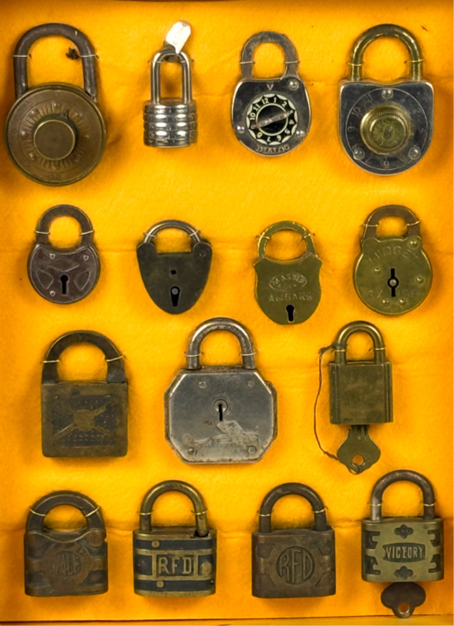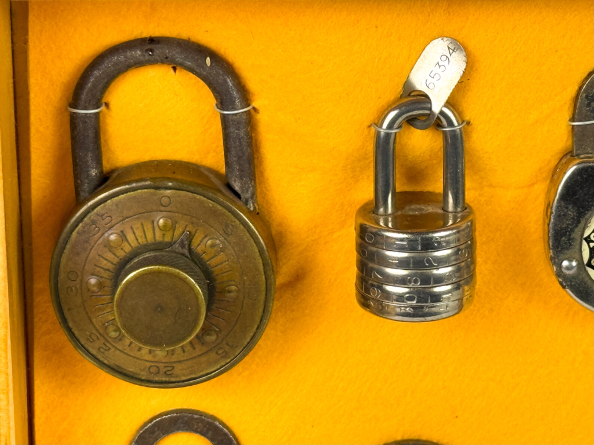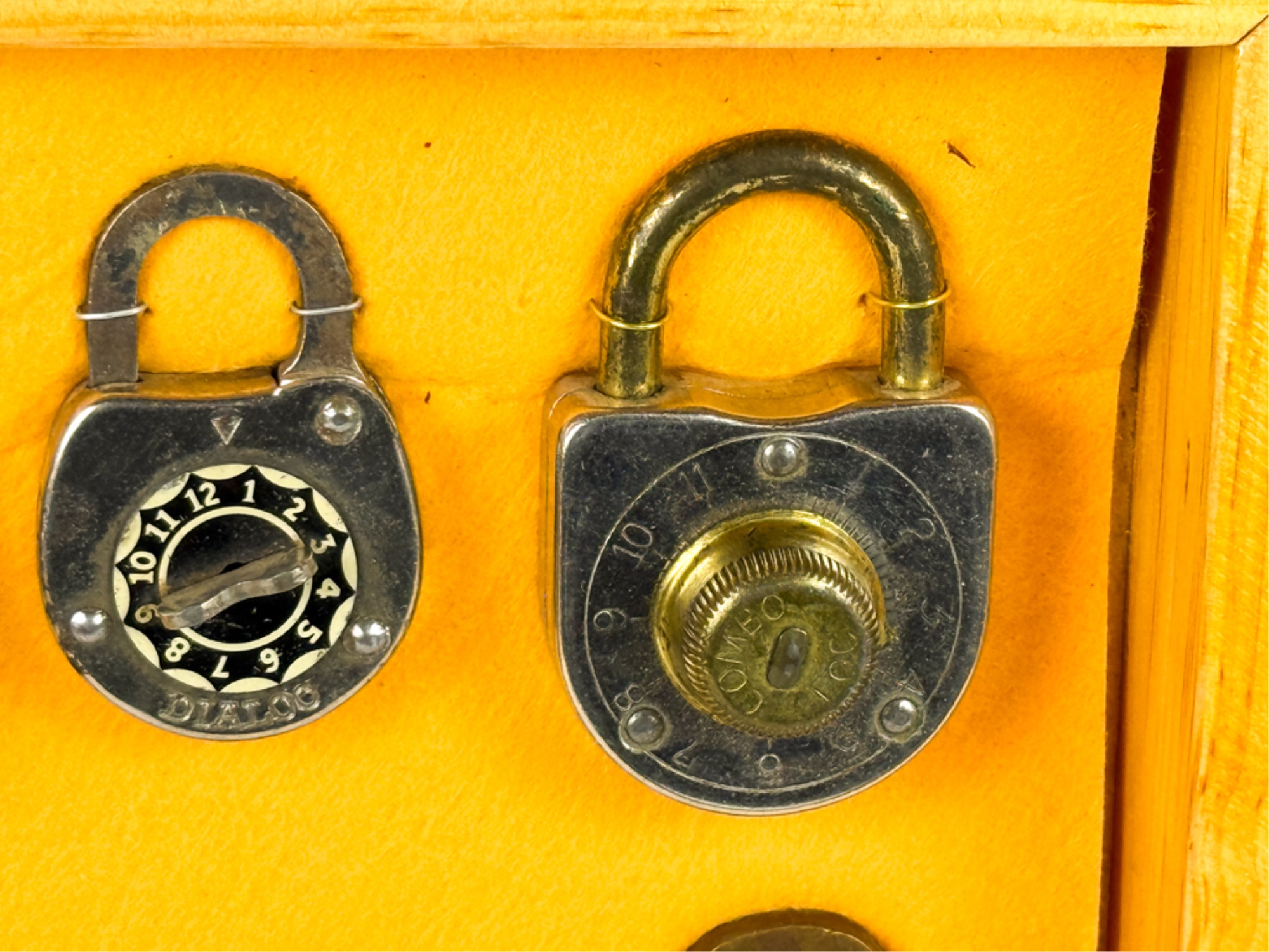 Notes: Top left combination lock difficult to turn. Do not have combinations. Examples with keys in working order.