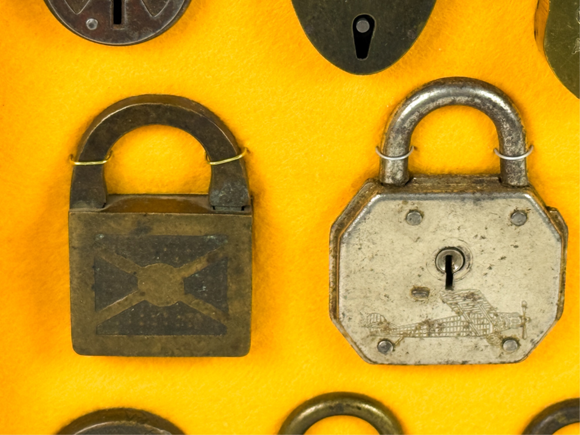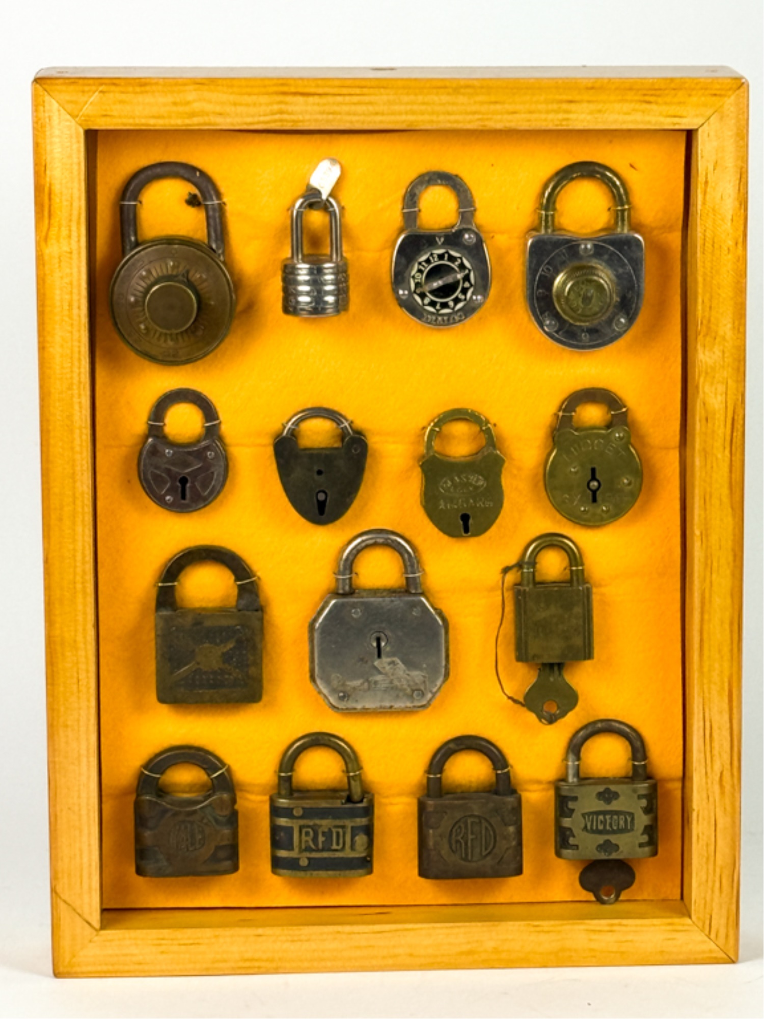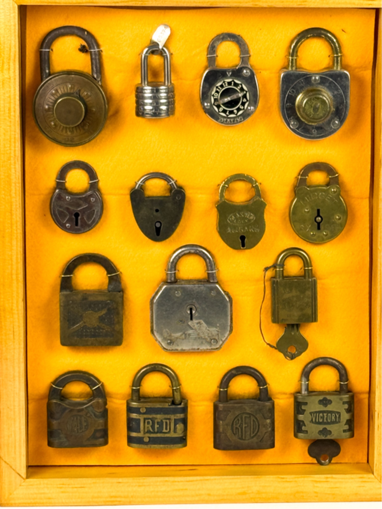 Notes: Top left combination lock difficult to turn. Do not have combinations. Examples with keys in working order.