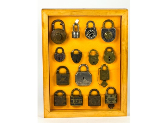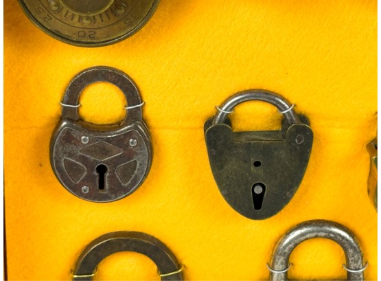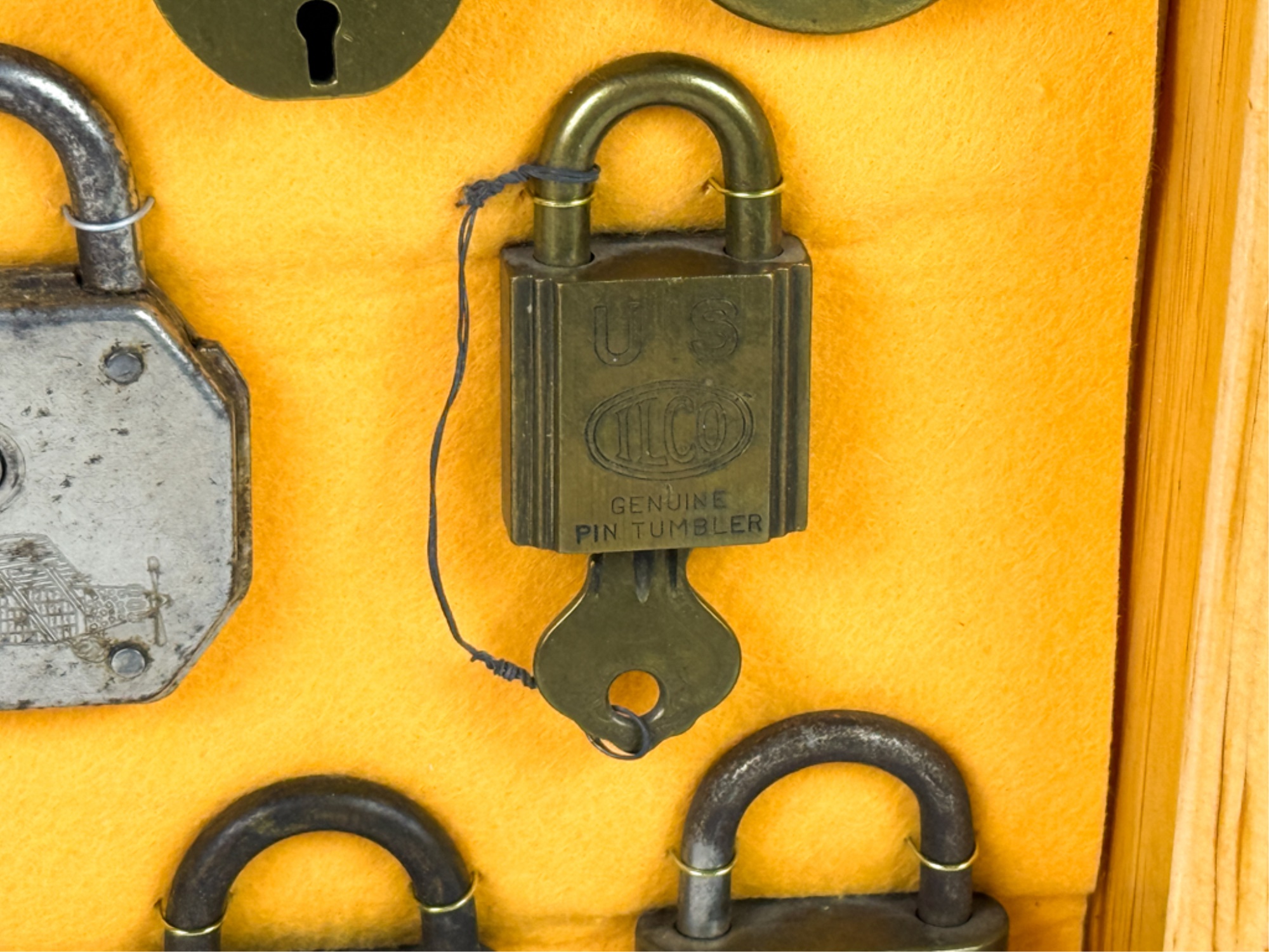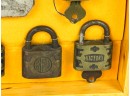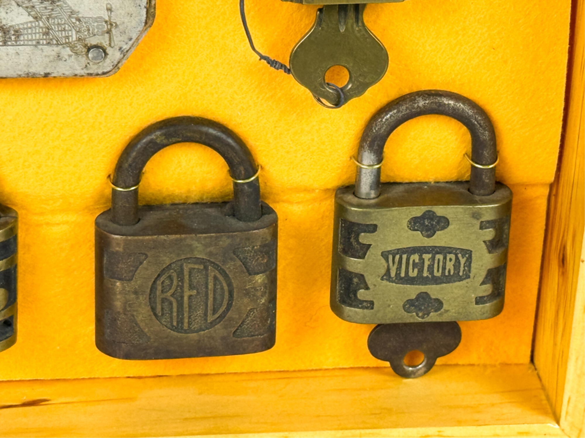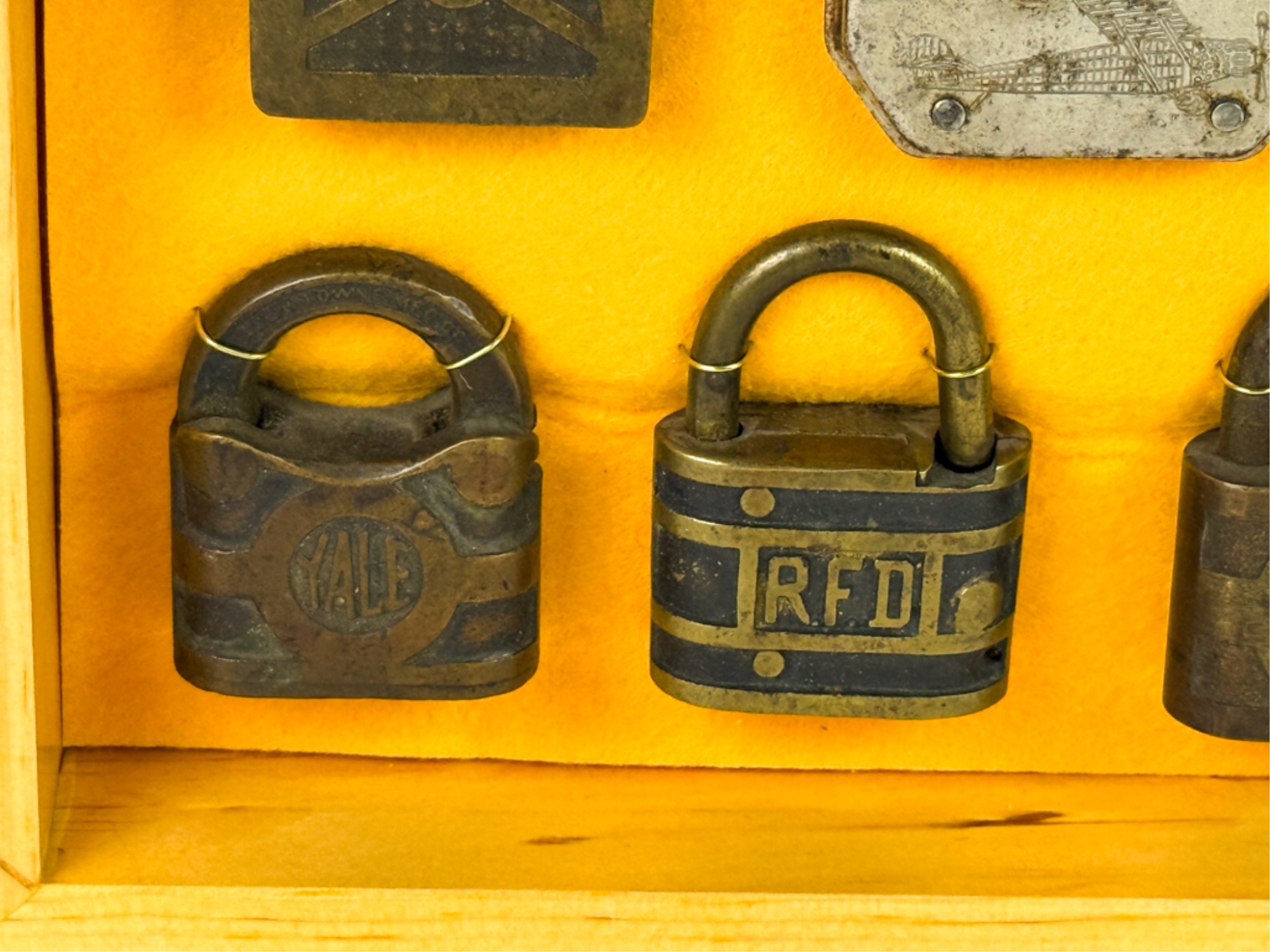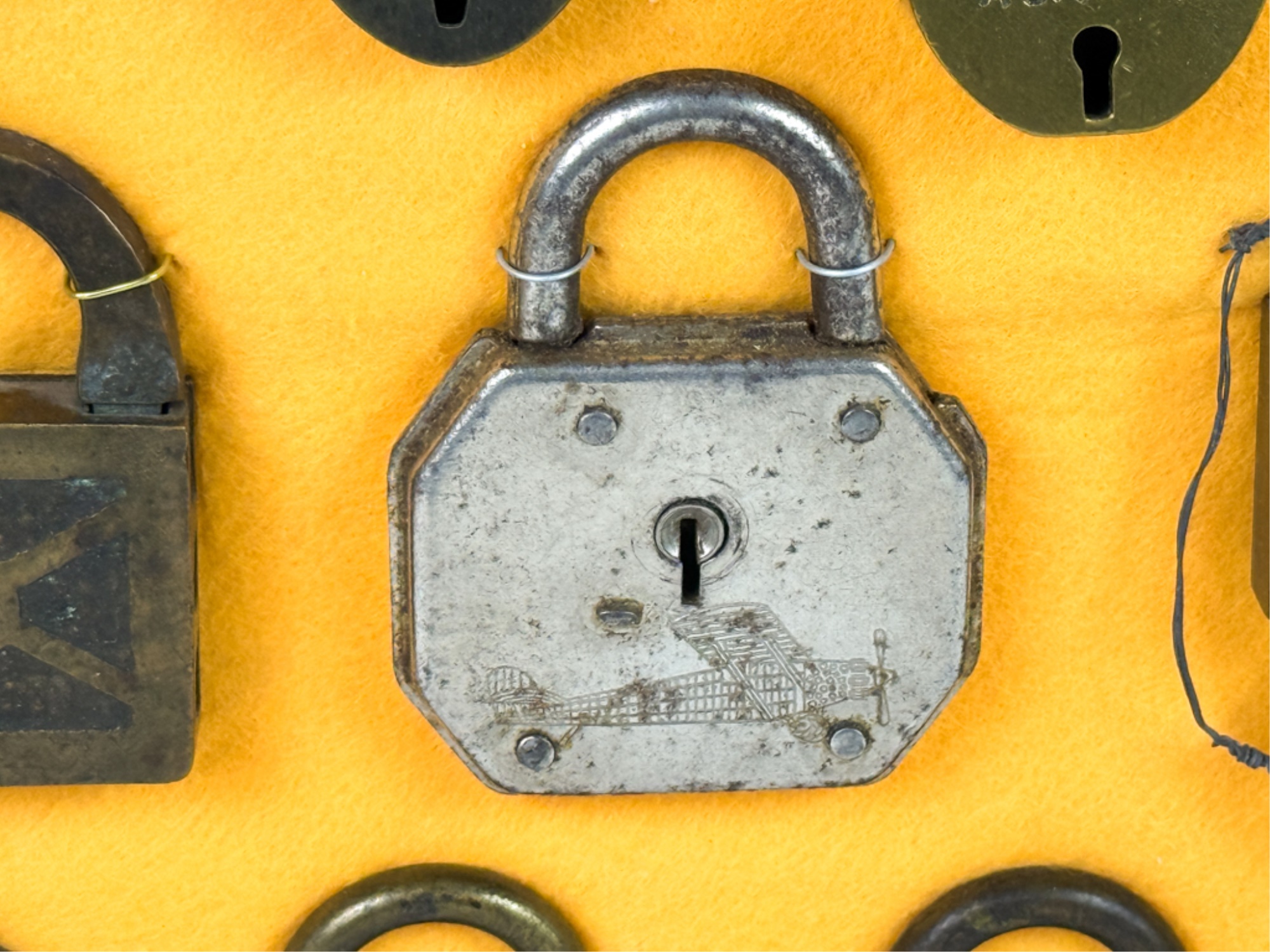 Combination, Master "Aligarh", Victory, Fire Departments, Engraved biplane, Yale, etc. (2) with keys. Airplane example measures 3 inches.