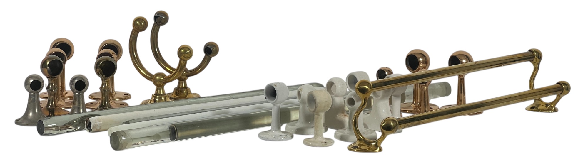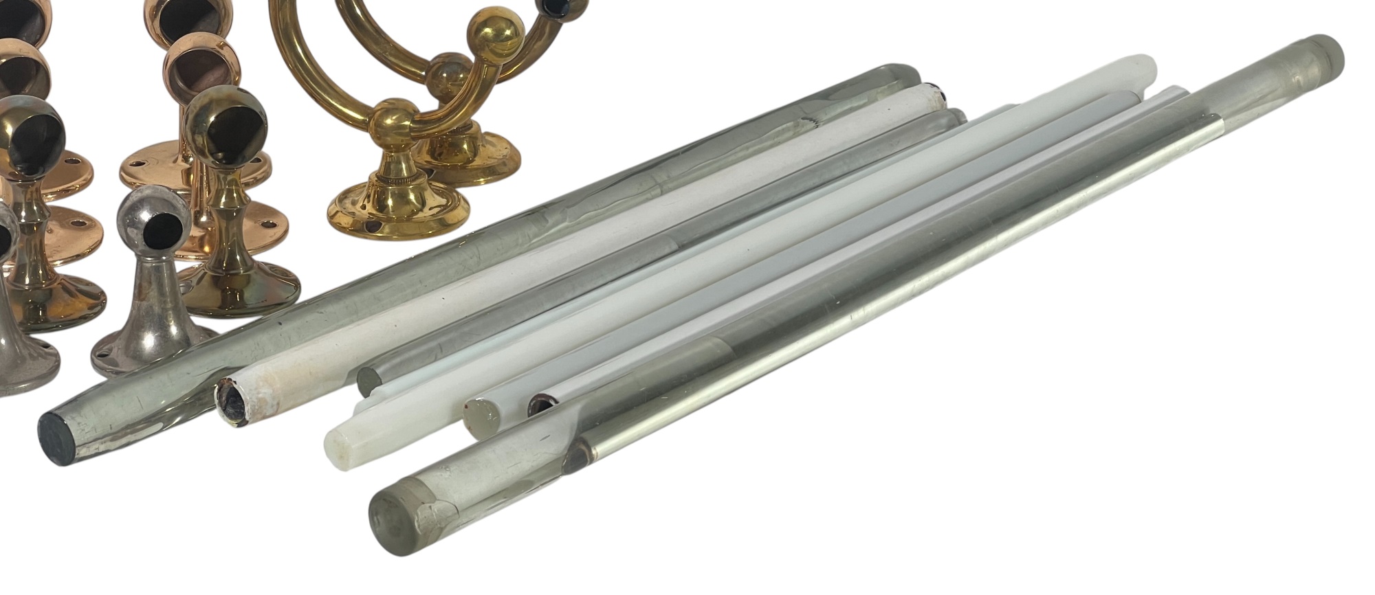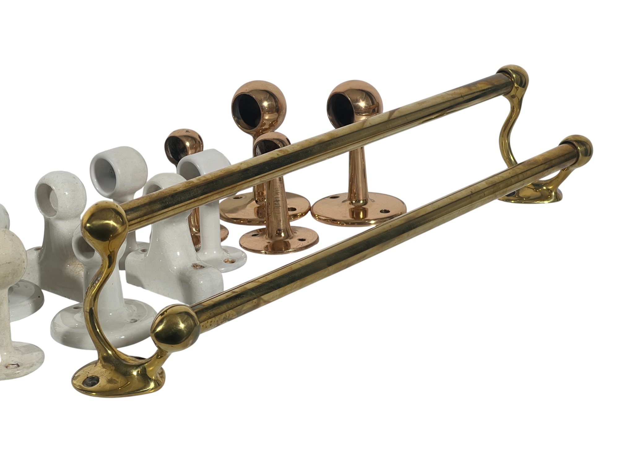 Miscellaneous group of early (20th c) brass, glass, and porcelain towel rack mounts & rods. 36 inches. Condition: Good. Temp No 8781