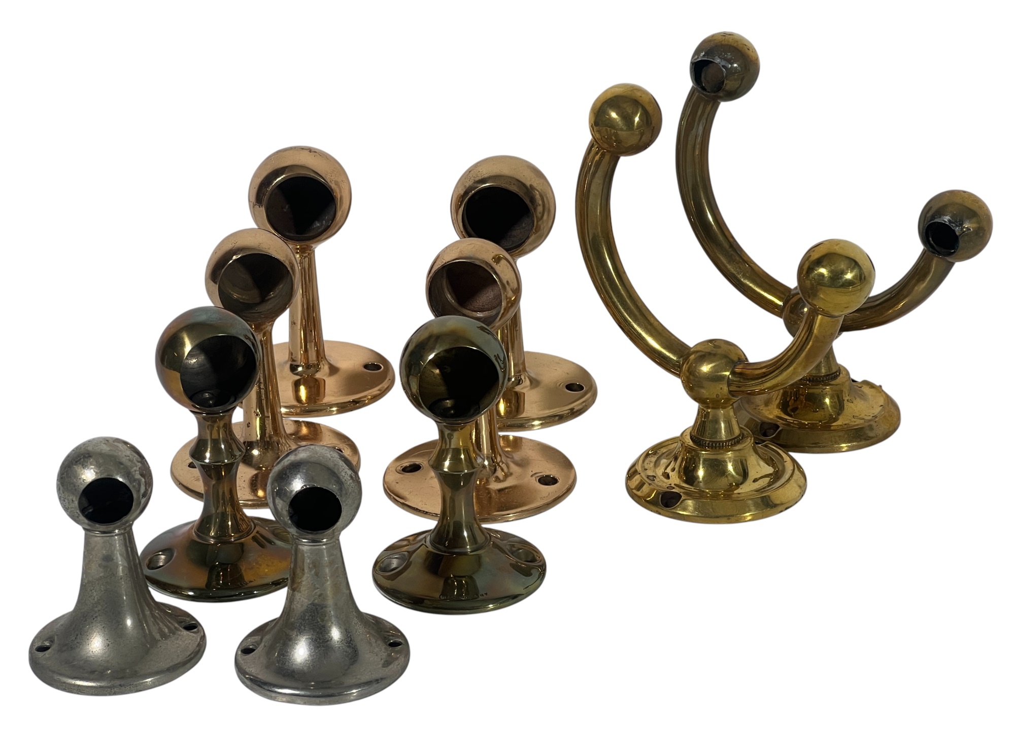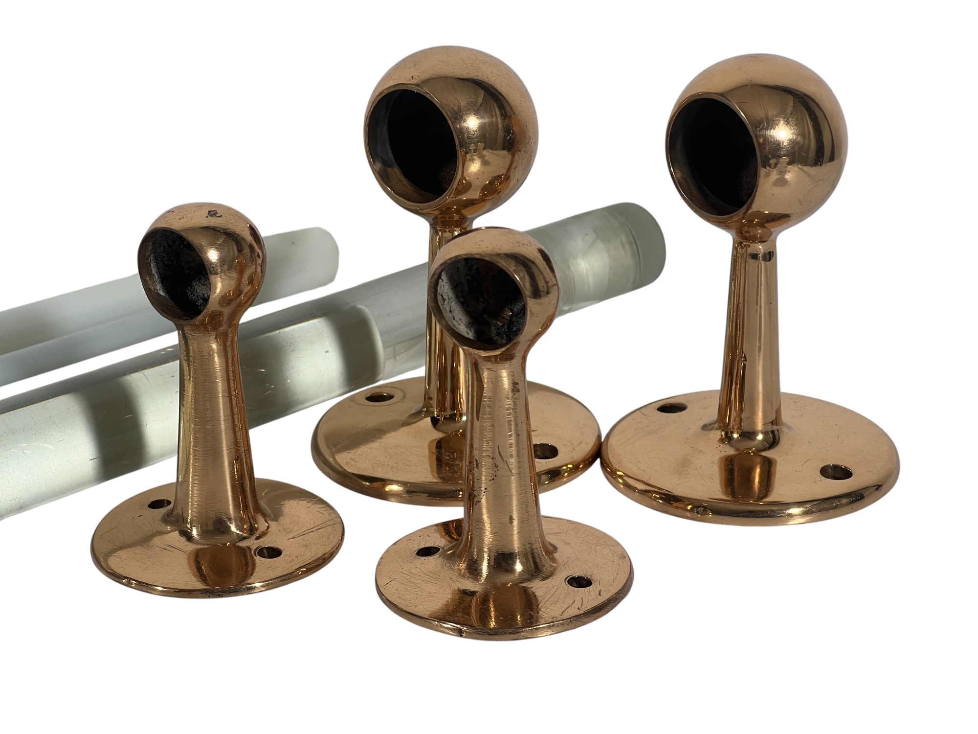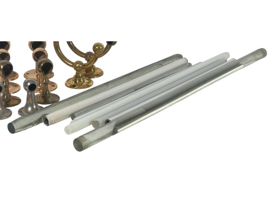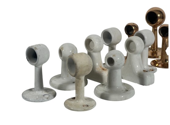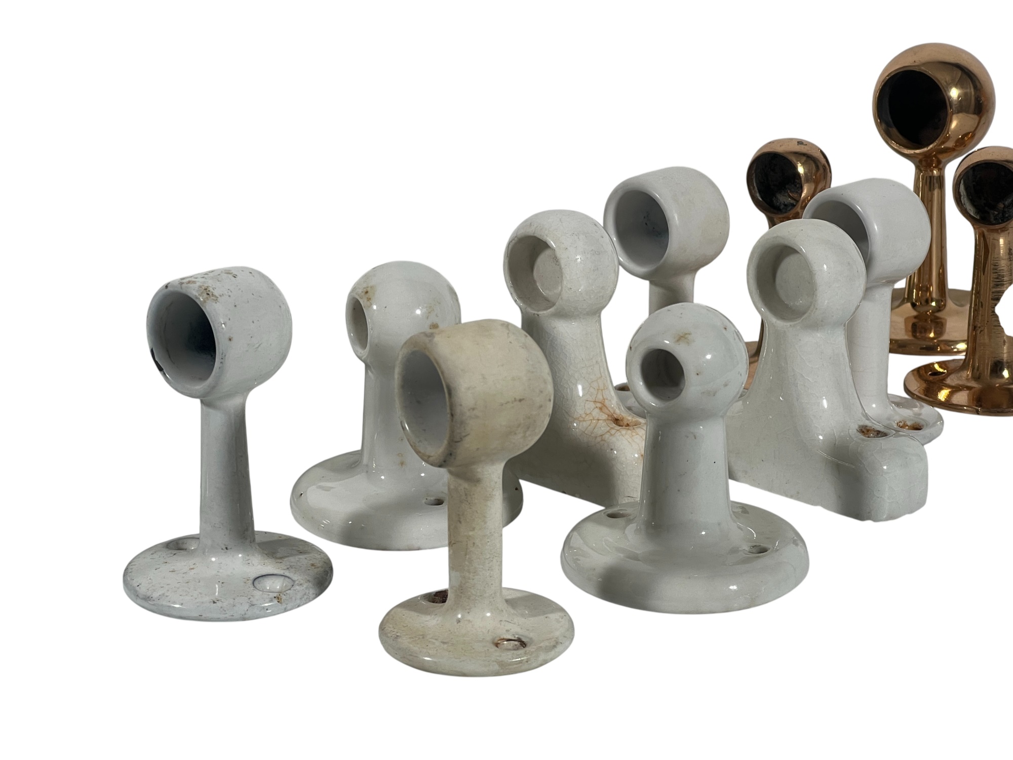Miscellaneous group of early (20th c) brass, glass, and porcelain towel rack mounts & rods. 36 inches. Condition: Good. Temp No 8781