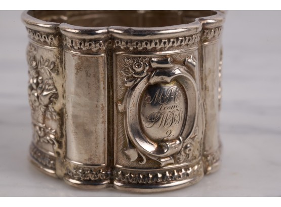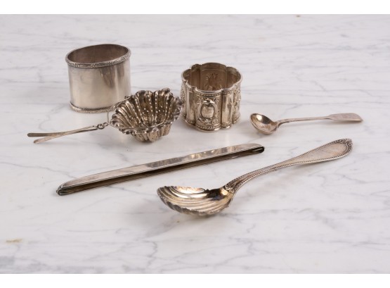 Including: (2) Napkin rings, sugar, salt and tea strainer. 7 inches (and under). 4 troy ounces (comb back not part of weight) Condition: Tea strainer has a make-do handle, each piece tested except salt which is marked
