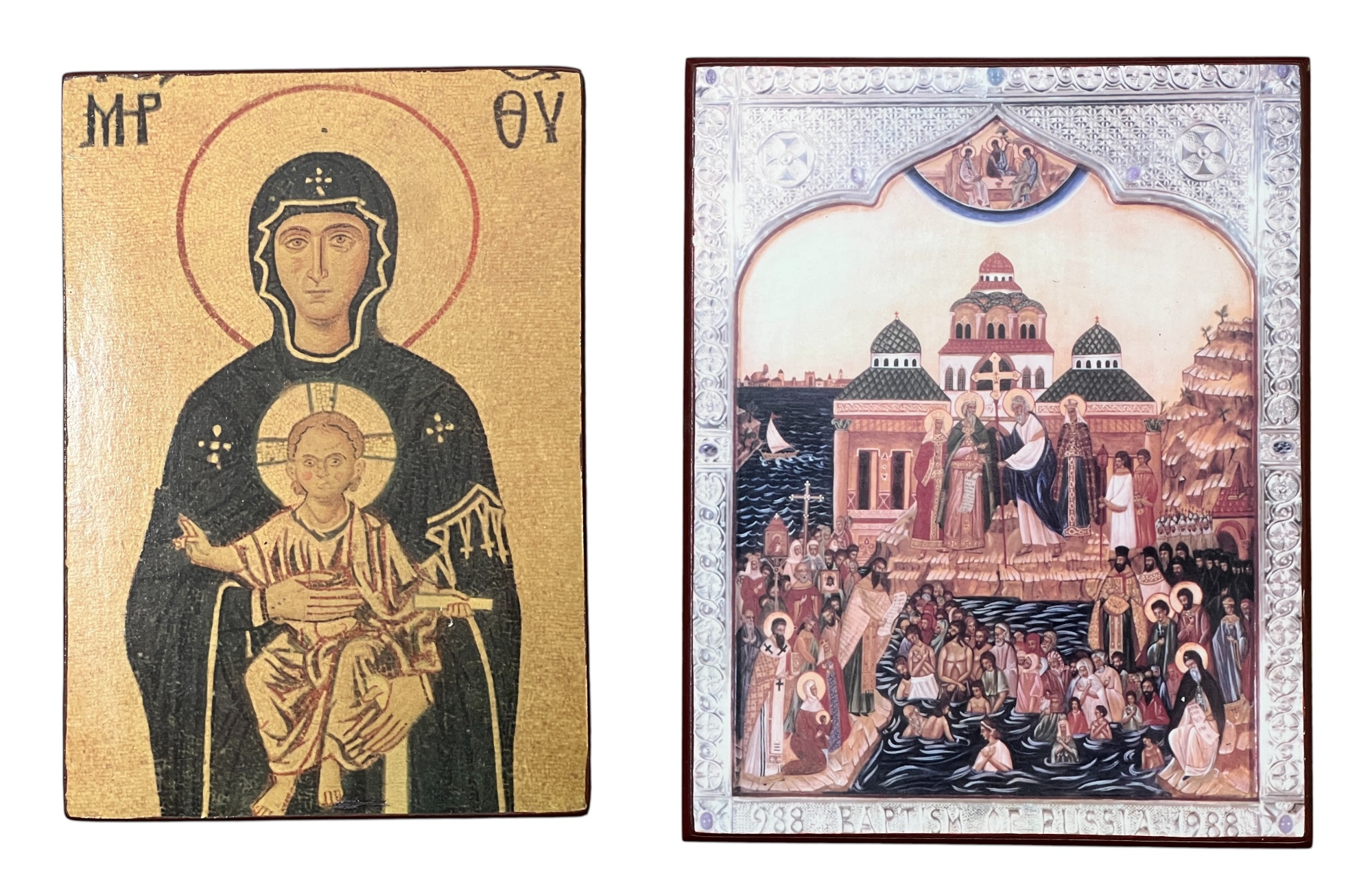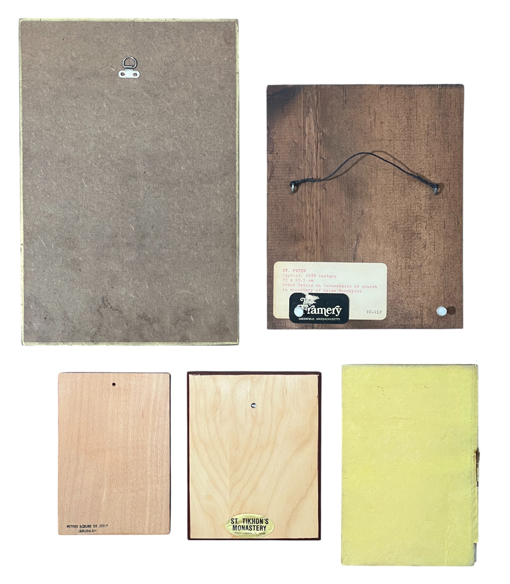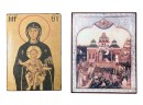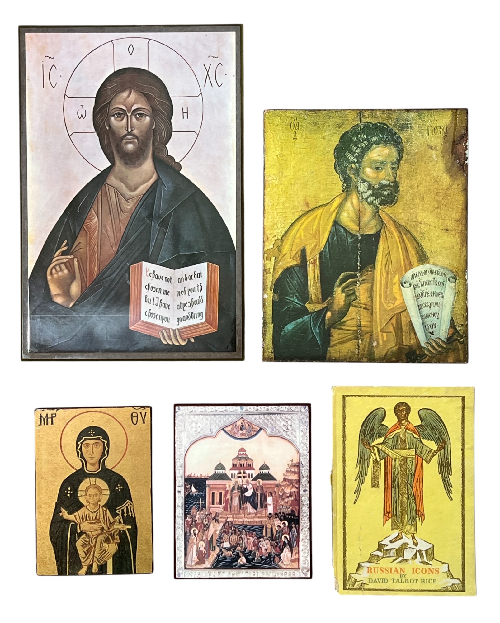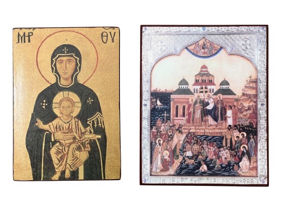 Modern reproductions of antique Eastern Orthodox icons. Various Saints depicted, some with labels verso. Please see photos. 11 3/4 x 8 inches. Condition: Good. Temp No 8857