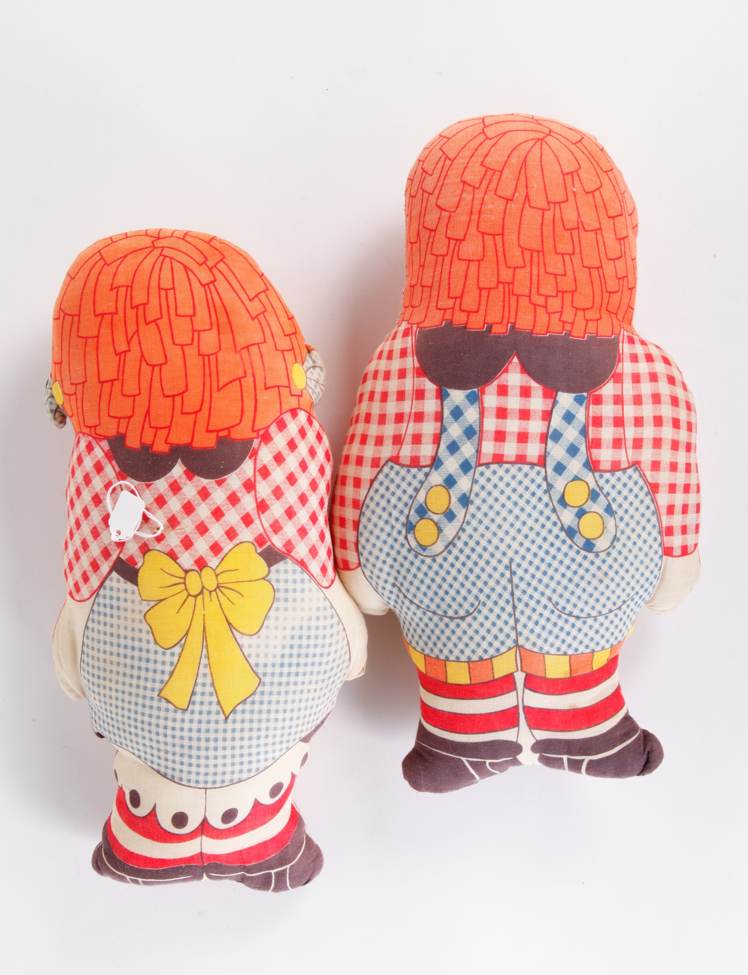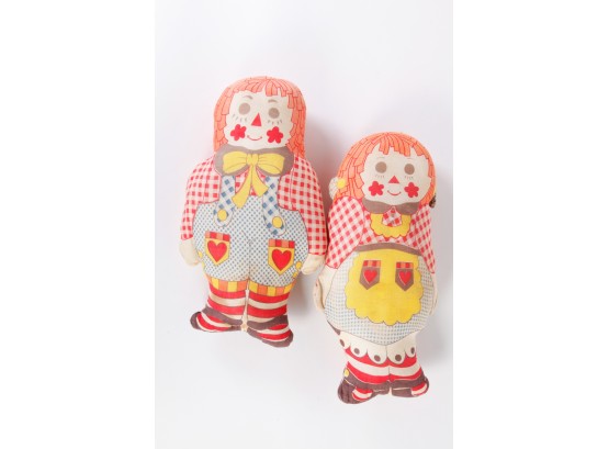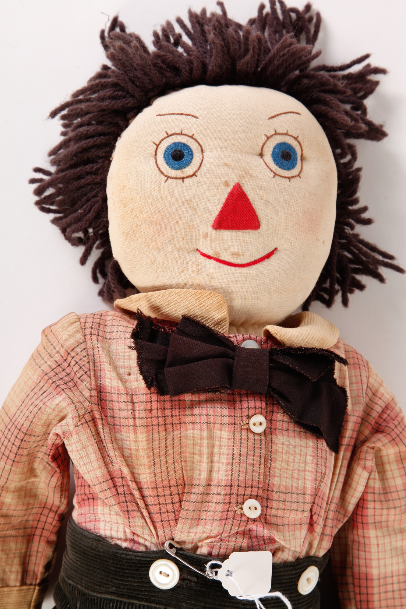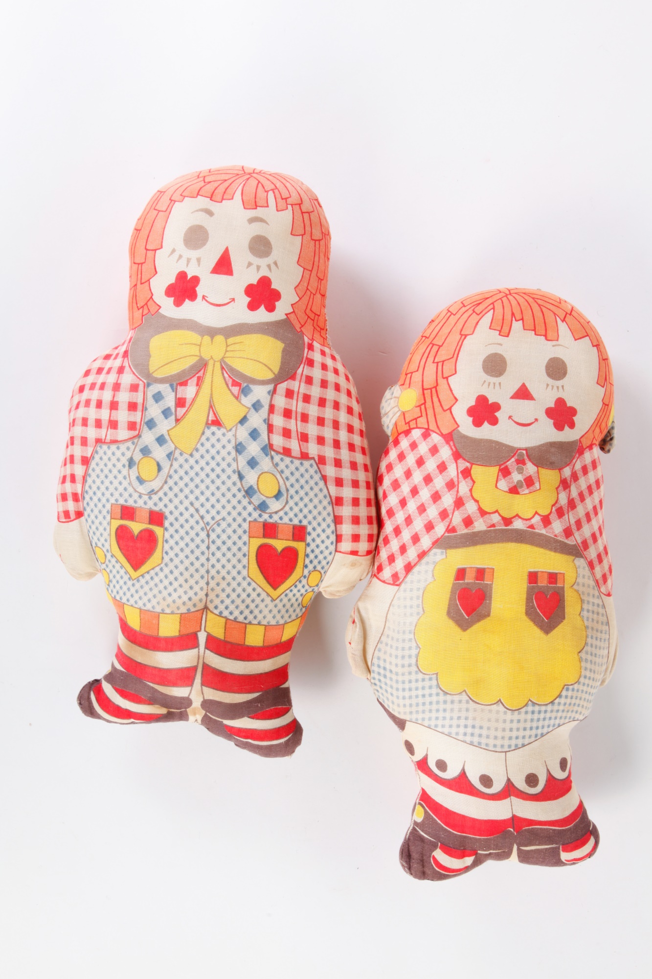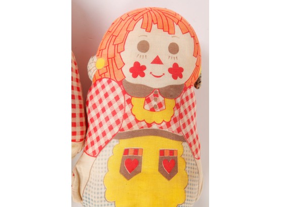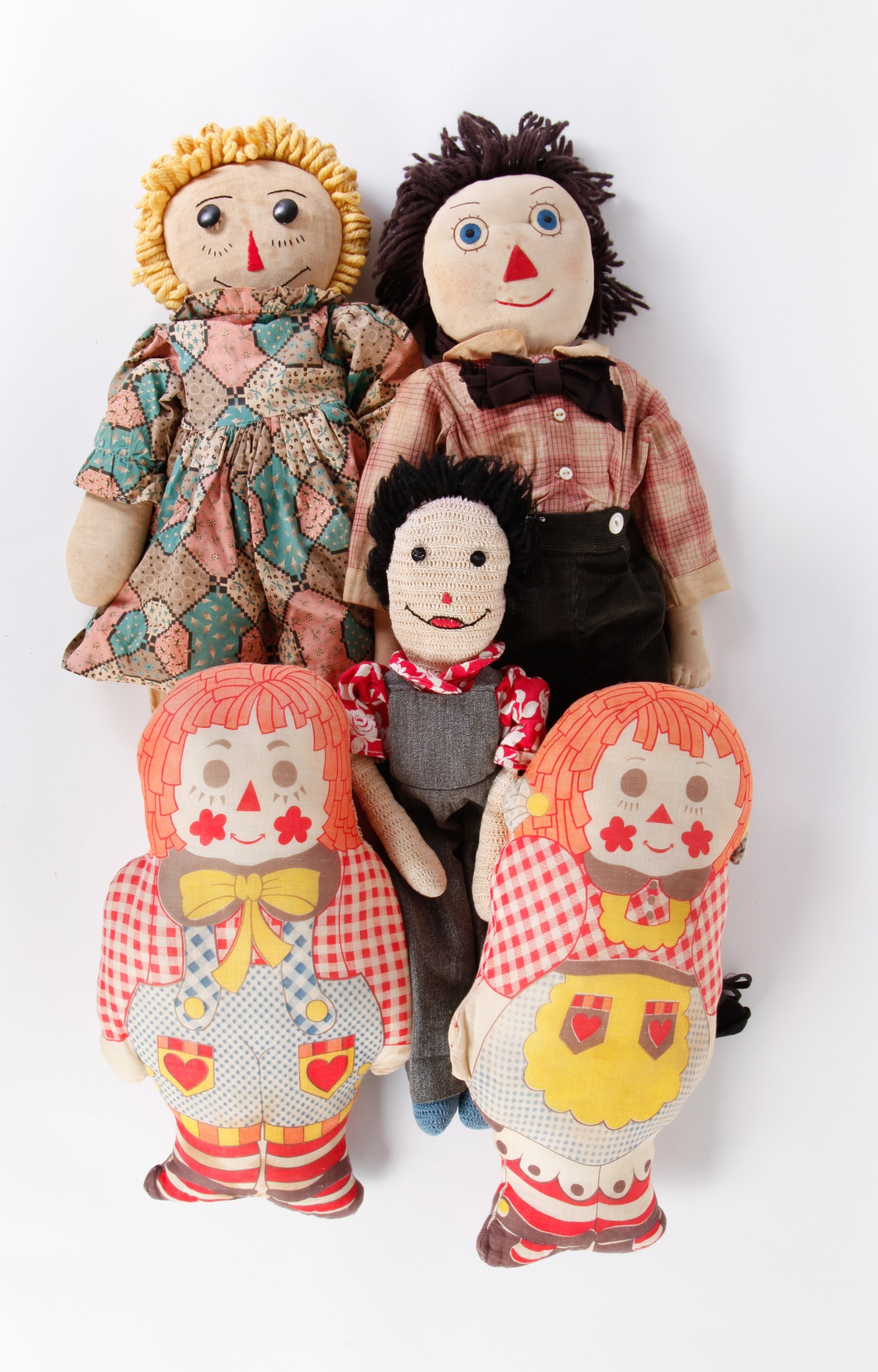 Consisting of 2 Raggedy Andy dolls, a Raggedy Ann doll, and a pair of male and female "Raggedy" dolls, tallest is 24 inches.