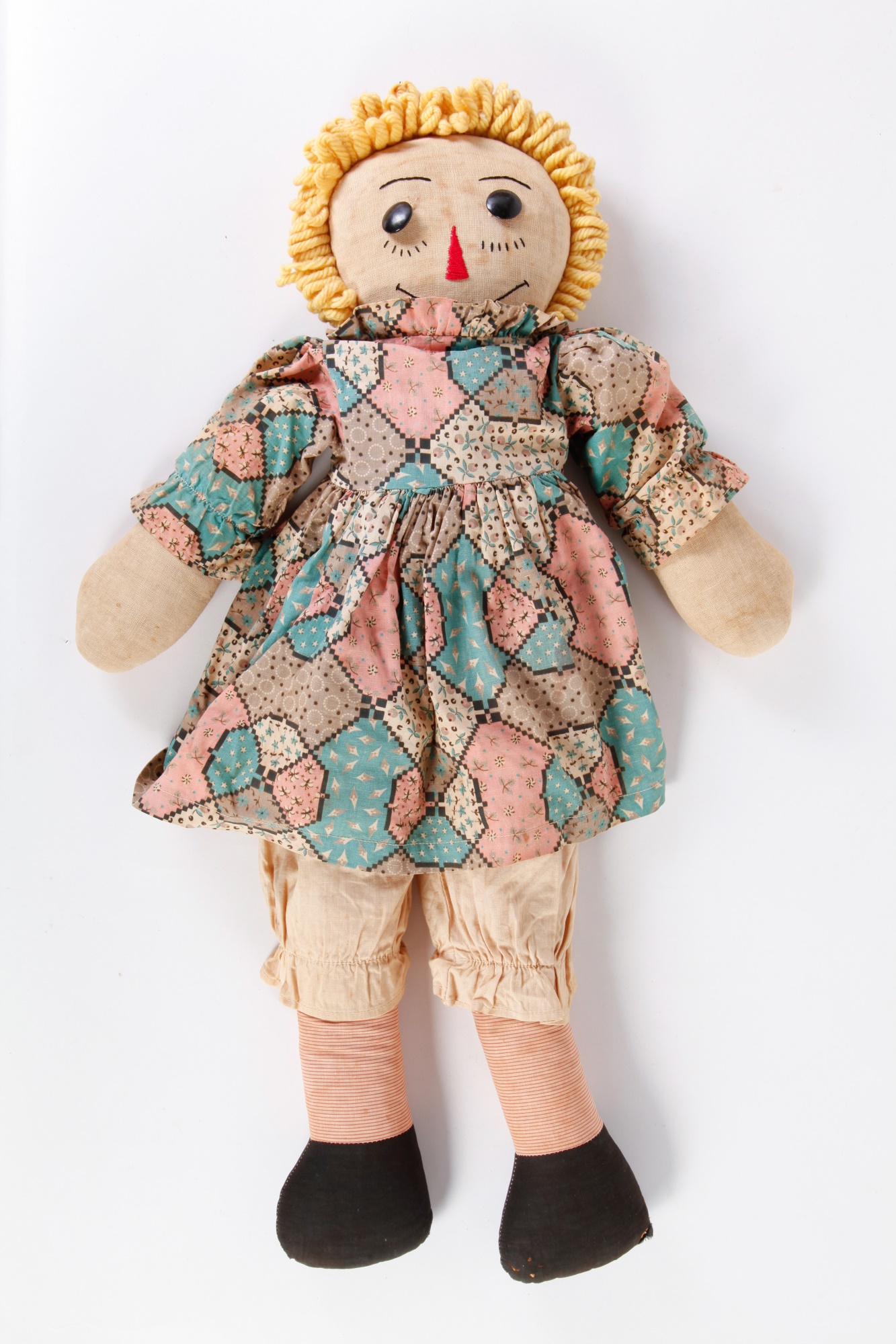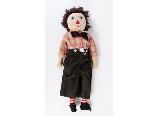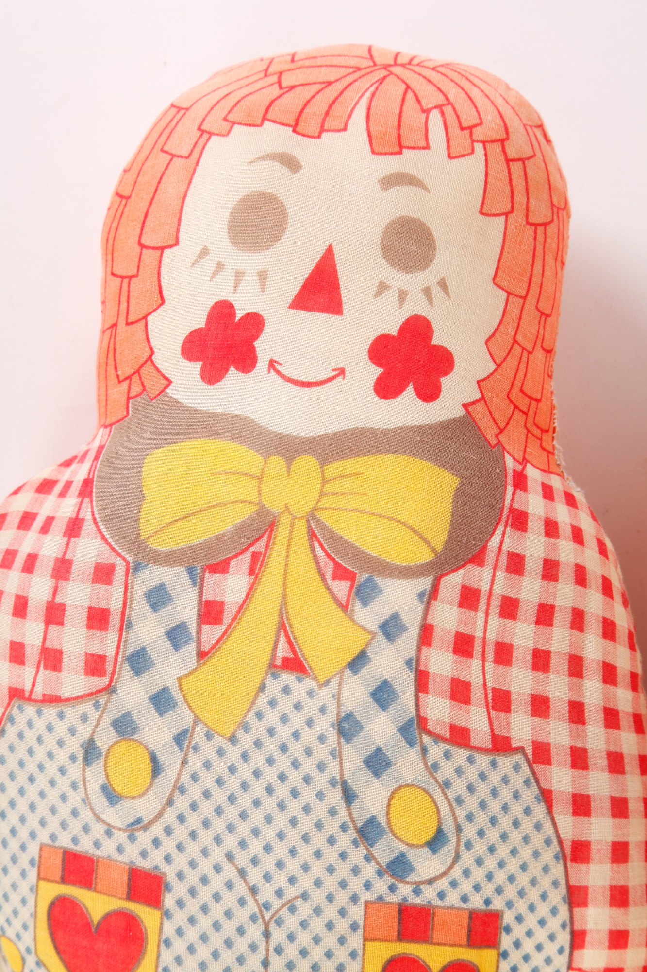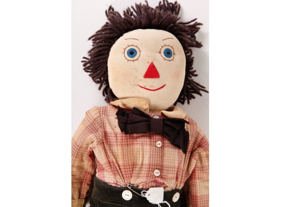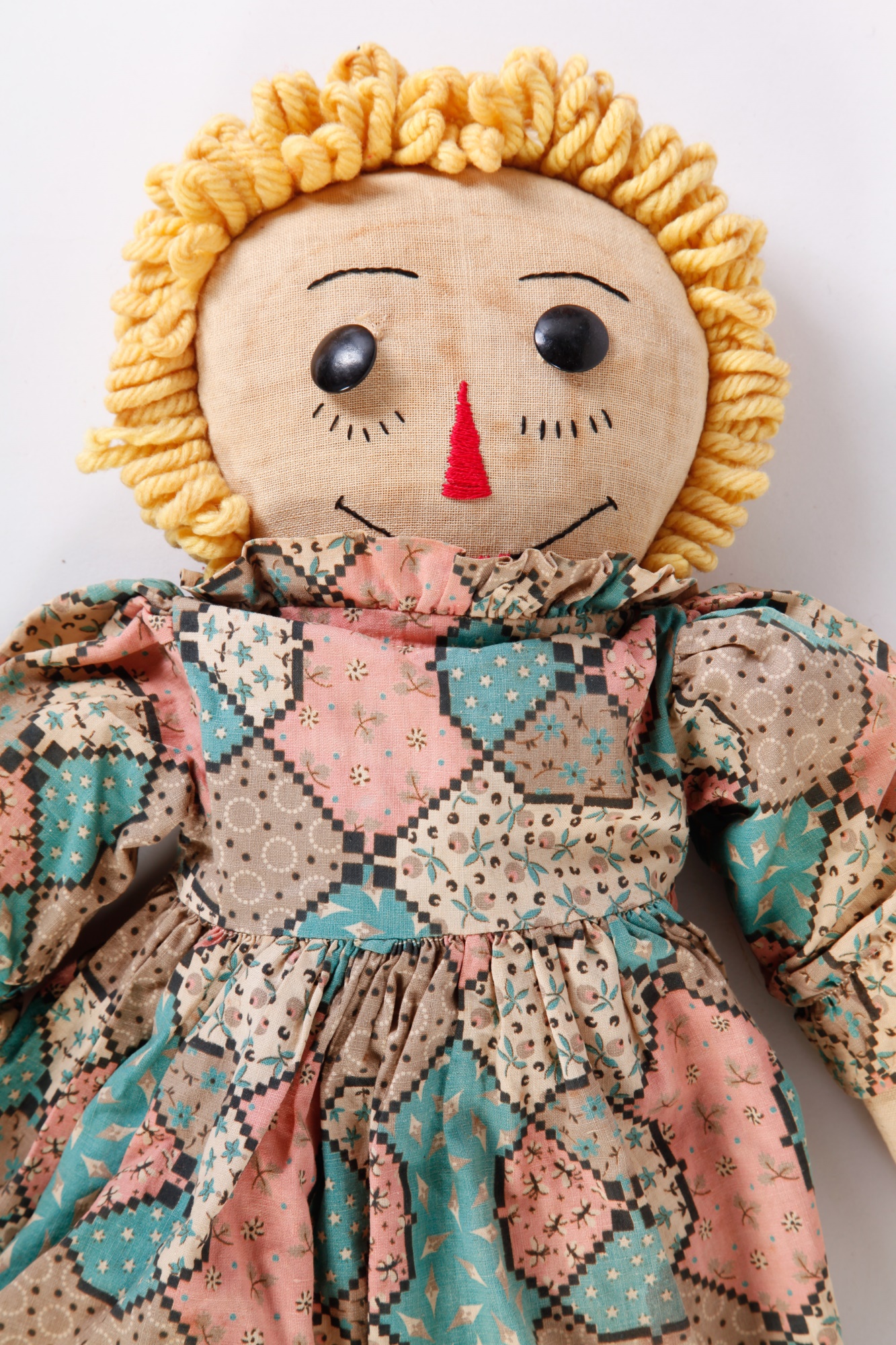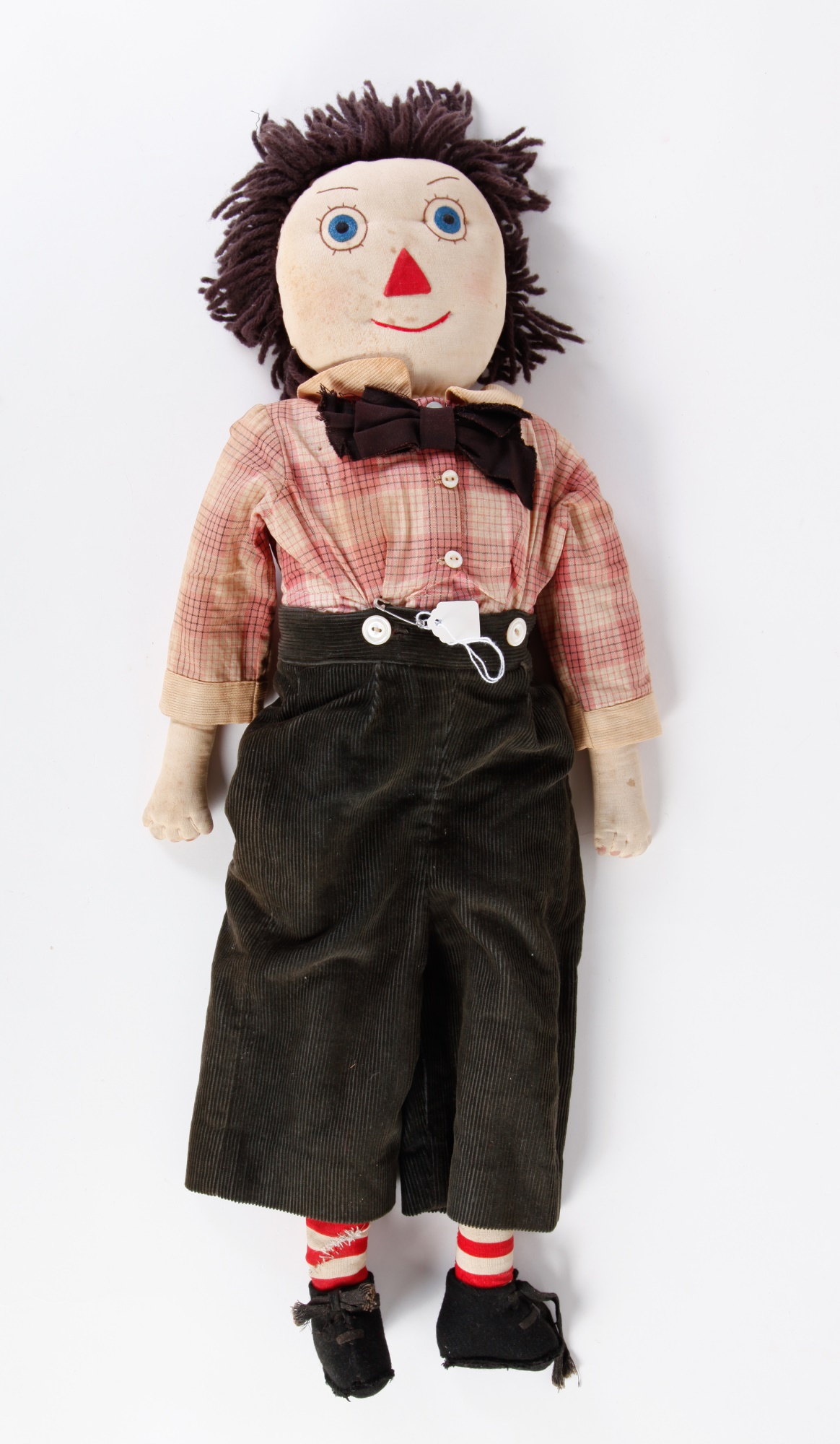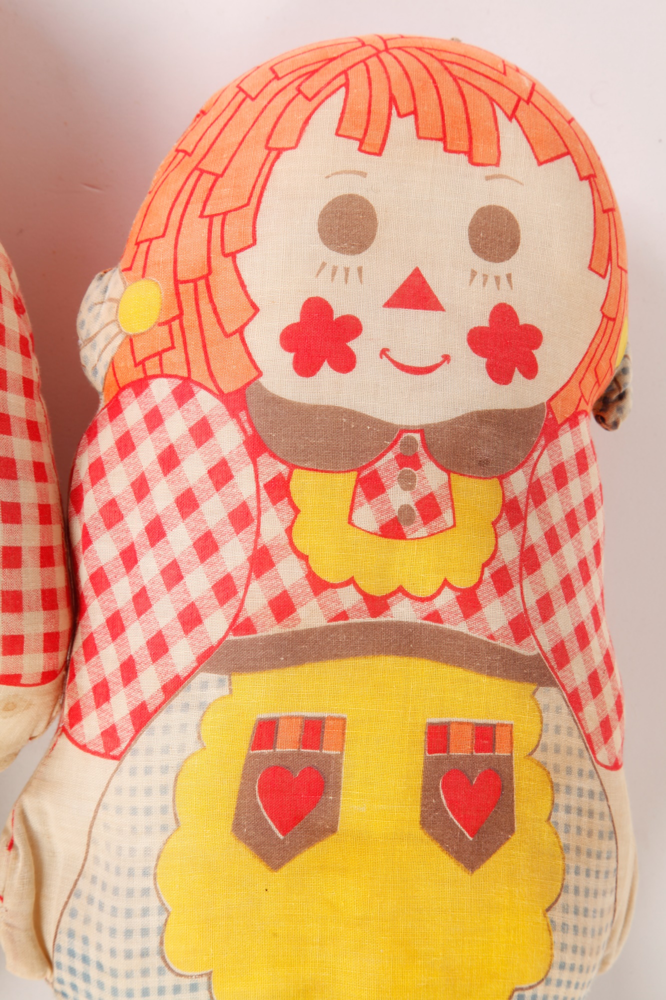 Consisting of 2 Raggedy Andy dolls, a Raggedy Ann doll, and a pair of male and female "Raggedy" dolls, tallest is 24 inches.