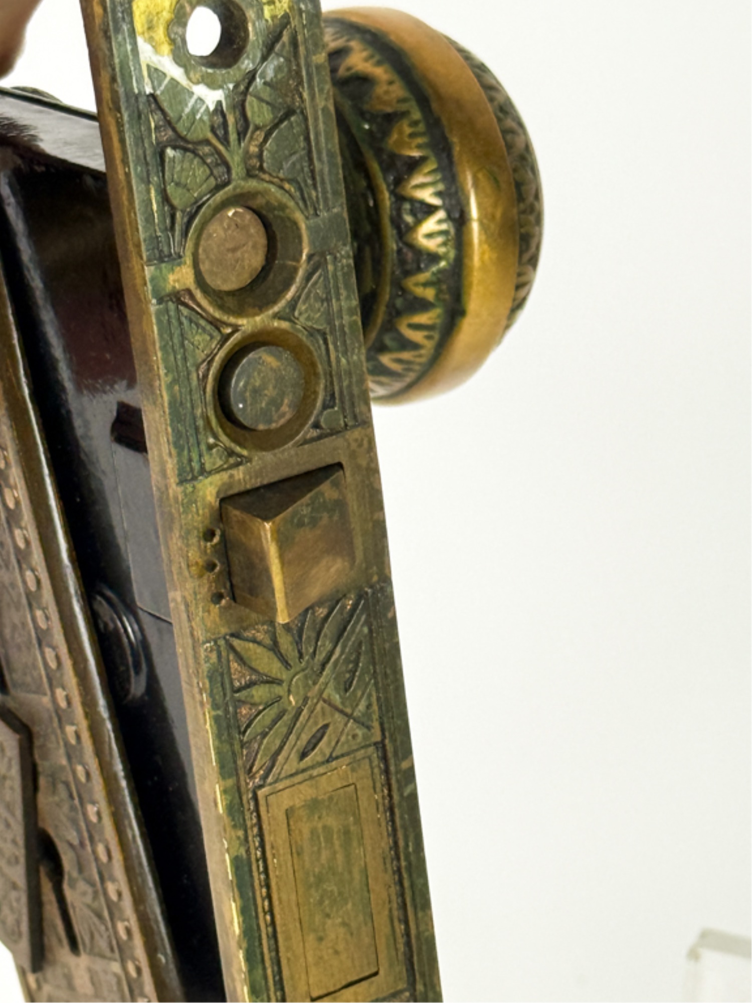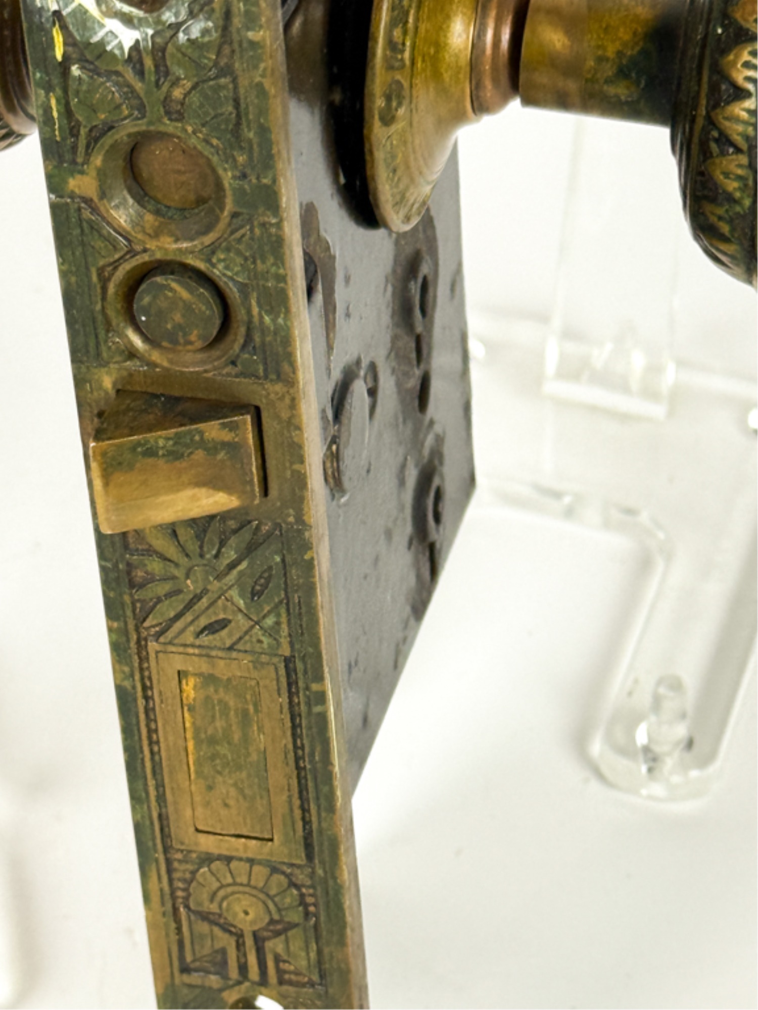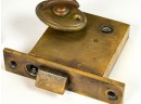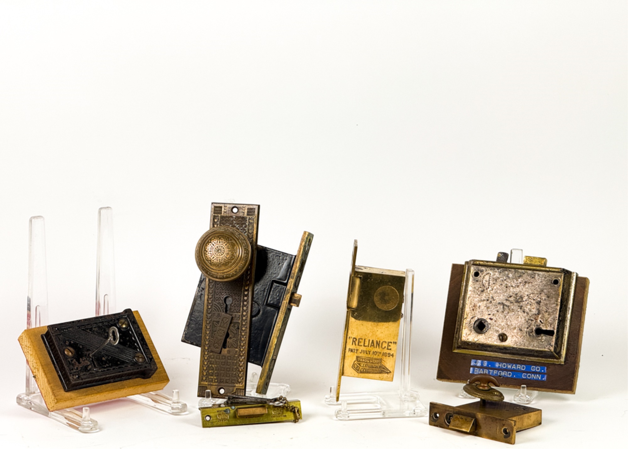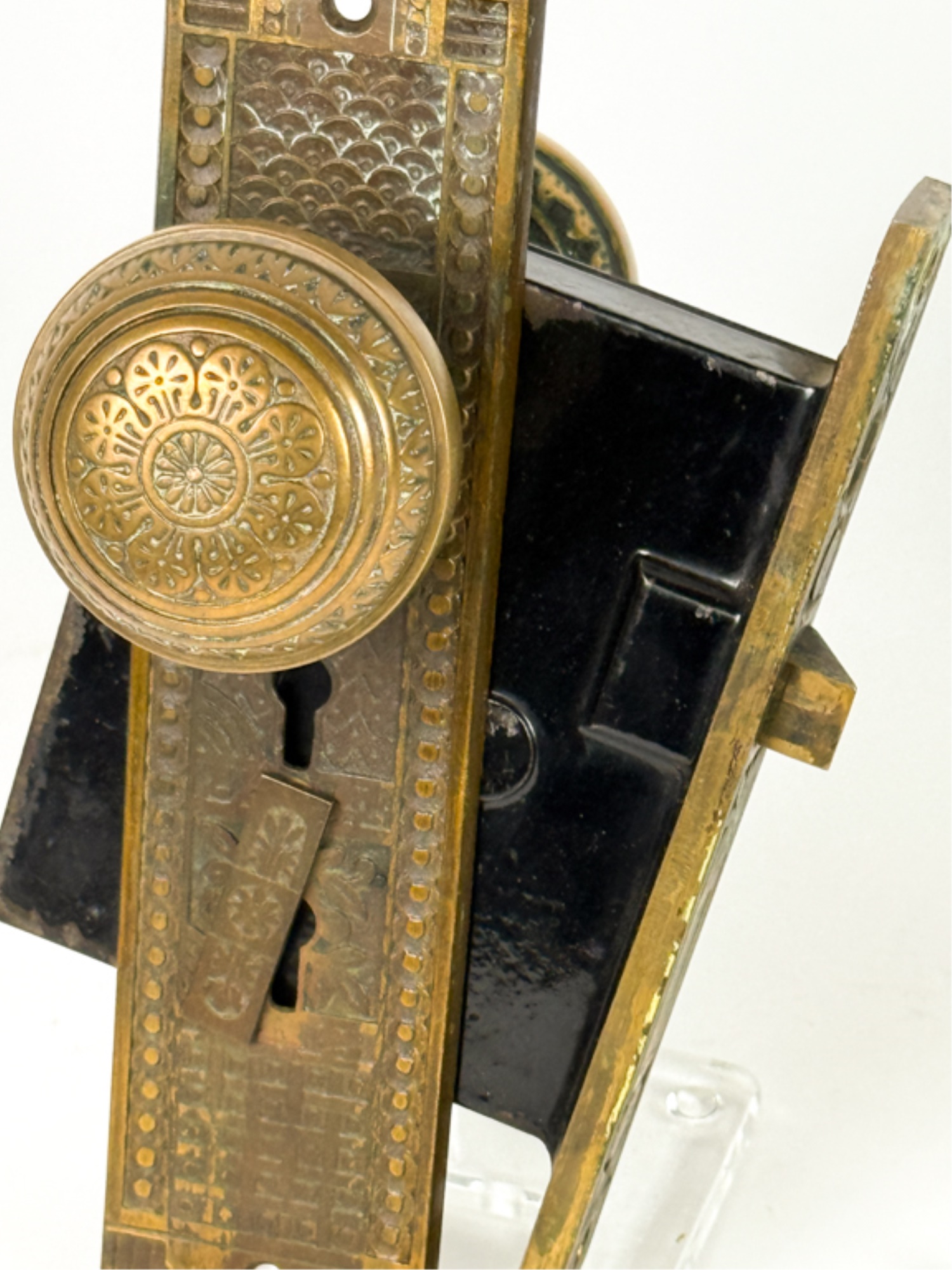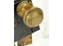 J.L. Howard Co. (Hartford, CT), Mallory Wheeler Co., "Reliance", Hobbs..? (England), pair of fancy Aesthetic Movement knobs with (1) backplate, strike plate, and locking mechanism. 6 3/4 x 4 inches.