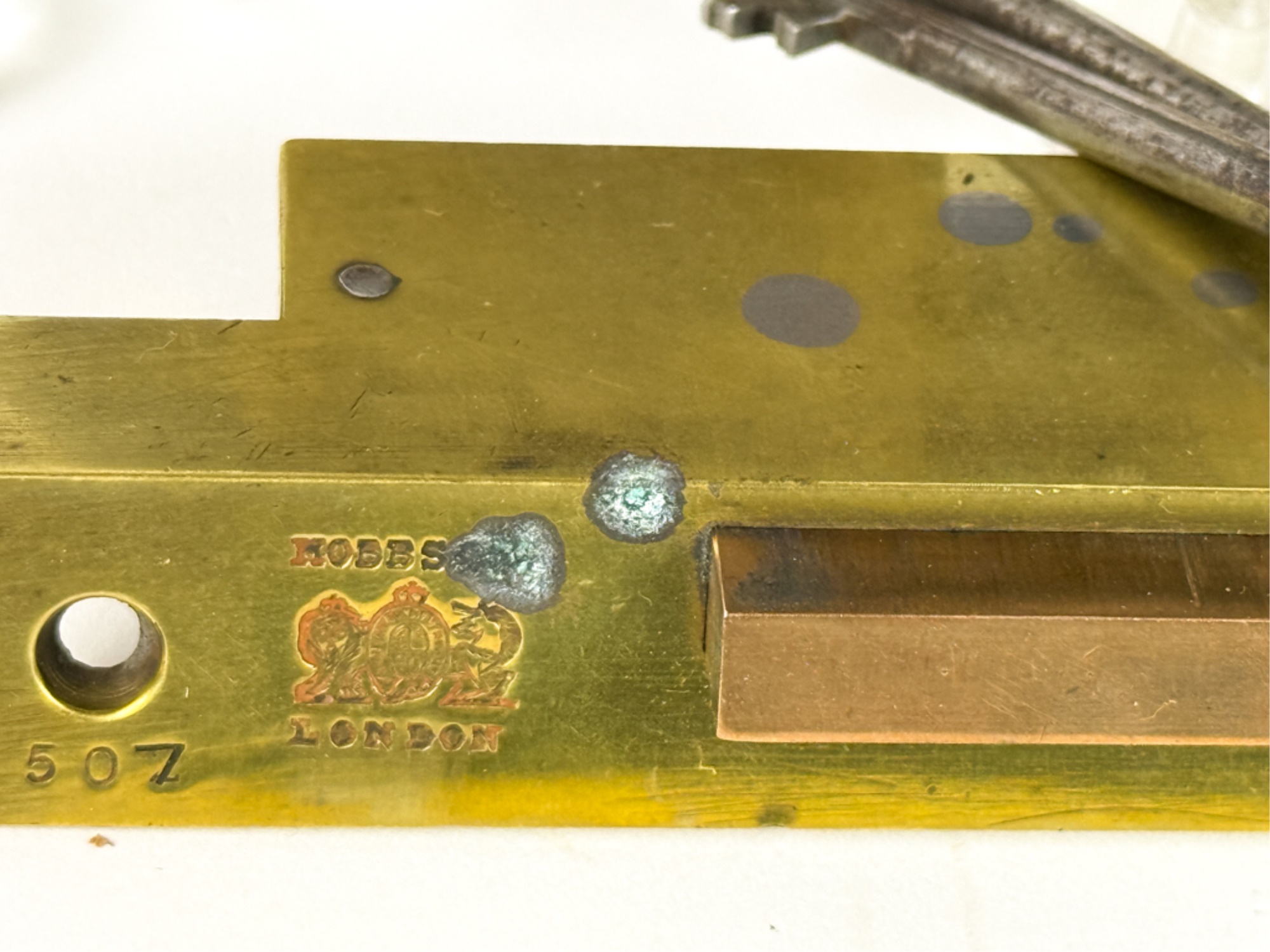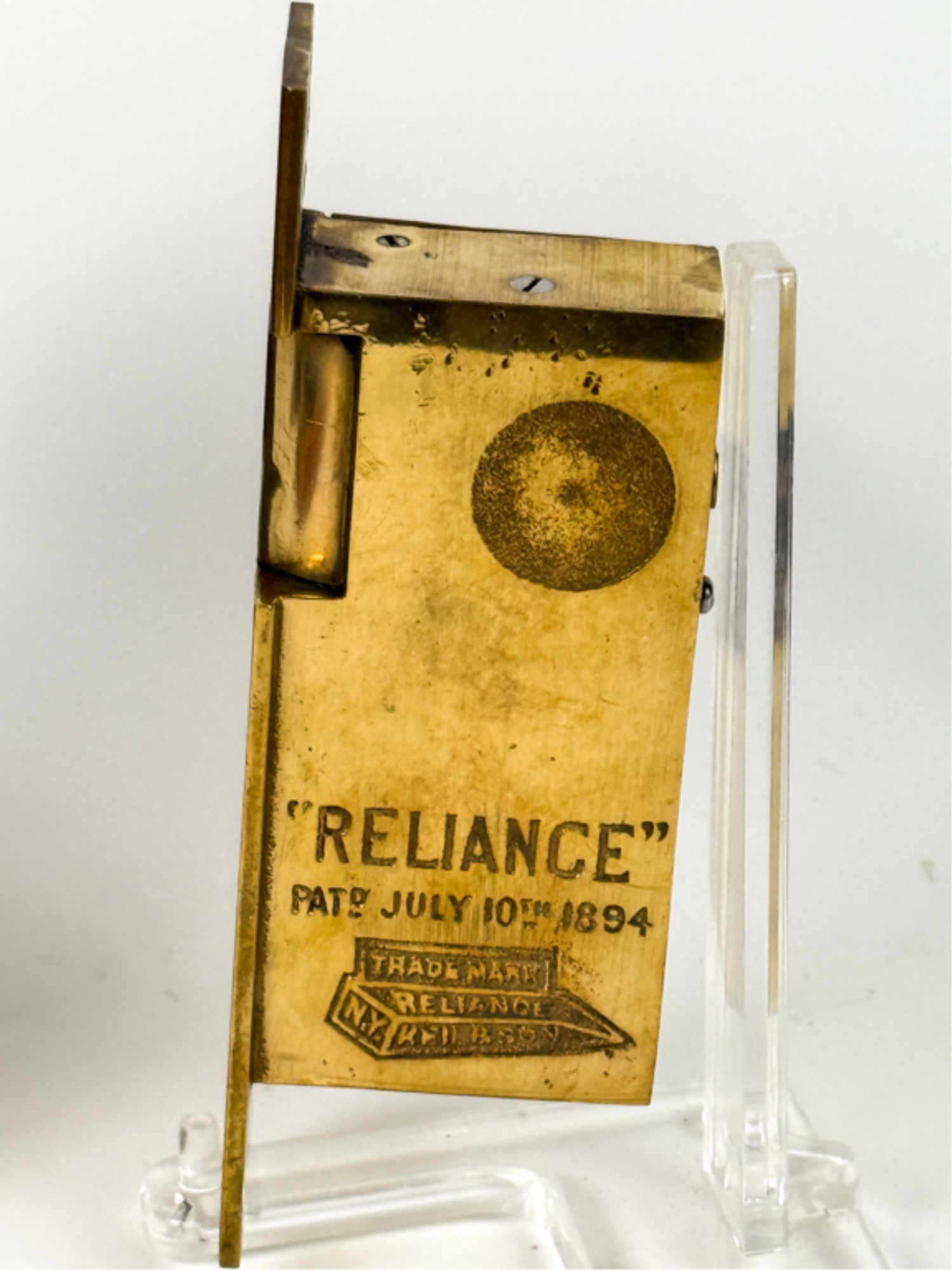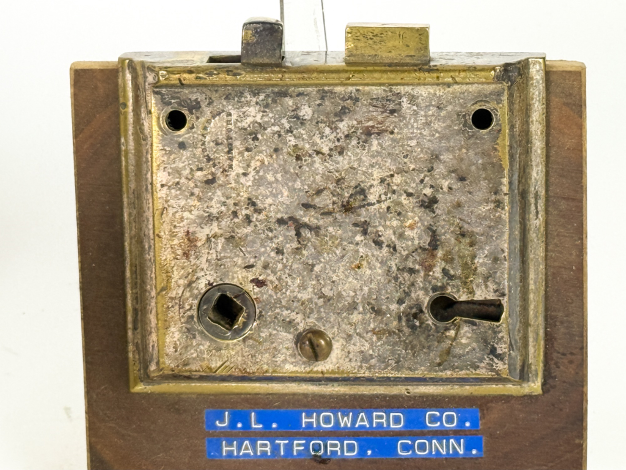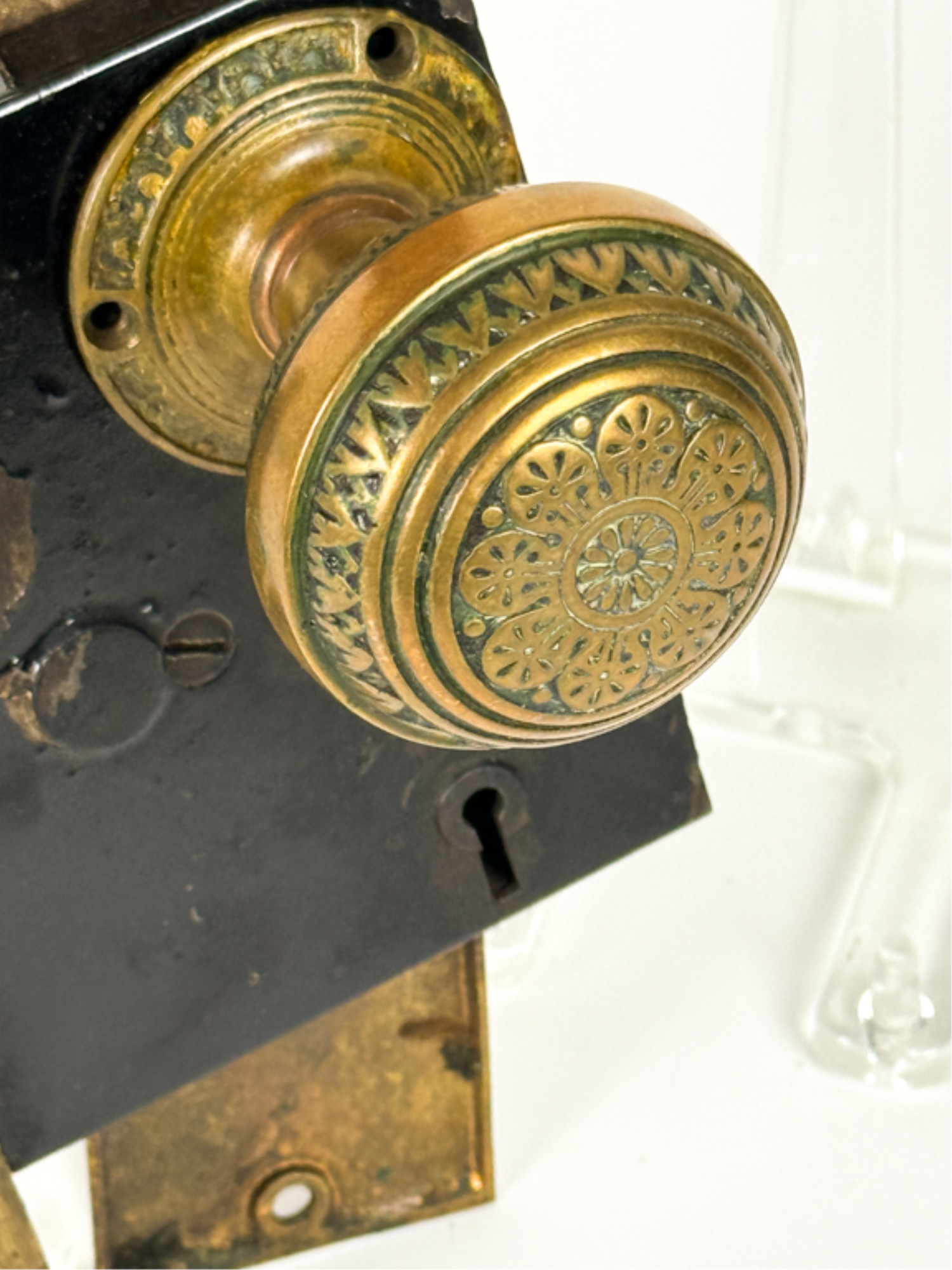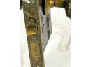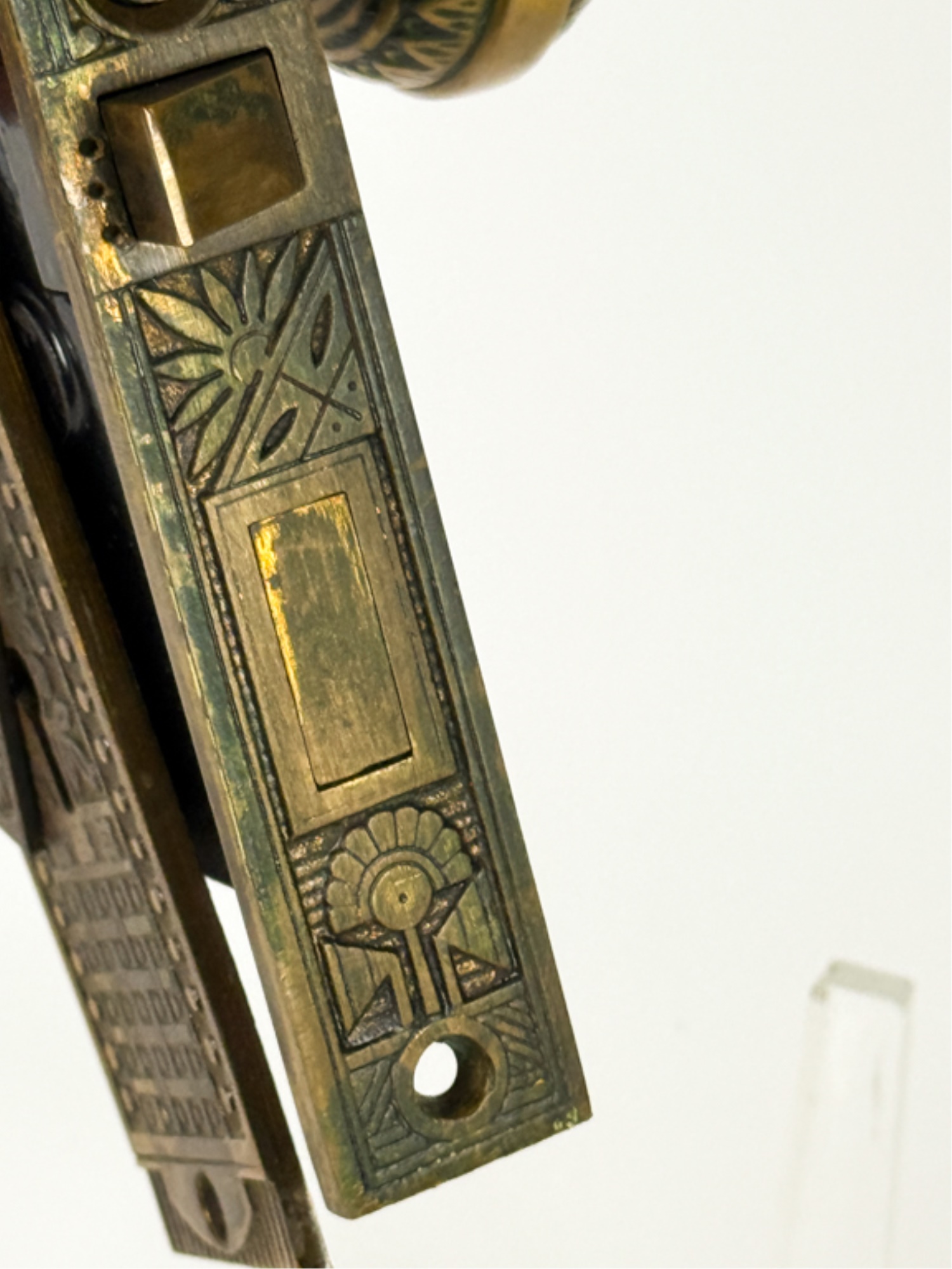 J.L. Howard Co. (Hartford, CT), Mallory Wheeler Co., "Reliance", Hobbs..? (England), pair of fancy Aesthetic Movement knobs with (1) backplate, strike plate, and locking mechanism. 6 3/4 x 4 inches.