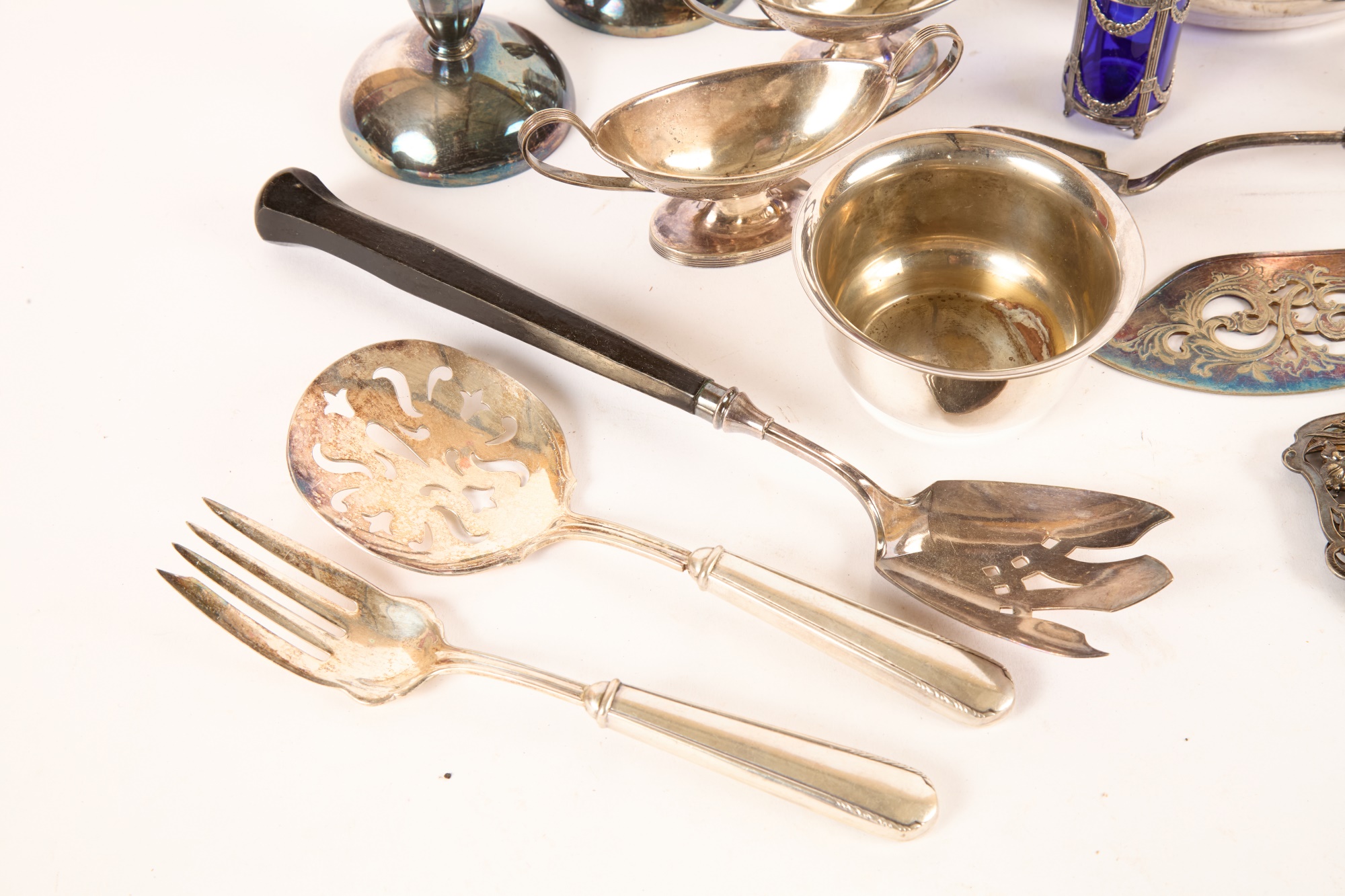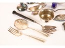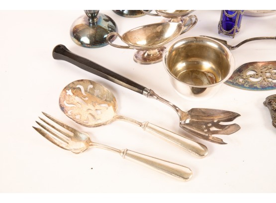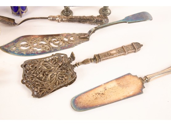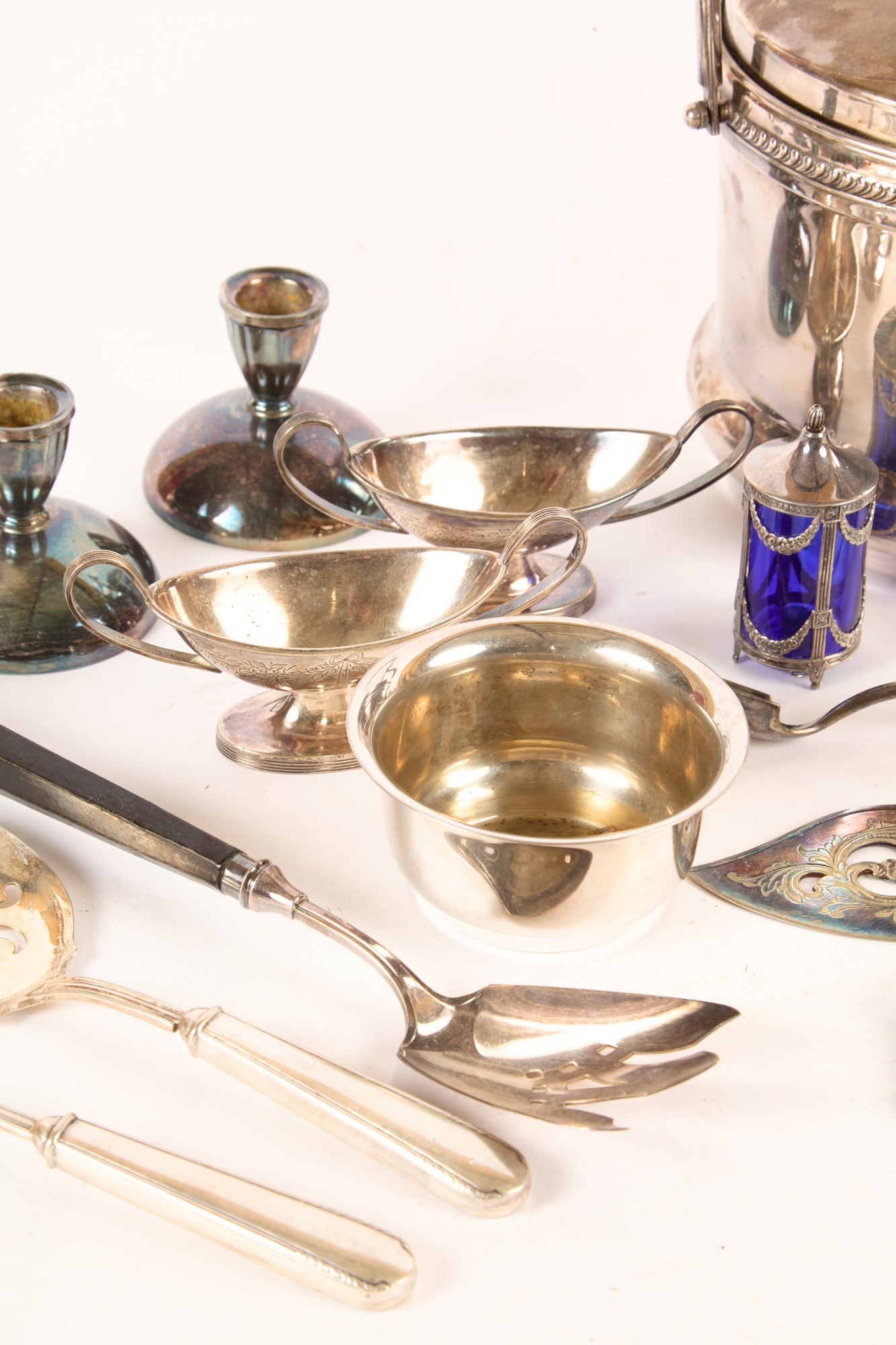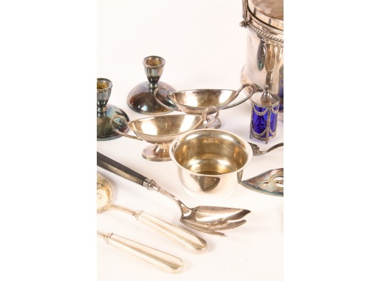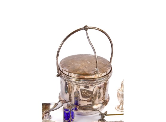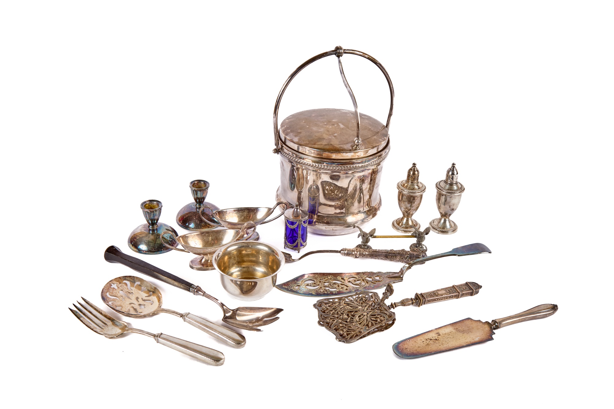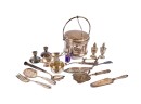 Including: Weighted salt and pepper and salad set with handles and pie server marked sterling, Pair of unmarked loop-handle salts appear to test to a low grade silver. The remainder is largely silver plated. Condition: Good, ice bucket's hinge is detached.