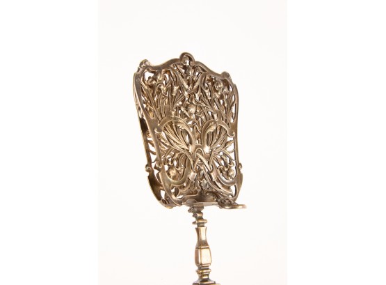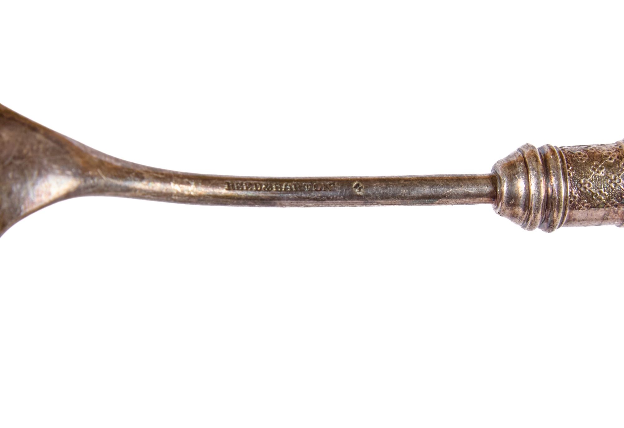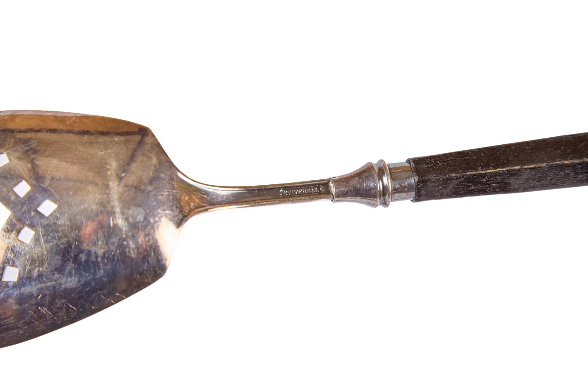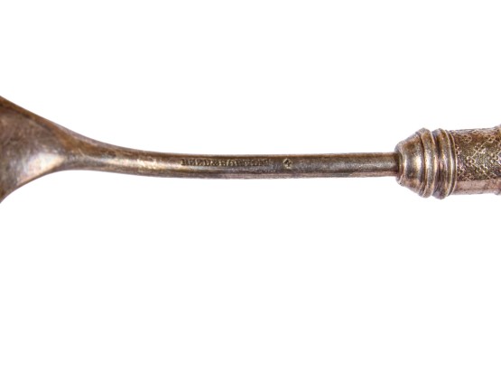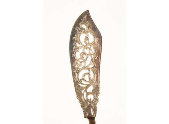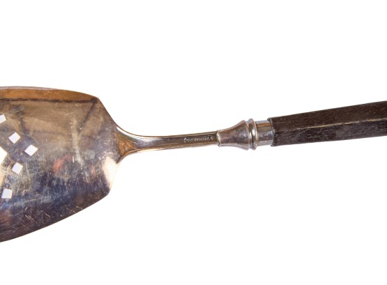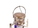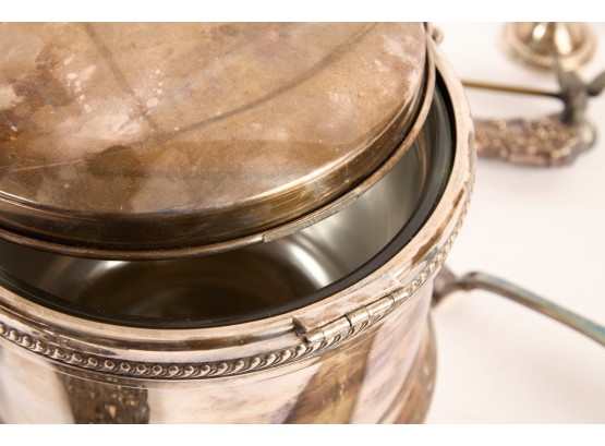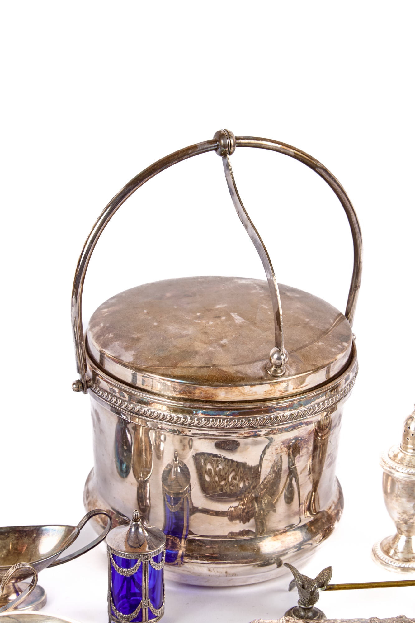Including: Weighted salt and pepper and salad set with handles and pie server marked sterling, Pair of unmarked loop-handle salts appear to test to a low grade silver. The remainder is largely silver plated. Condition: Good, ice bucket's hinge is detached.