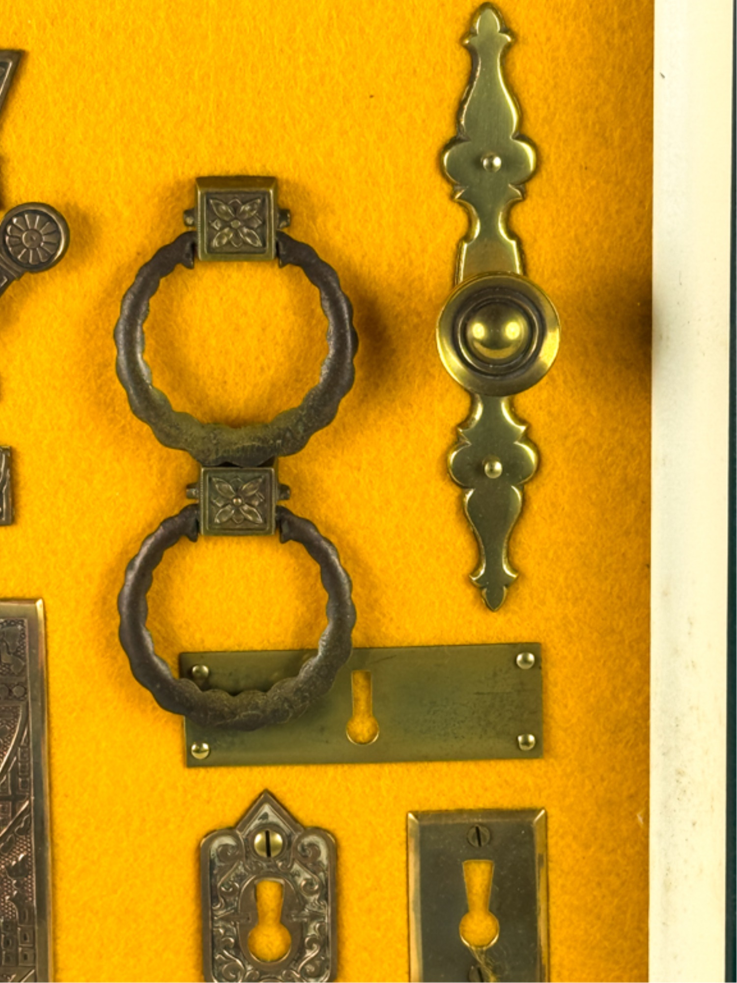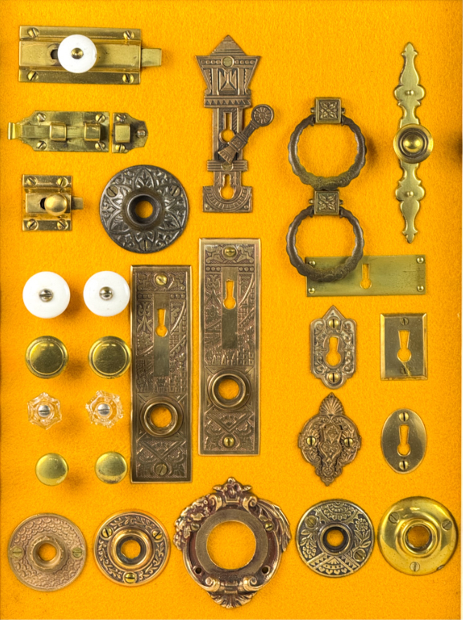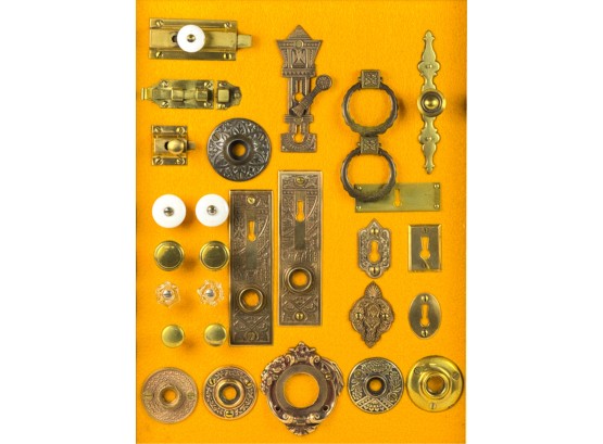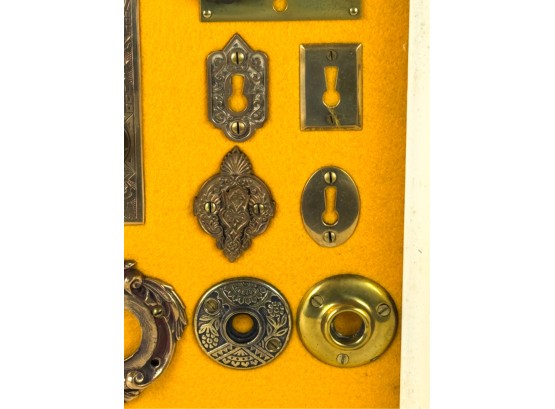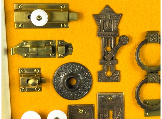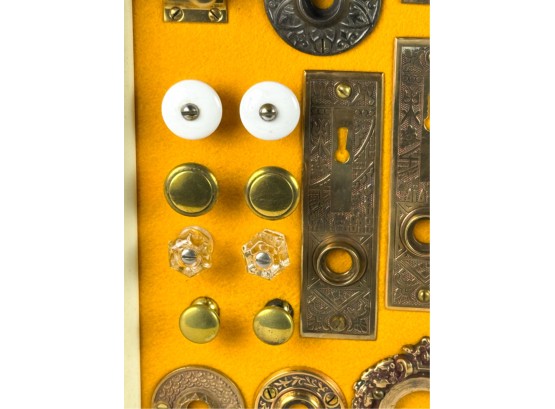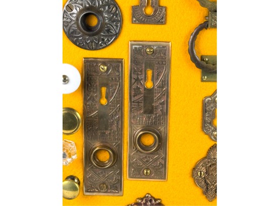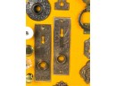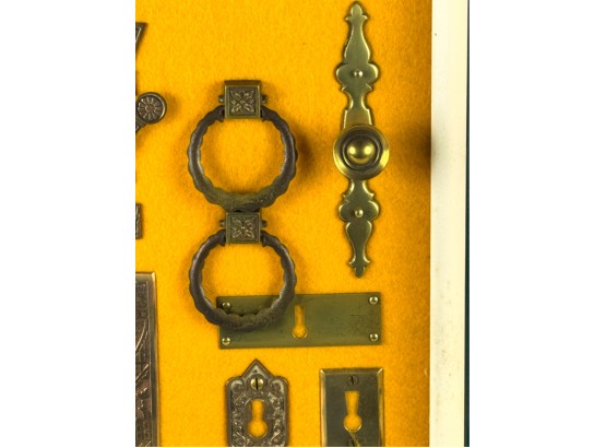 Pulls, Rosettes, escutcheons, latches, etc. Mounted to display. Tallest measures 5 1/2 inches. Condition: Good. Temp No 4225
