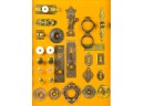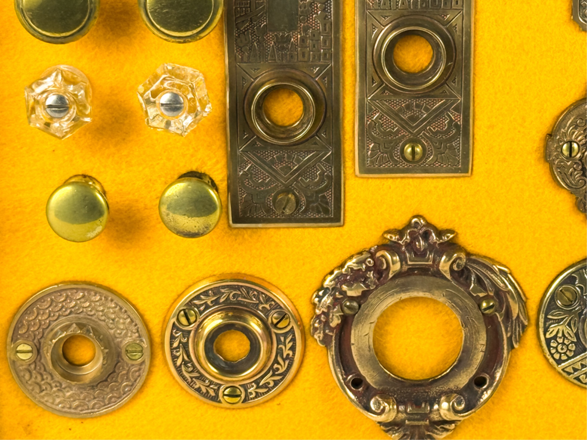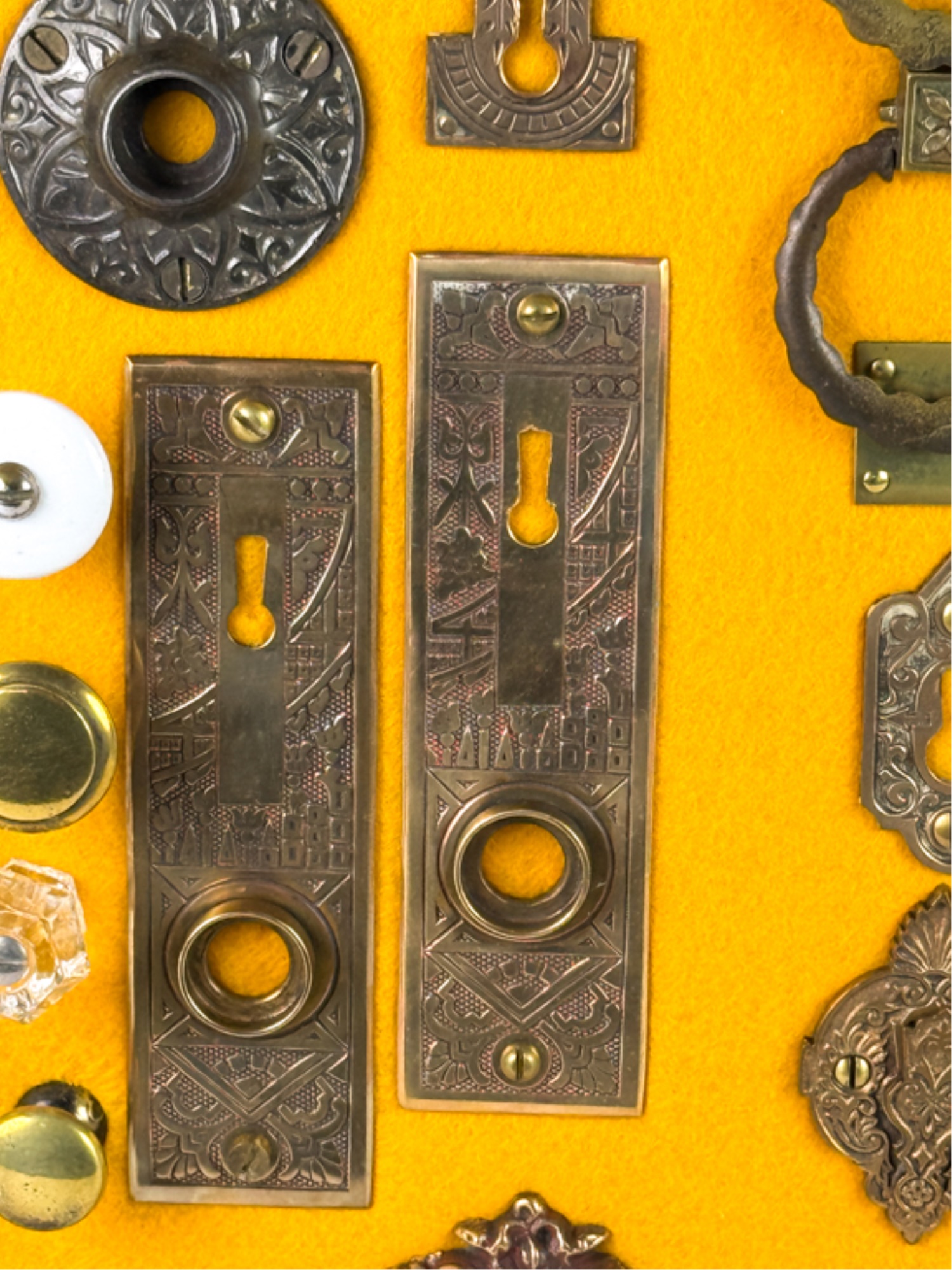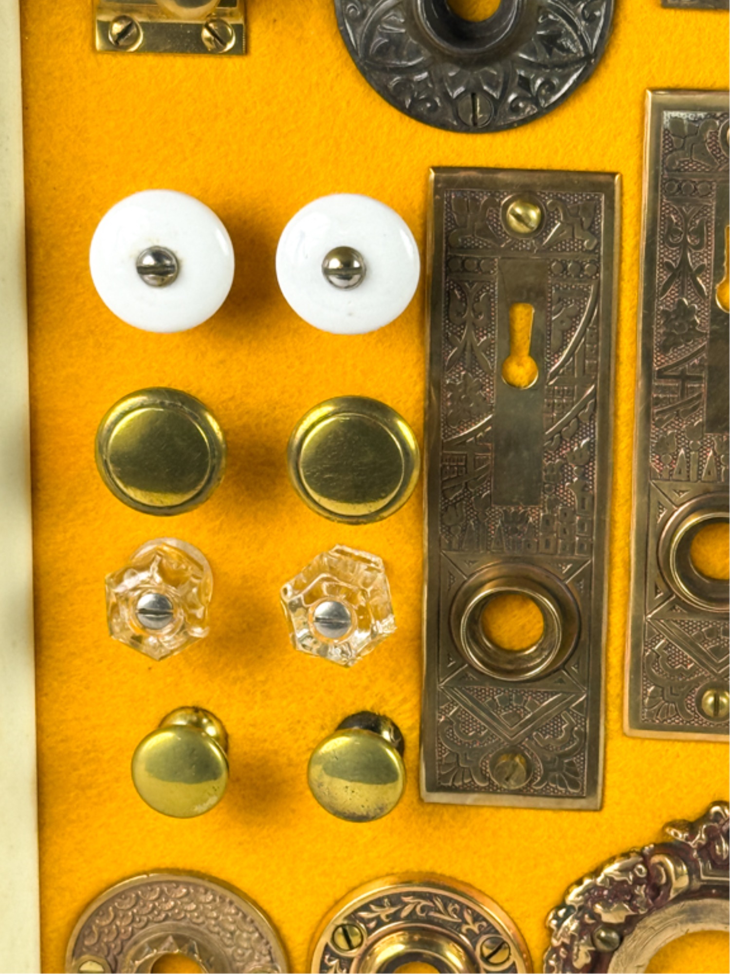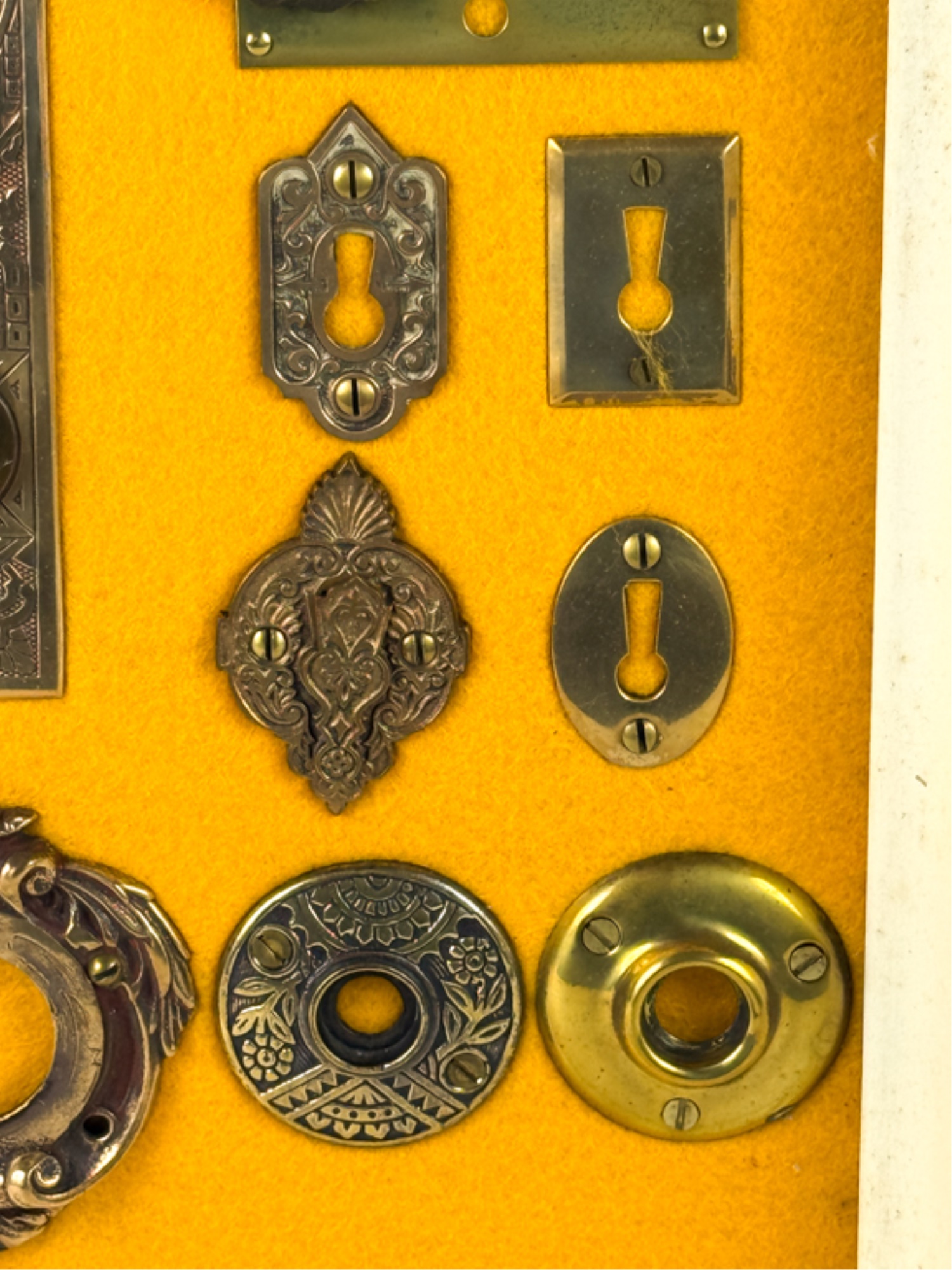 Pulls, Rosettes, escutcheons, latches, etc. Mounted to display. Tallest measures 5 1/2 inches. Condition: Good. Temp No 4225