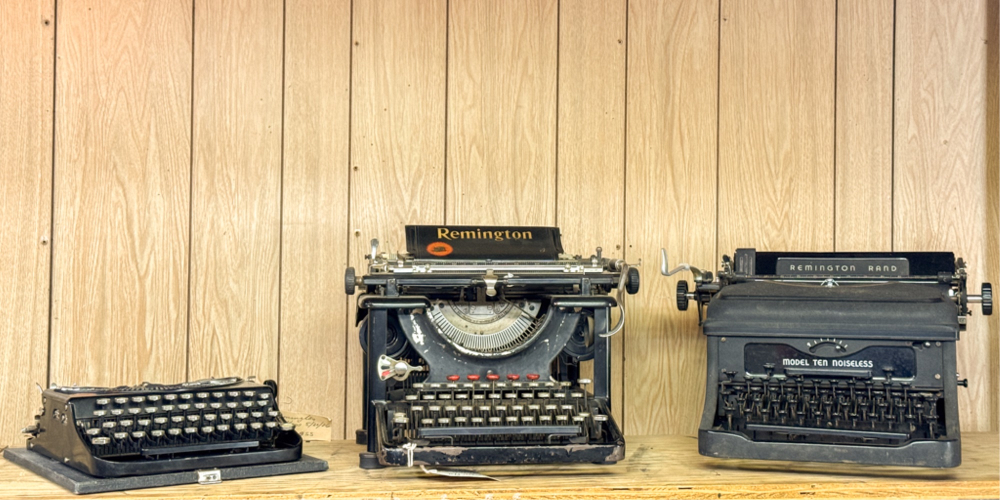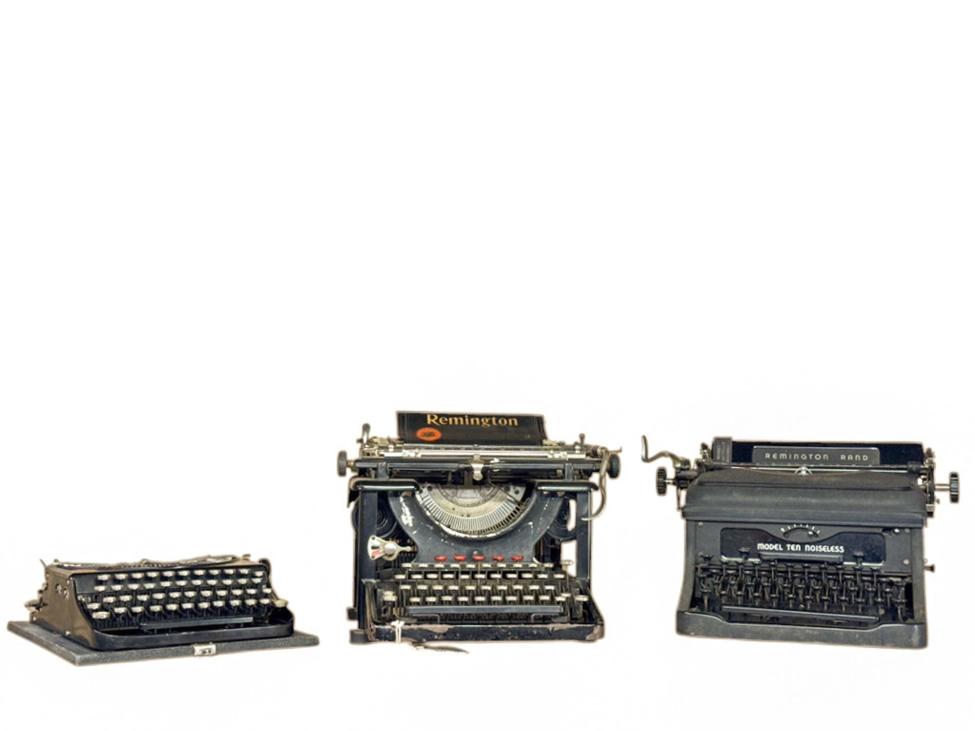 Portable, Noiseless and Noiseless 10. Largest measures 11 1/2 x 15 x 14 inches. Condition: Good. Carriage return moves crisply. Some keys stick, may need cleaning/oil. Temp No 19a