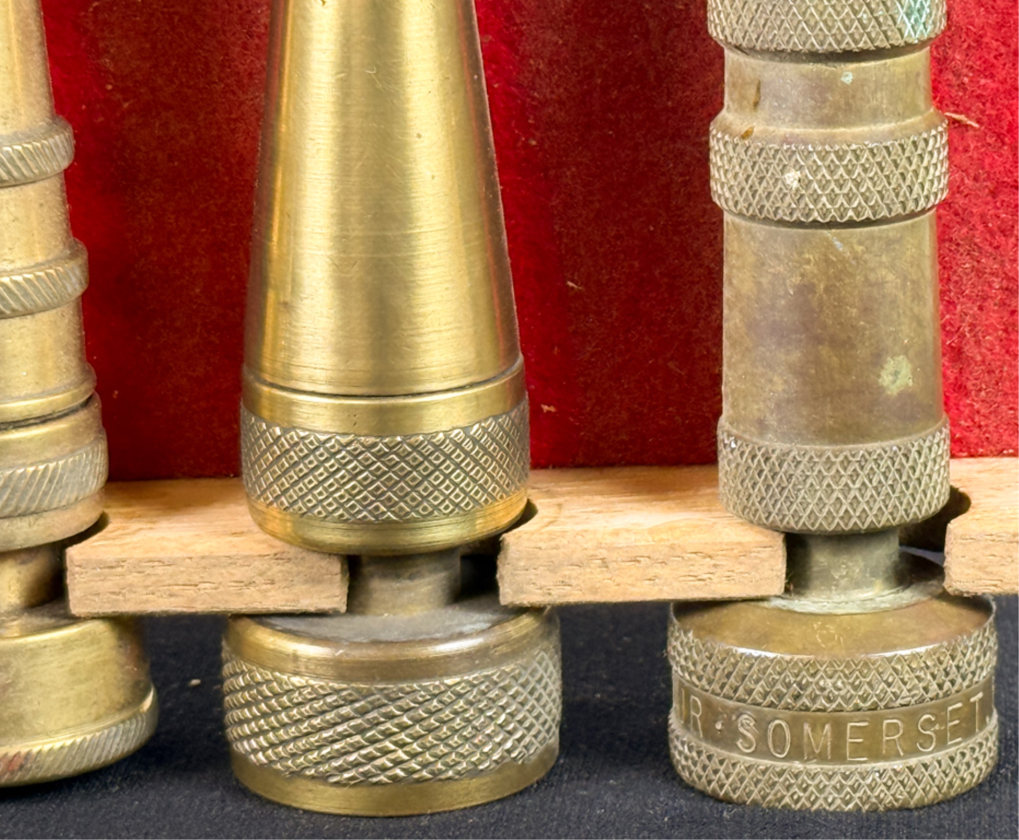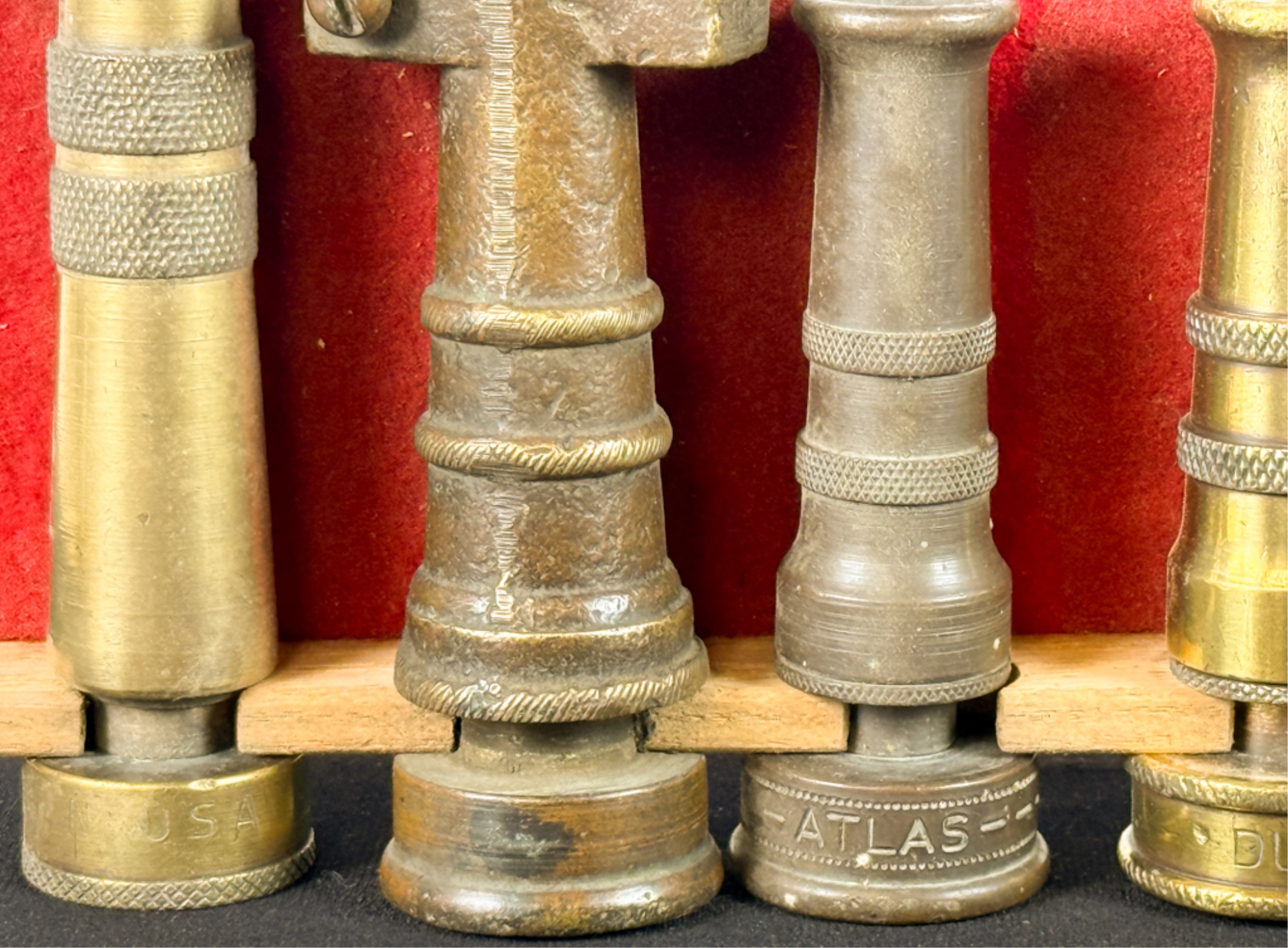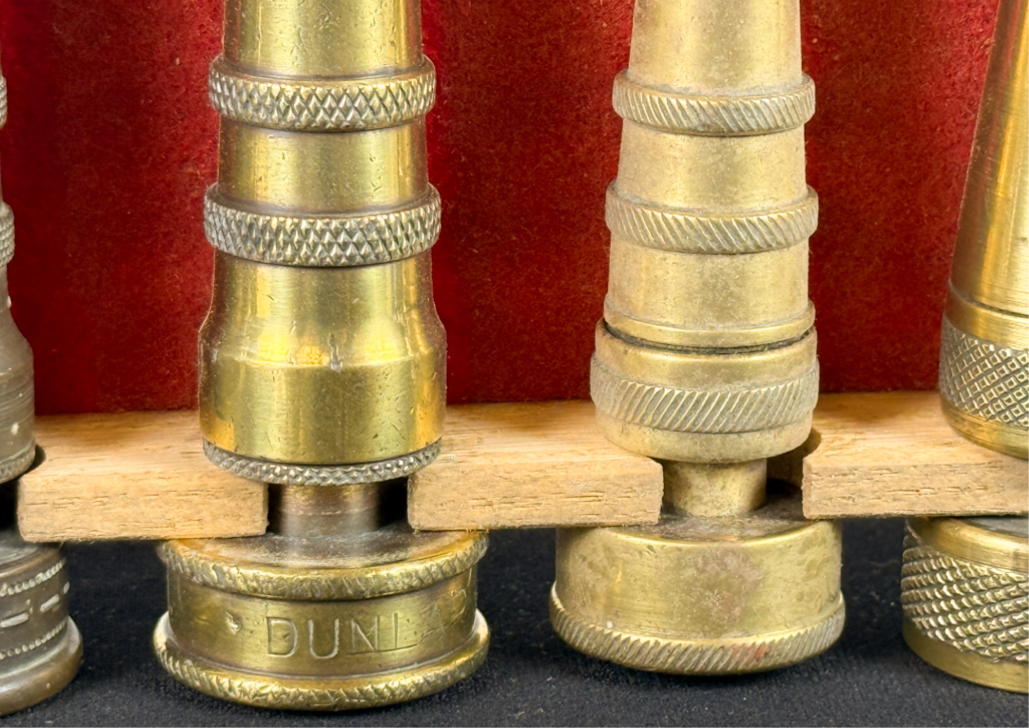 Somerset, Atlas Brass, Dunlap, etc. Tallest measures 4 inches. With custom display stand. Condition: Expected wear from use. Temp No 4025