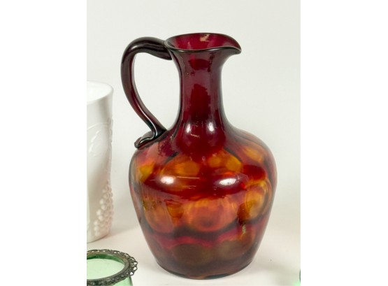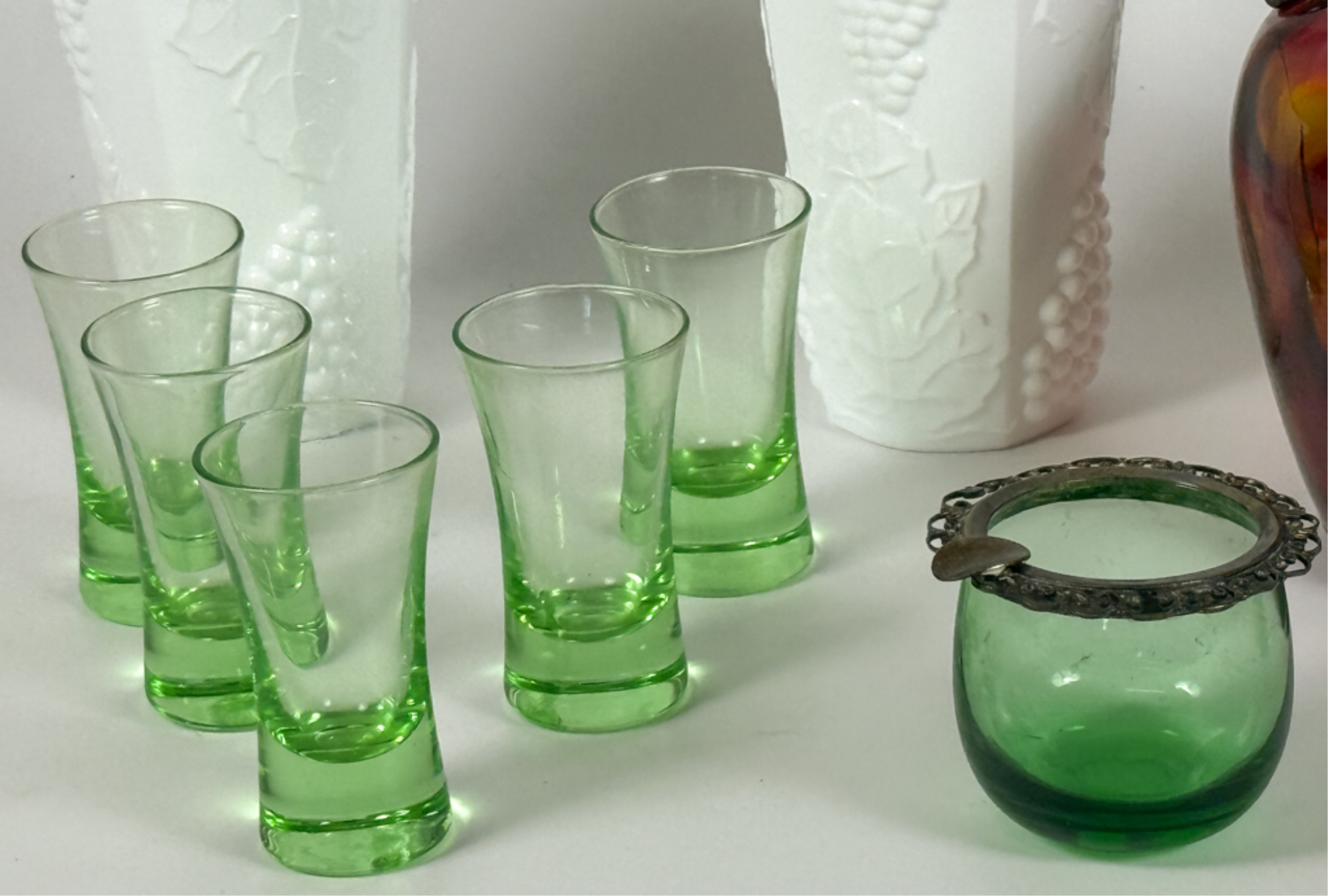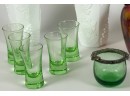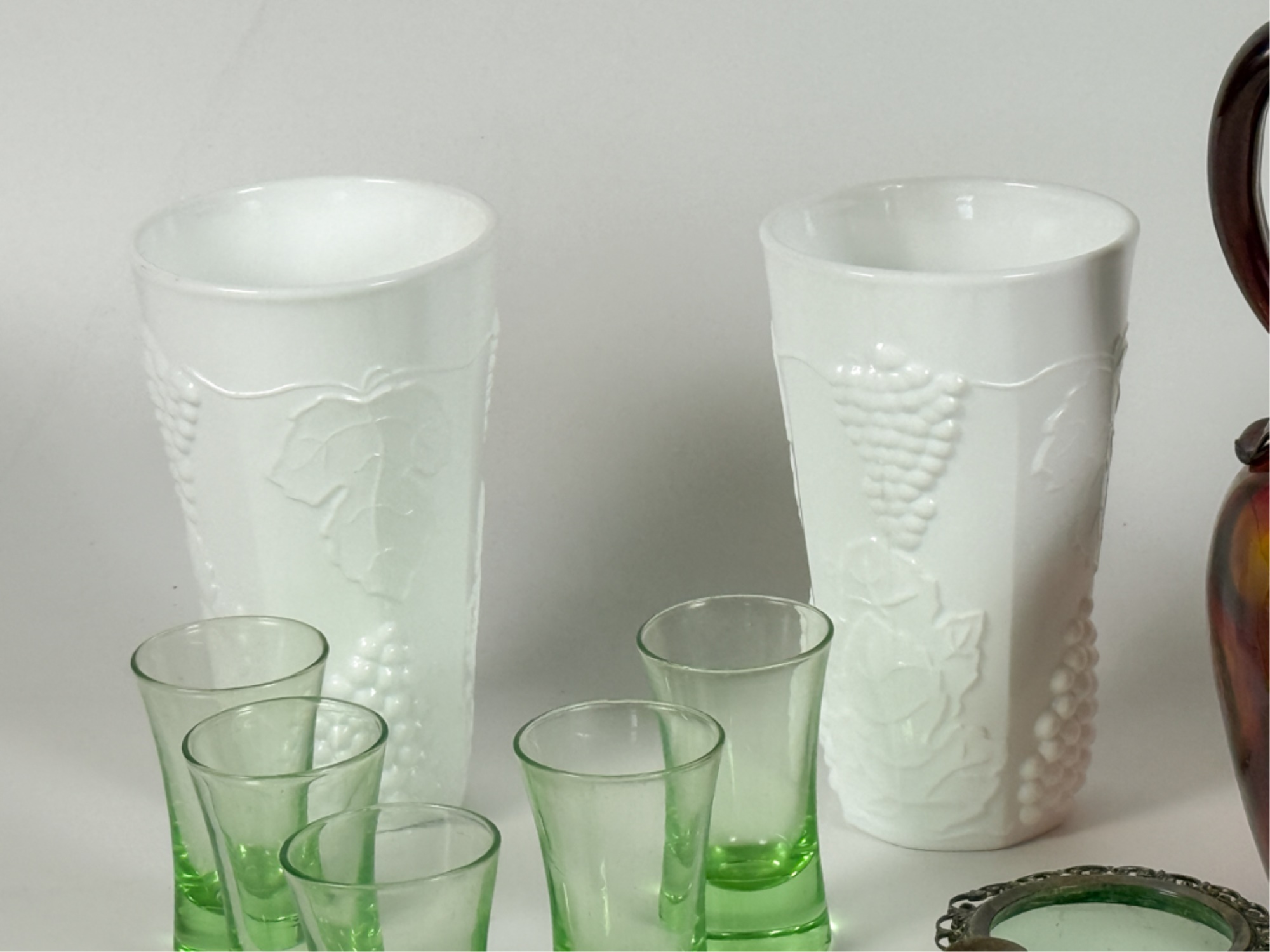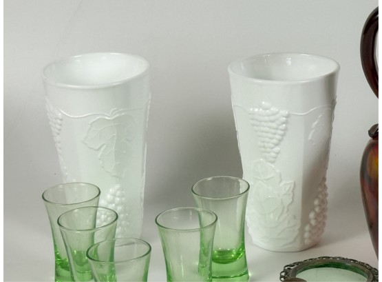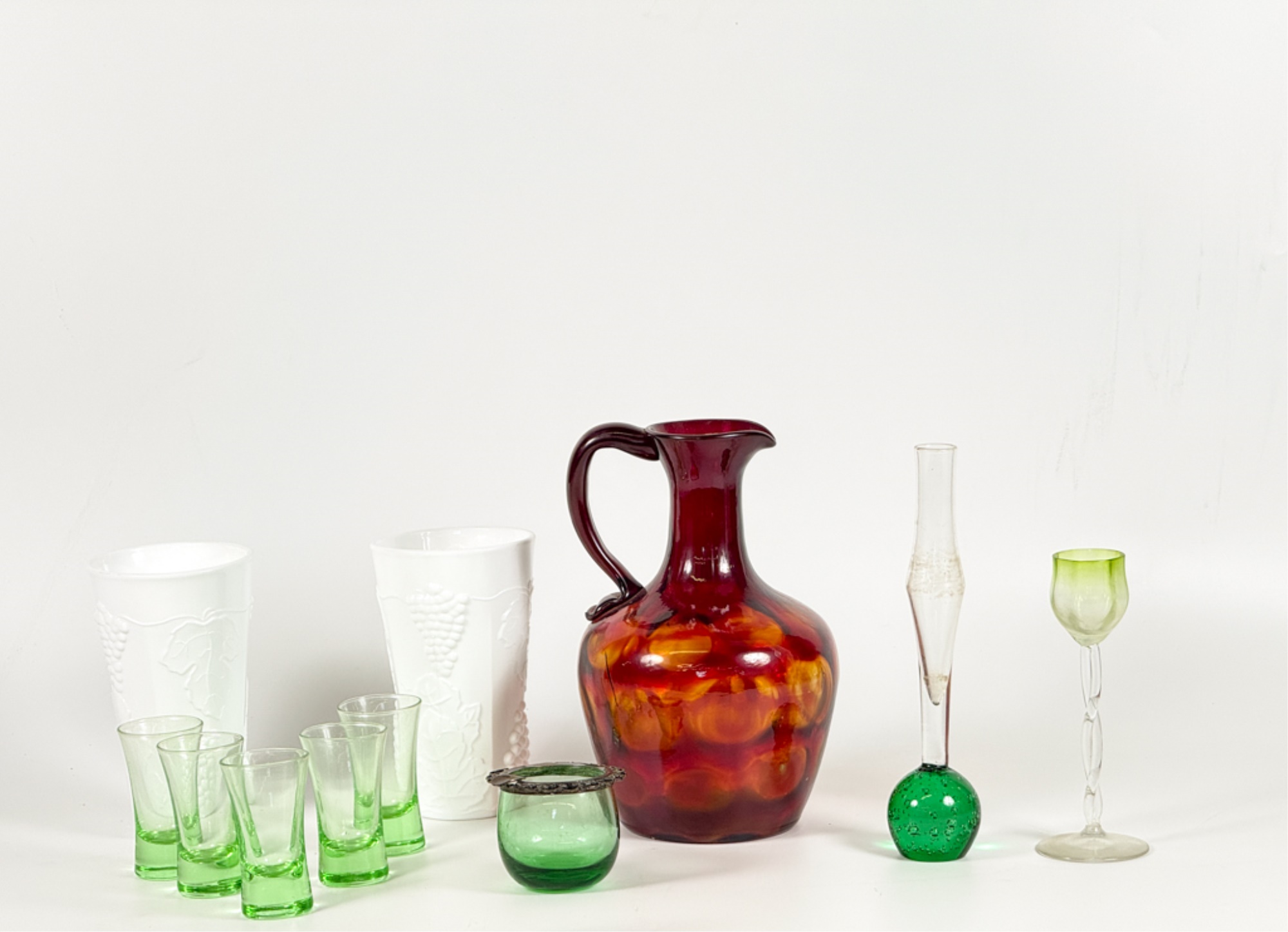 Victorian glass pitcher, shot glasses, vase, ashtray and cordial. Tallest measures 8 1/4 inches.