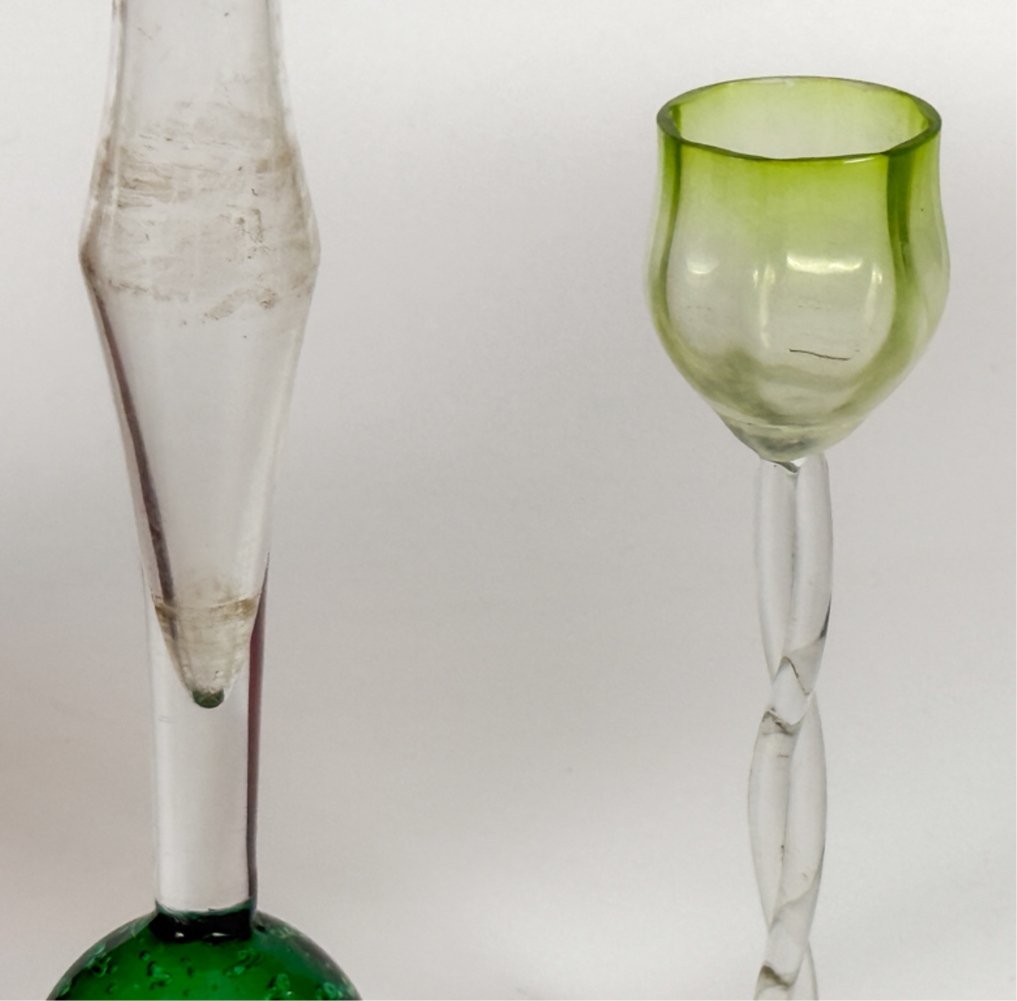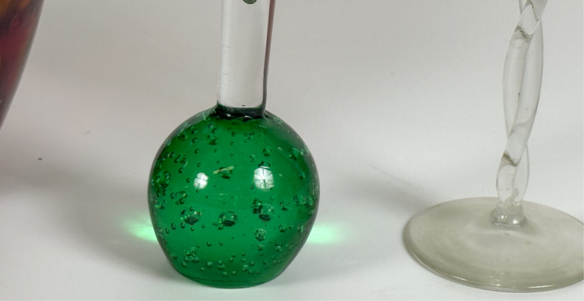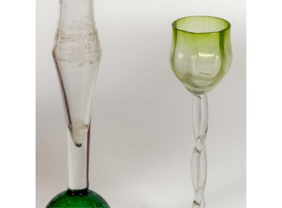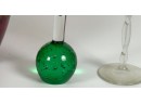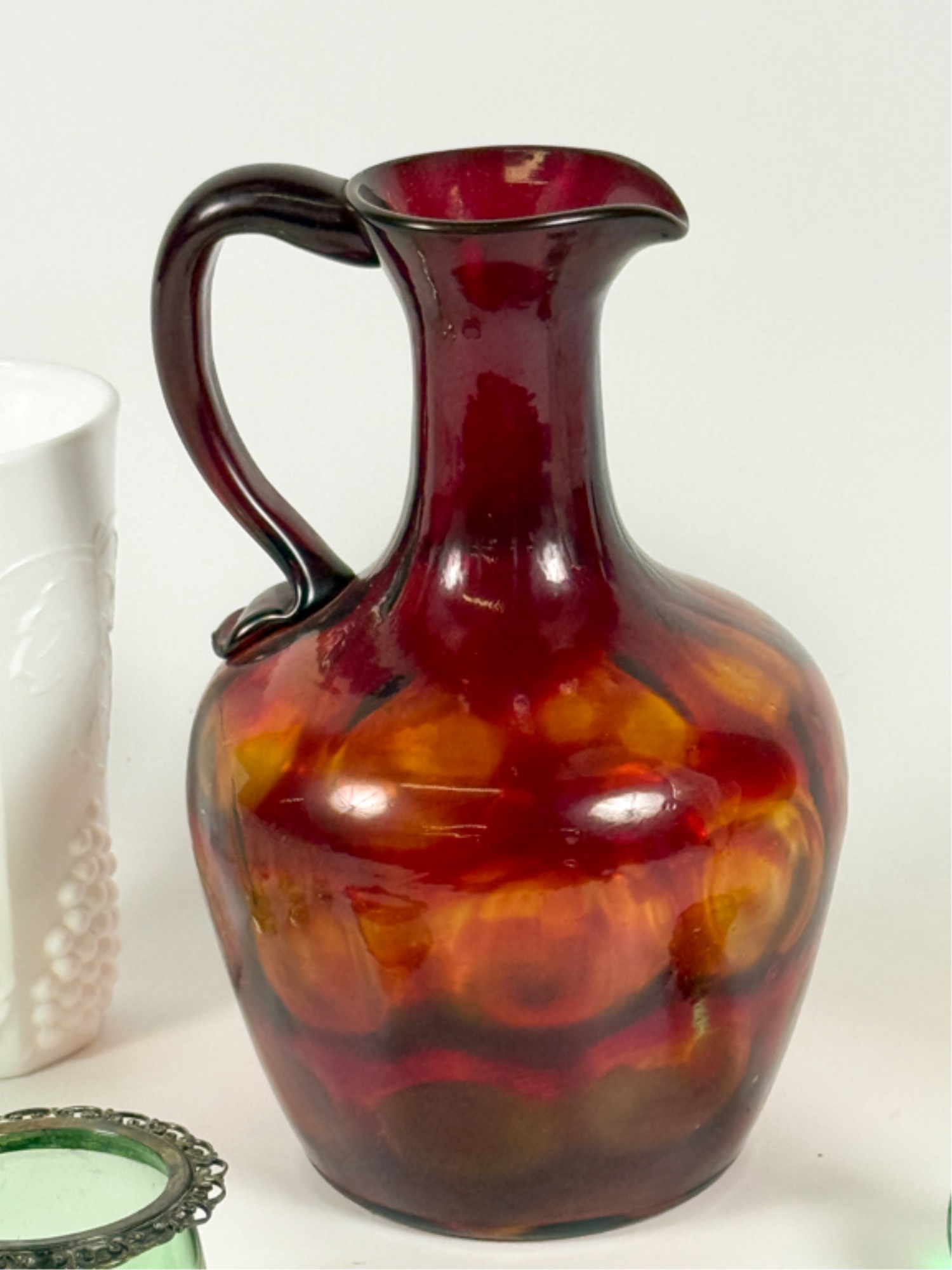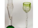 Victorian glass pitcher, shot glasses, vase, ashtray and cordial. Tallest measures 8 1/4 inches.
