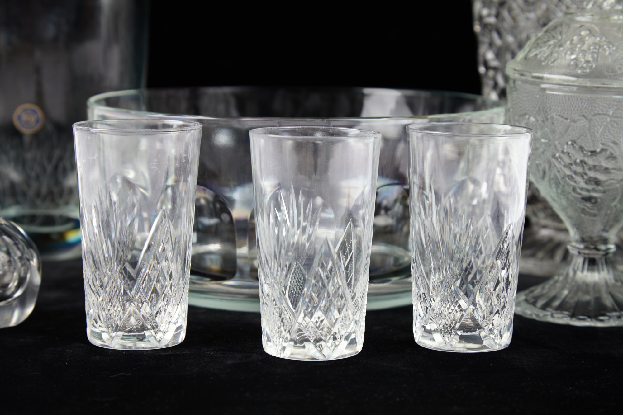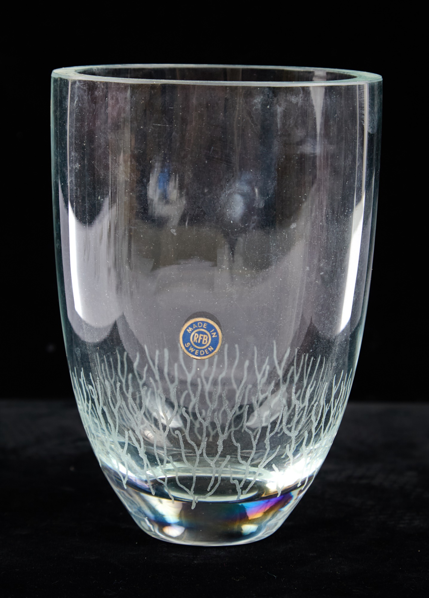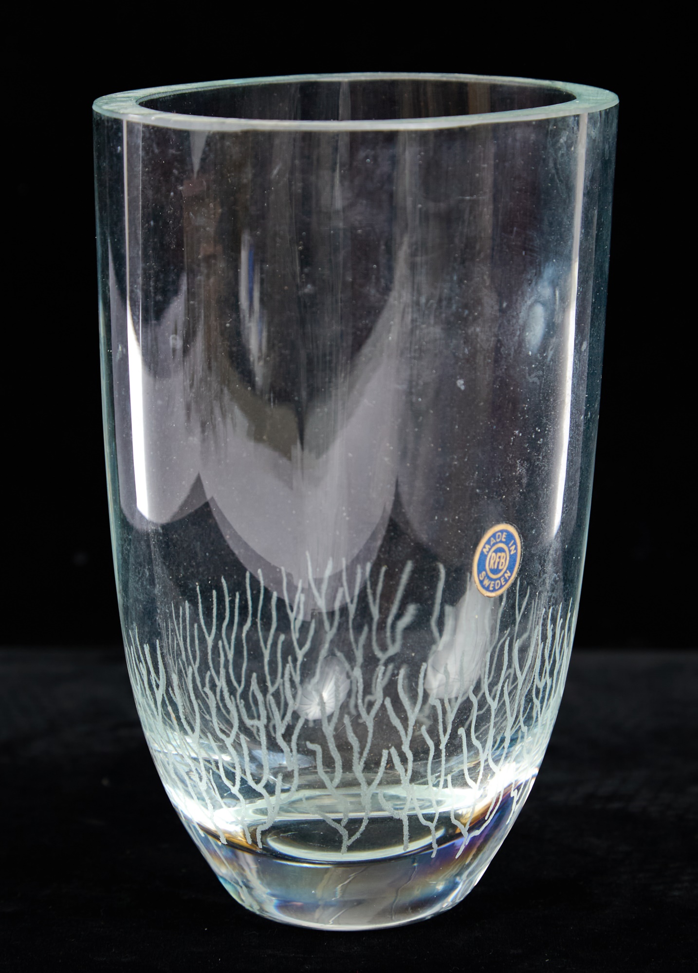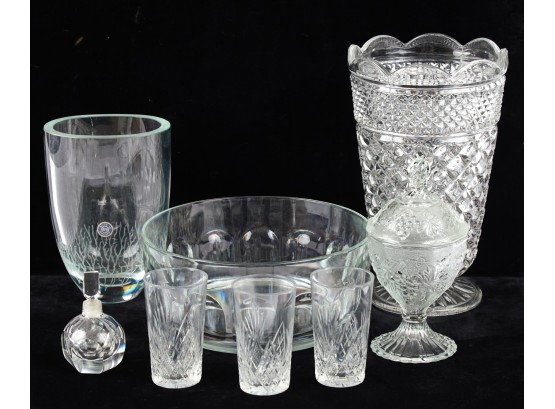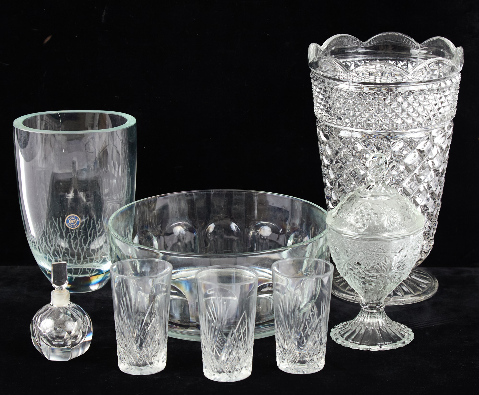 RFB Swedish crystal vase with engraved coral design, signed Orrefors crystal perfume, Arcoroc bowl, pressed glass covered candy dish with raised grapevine pattern, (3) cut crystal cups, & (1) large molded glass vase. Vase measures 10 inches.