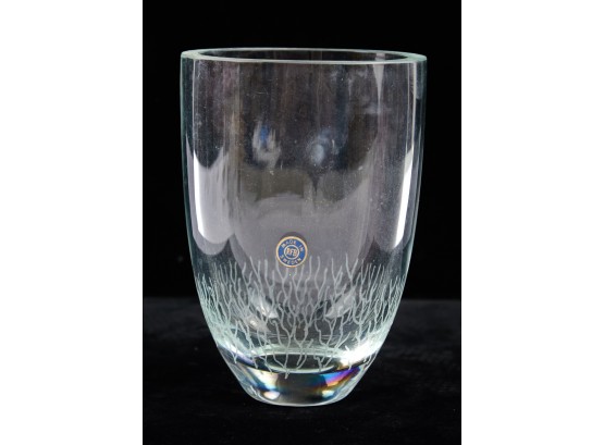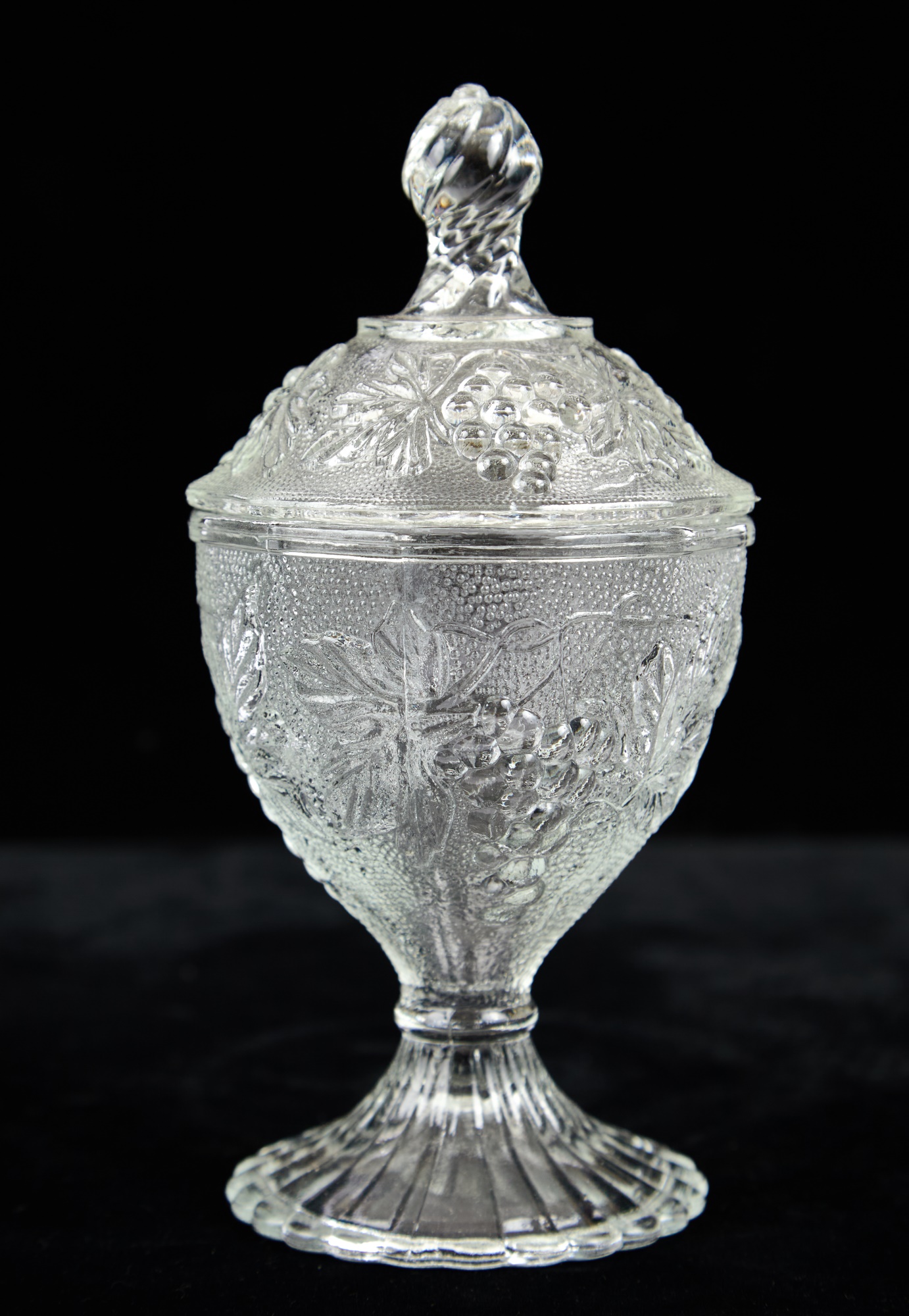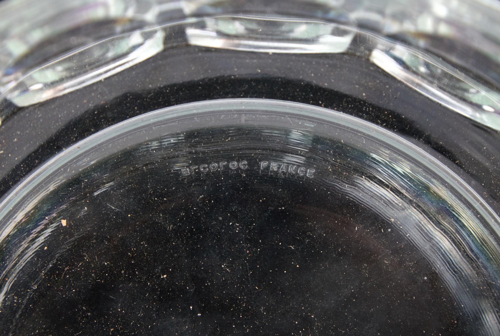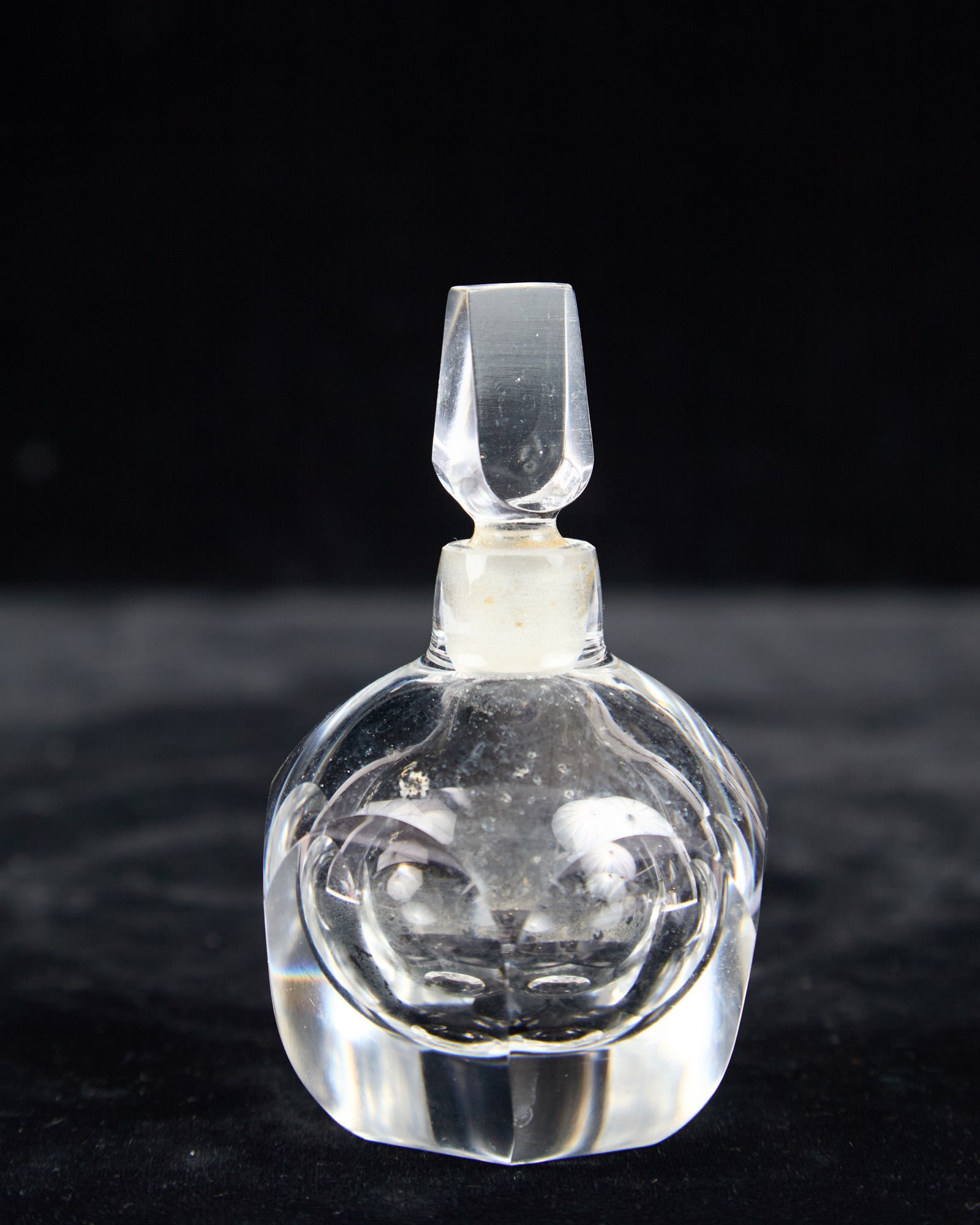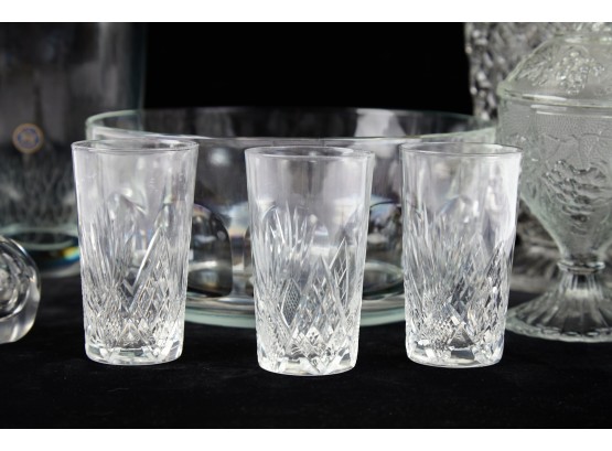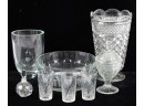 RFB Swedish crystal vase with engraved coral design, signed Orrefors crystal perfume, Arcoroc bowl, pressed glass covered candy dish with raised grapevine pattern, (3) cut crystal cups, & (1) large molded glass vase. Vase measures 10 inches.