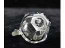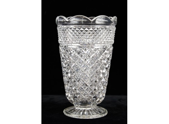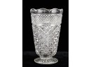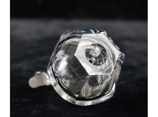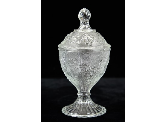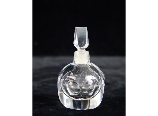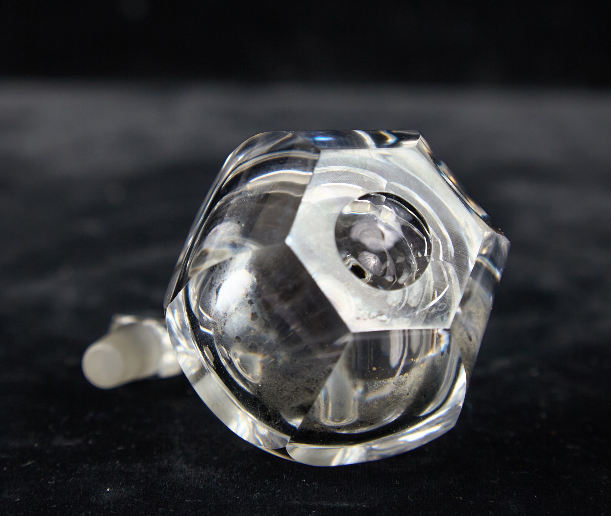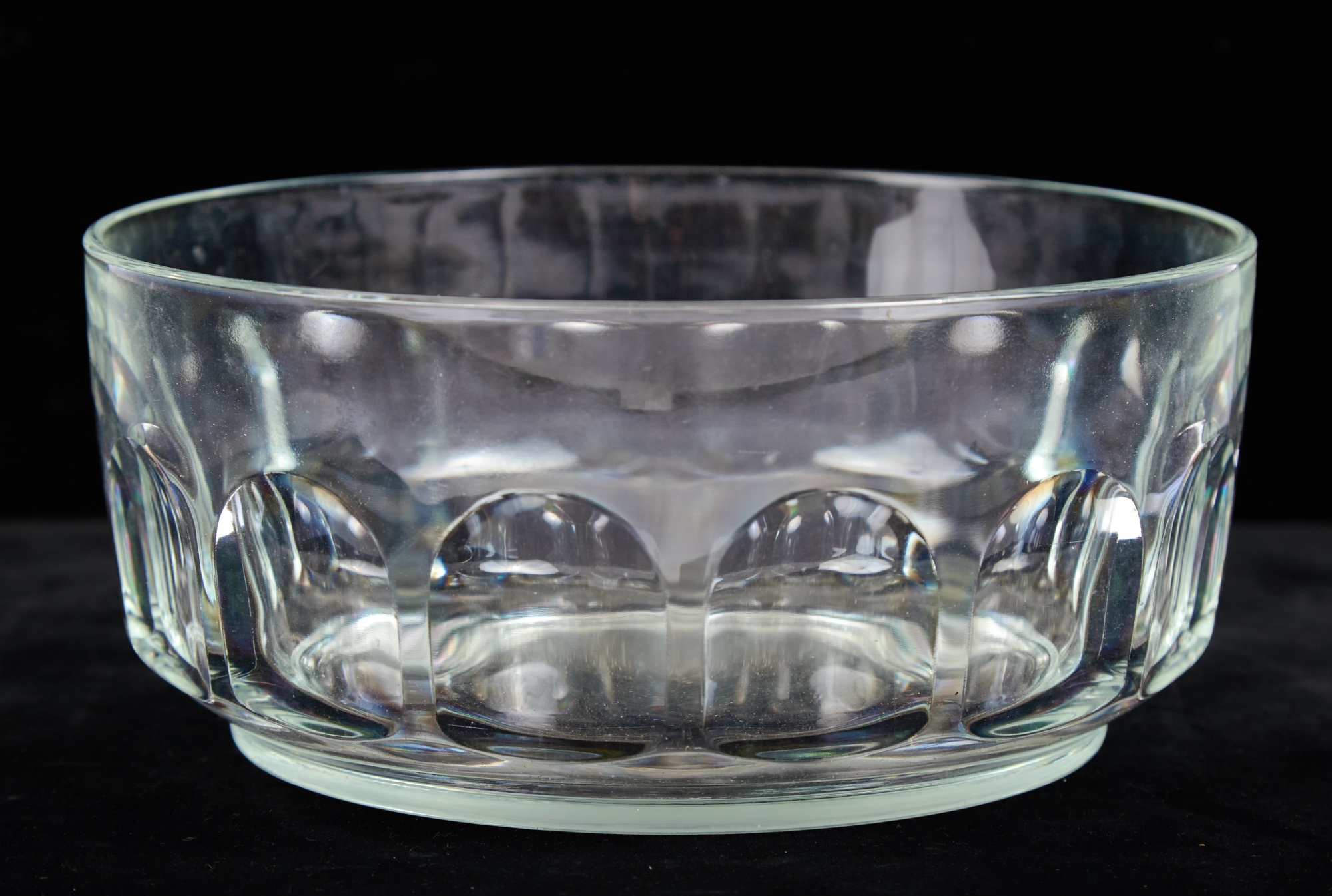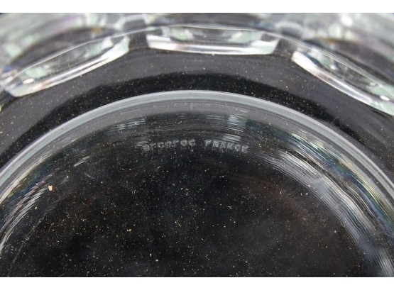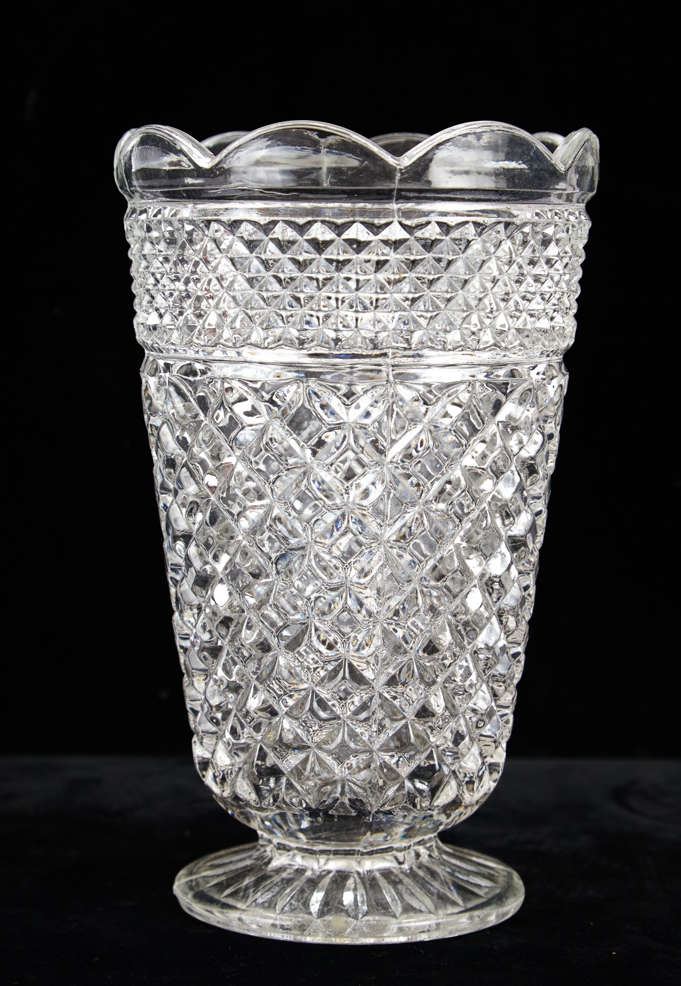 RFB Swedish crystal vase with engraved coral design, signed Orrefors crystal perfume, Arcoroc bowl, pressed glass covered candy dish with raised grapevine pattern, (3) cut crystal cups, & (1) large molded glass vase. Vase measures 10 inches.