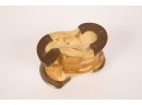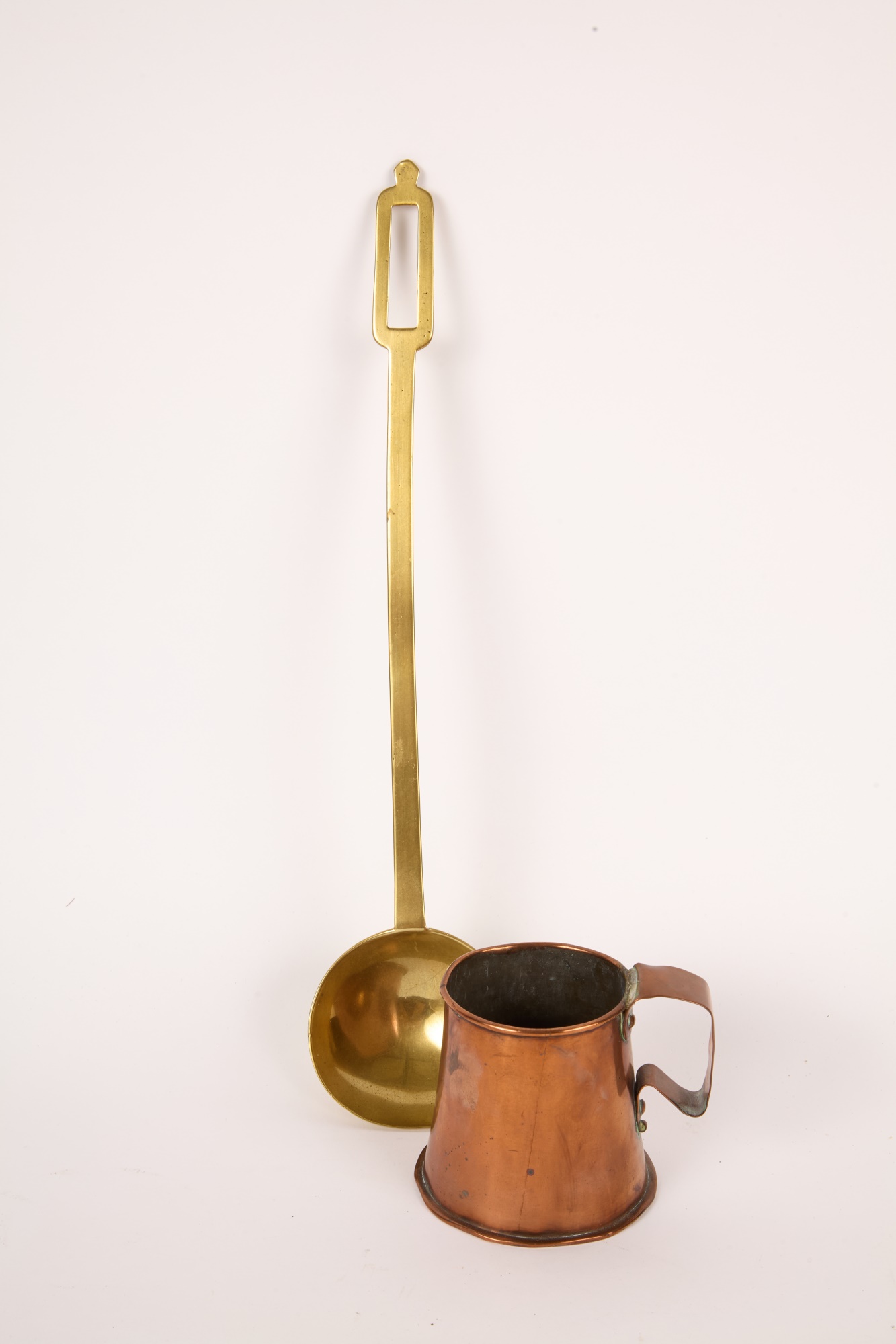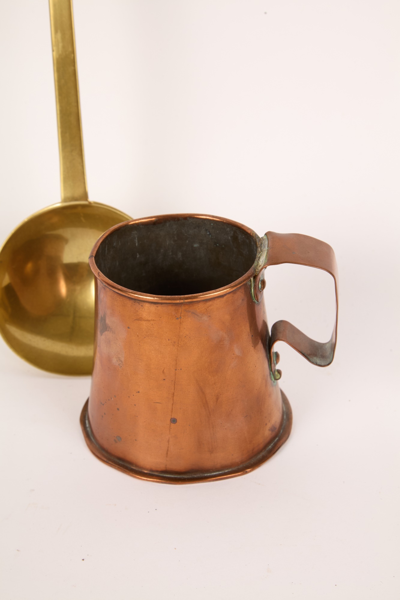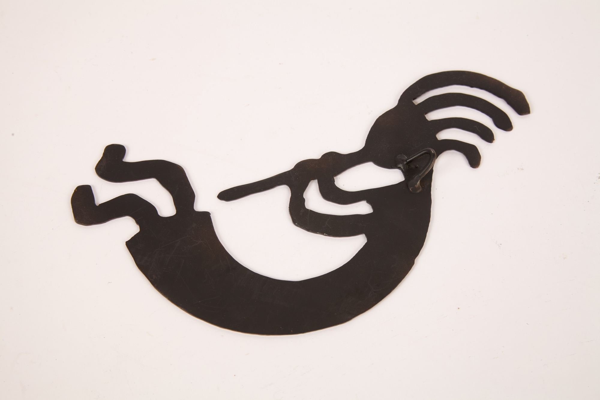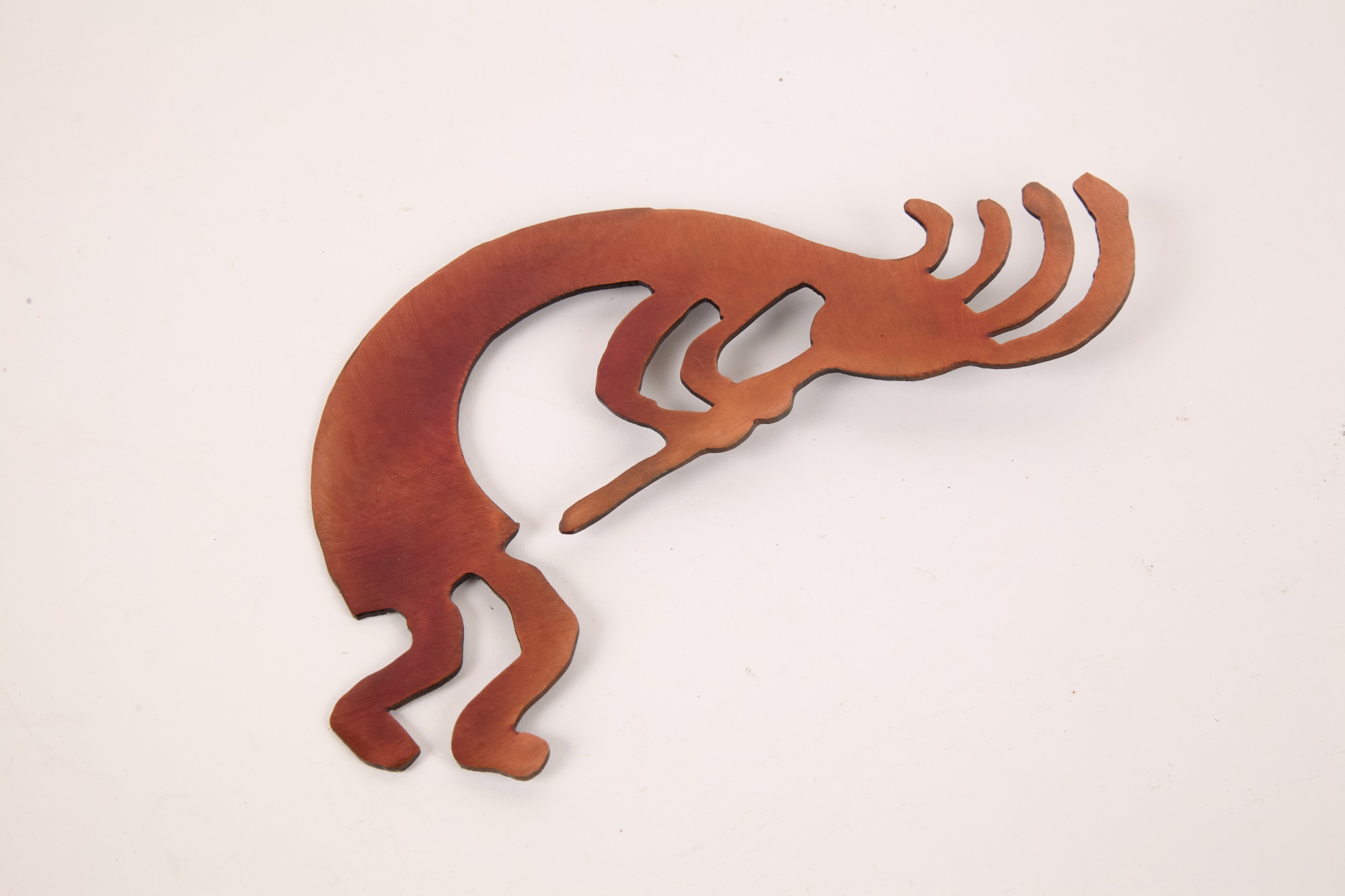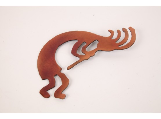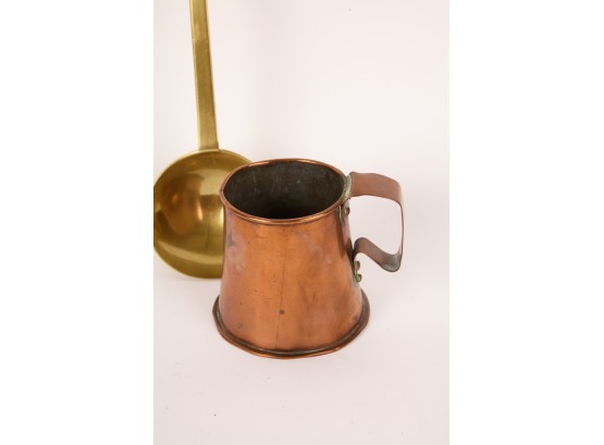 Including: Crescent Pewter Tea set and Miniature Delfonia mug, brass ladle, copper mug, copper Kokopelli wall hanging and a Taba bone game piece from Argentina. 17 inches (and smaller)