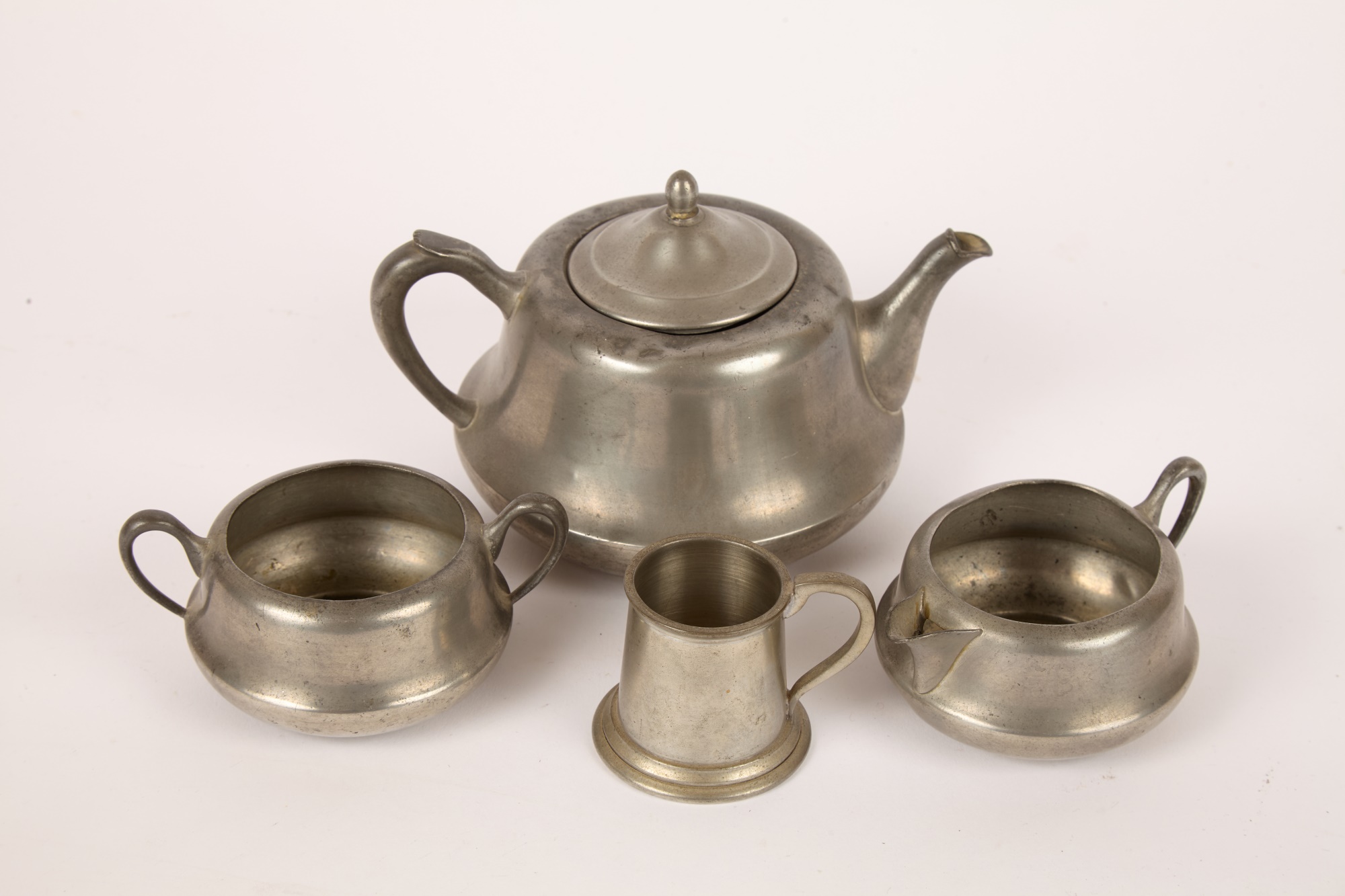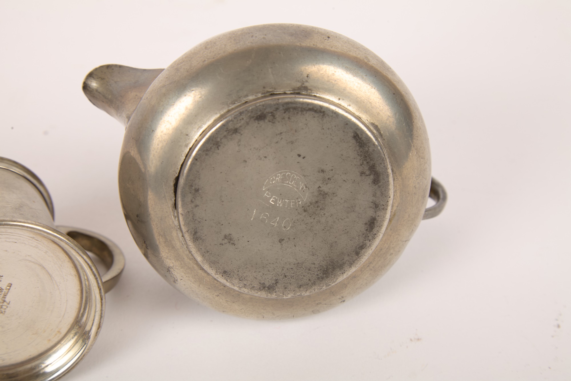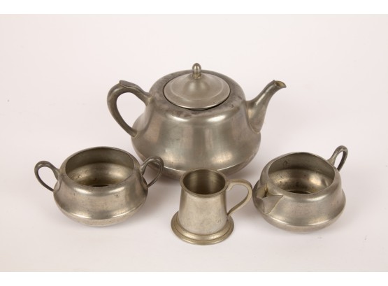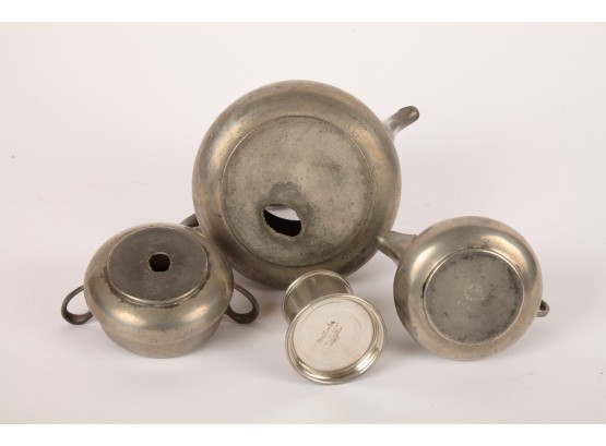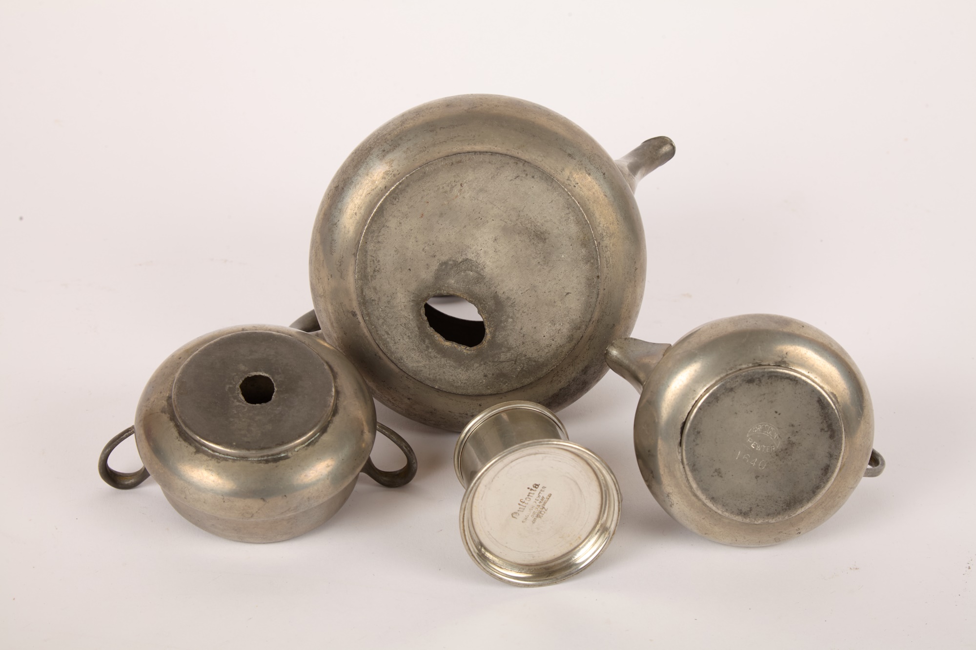 Notes: Holes on bottom of pewter teapot and sugar bowl
