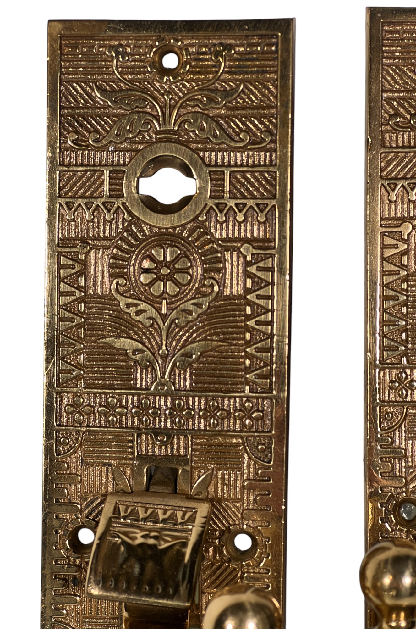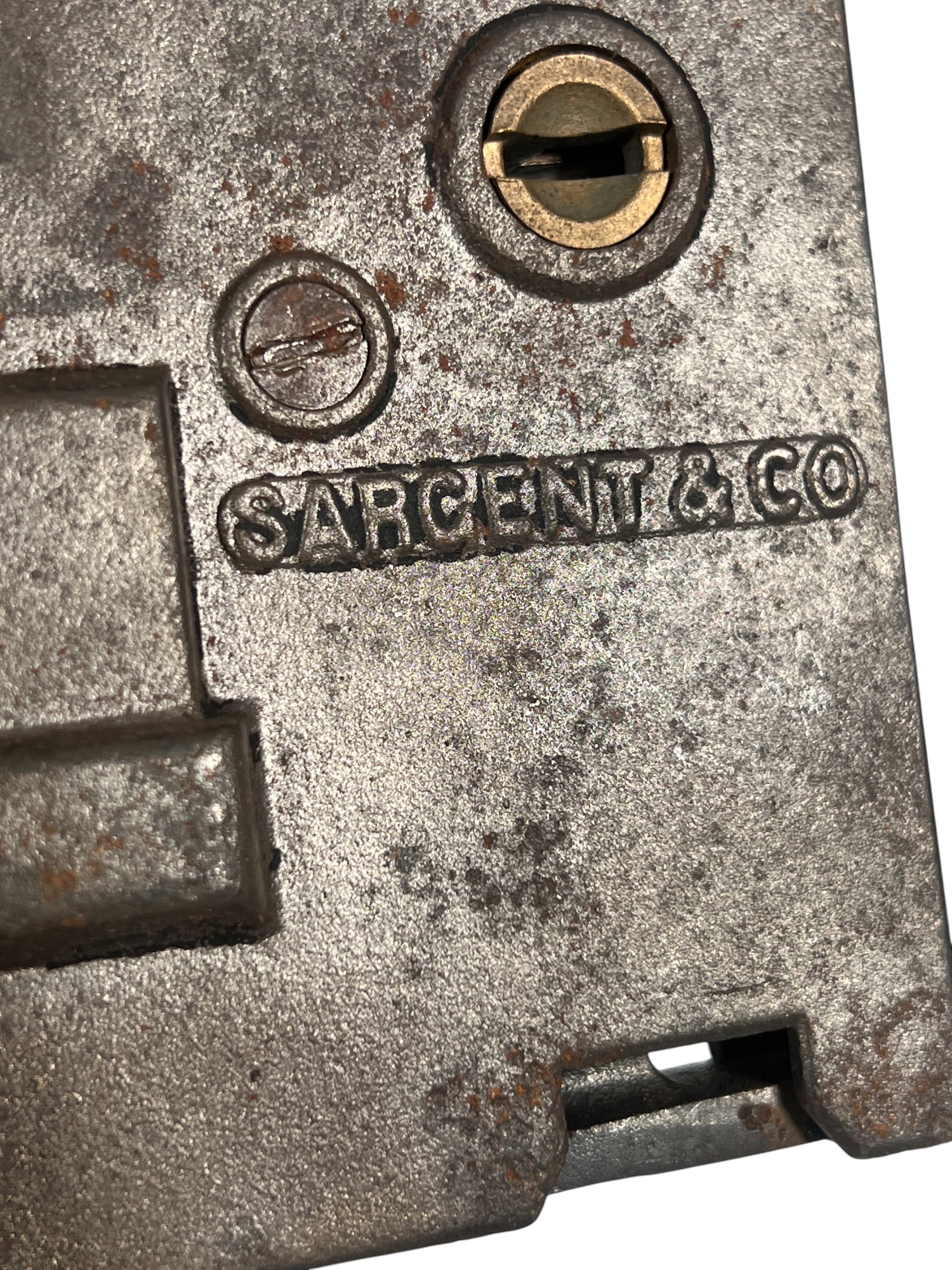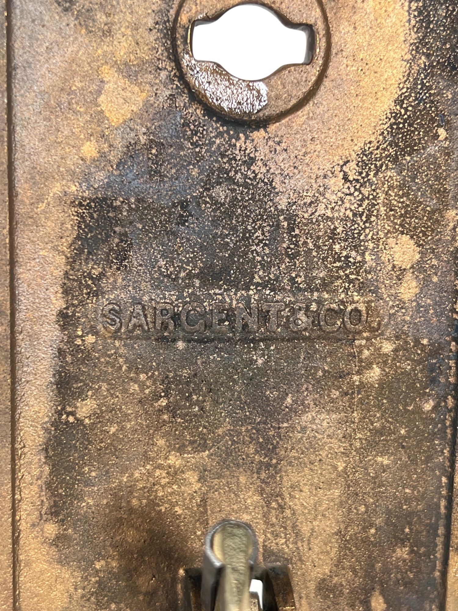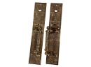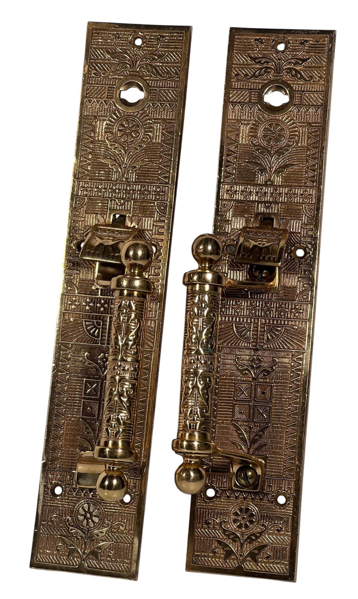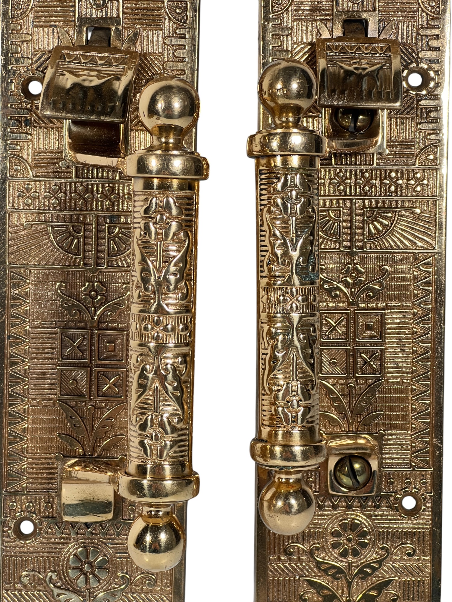 Pair of finely cast Sargent & Co. Aesthetic Movement brass door pulls and a Sargent & Co. cast brass & iron mortise lock. 12 1/2 x 2 1/2 x 2 1/2 inches. Condition: Good. Temp No 8636
