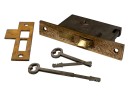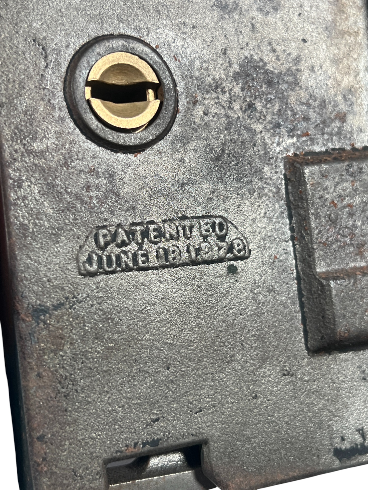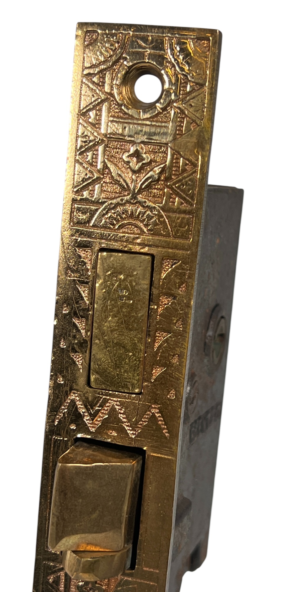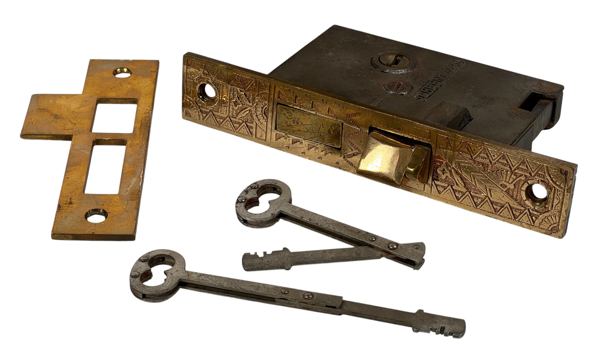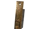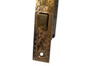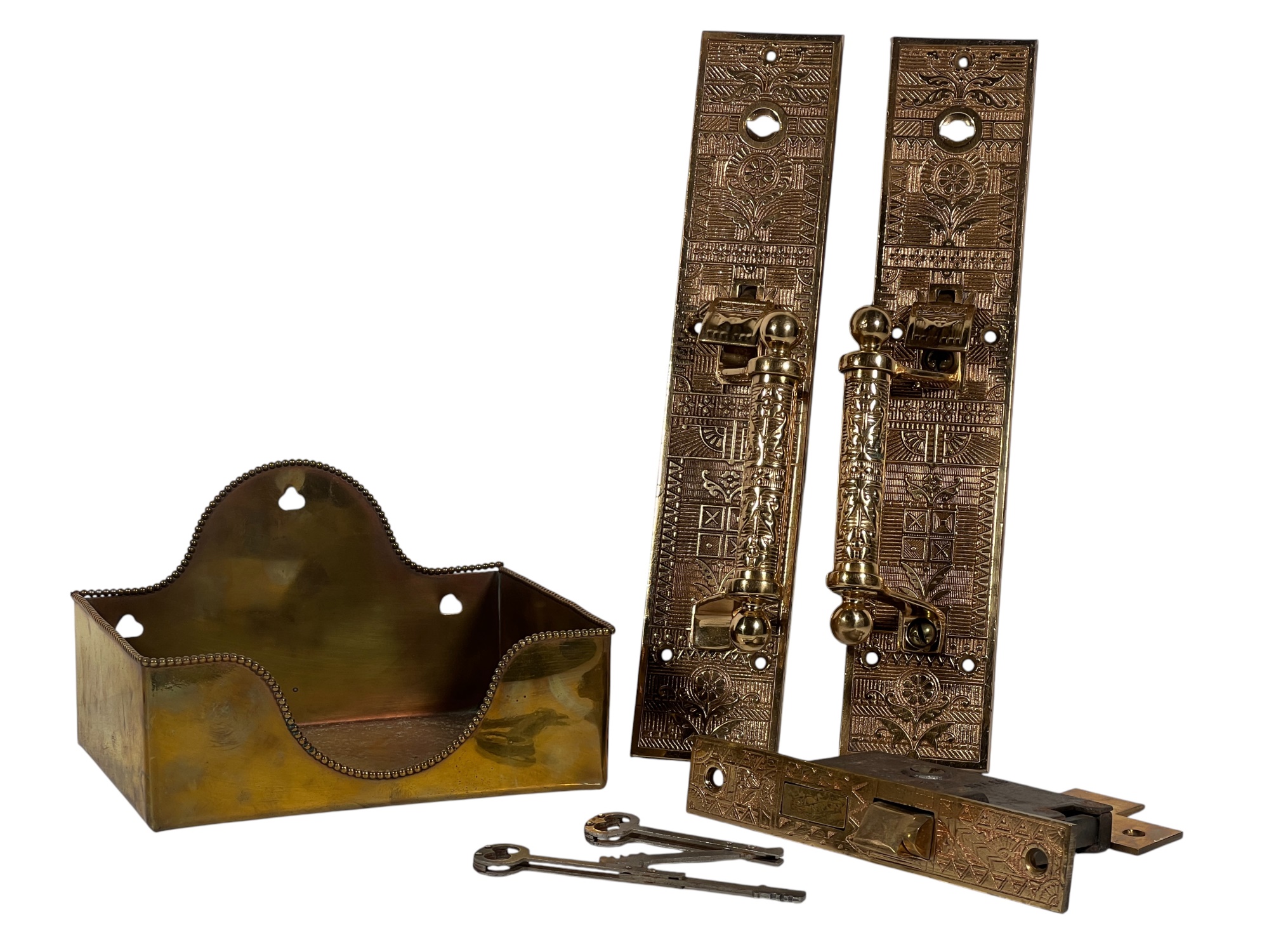 Pair of finely cast Sargent & Co. Aesthetic Movement brass door pulls and a Sargent & Co. cast brass & iron mortise lock. 12 1/2 x 2 1/2 x 2 1/2 inches. Condition: Good. Temp No 8636