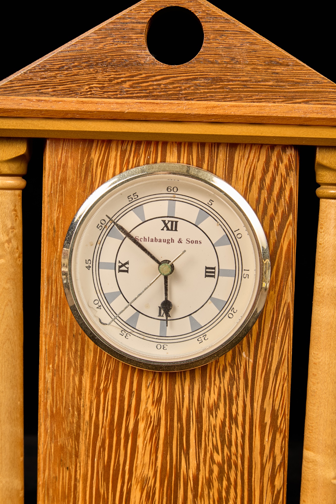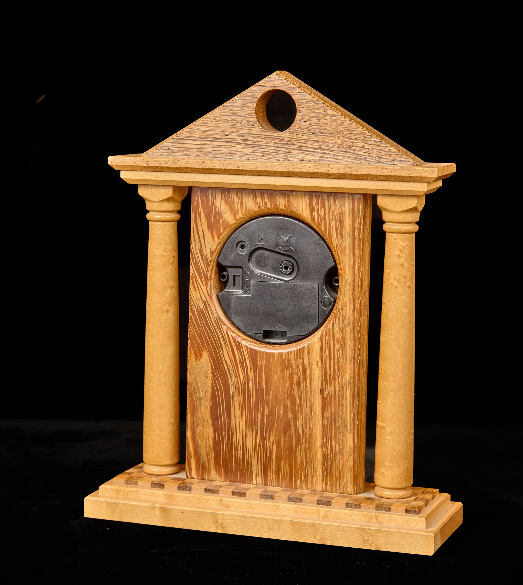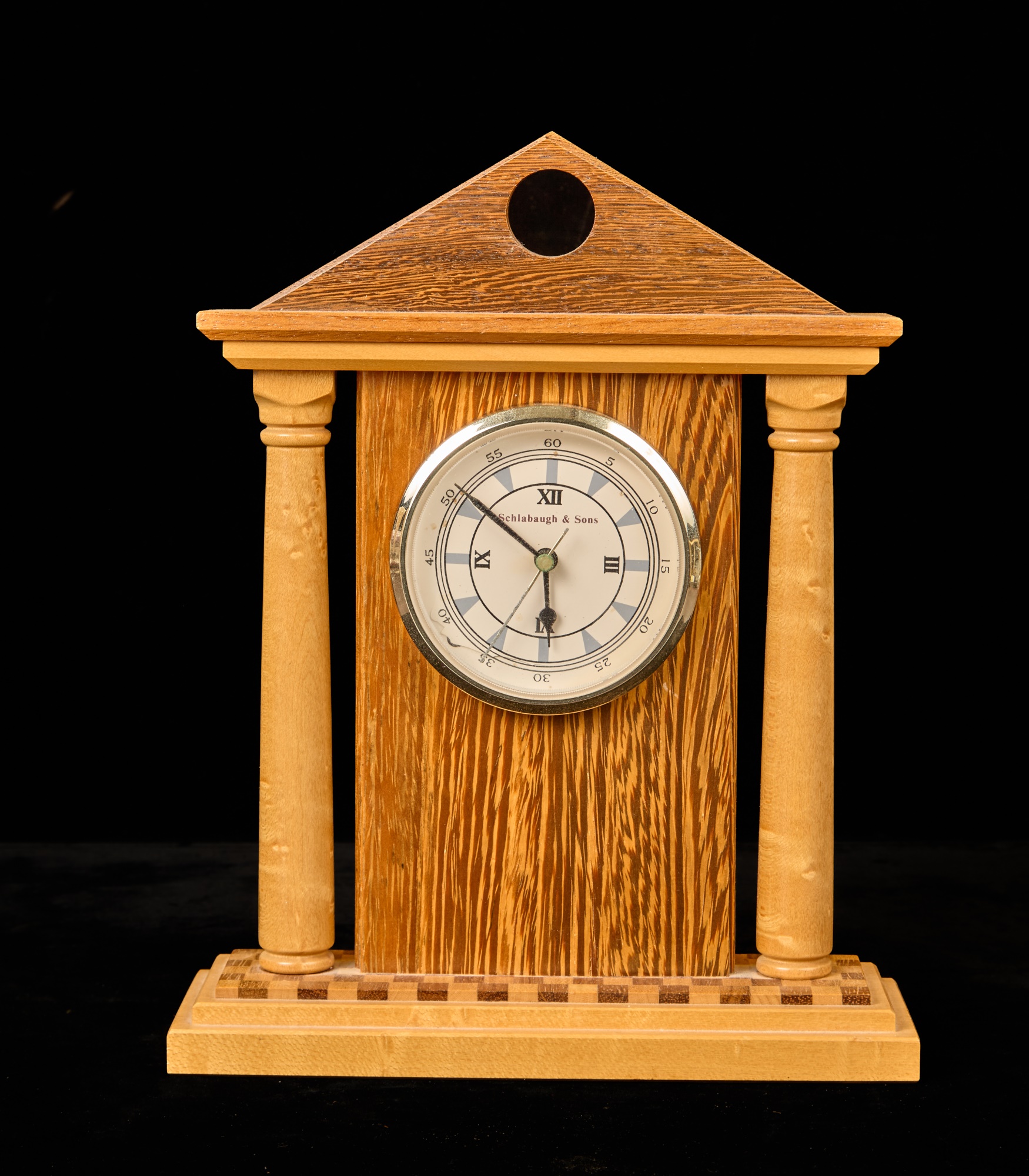 Crafted with exotic hardwoods. Quartz clock with 3.5 inch dial. 10.75 x 8 inches (overall) Condition: Good Temp No 6068