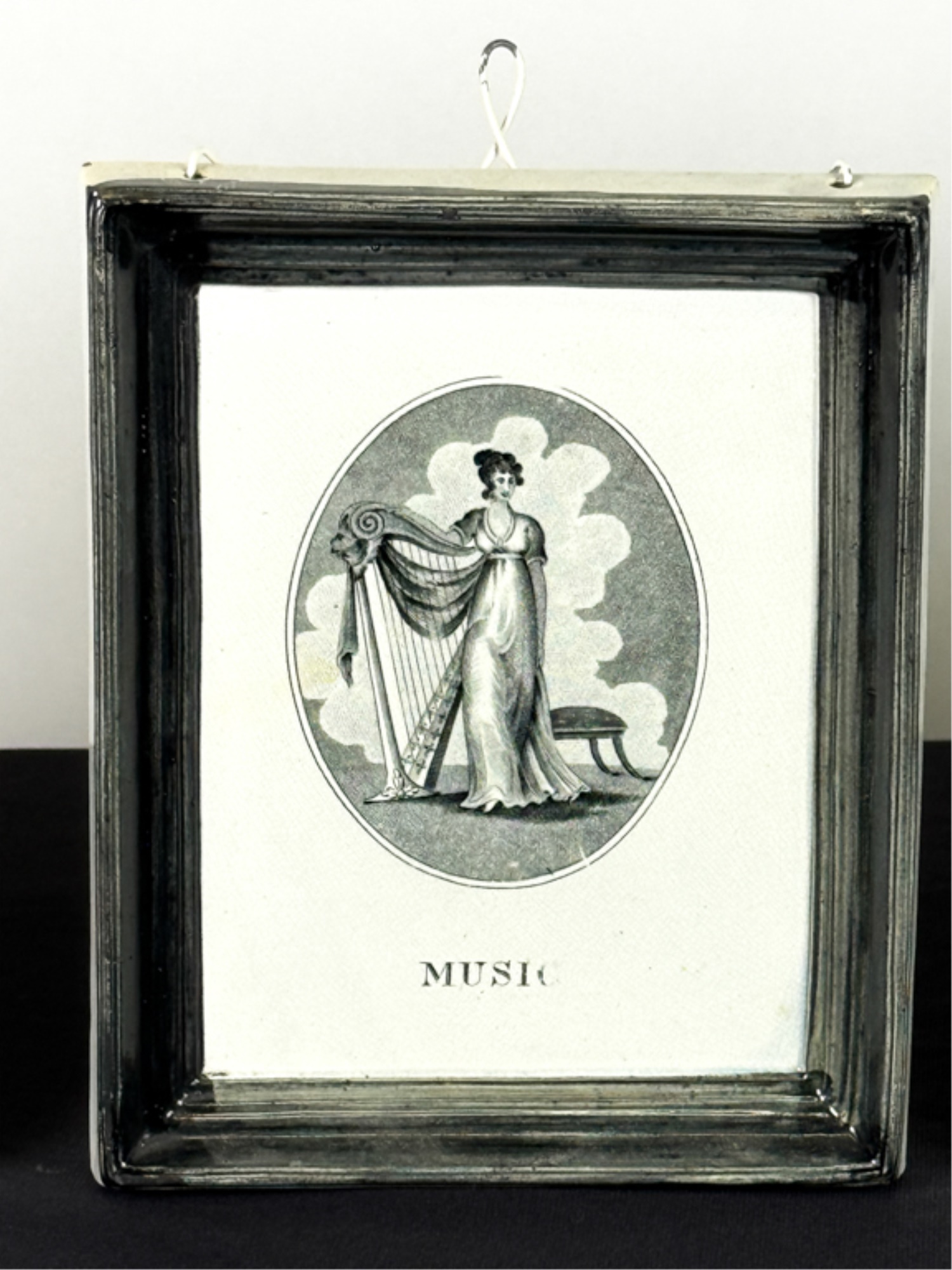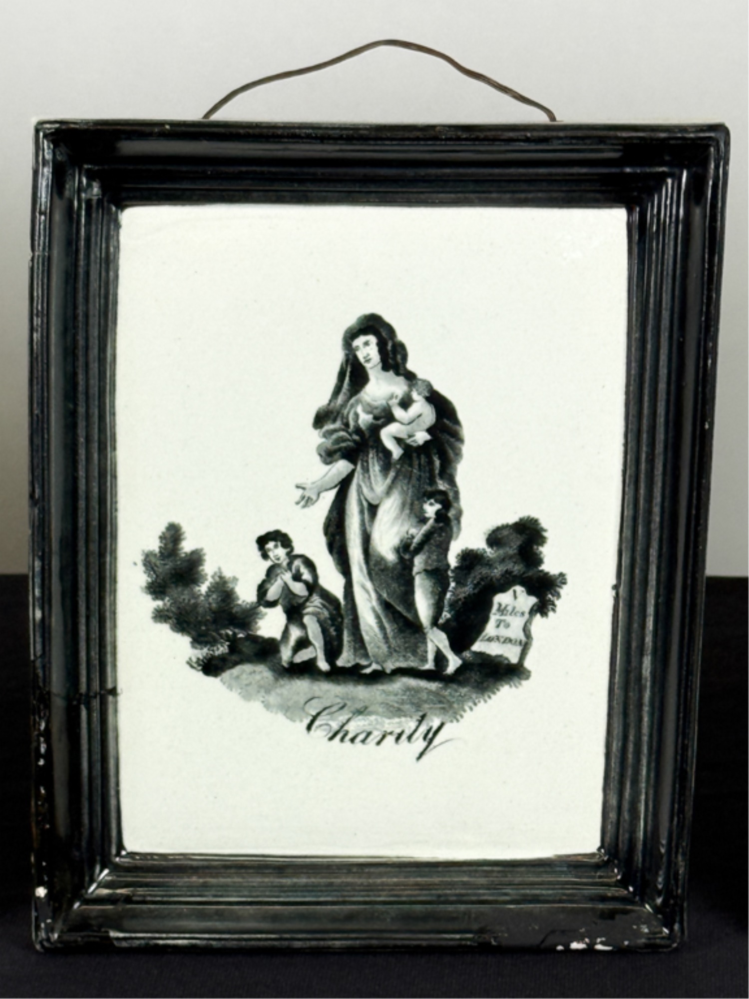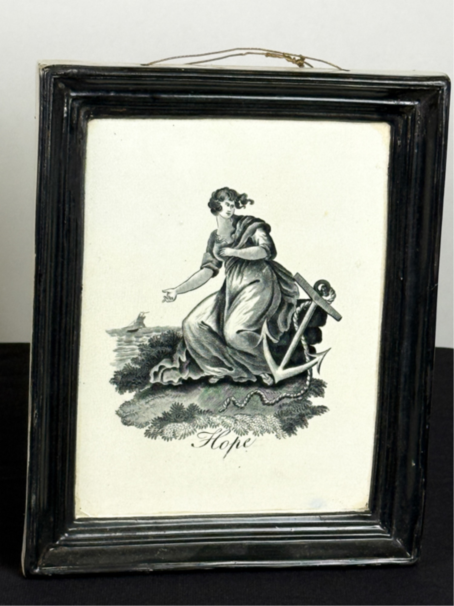 Pearlware plaques with transfer decoration. "Music", "Hope", "Charity" and "Come and trip it as you go On the light fantastic toe". 8 1/2 x 6 3/4 inches. Condition: Good. Minor flakes to glaze.