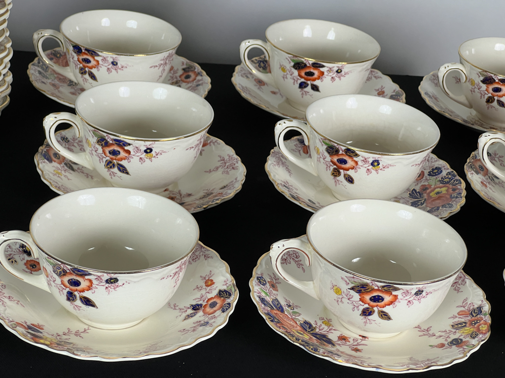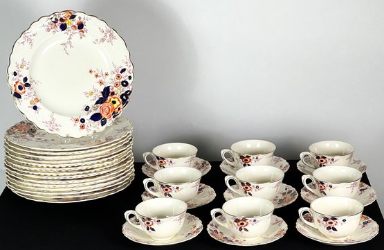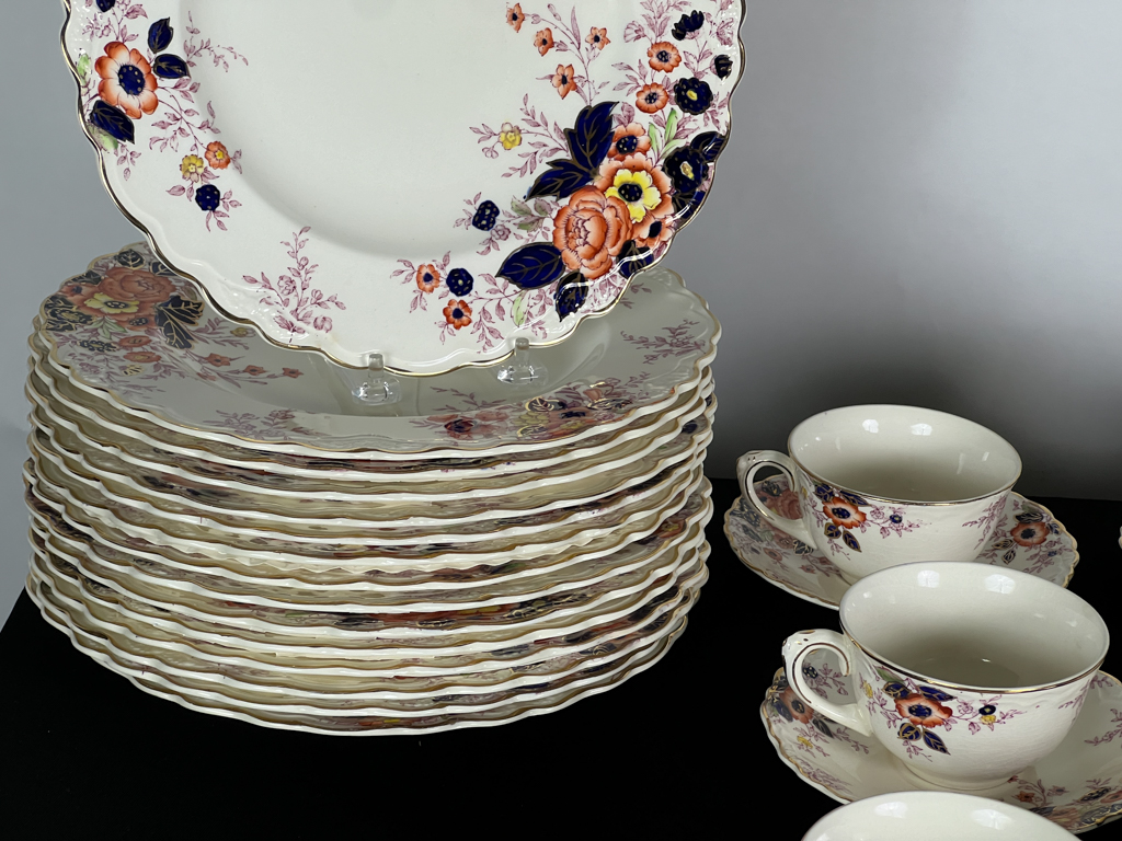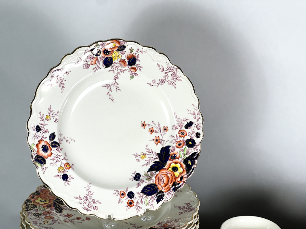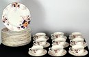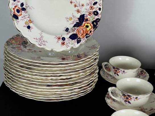 Dinner plates, cups, saucers, etc. Dinner plates measure 10 1/4 inches.