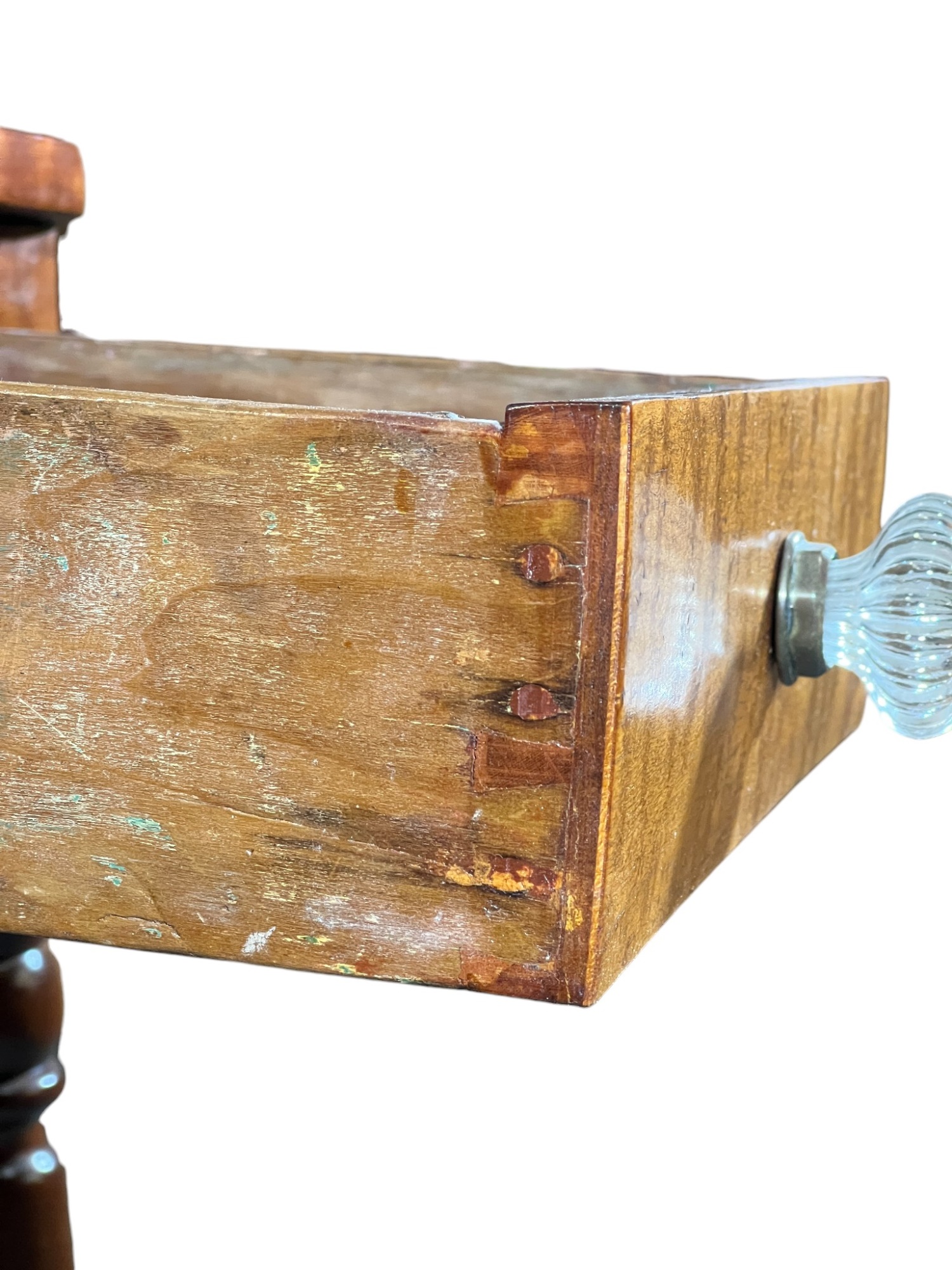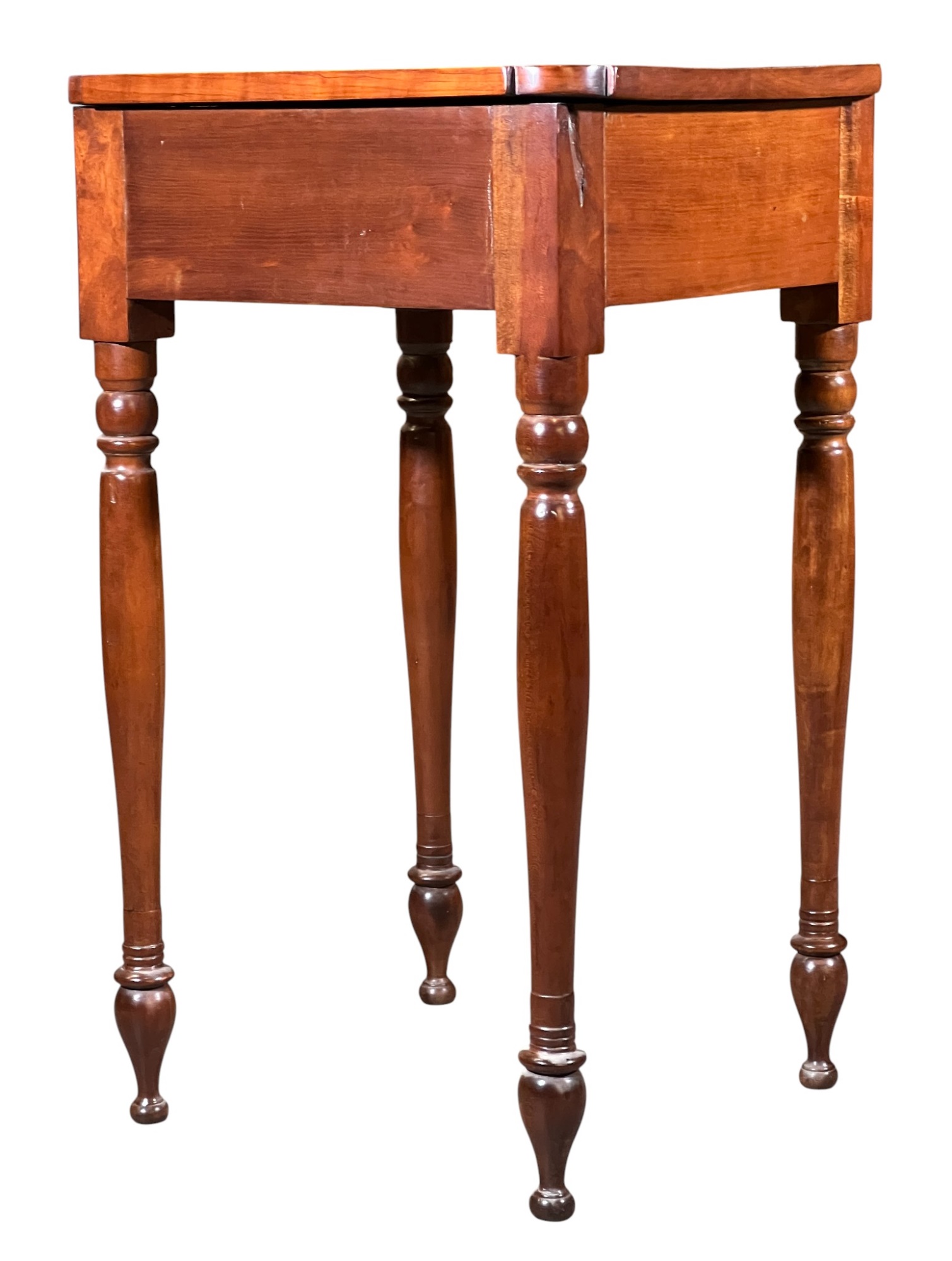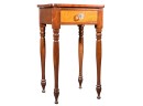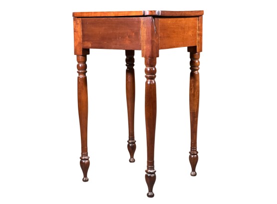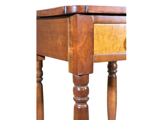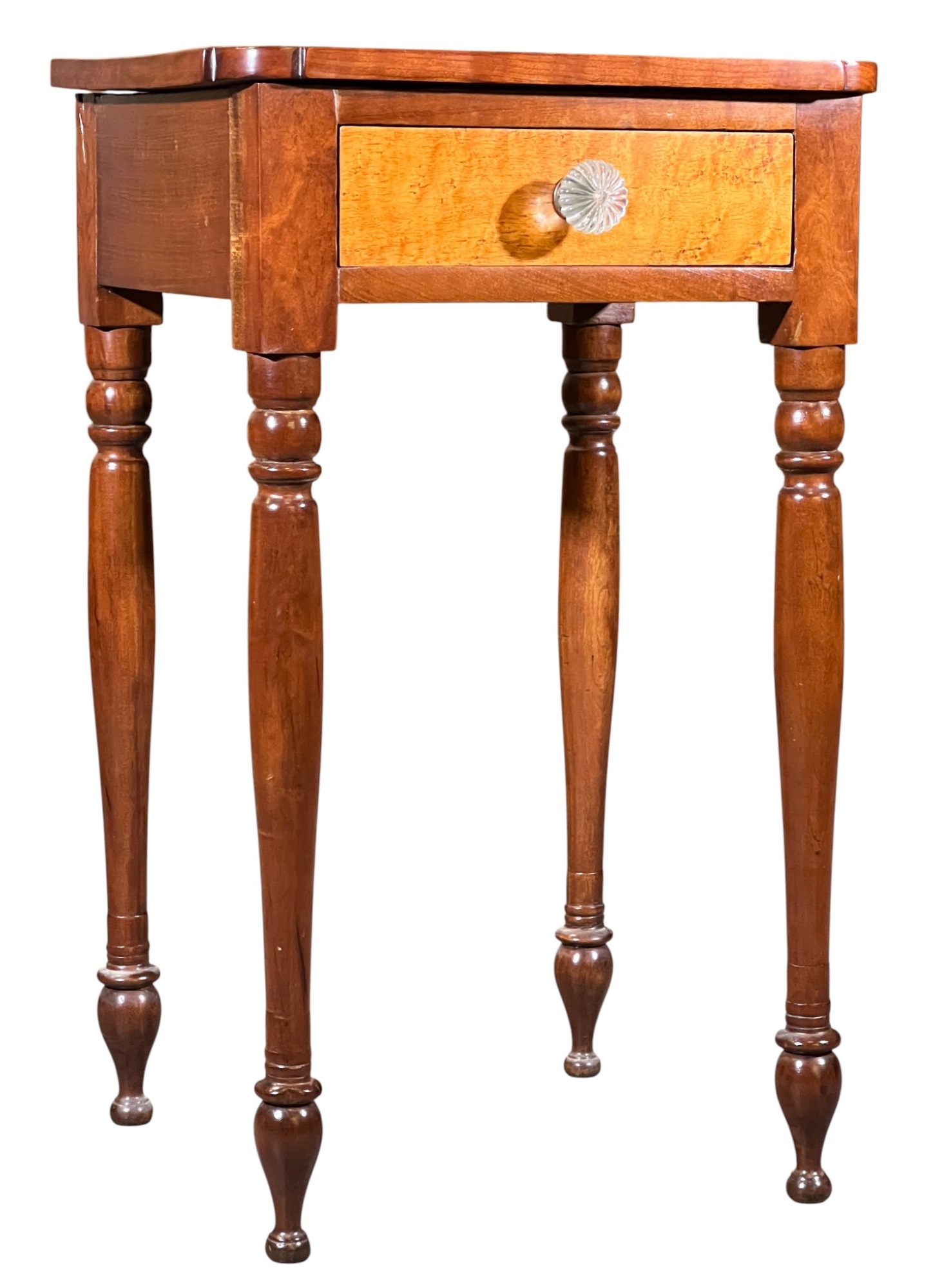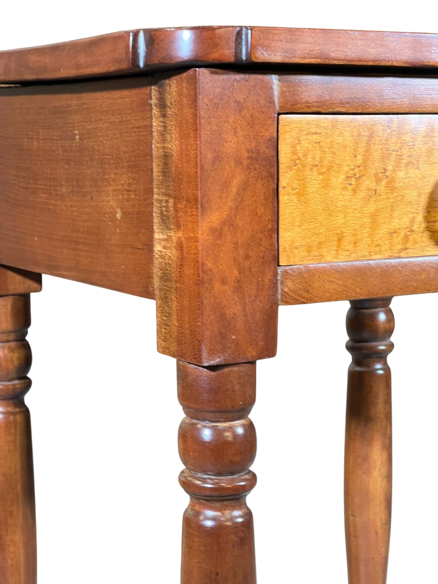 Shaped mahogany top, single Birdseye maple drawer, nicely turned legs, dovetail construction. 28 1/4 x 17 1/2 x 16 1/4 inches. Condition: Good.