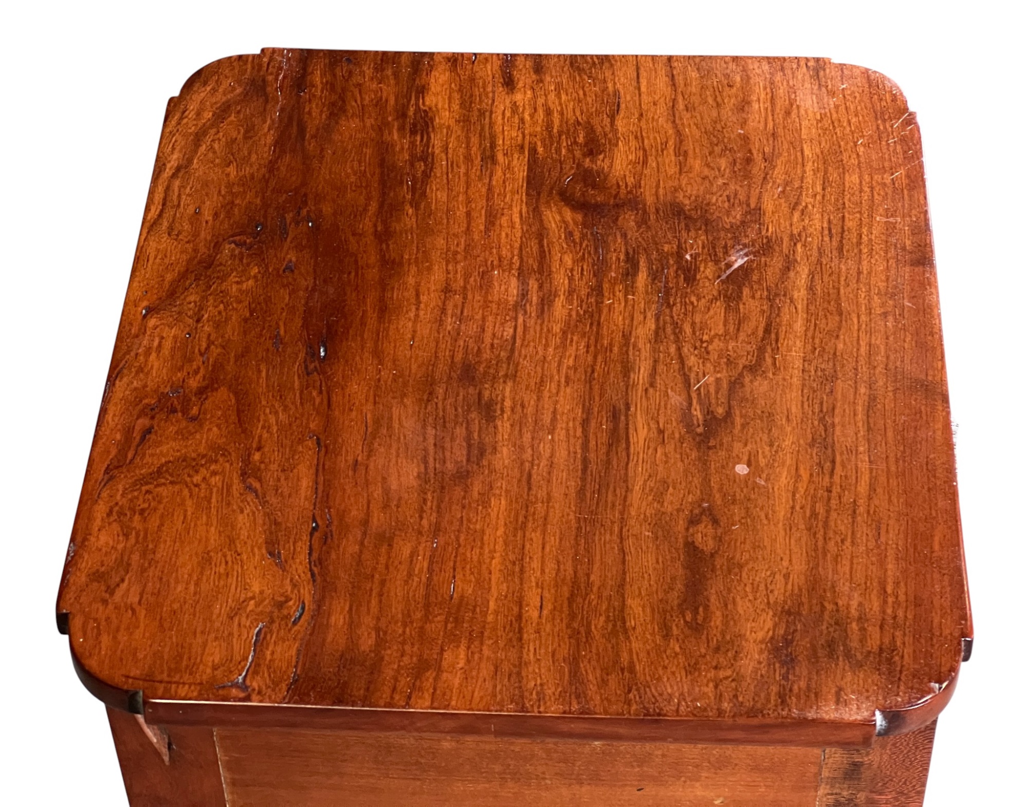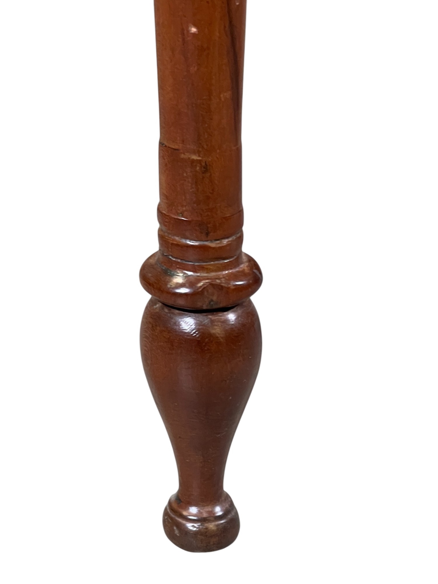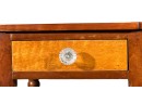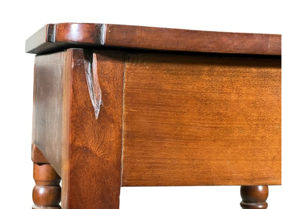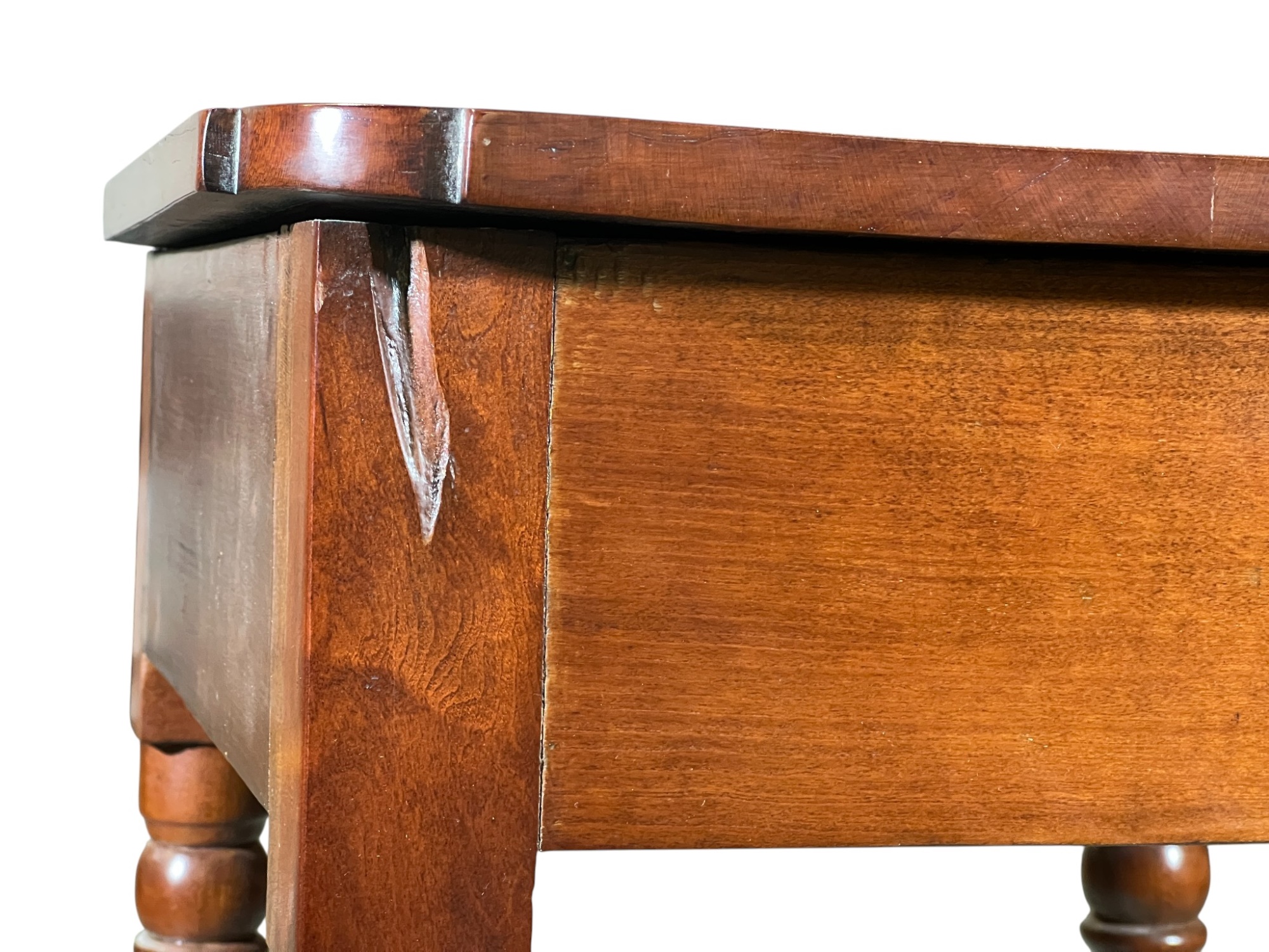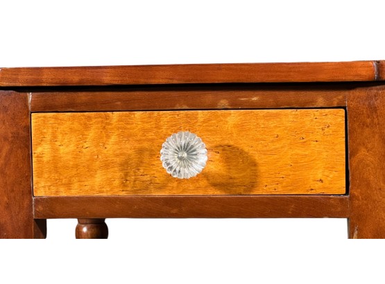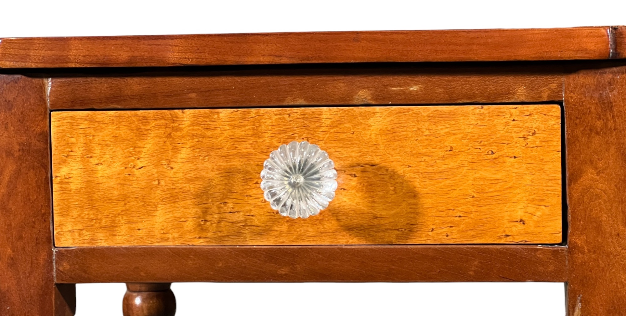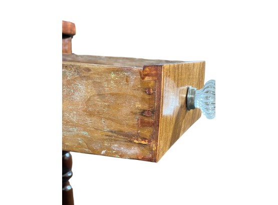 Shaped mahogany top, single Birdseye maple drawer, nicely turned legs, dovetail construction. 28 1/4 x 17 1/2 x 16 1/4 inches. Condition: Good.