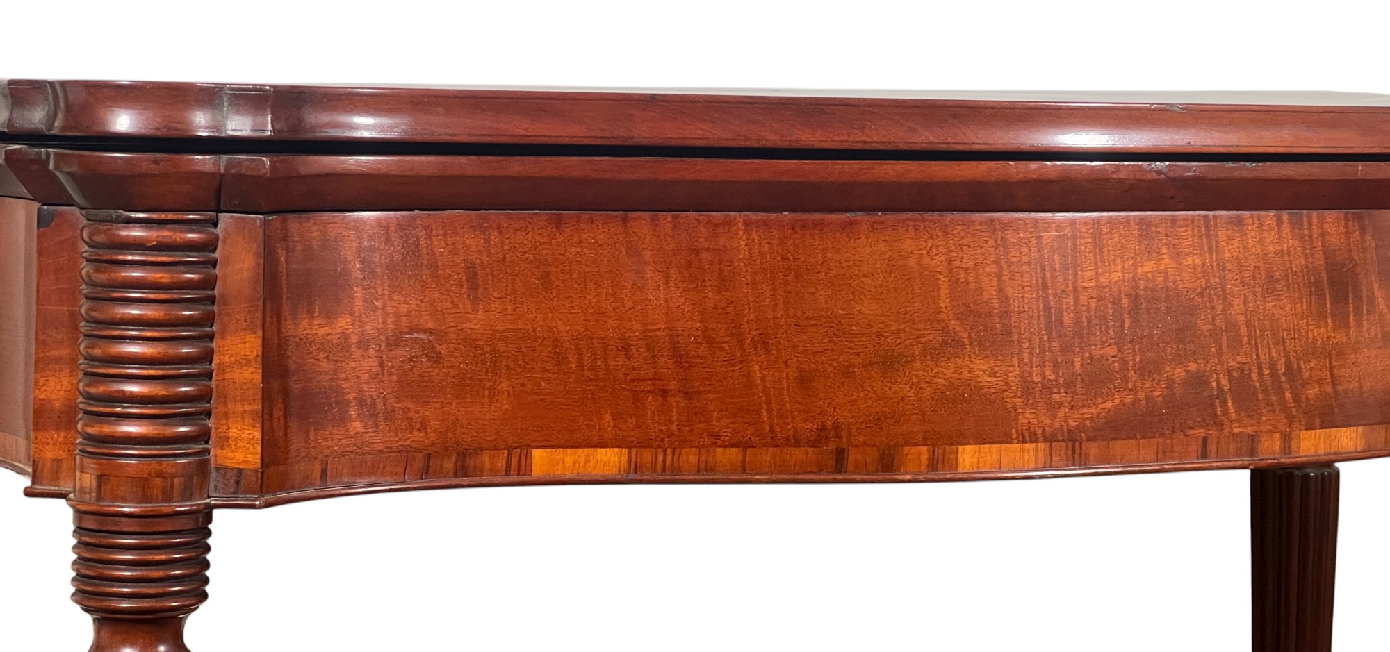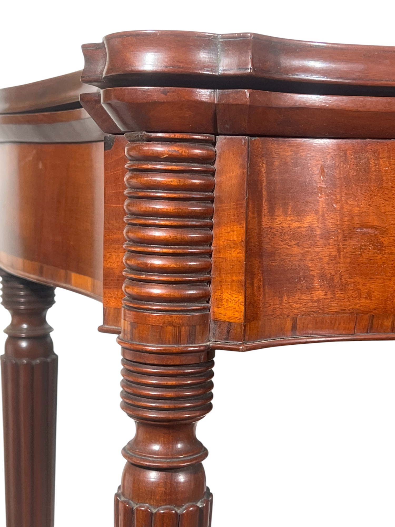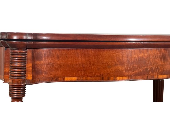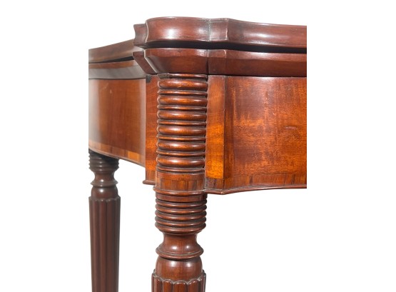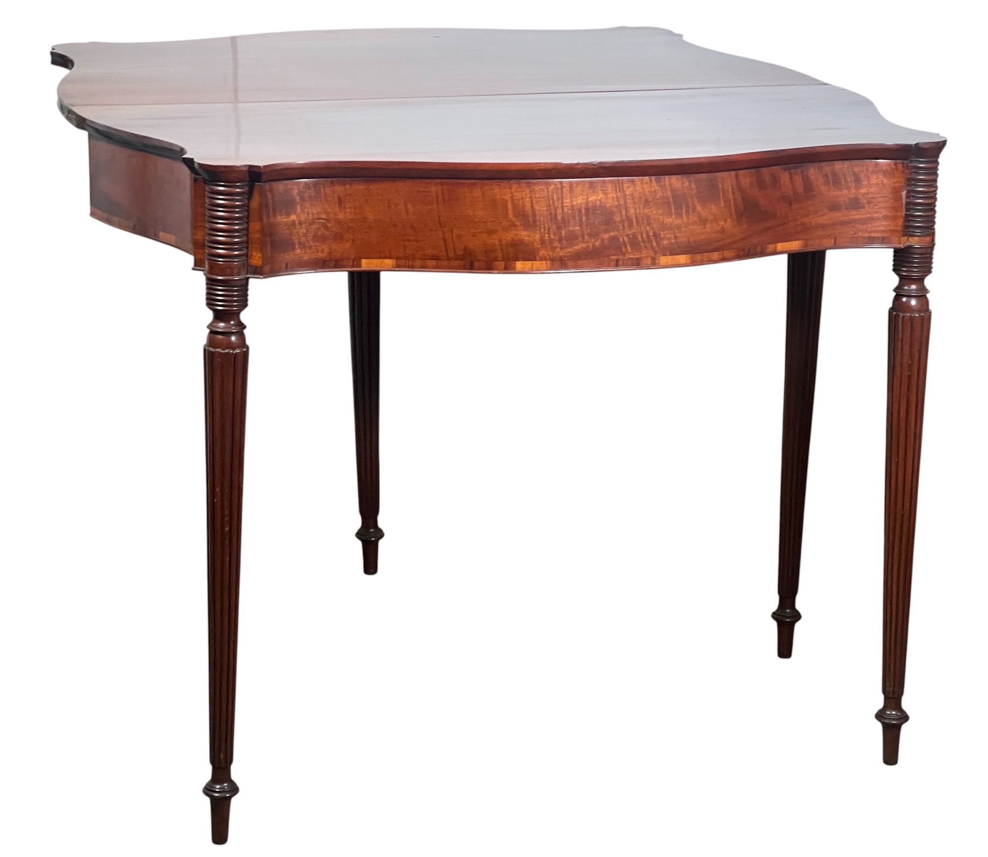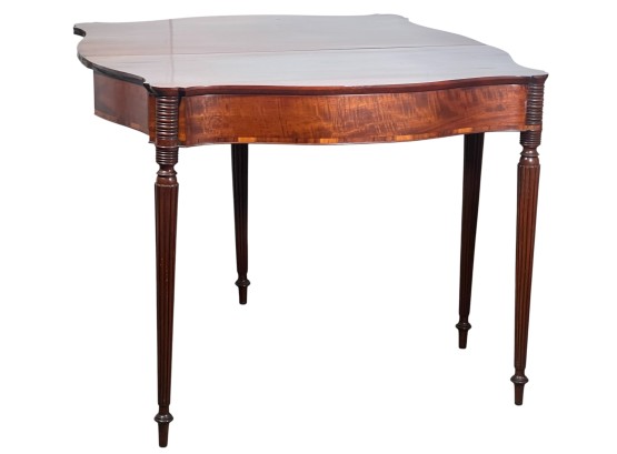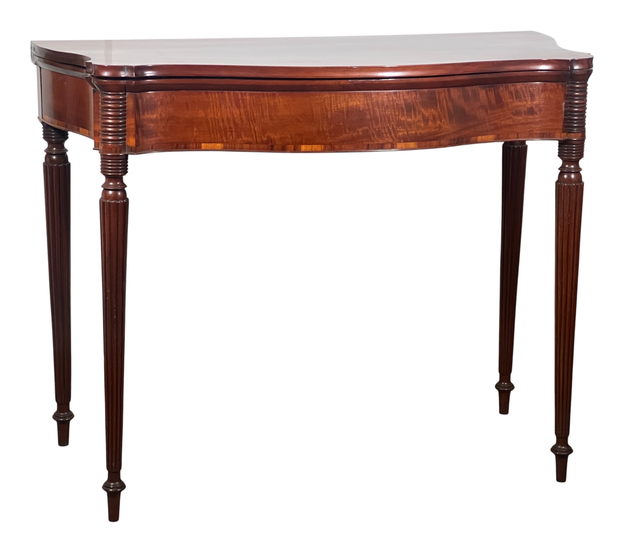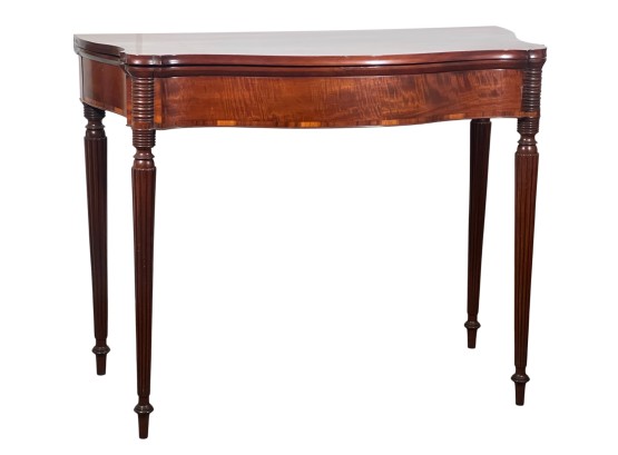 Nicely shaped flip top with reverse matched bevel, tiger maple veneer, subtle inlaid band, finely reeded legs. 29 1/2 x 37 x 18 inches closed; 28 1/2 x 37 x 36 inches open. Condition: Good. Temp No 8840