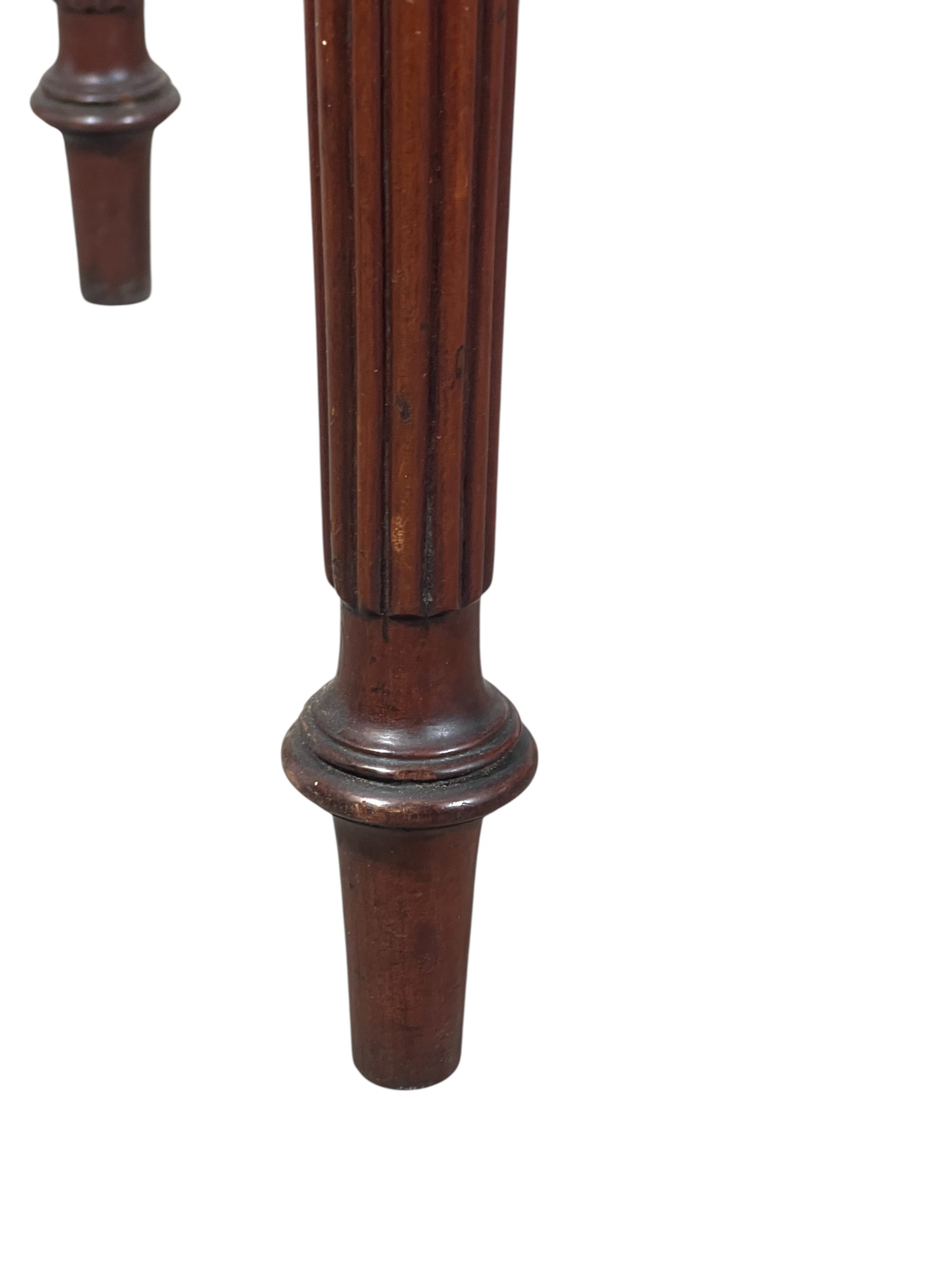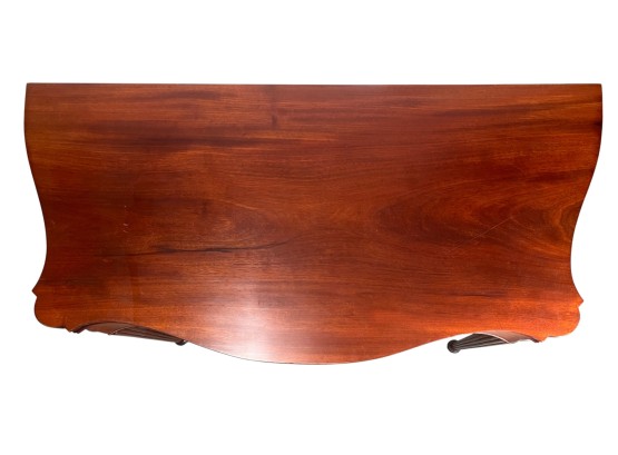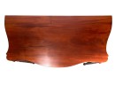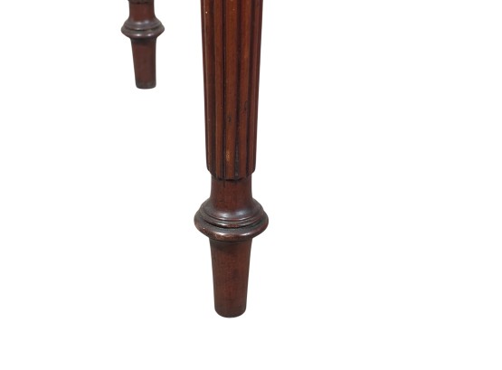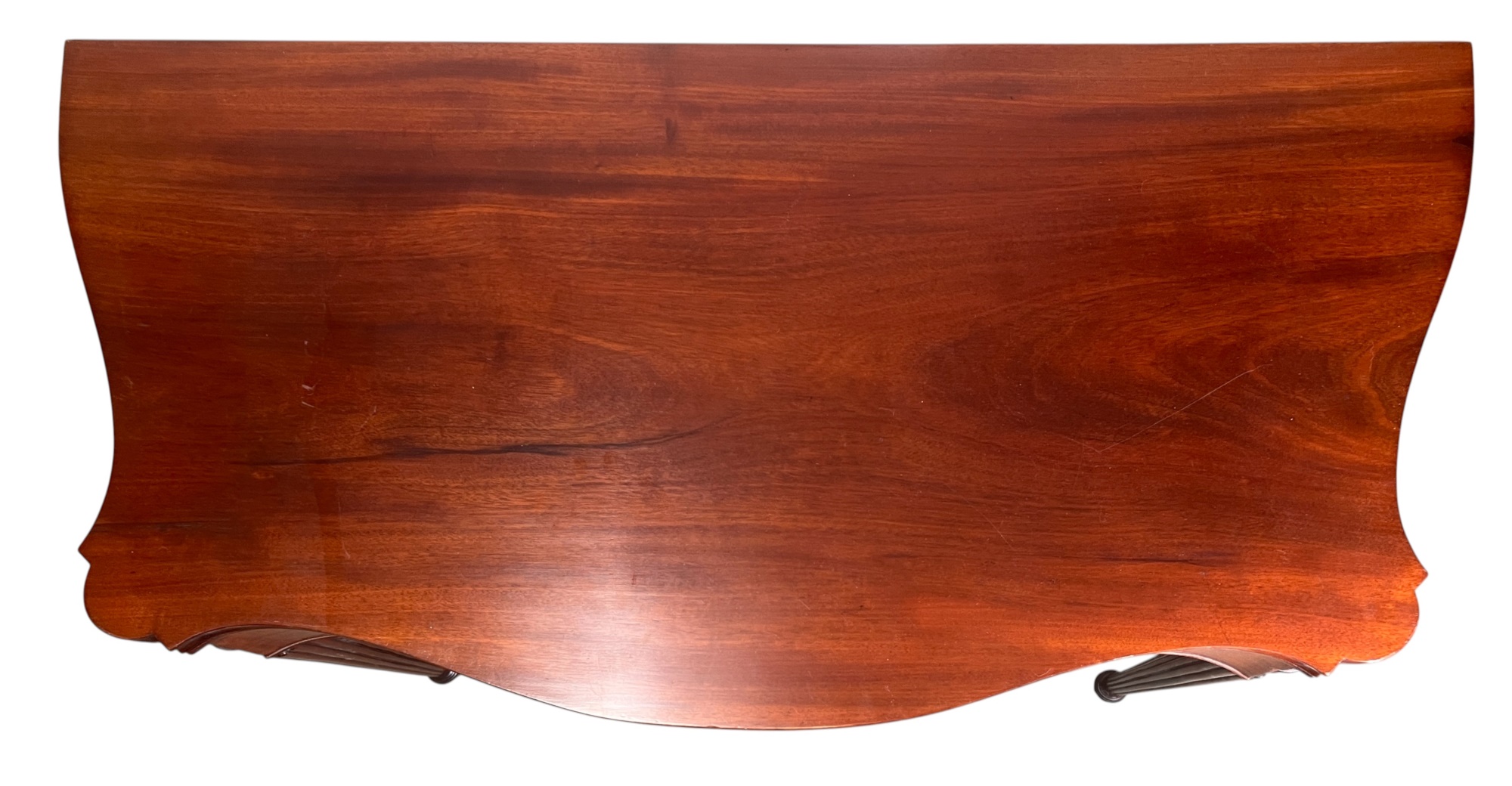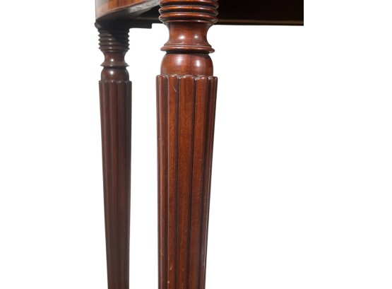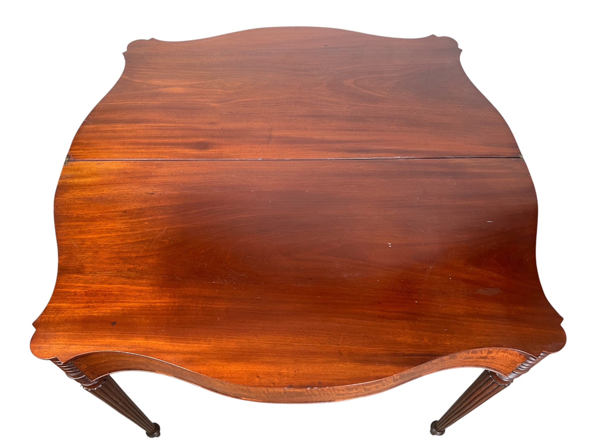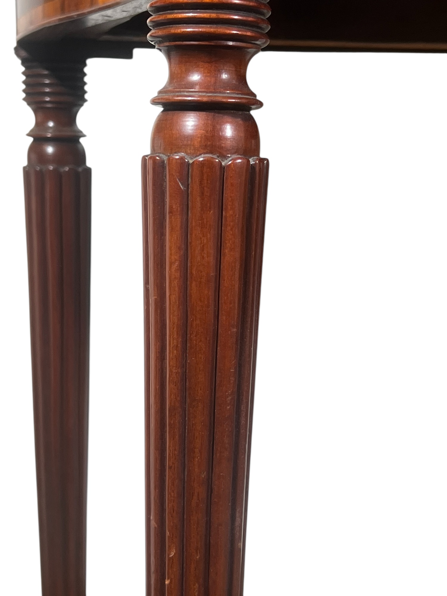 Nicely shaped flip top with reverse matched bevel, tiger maple veneer, subtle inlaid band, finely reeded legs. 29 1/2 x 37 x 18 inches closed; 28 1/2 x 37 x 36 inches open. Condition: Good. Temp No 8840