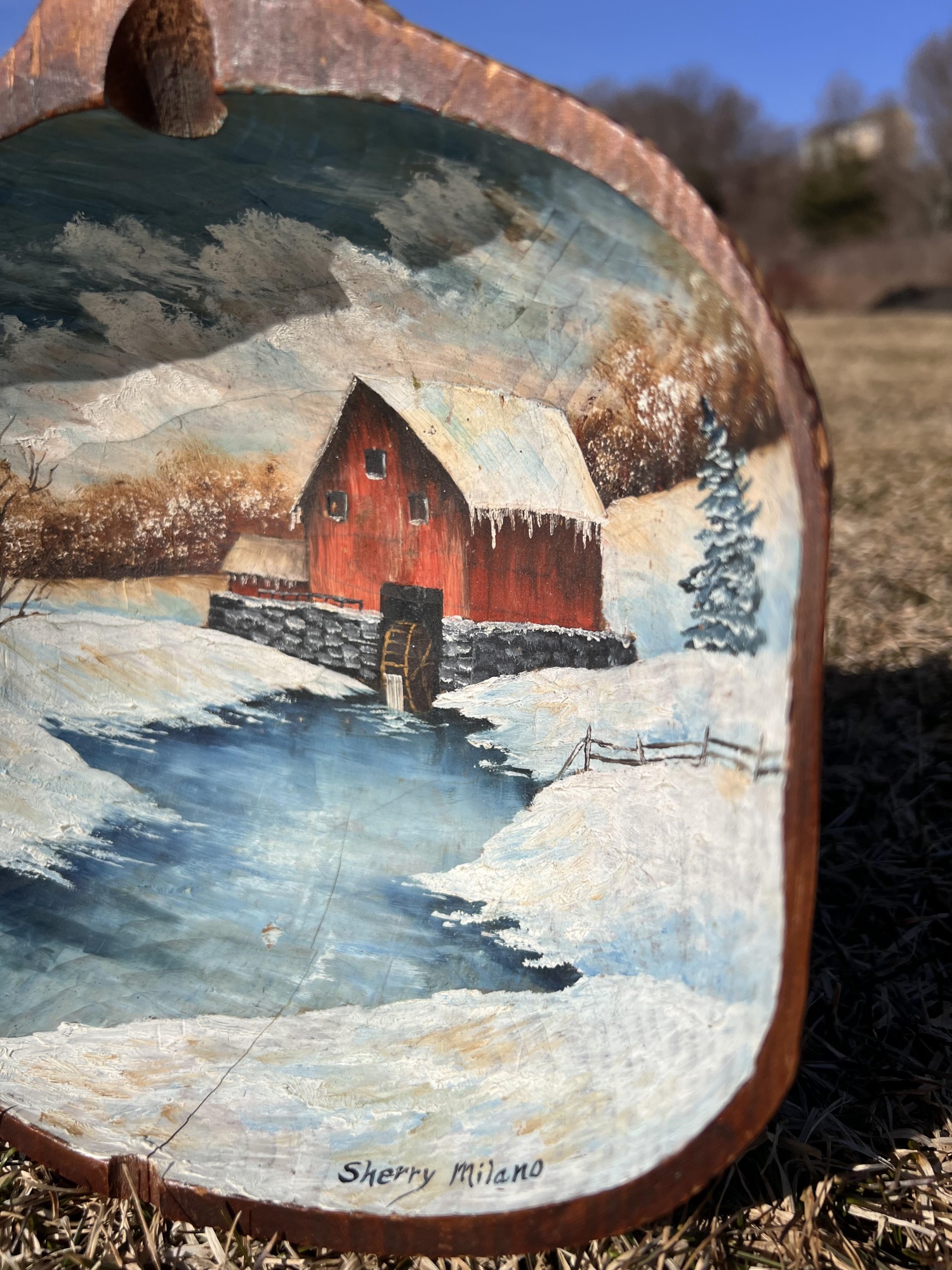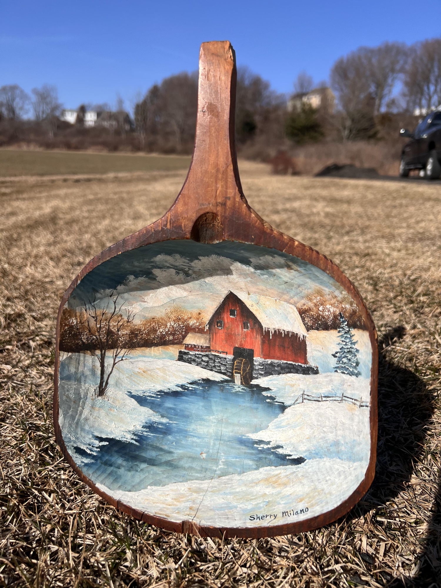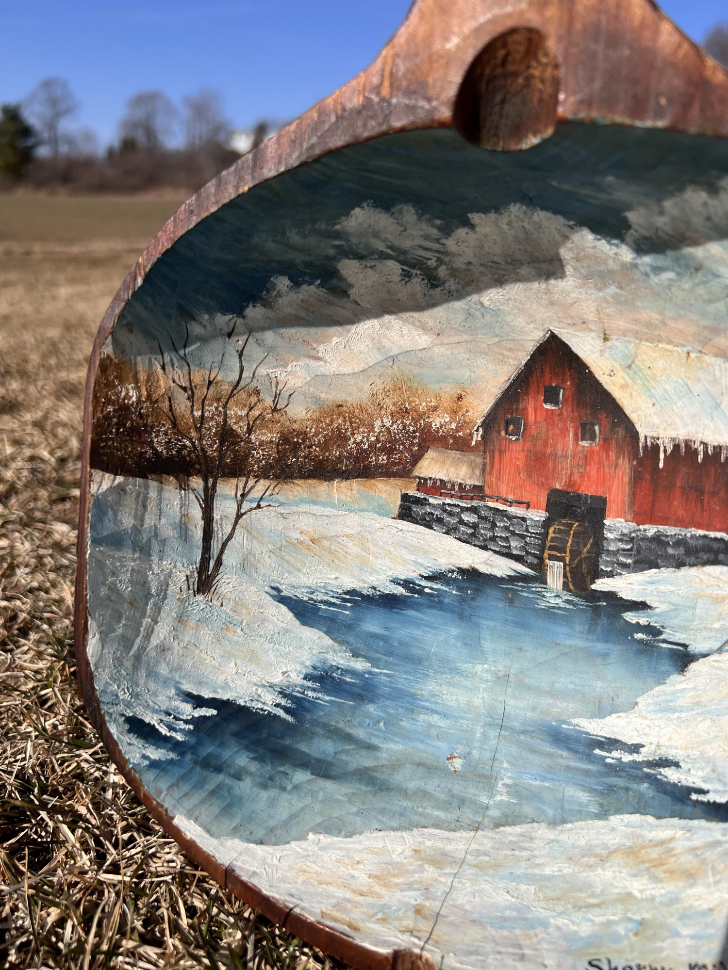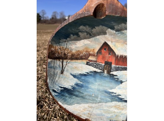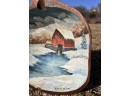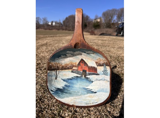 Signed winter scene on cared wooden scoop. 12 1/2" x 8 1/2" Condition: Good, cracking to scoop Temp No 6581