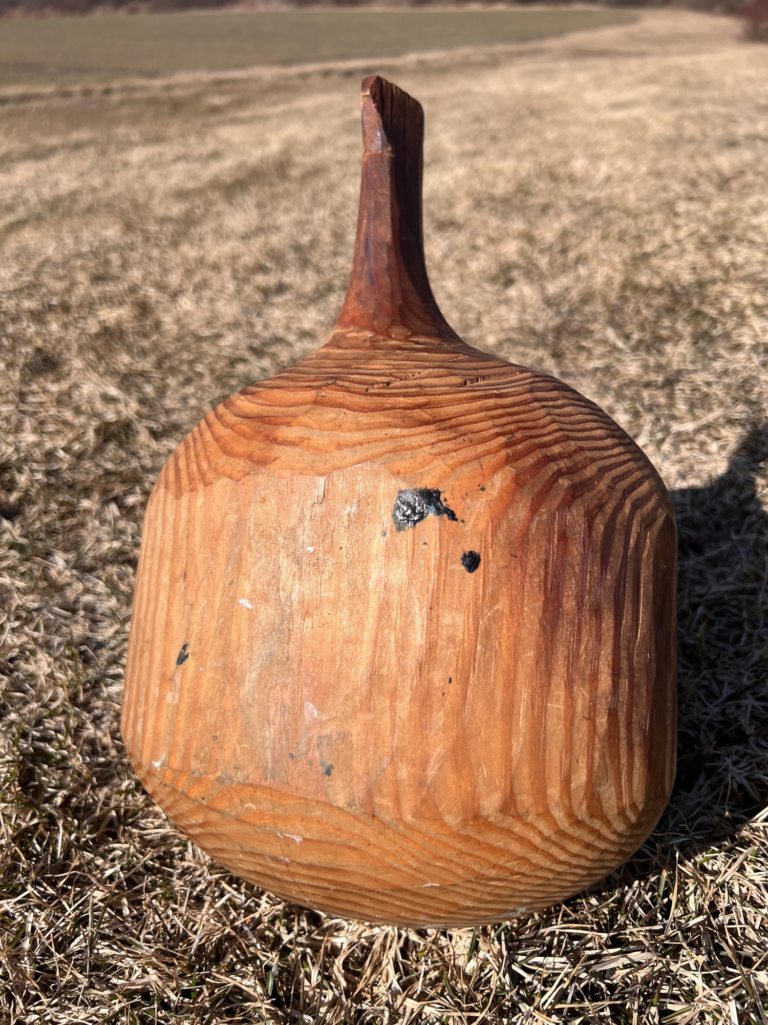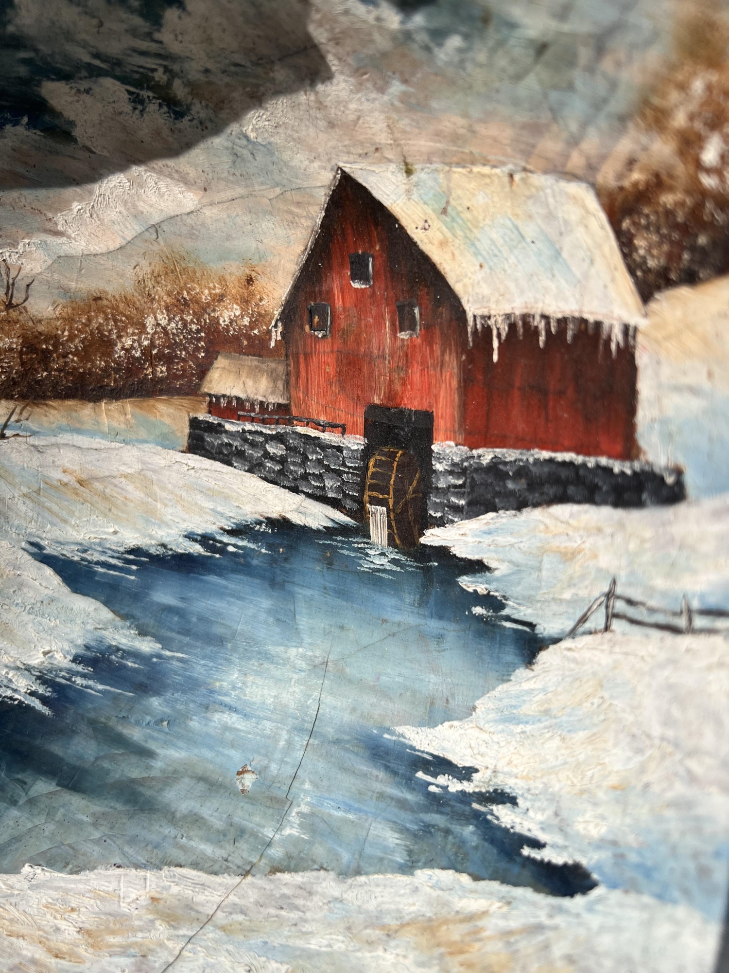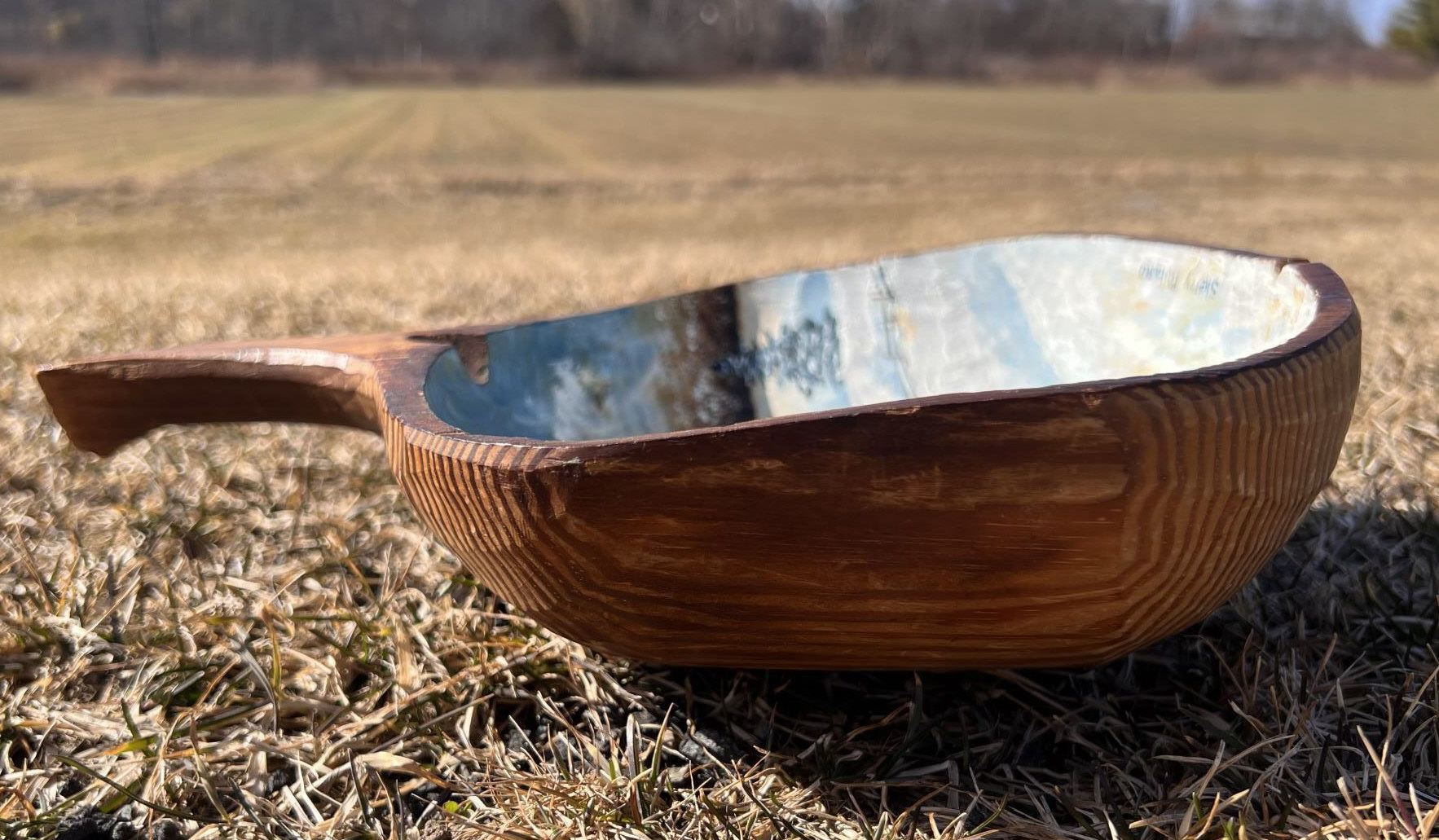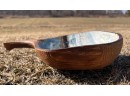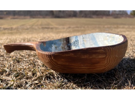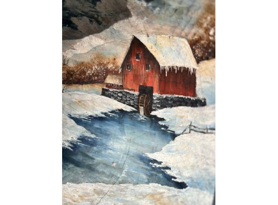 Signed winter scene on cared wooden scoop. 12 1/2" x 8 1/2" Condition: Good, cracking to scoop Temp No 6581