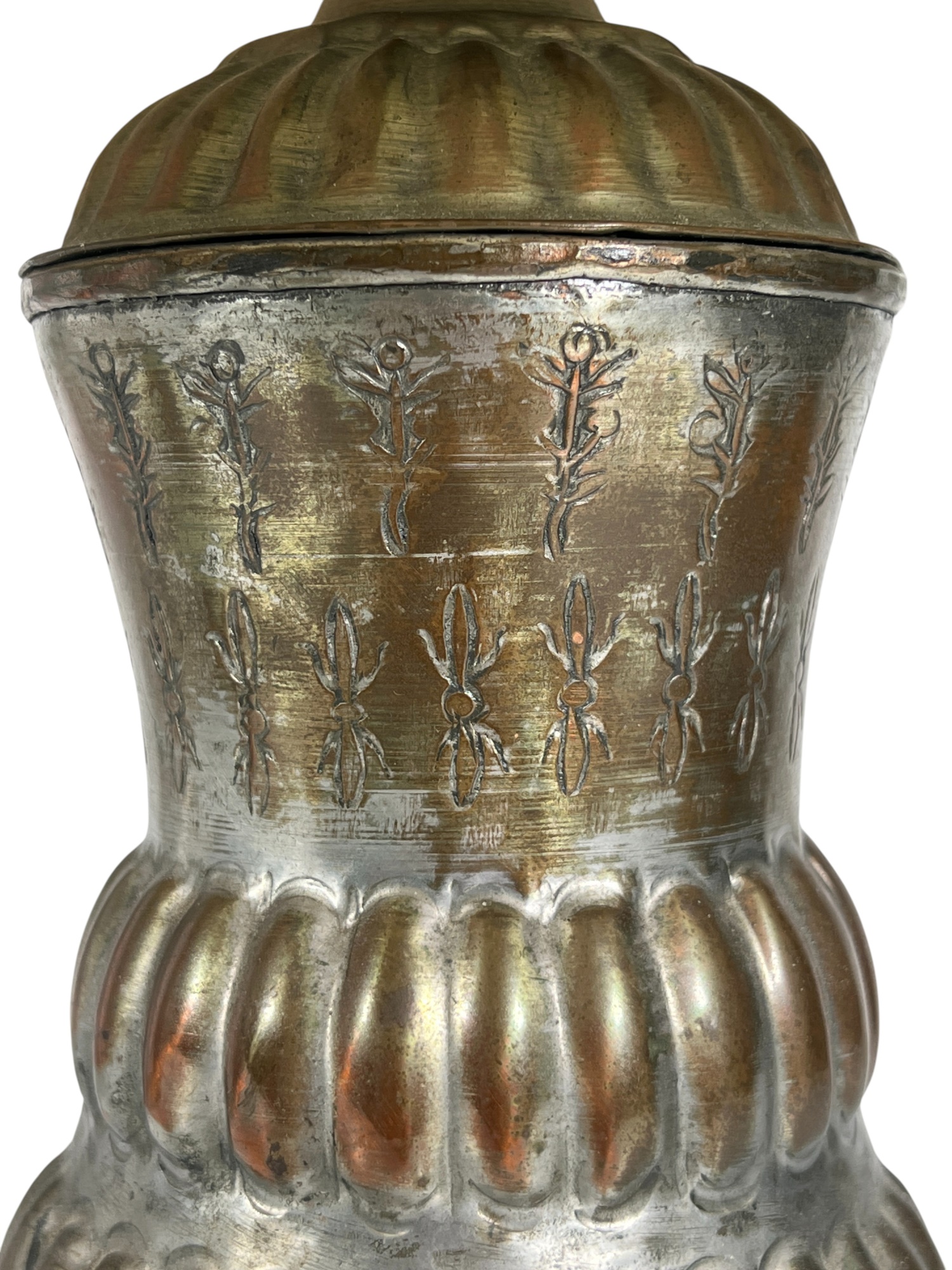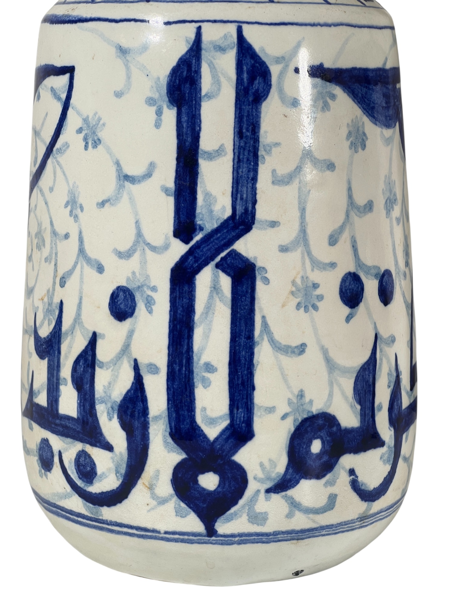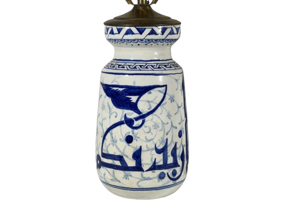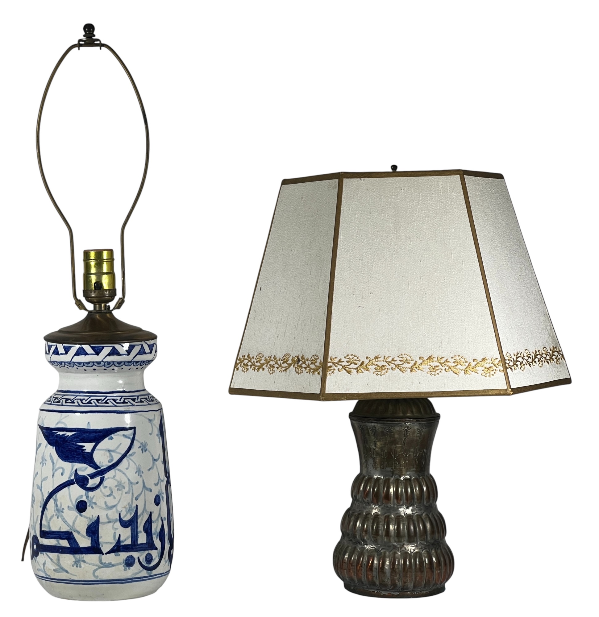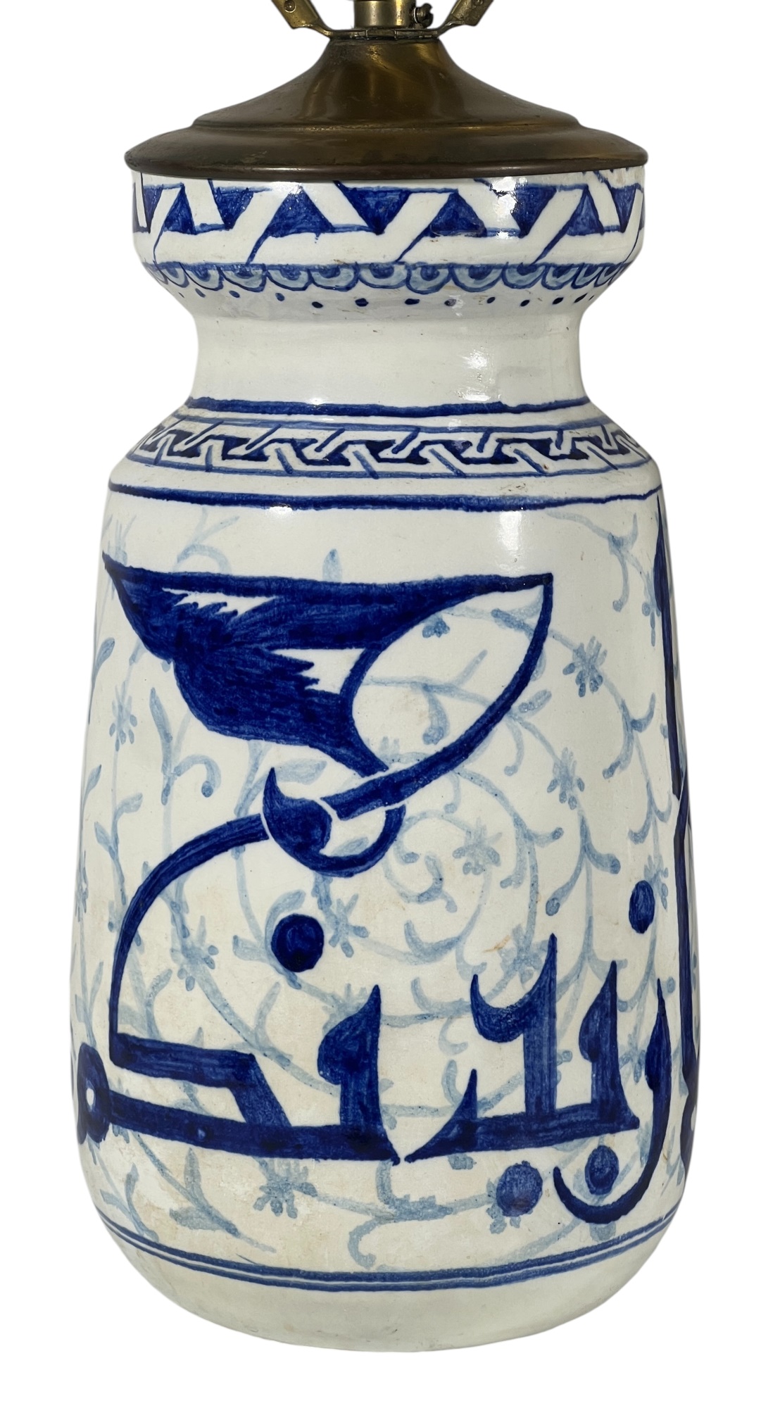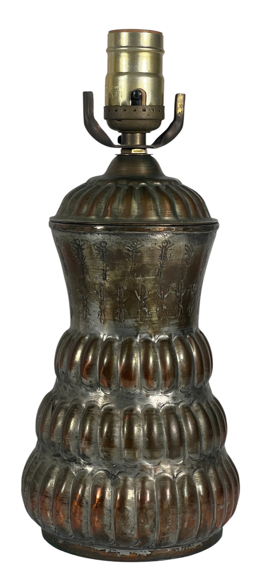 Middle Eastern vase hand painted with Arabic calligraphy & geometric patterns, signed under base "Dabbikeh Jerusalem Jordan". Mounted as lamp. Along with another Turkish/Ottoman copper vase mounted as lamp. 23 inches to finial.
