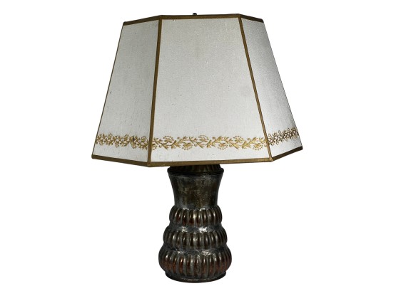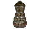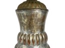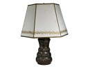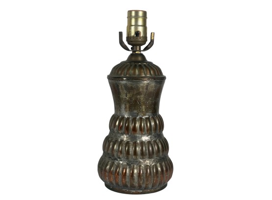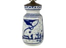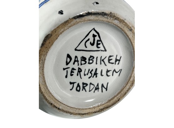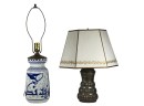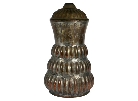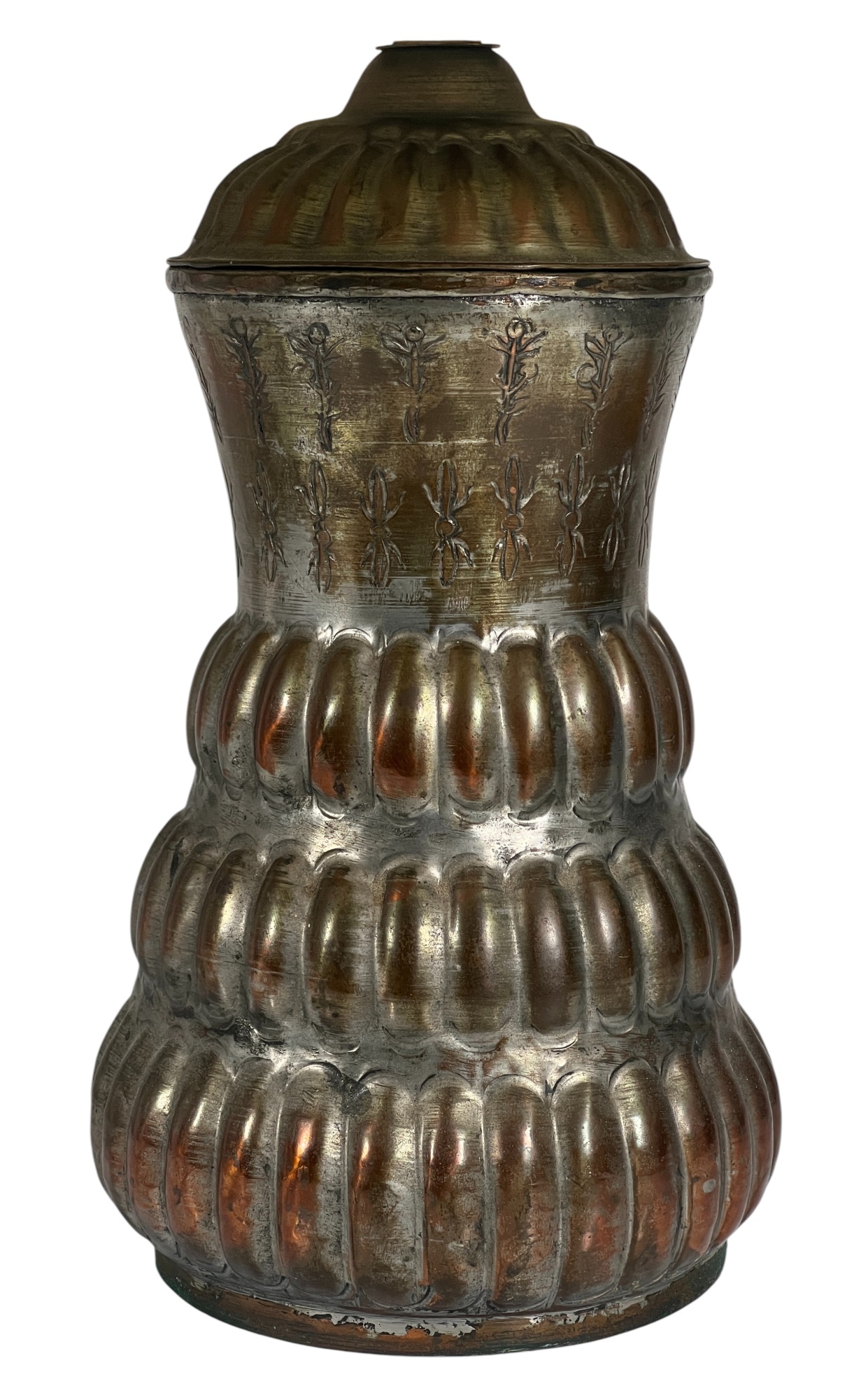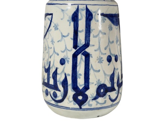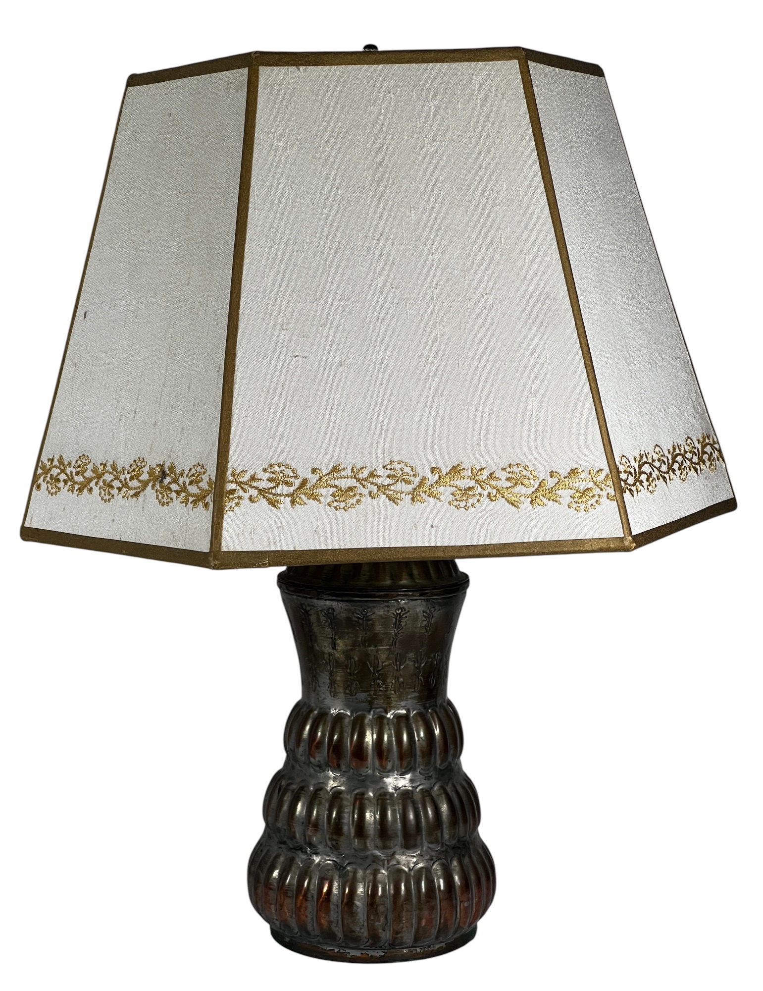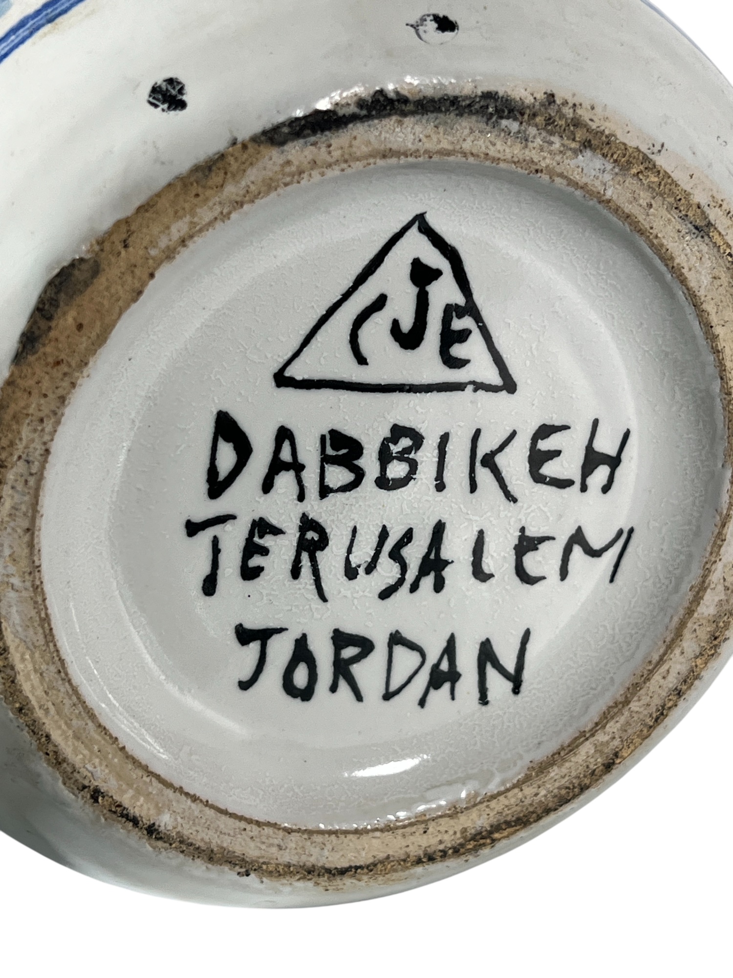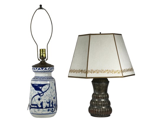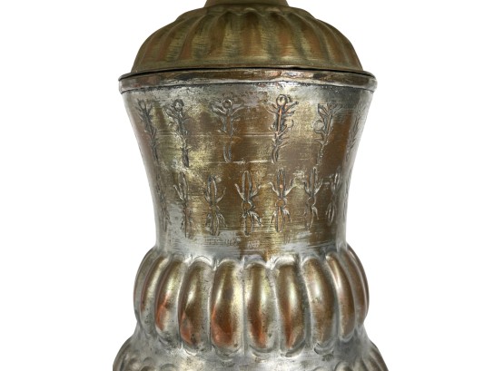 Middle Eastern vase hand painted with Arabic calligraphy & geometric patterns, signed under base "Dabbikeh Jerusalem Jordan". Mounted as lamp. Along with another Turkish/Ottoman copper vase mounted as lamp. 23 inches to finial.