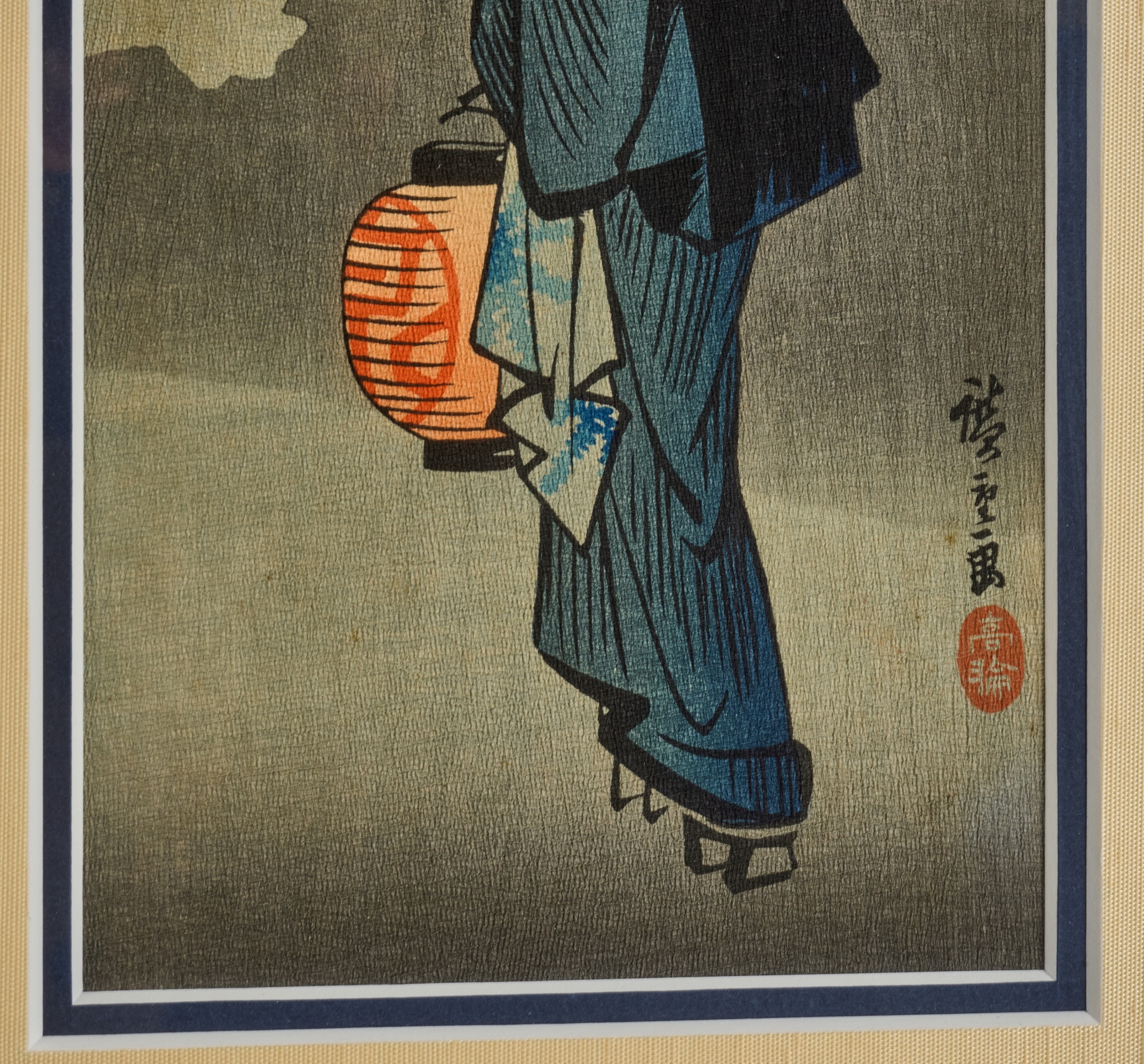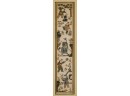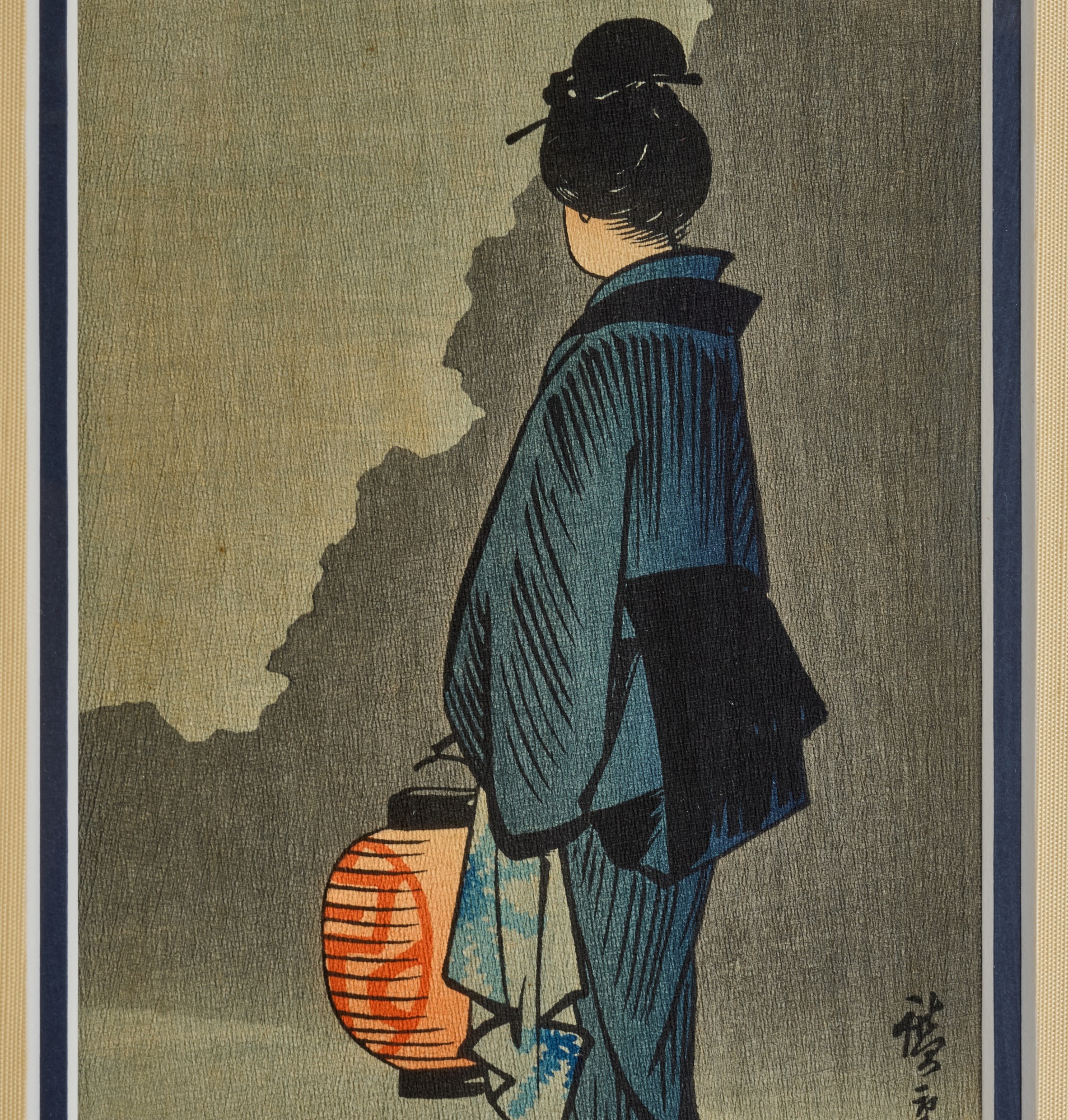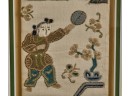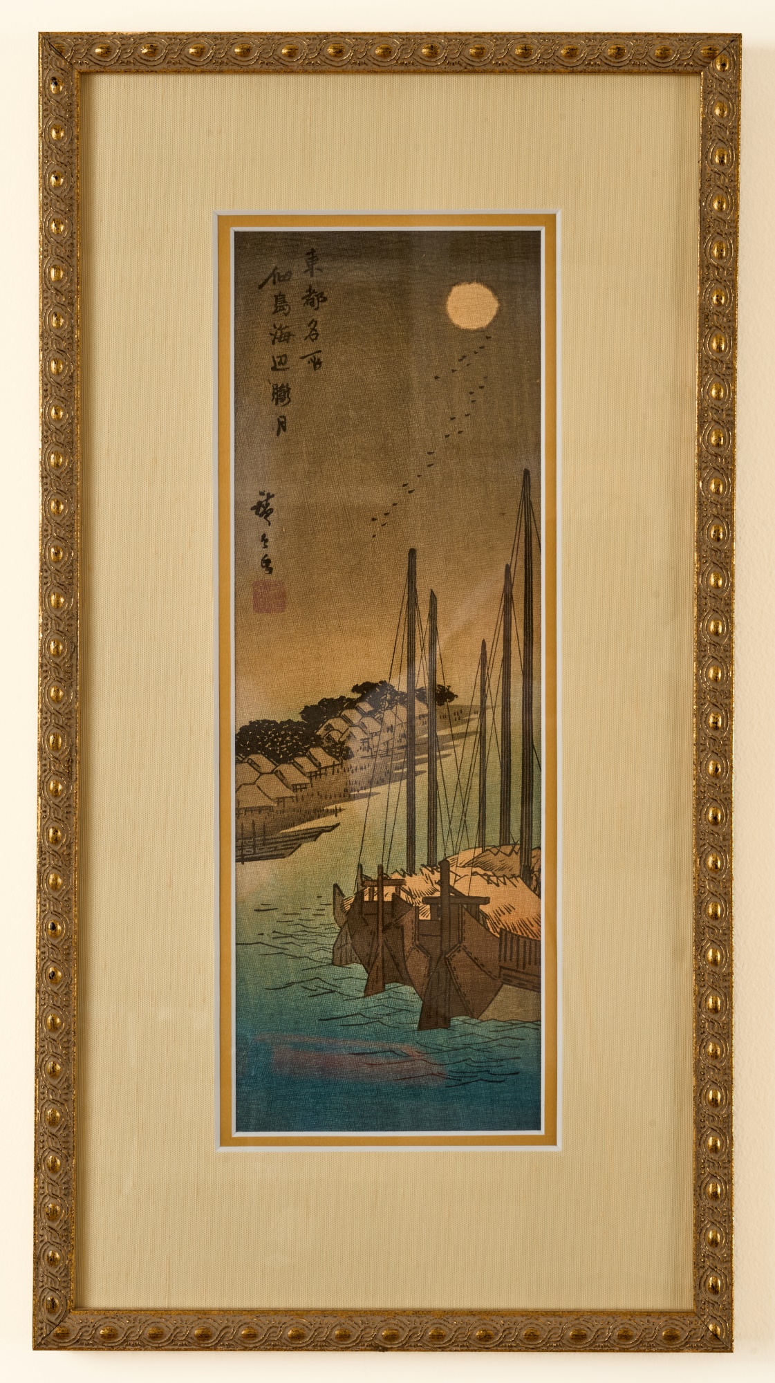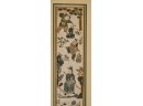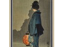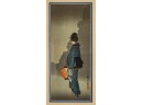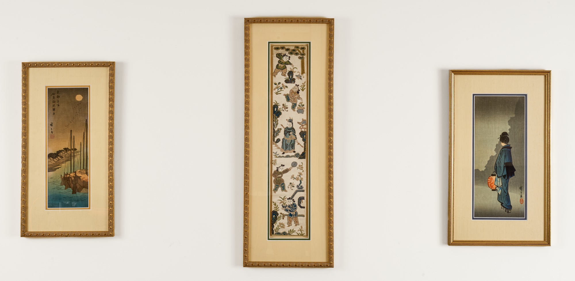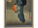 Hiroshige IV (Beauty with Lantern) and Utagawa Hiroshige (Spring Moon at the Shore of Tsukudajima) 16.5 x 9.5 inches (and slightly smaller). Silk embroidery 23.5 x 8.5 inches (overall) Condition: Good