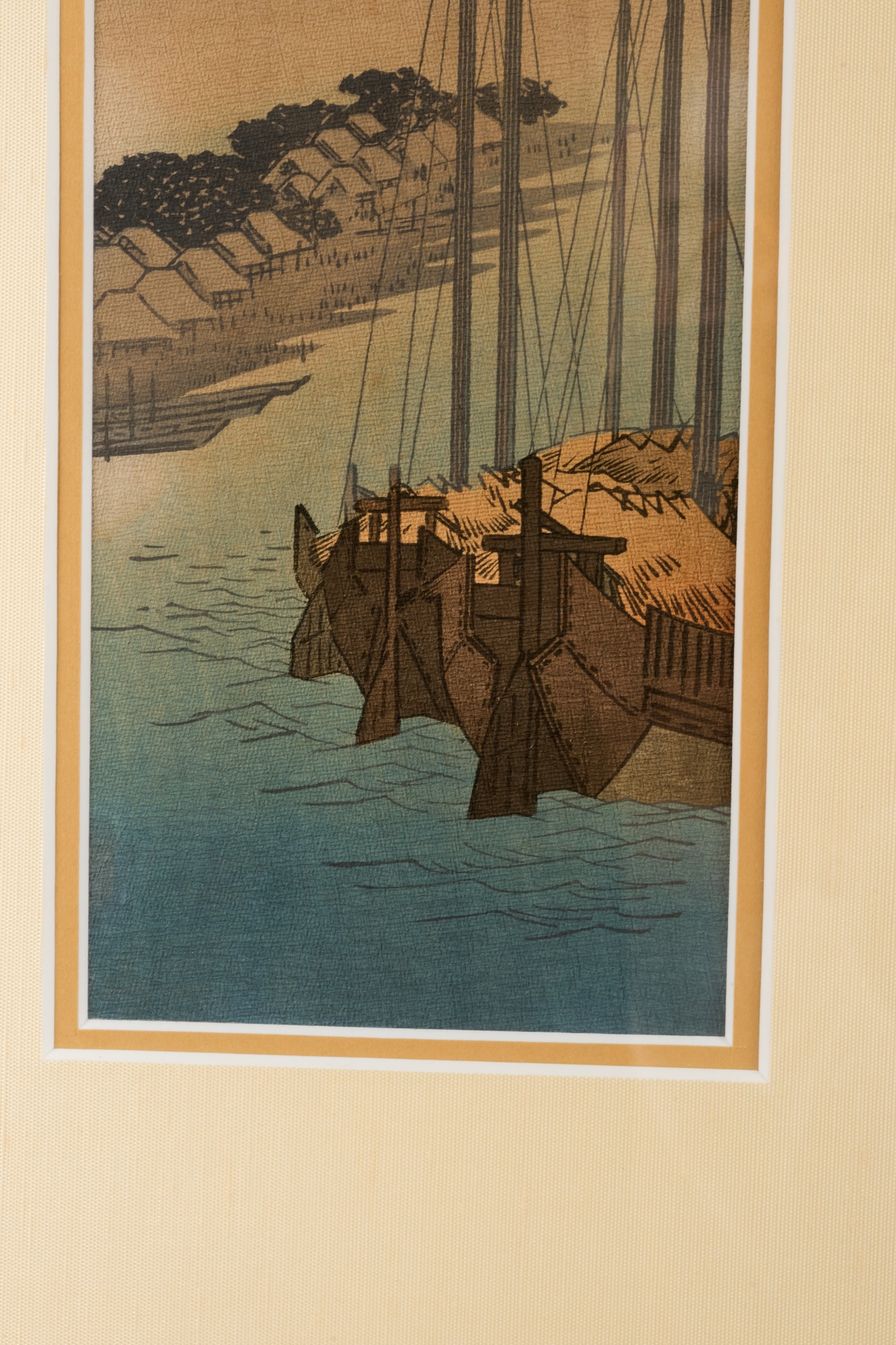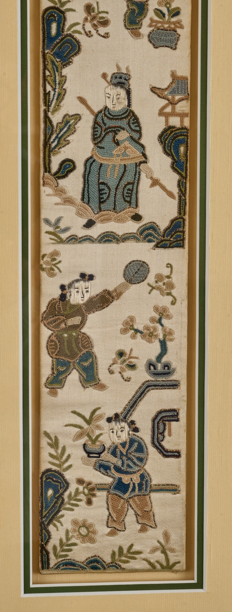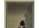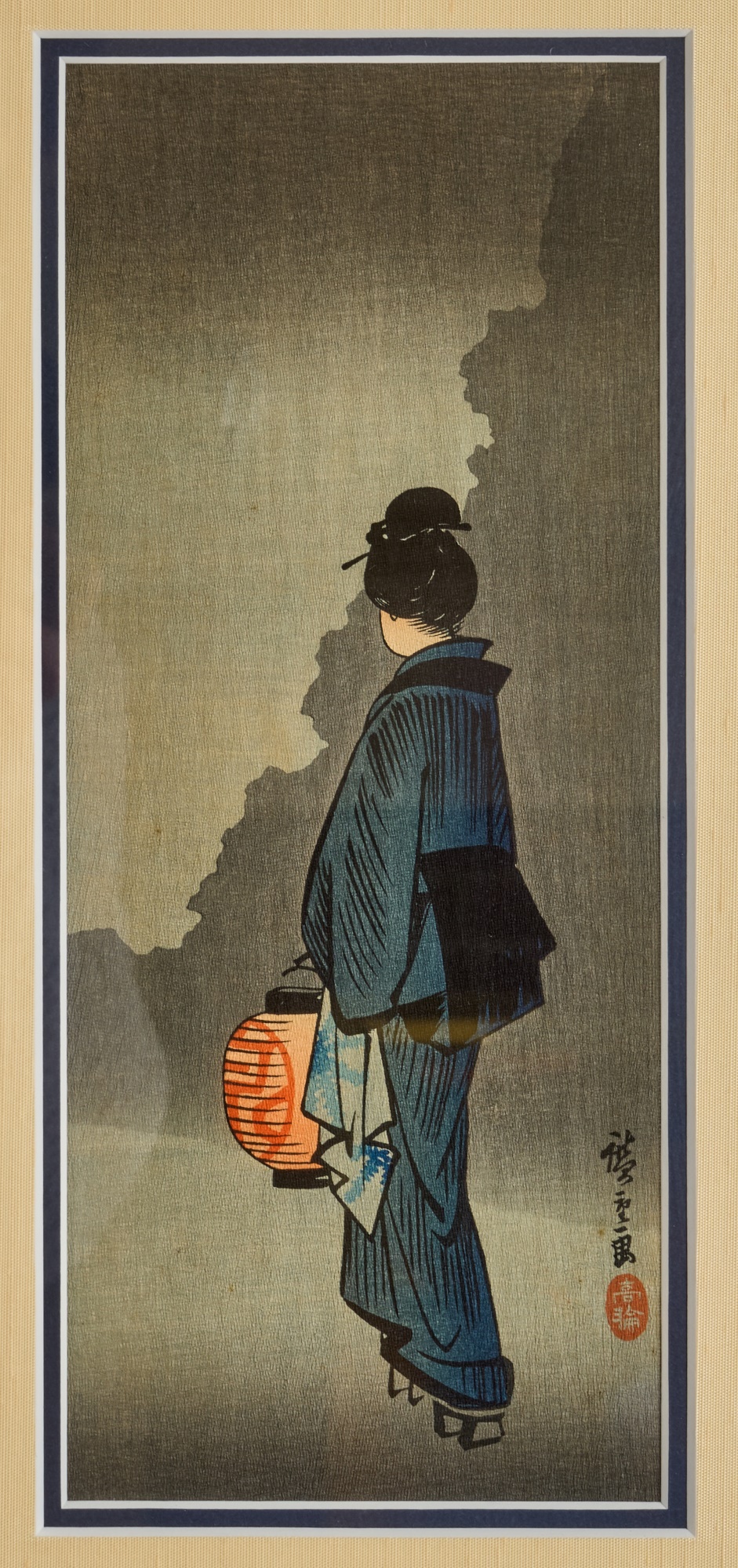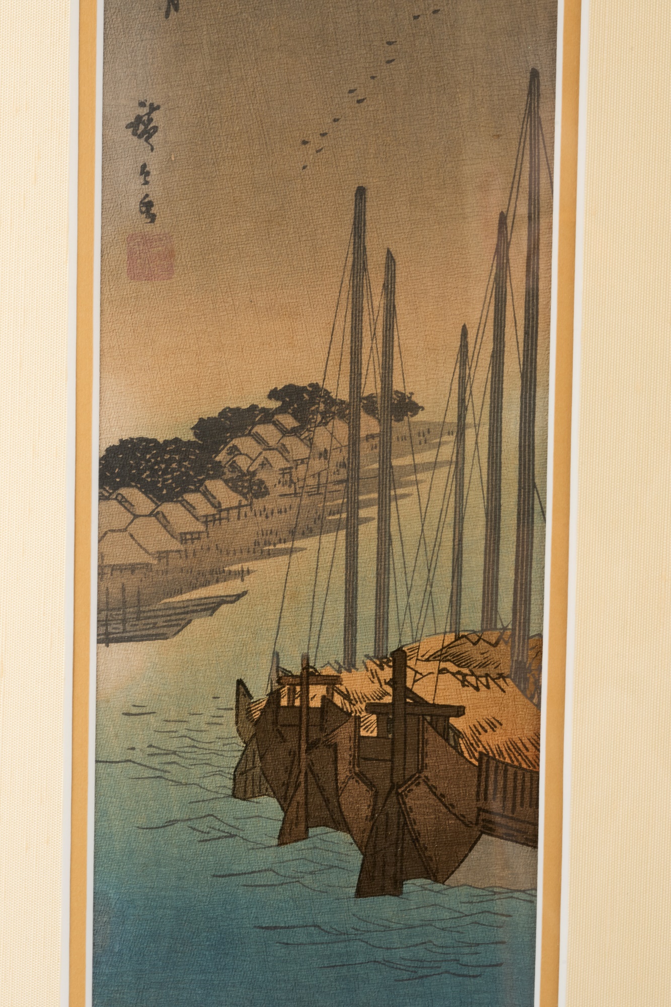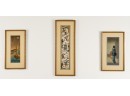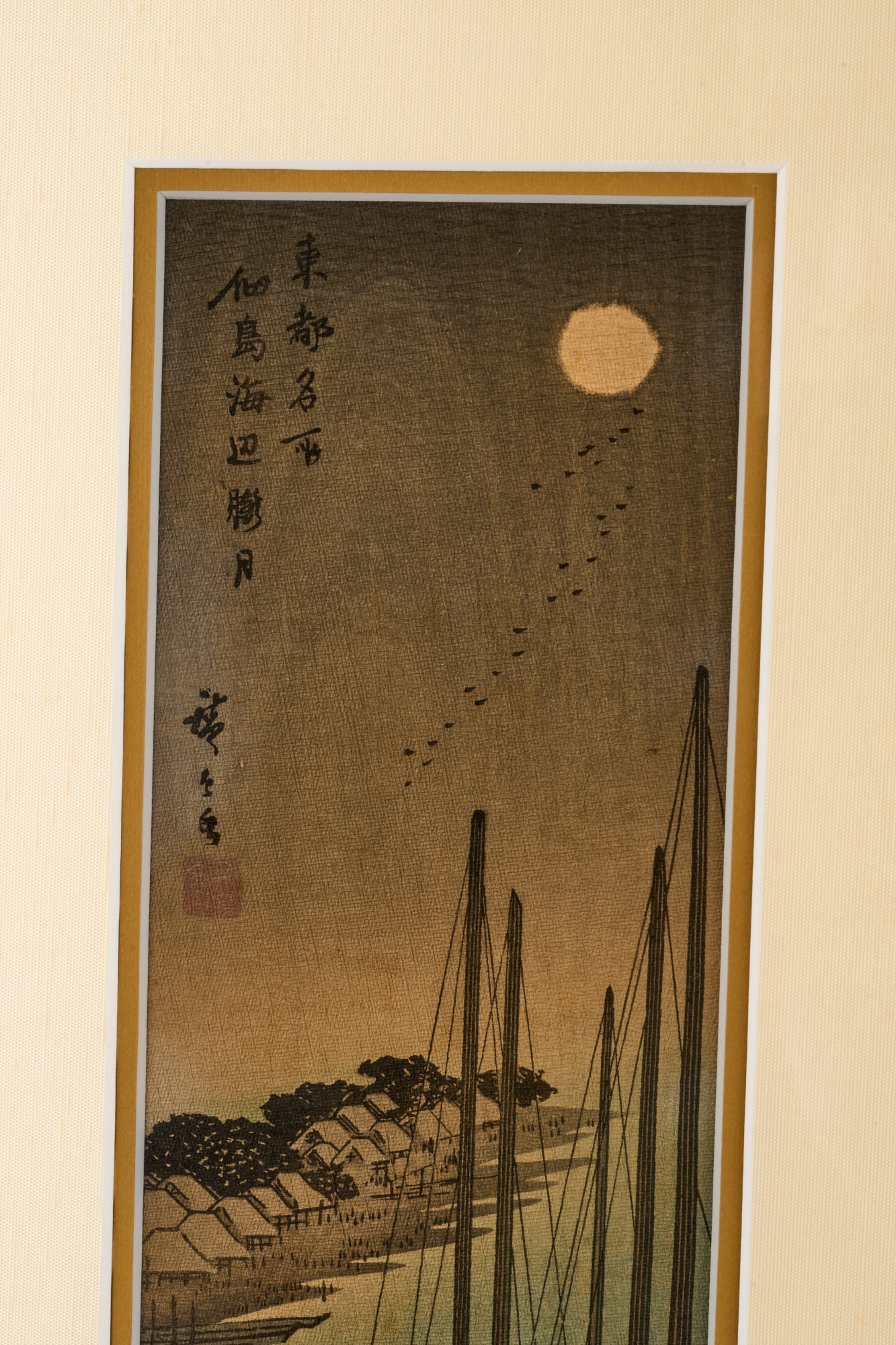 Hiroshige IV (Beauty with Lantern) and Utagawa Hiroshige (Spring Moon at the Shore of Tsukudajima) 16.5 x 9.5 inches (and slightly smaller). Silk embroidery 23.5 x 8.5 inches (overall) Condition: Good
