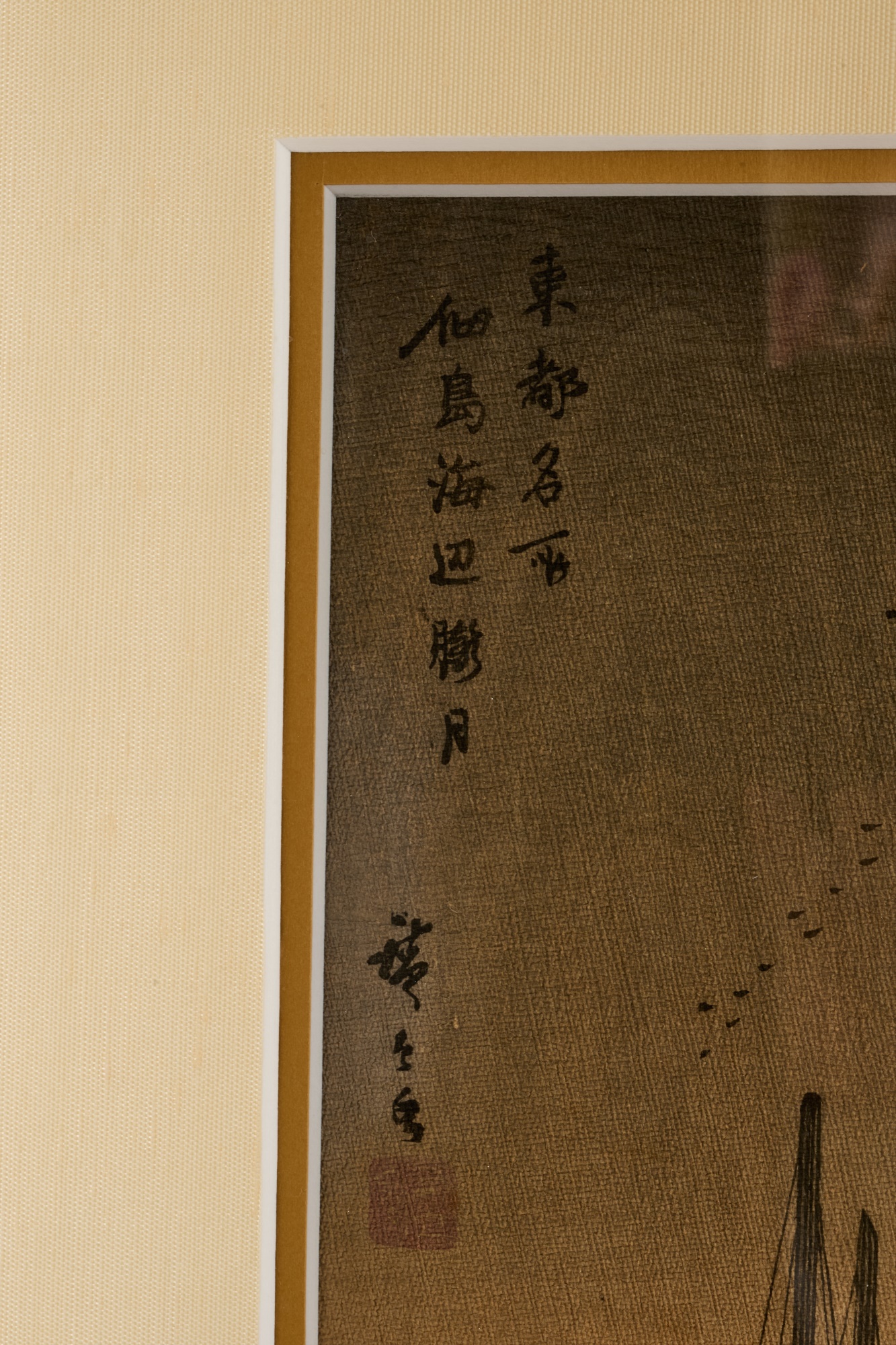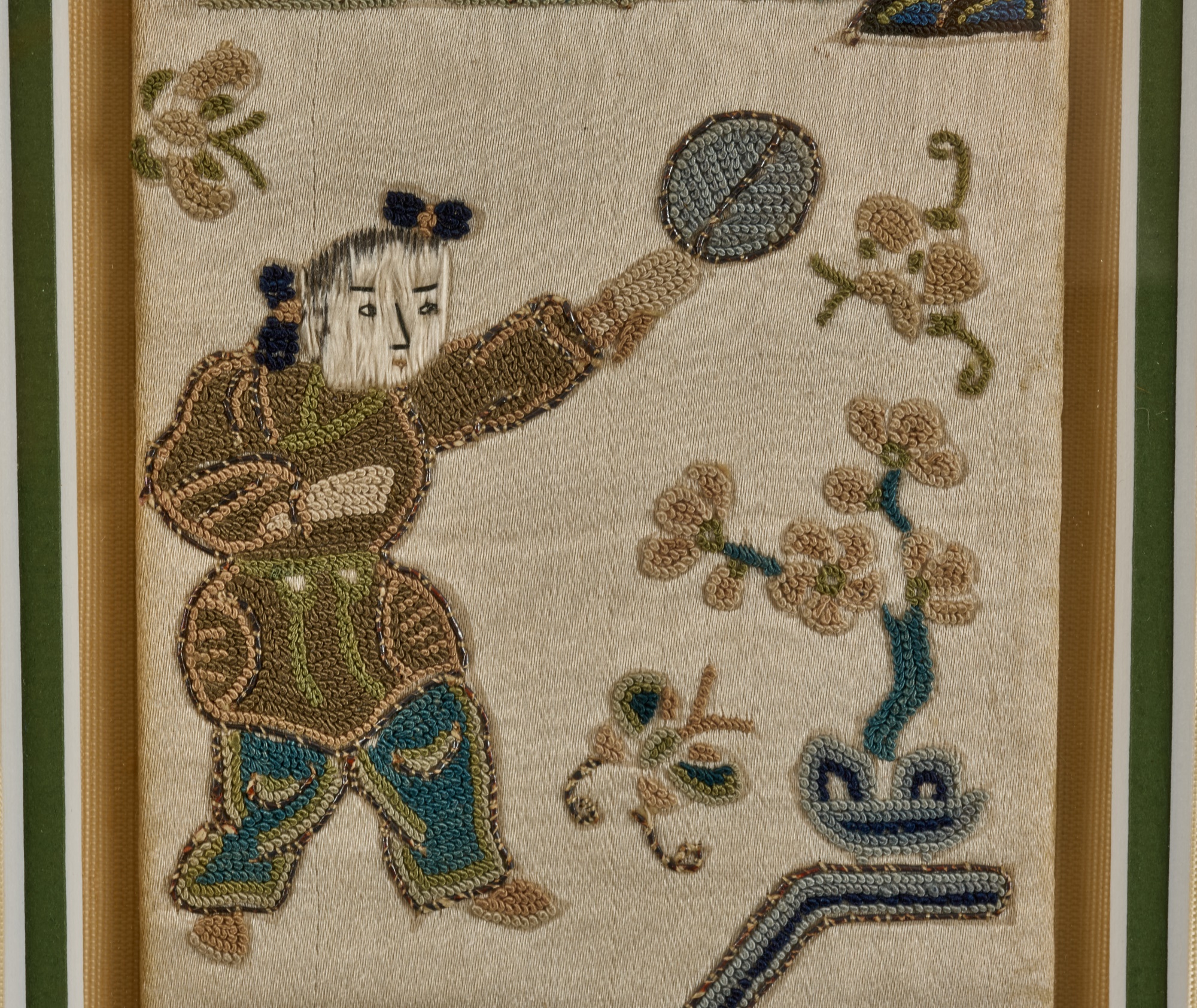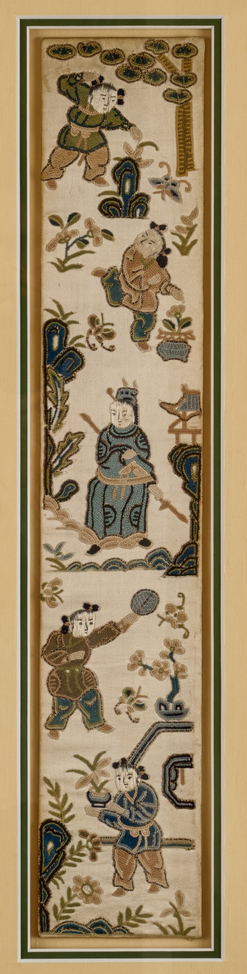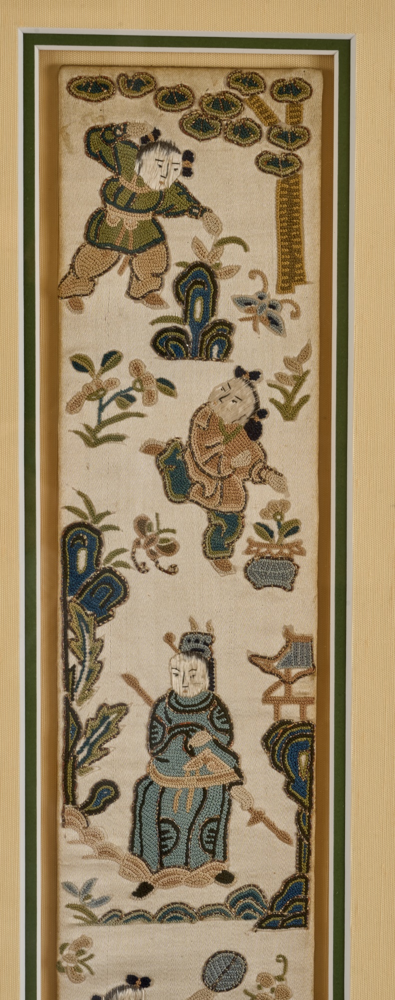 Hiroshige IV (Beauty with Lantern) and Utagawa Hiroshige (Spring Moon at the Shore of Tsukudajima) 16.5 x 9.5 inches (and slightly smaller). Silk embroidery 23.5 x 8.5 inches (overall) Condition: Good