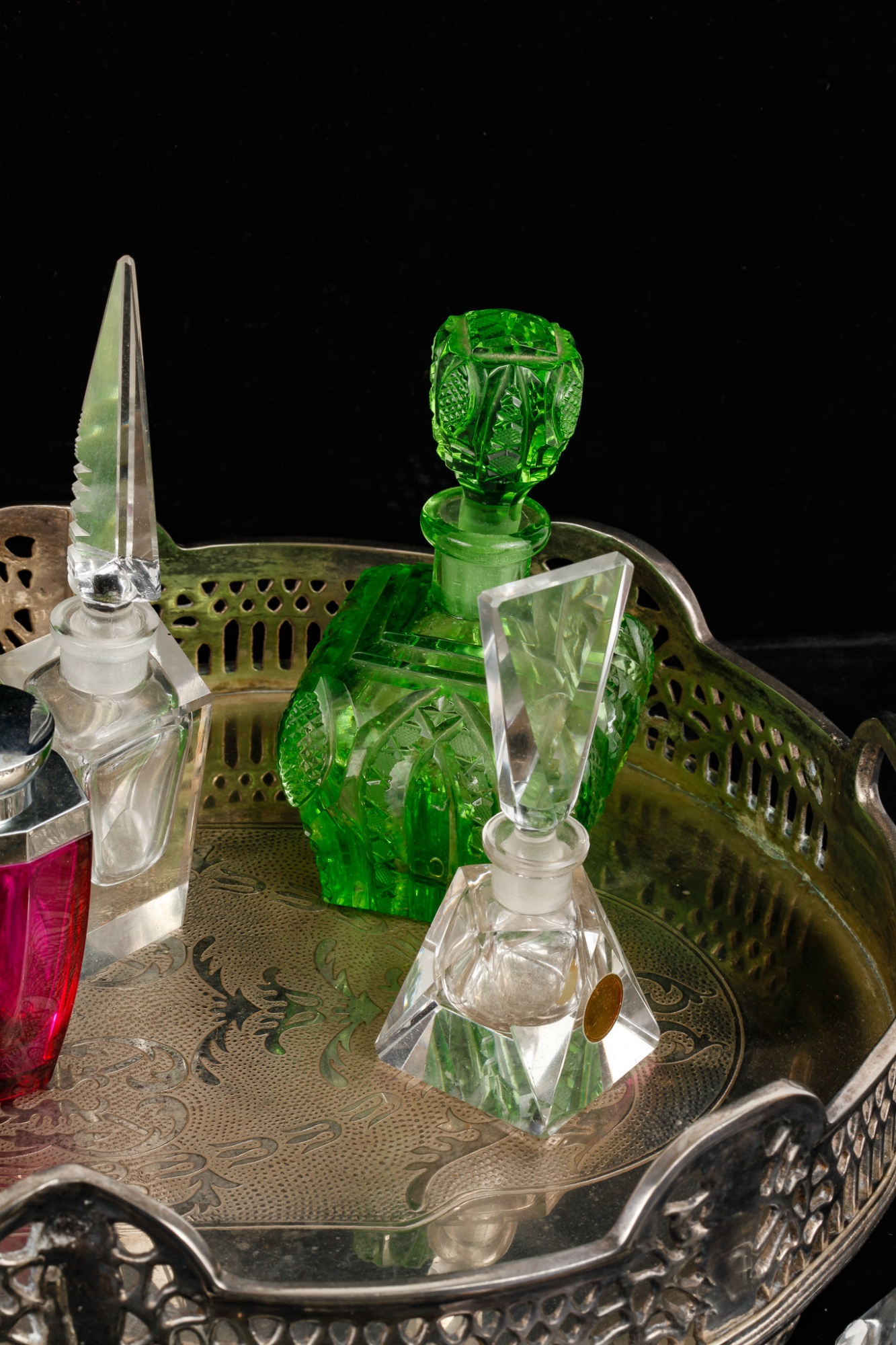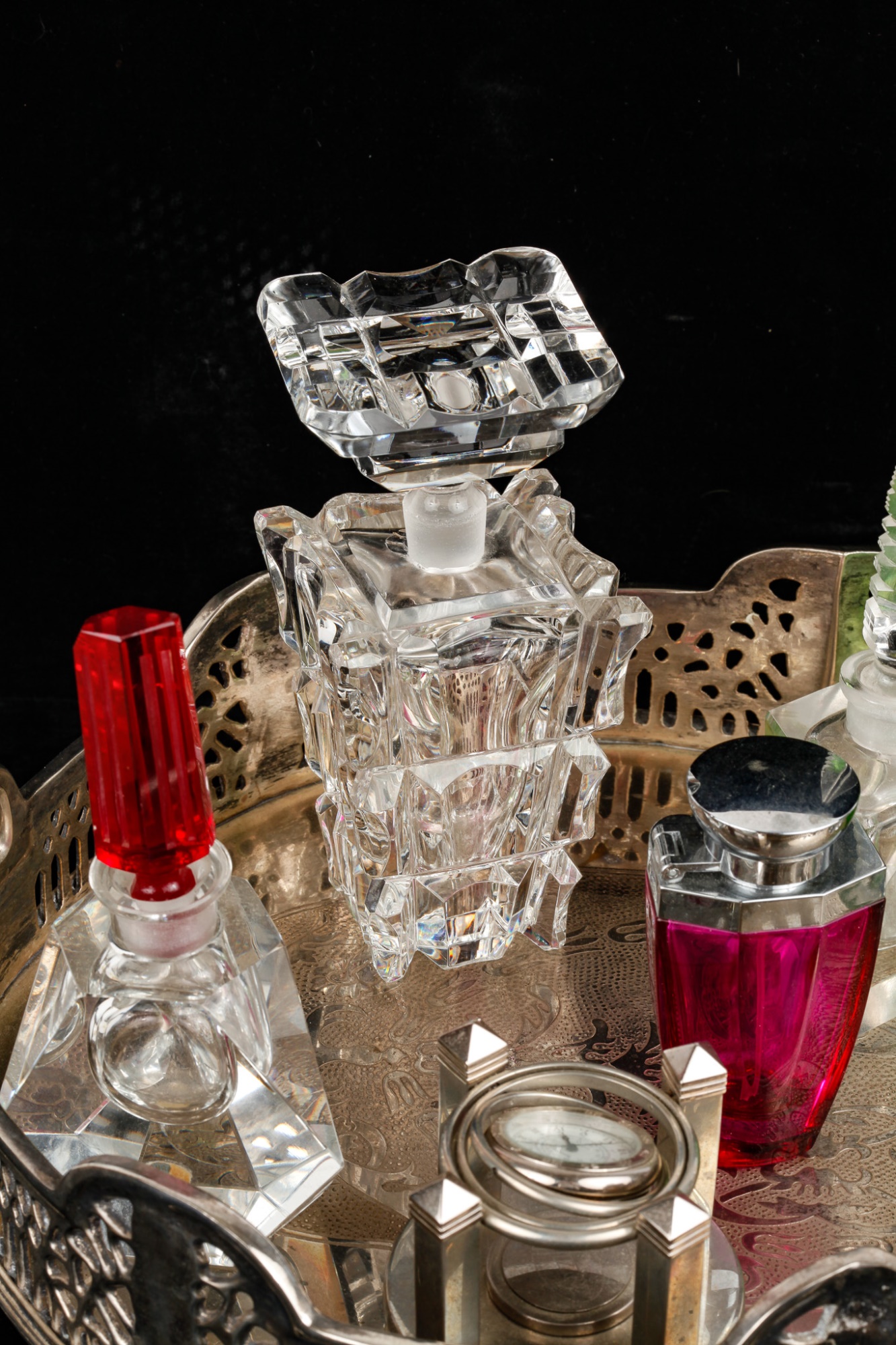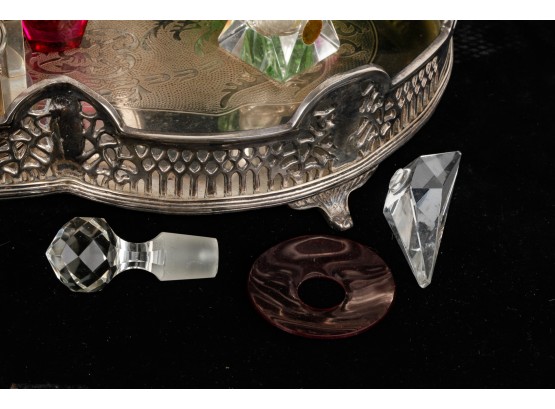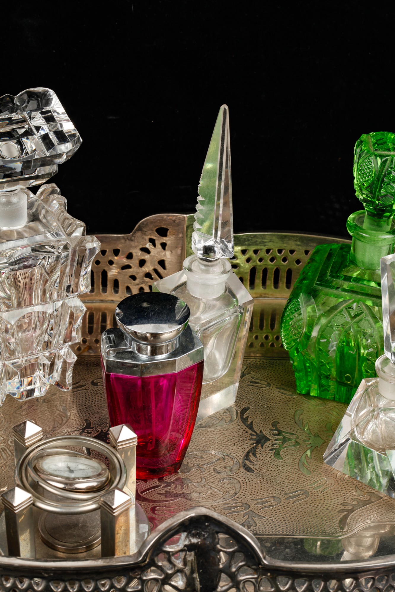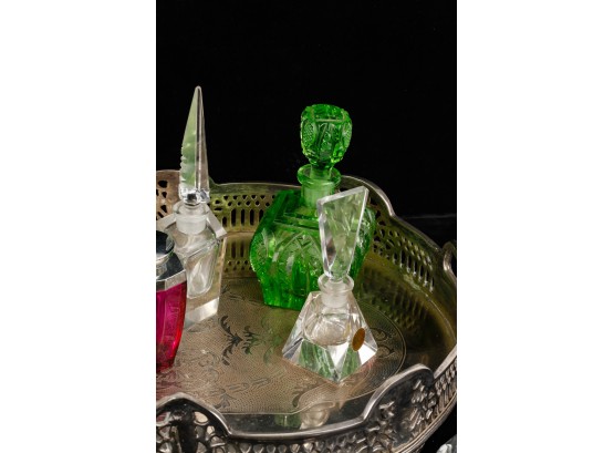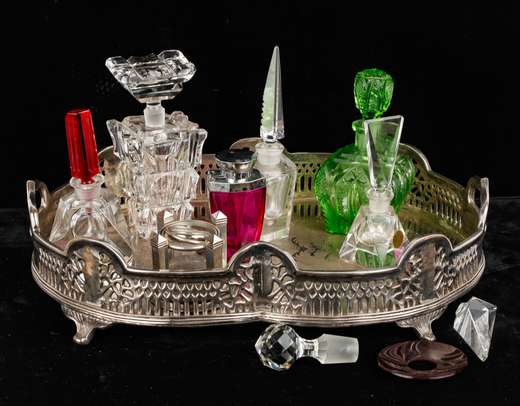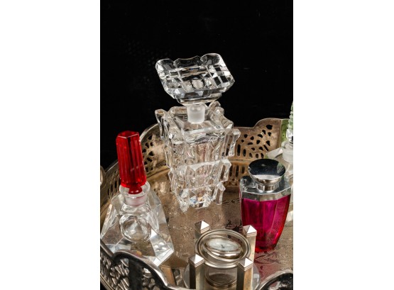 With (6) scent bottles, clock and stopper. Tallest 6" H (damage), other good. Various ages. Tray 3 1/2" x 15" x 11"