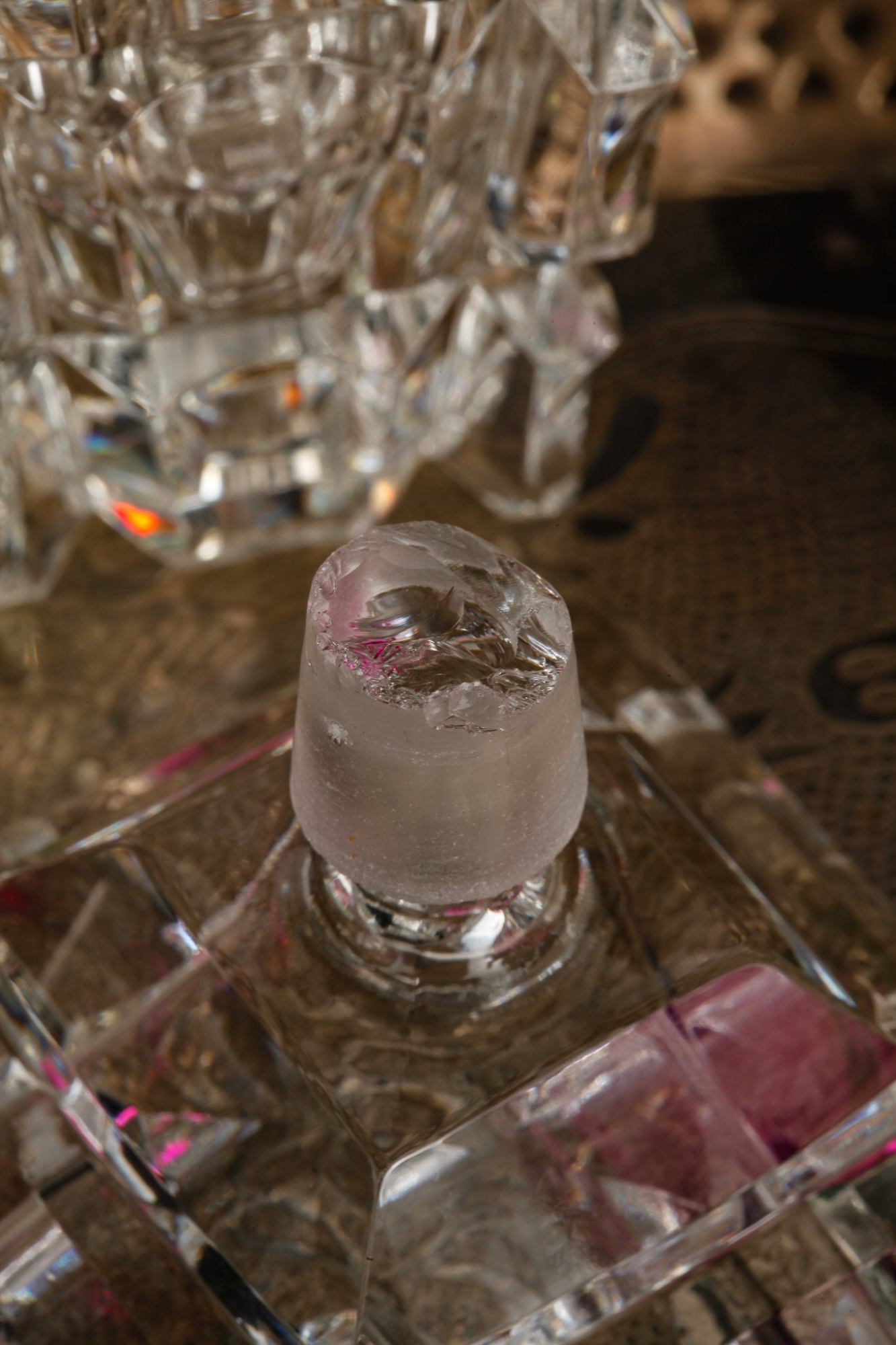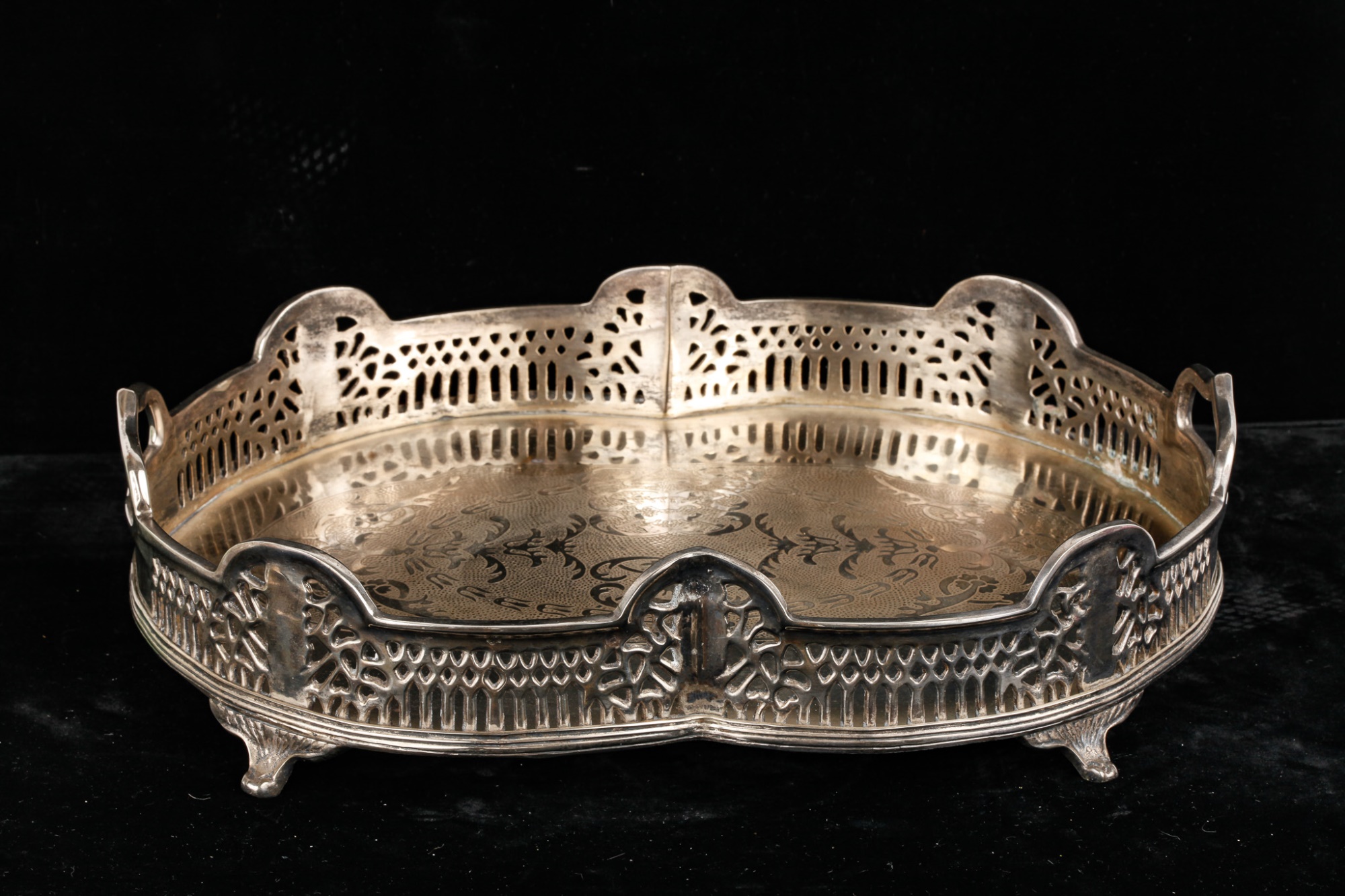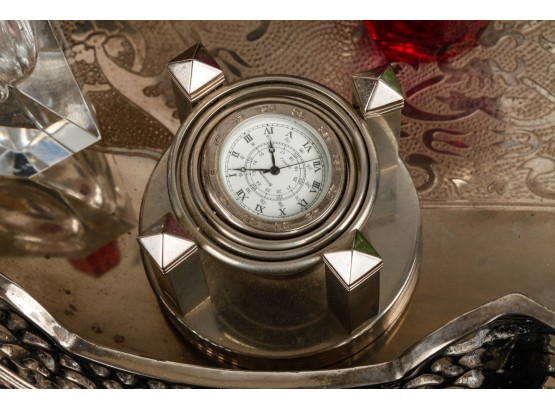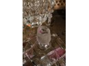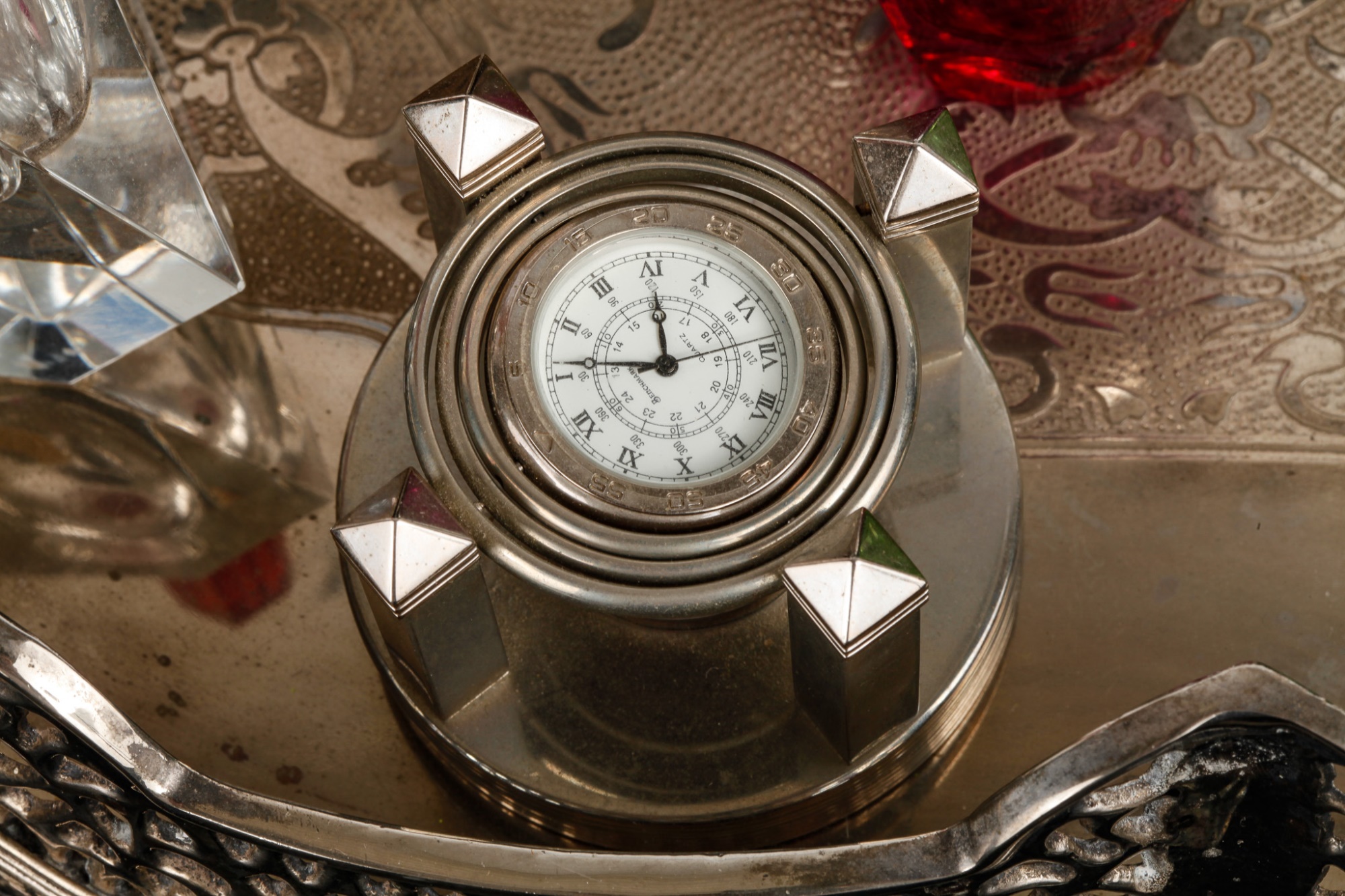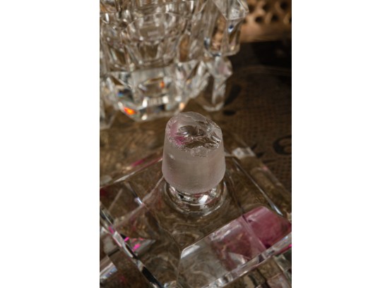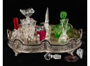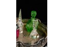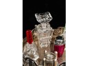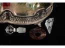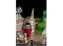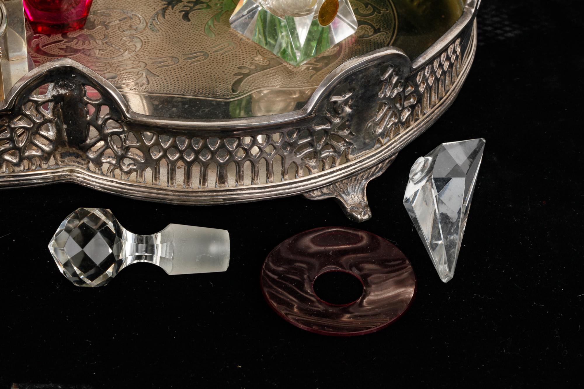With (6) scent bottles, clock and stopper. Tallest 6" H (damage), other good. Various ages. Tray 3 1/2" x 15" x 11"