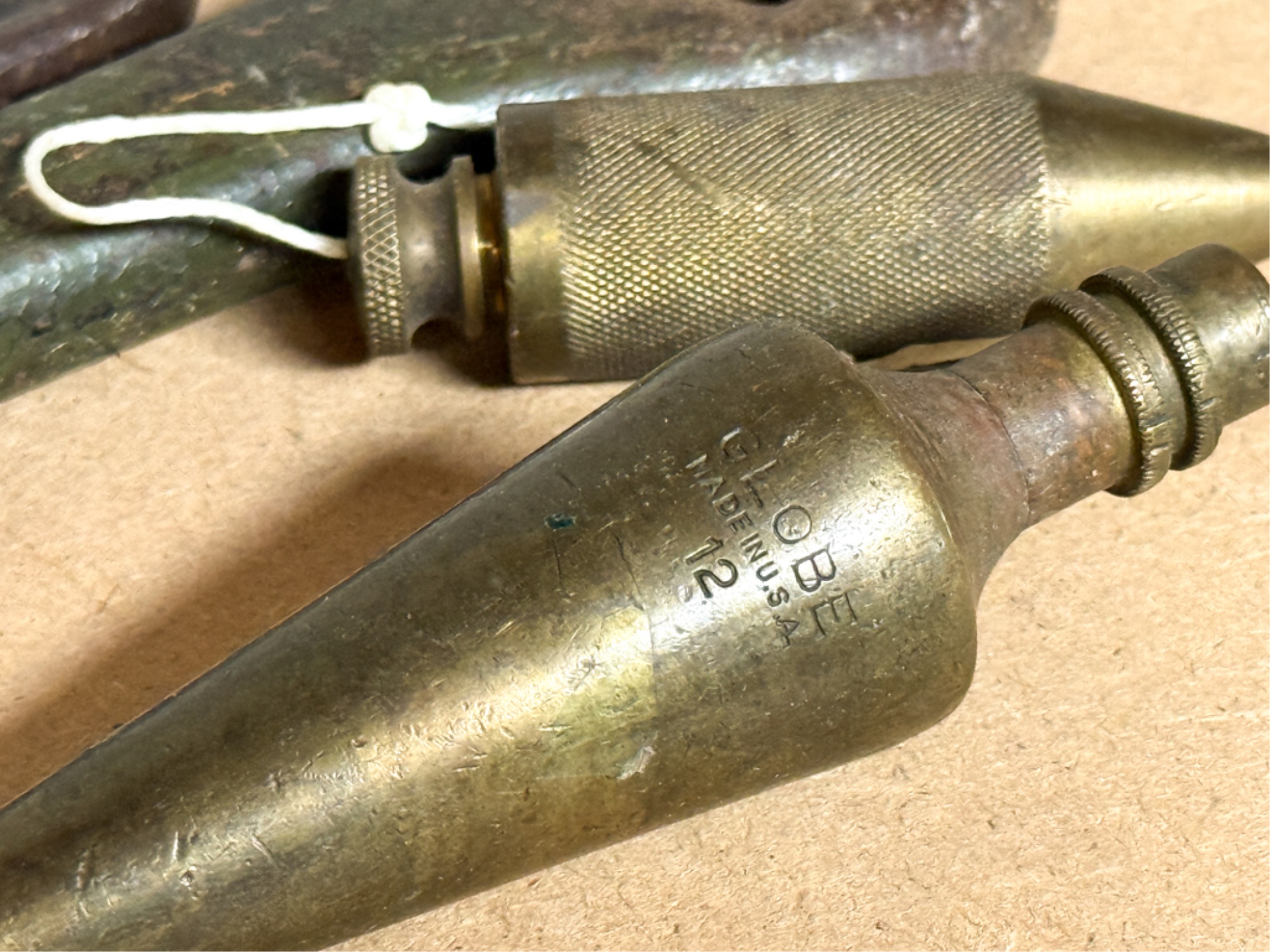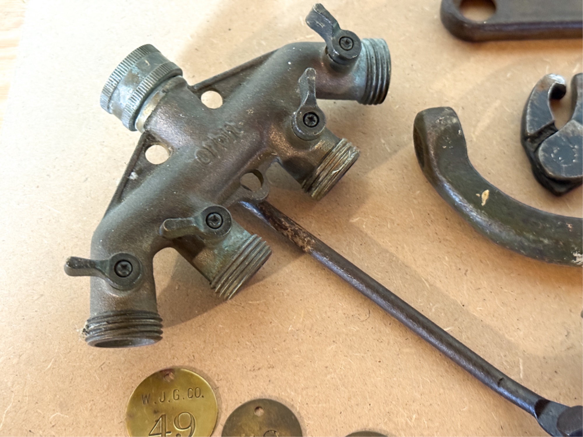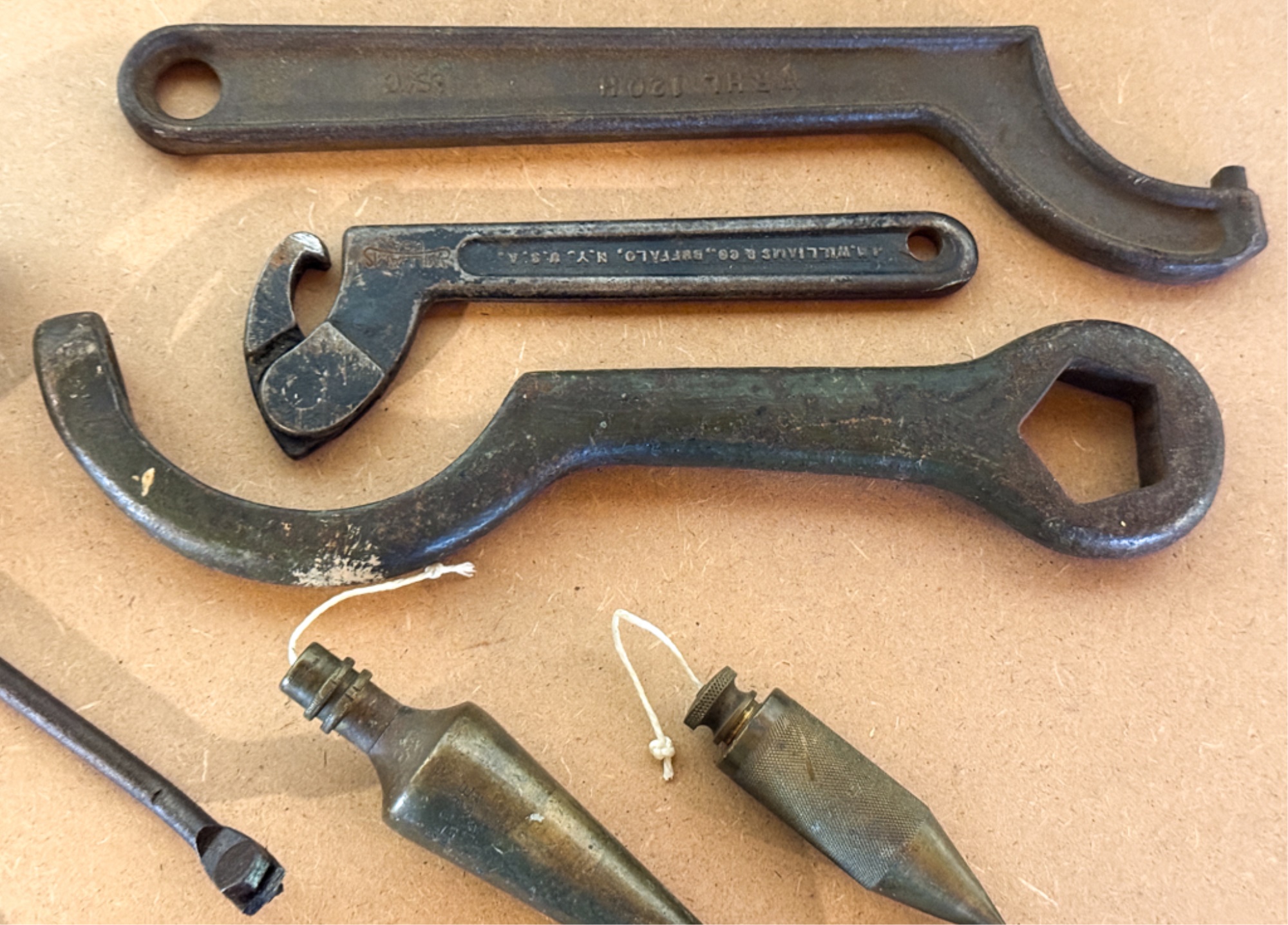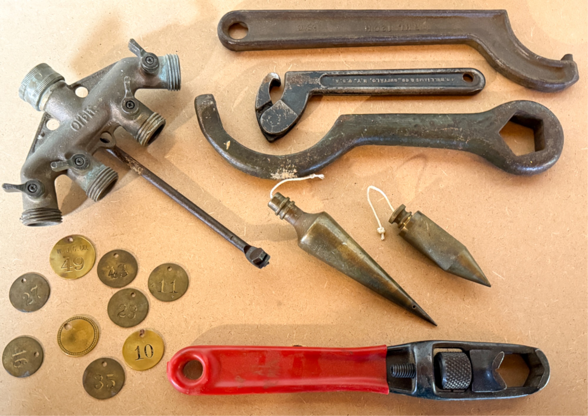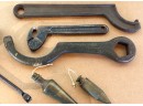 (4) Spanner wrenches, (1) multi port spigot, (2) plumb bobs and (10) tool check tags. Longest measures 11 inches. Condition: Good. Temp No 4238