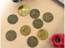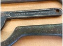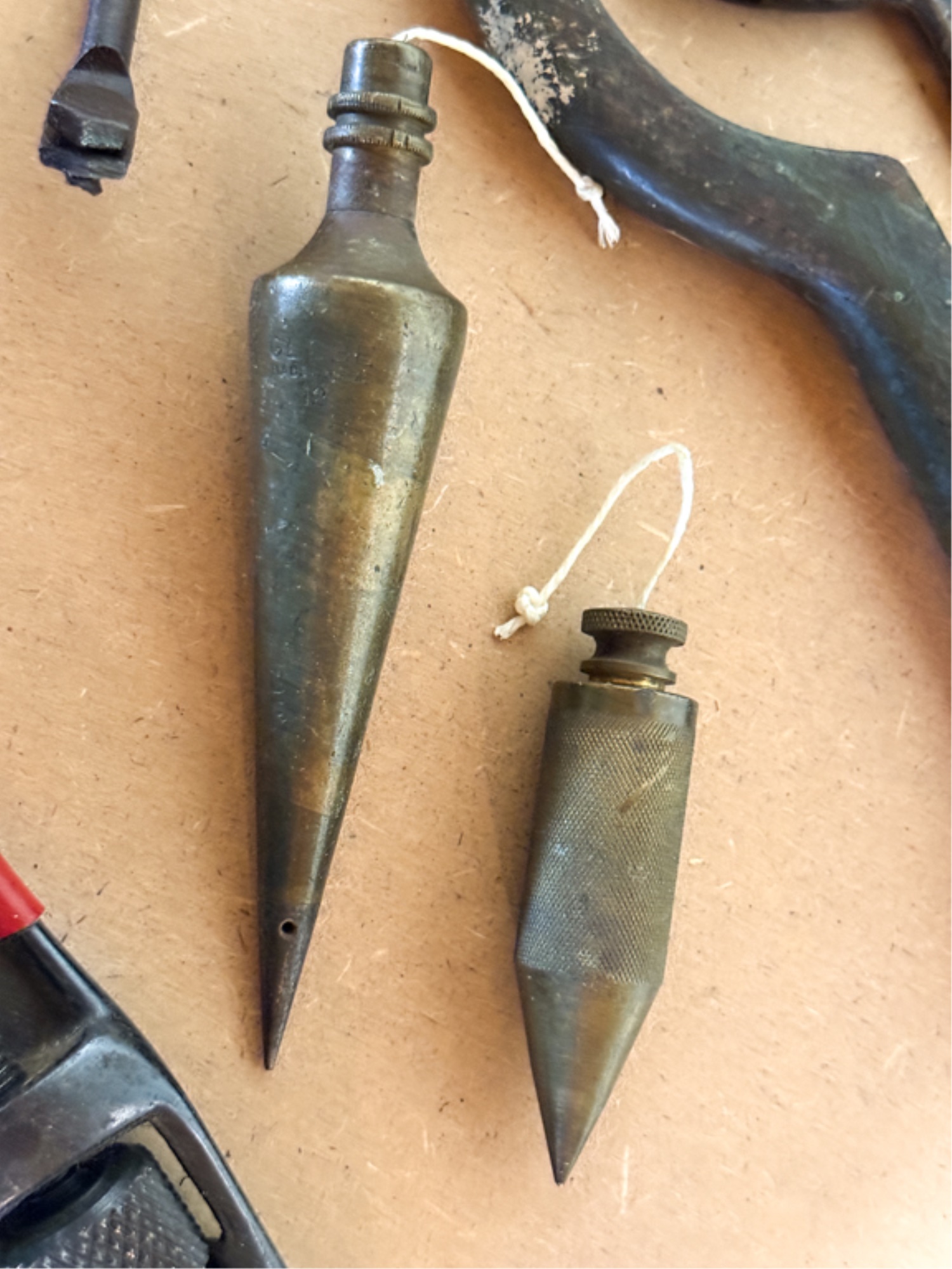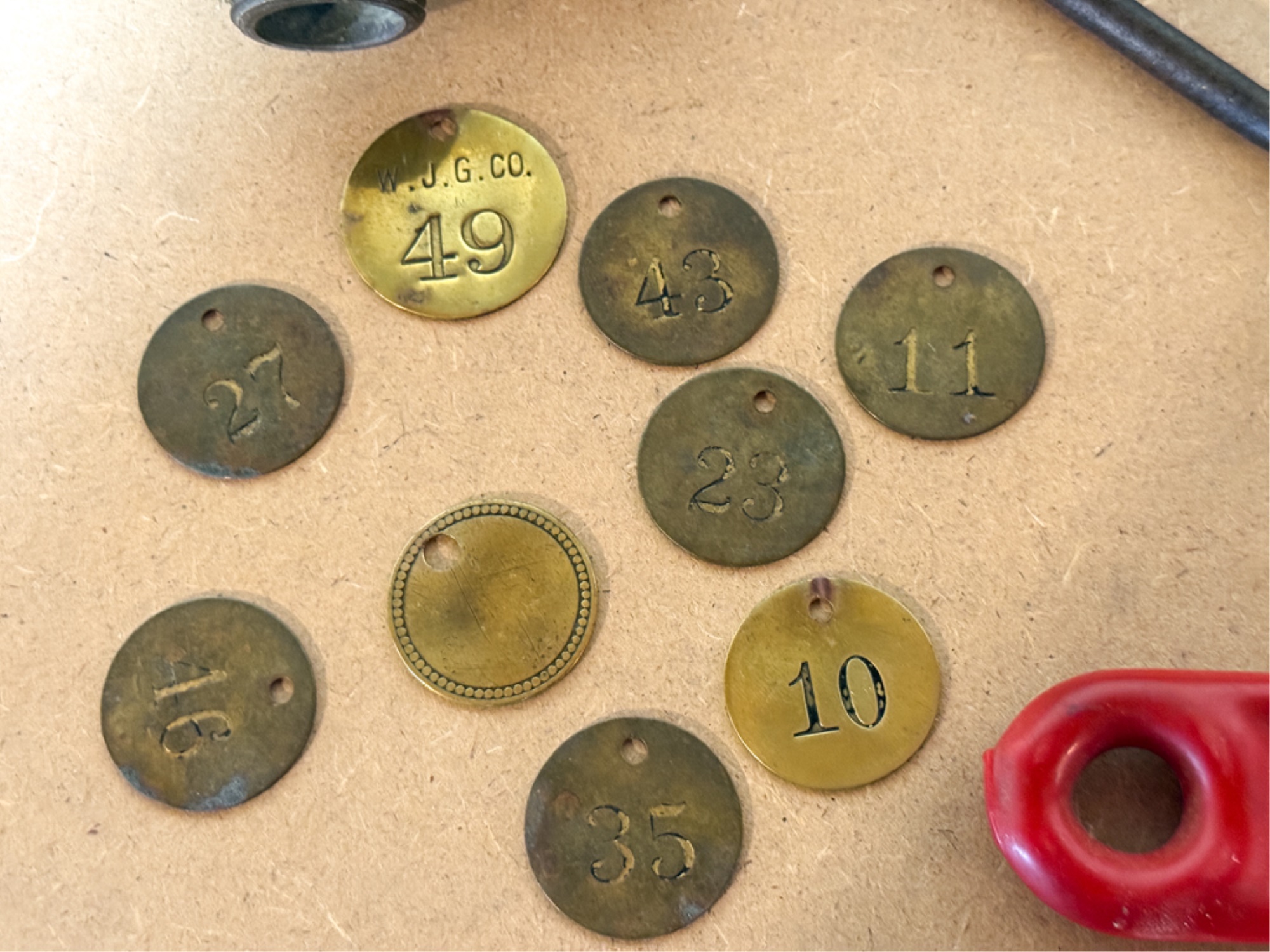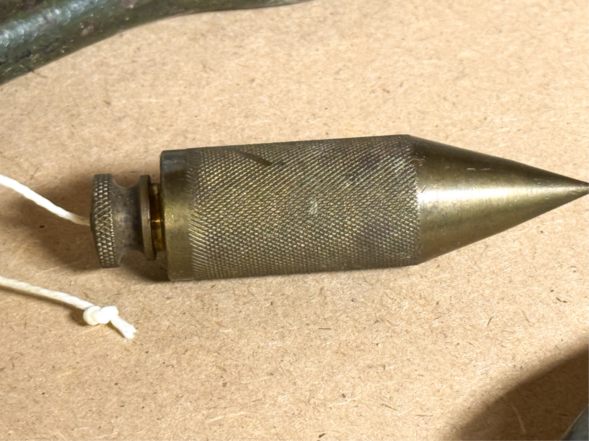 (4) Spanner wrenches, (1) multi port spigot, (2) plumb bobs and (10) tool check tags. Longest measures 11 inches. Condition: Good. Temp No 4238